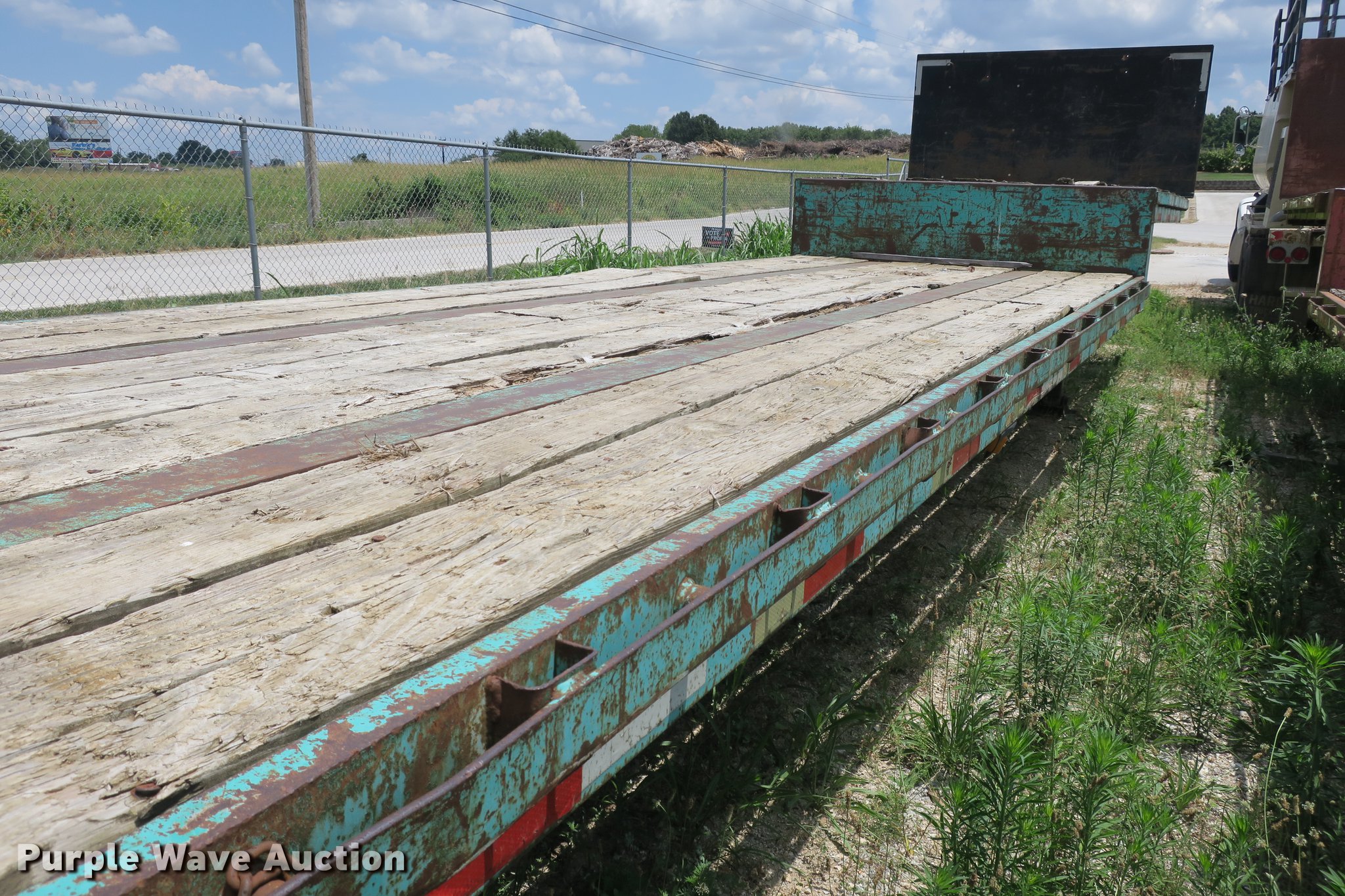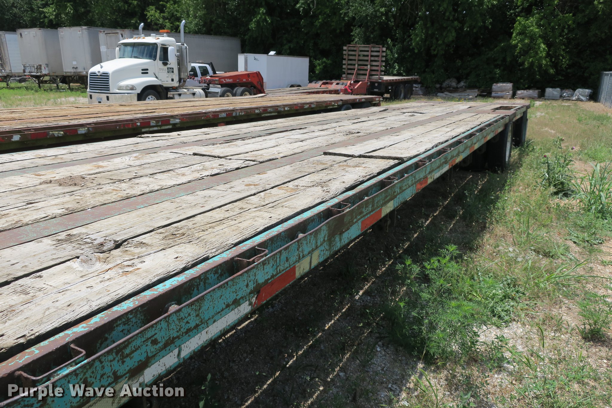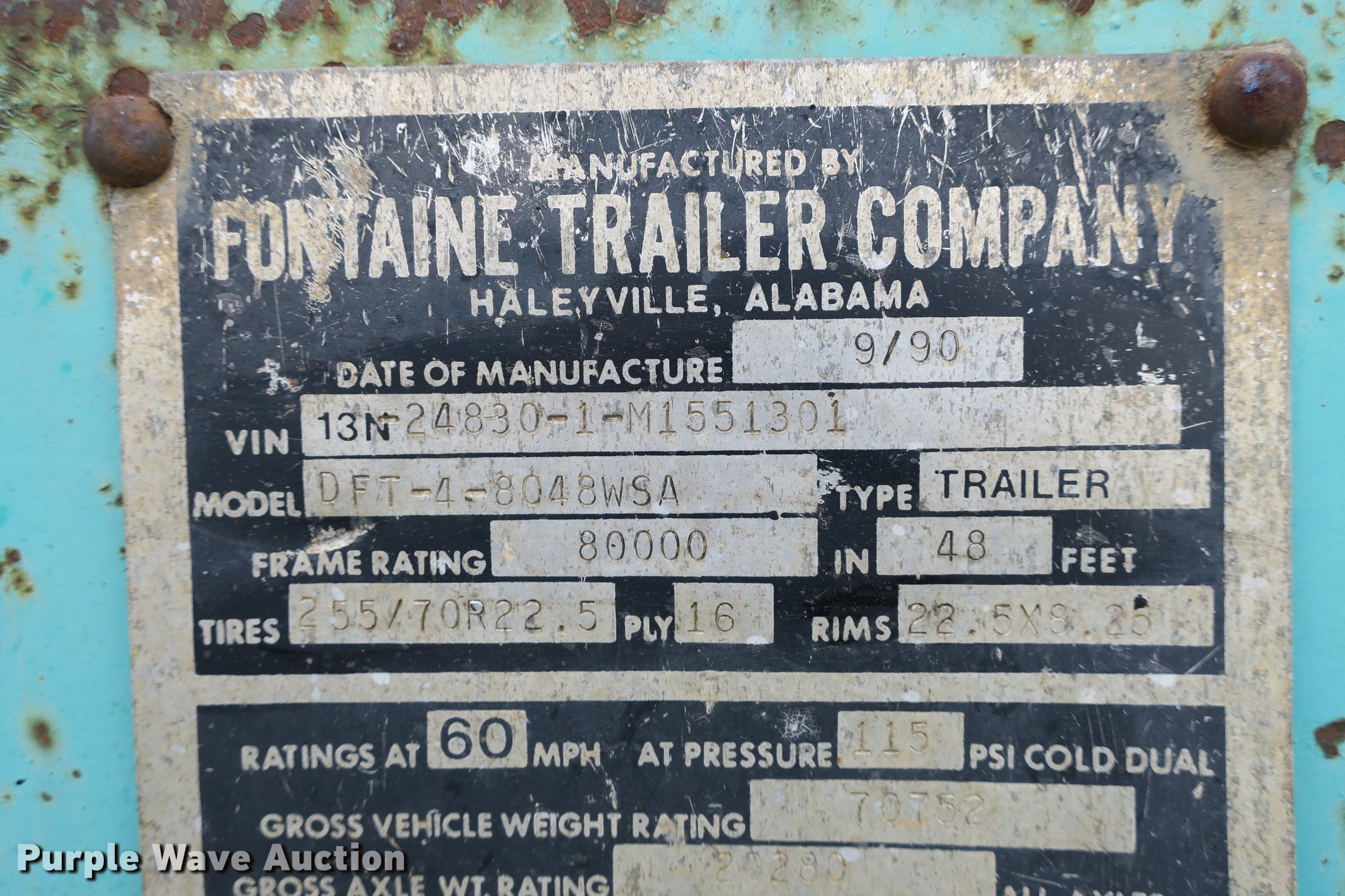 Purple Wave is selling a used Flat or Drop Deck Trailer in Missouri. This item is a 1991 Fontaine DFT-4-8048WSA drop deck trailer with the following: 48' overall length, 37'L x 94"W wood main deck, 9'9" top deck, 39" floor height, Stake side pockets, fifth wheel plate, Dual leg landing gear, Spring suspension, Air brakes, Tandem spread axle, Steel wheels, 255/70R22.5 tires, GVWR 70,752 lbs