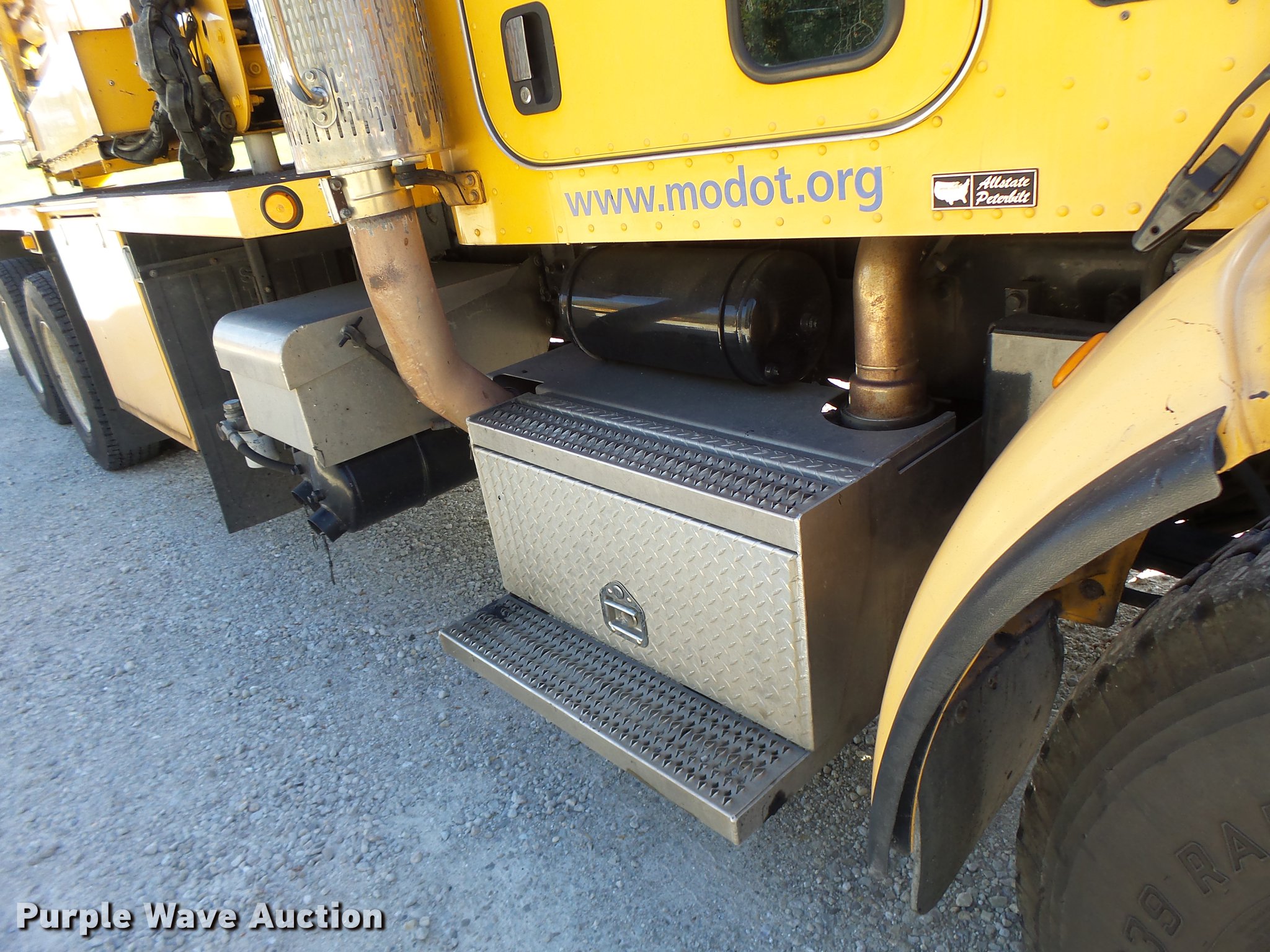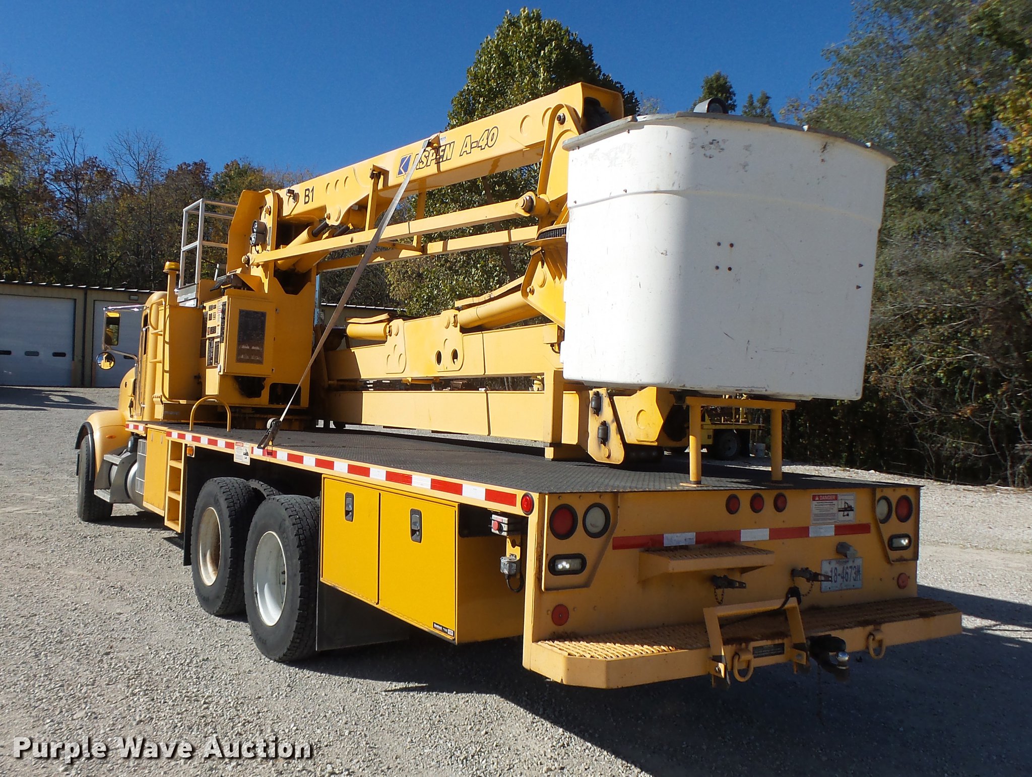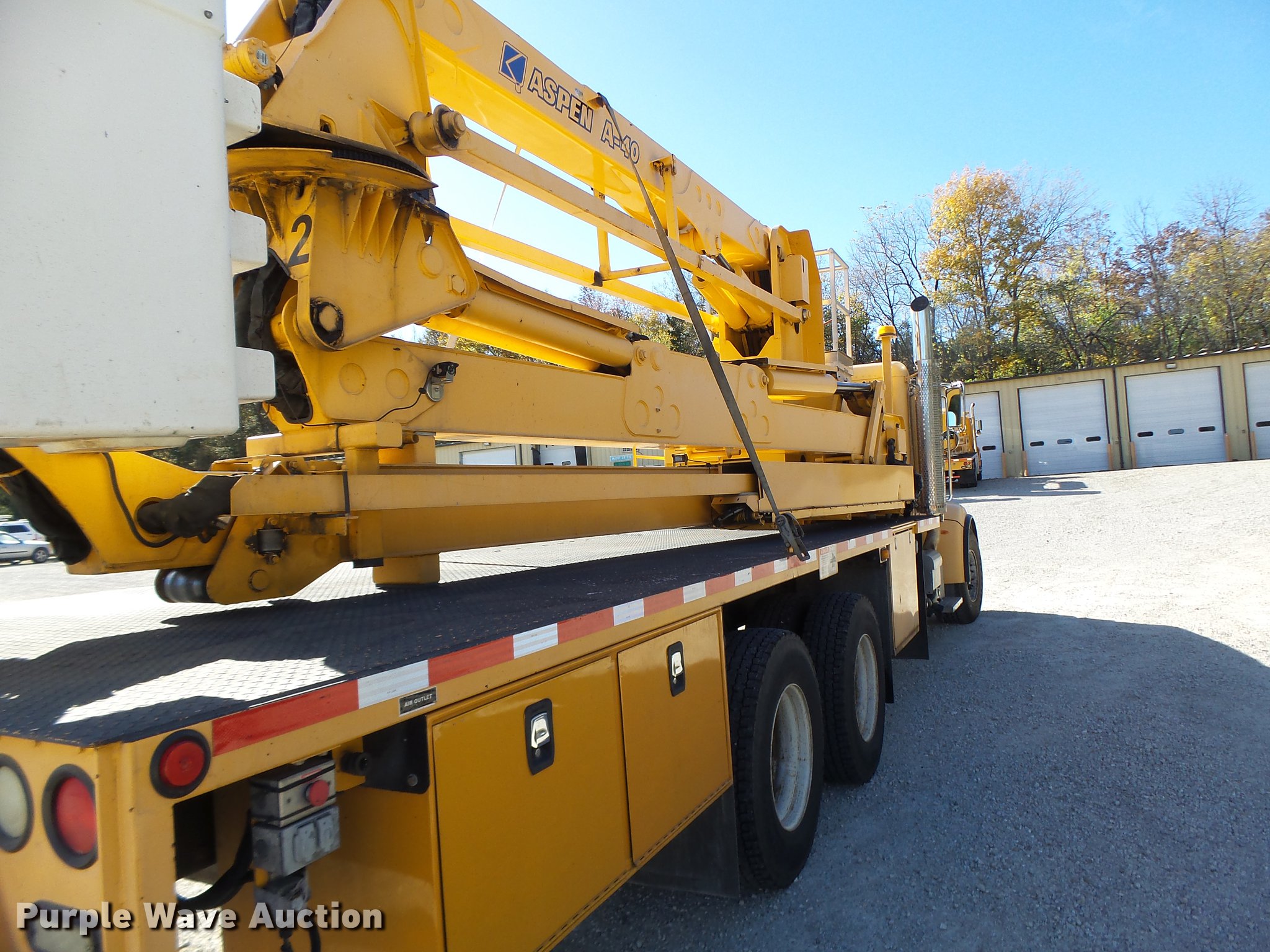 Purple Wave is selling a used Bucket Truck in Missouri. This item is a 2008 Peterbilt 367 bridge inspection truck with the following: 96,820 miles on odometer, 6,551 hours on meter, Cummins 14.9L L6 turbo diesel engine, Serial 4008090, Allison automatic transmission, Tandem axle, AC and heat, Cruise, AM/FM, Air suspension seat, Backup camera, PTO, Aspen A-40 boom, 600 lbs maximum lift capcity, Man basket, Ground and platform controls, Articulating boom, Serial 10130, Additional work platform, Generator, Three cylinder diesel engine, 278 hours on meter, Cat track guard, Damaged, Single exhaust stack, Single fuel tank, Pintle hitch, Trailer wiring, Spring suspension, Air brakes, 425/65R22.5 front tires, 11R22.5 rear tires, GVWR 66,000 lbs, View inspection report, Leveling bar damaged on passenger side, Hydraulic line damaged on no. two cylinder, Trailer holding additional work platform not included