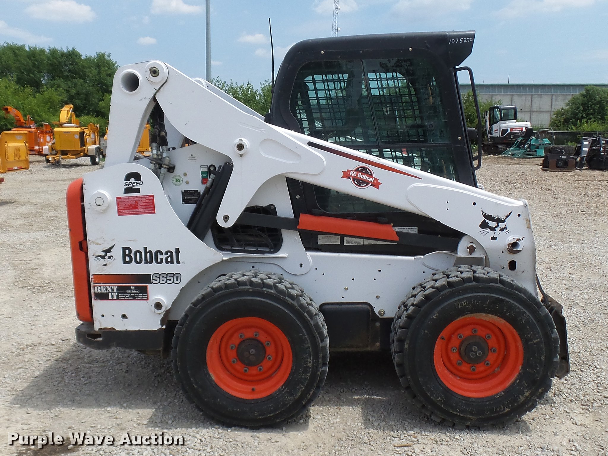 Purple Wave is selling a used Skid Steer Loader in Kansas. This item is a 2014 Bobcat S650 skid steer with the following: 1,376 hours on meter, Kubota 3.3L four cylinder turbo diesel engine, 74 HP, Two speed hydrostatic transmission, AC and heat, AM/FM, Joystick controls, EMS panel, Spring suspension seat, Wipers, Front and rear work lights, Backup alarm, Hydraulic quick coupler, High Flow auxiliary hydraulics, Auxiliary electrical outlet, Earth Force 12-16.5 tires, Serial A3NV23587, Unit# 1075270