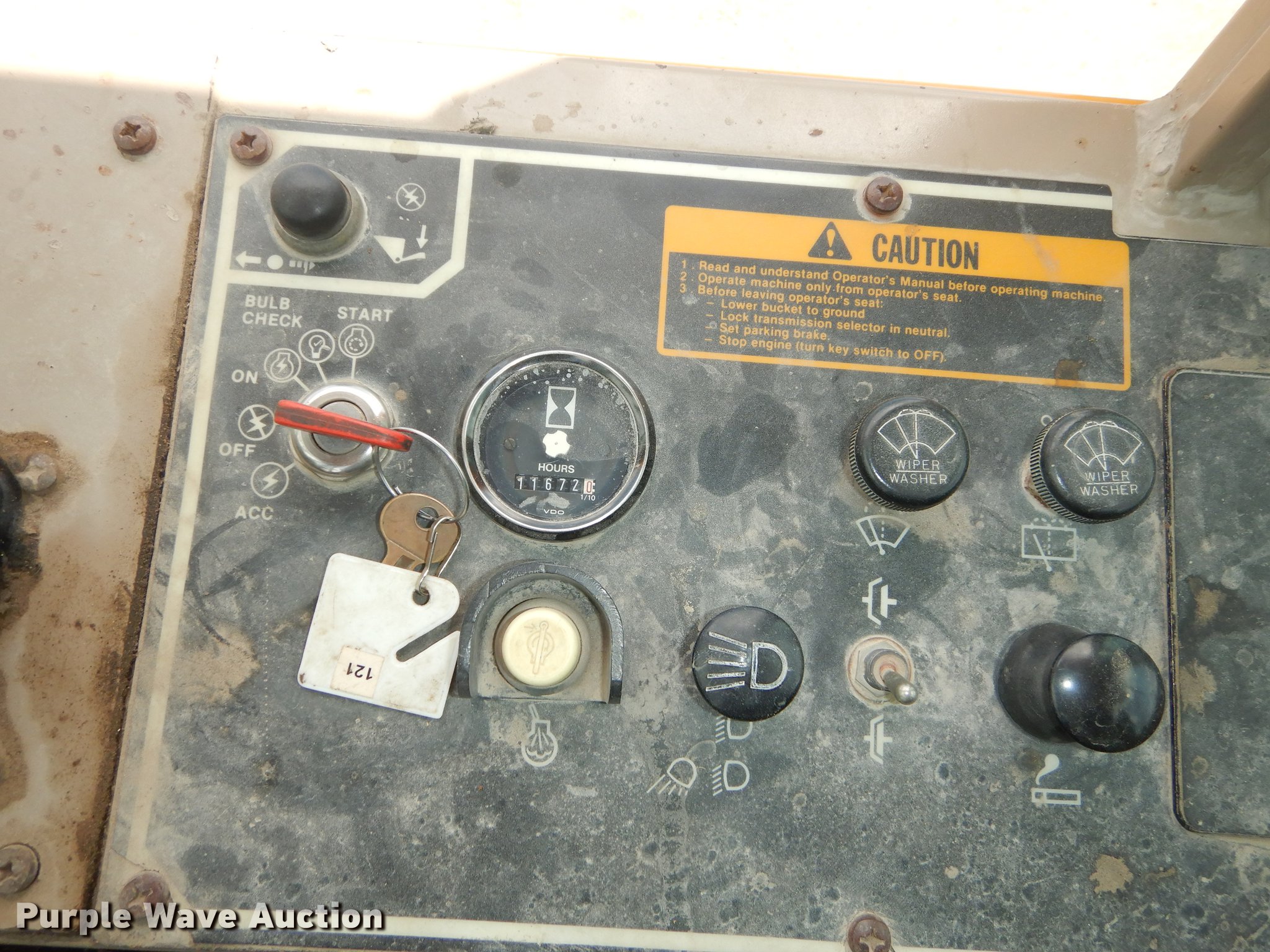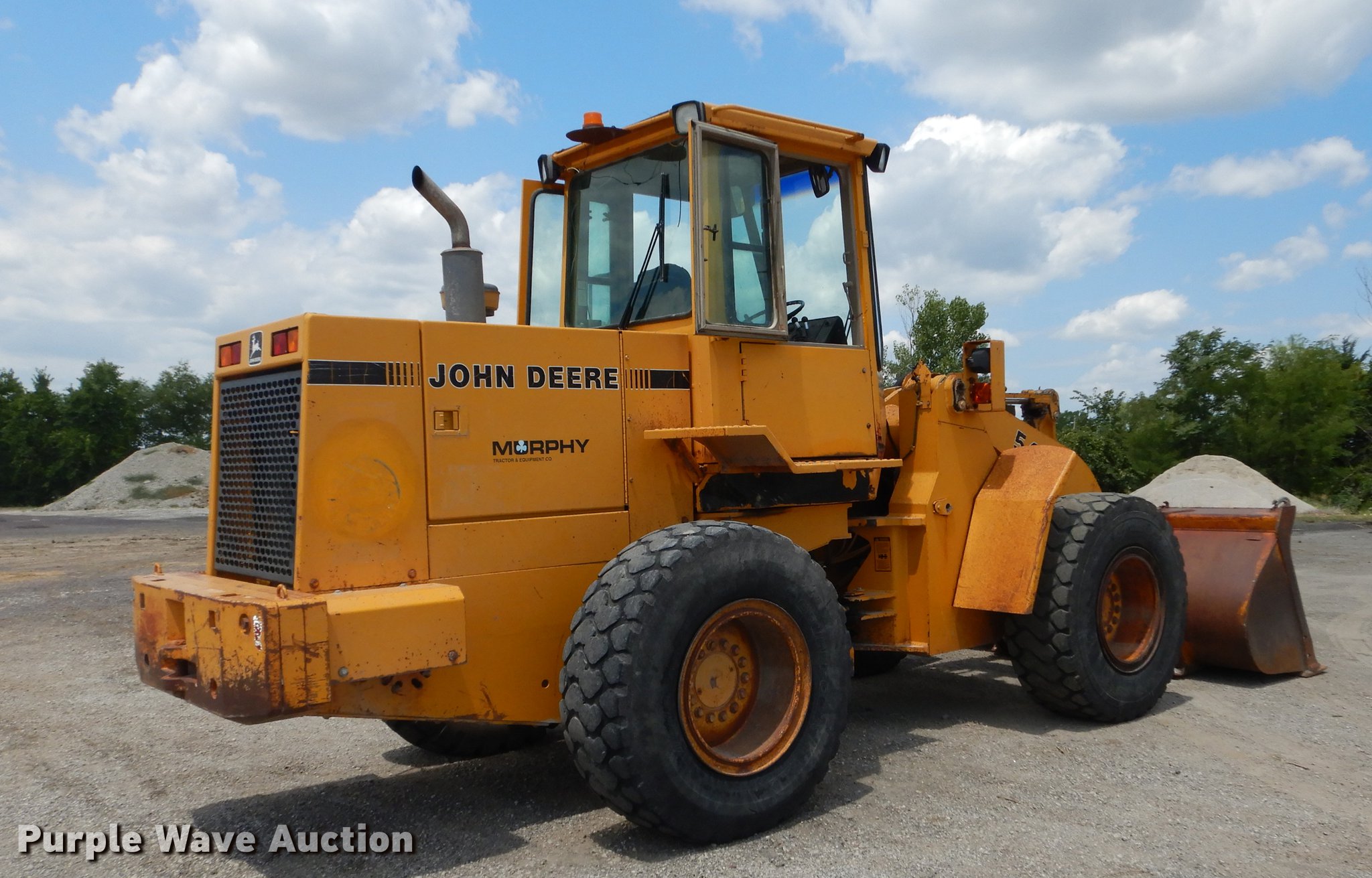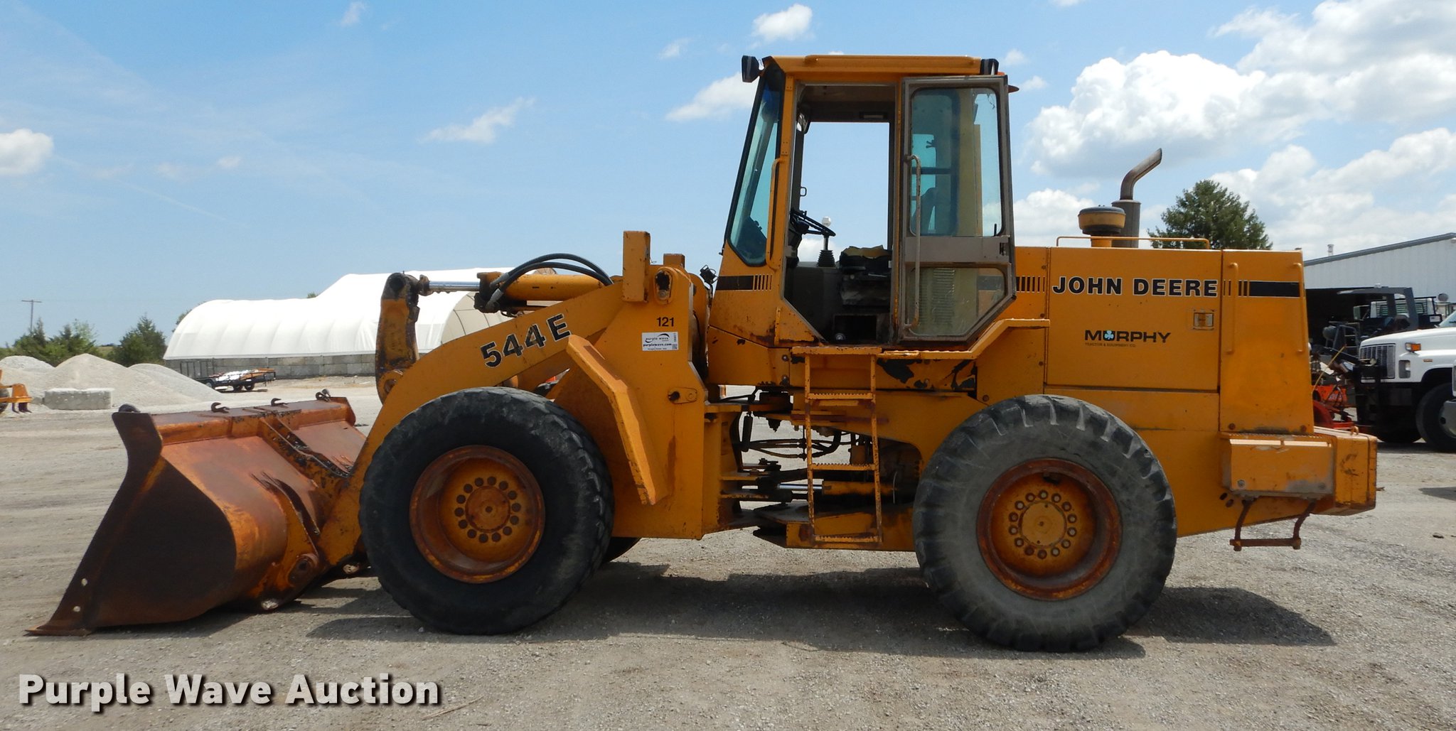 Purple Wave is selling a used Wheel Loader in Kansas. This item is a 1989 John Deere 544E wheel loader with the following: 11,672 hours on meter, John Deere six cylinder turbo diesel engine, Serial T06359T219824, 4F-4R gears, Enclosed cab, Heat, Suspension seat, Front and rear work lights, Wipers, Strobe light, 98"W bucket, Bolt-on cutting edge, Counterweight, 17.5R25 tires, Serial DW544EB524924, Unit# 121