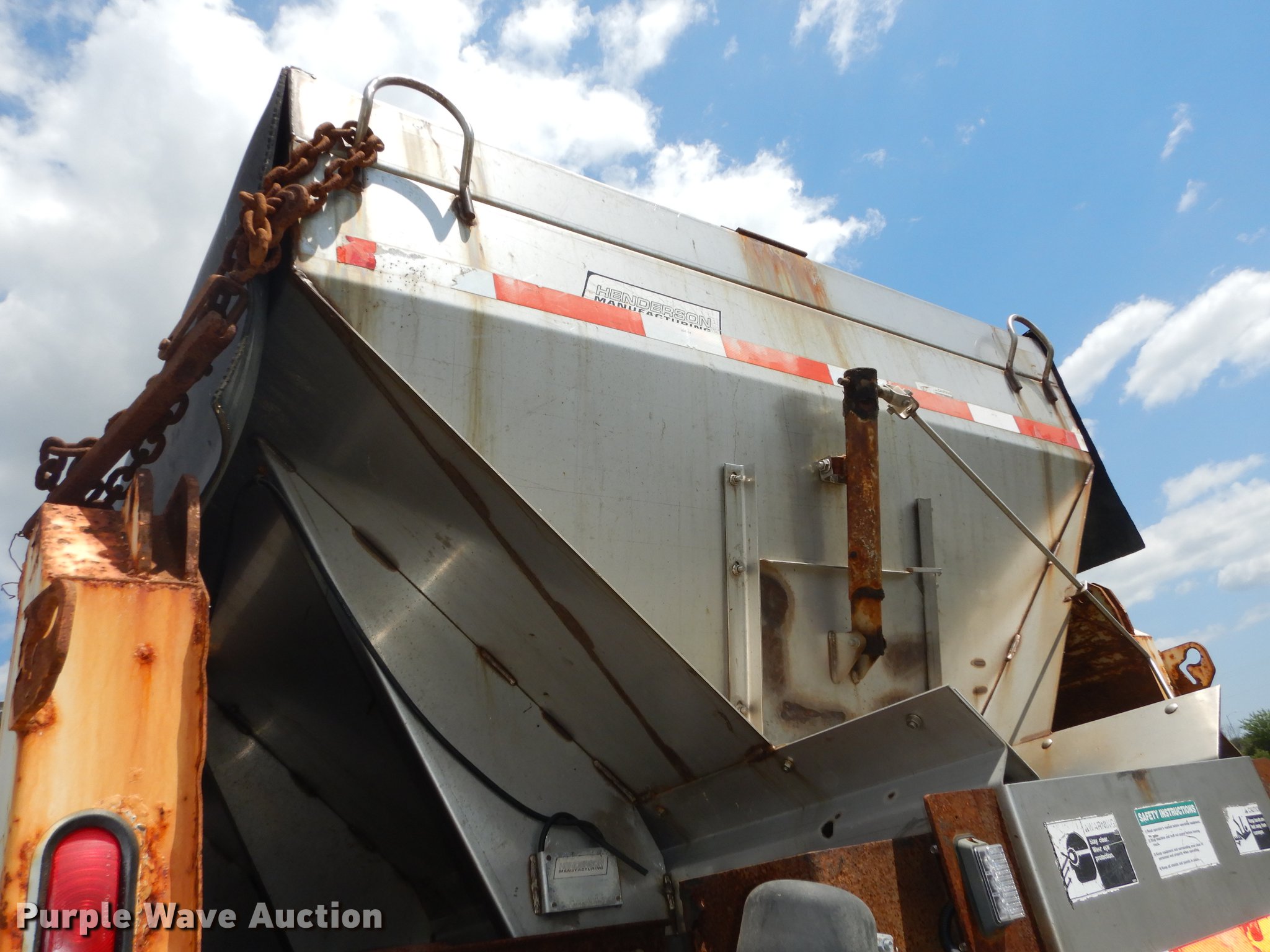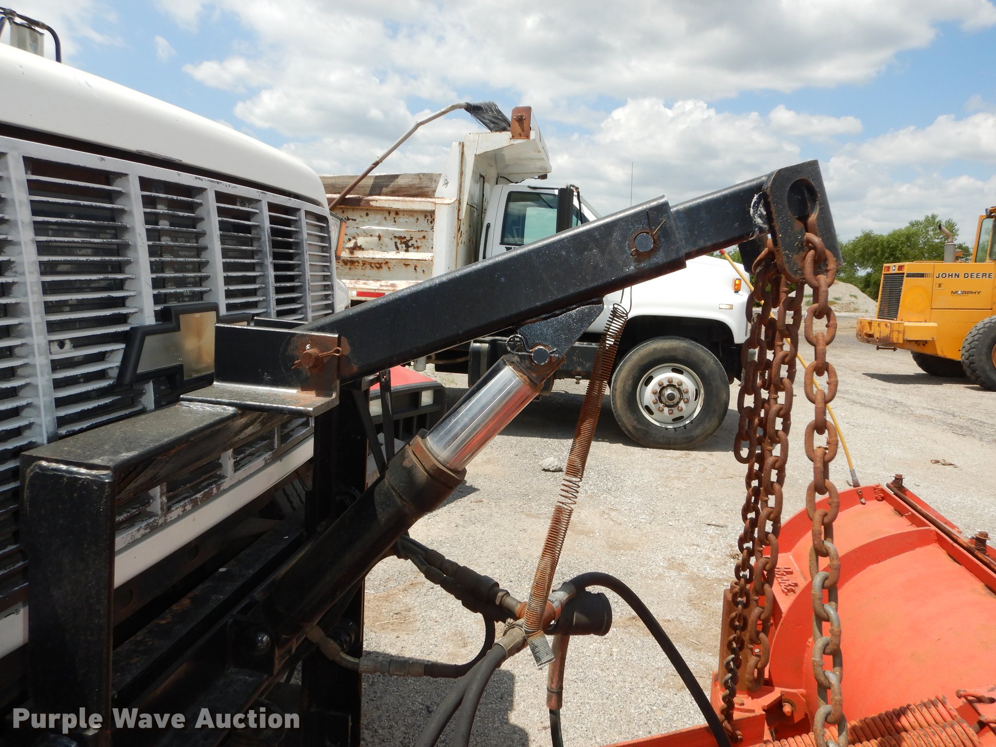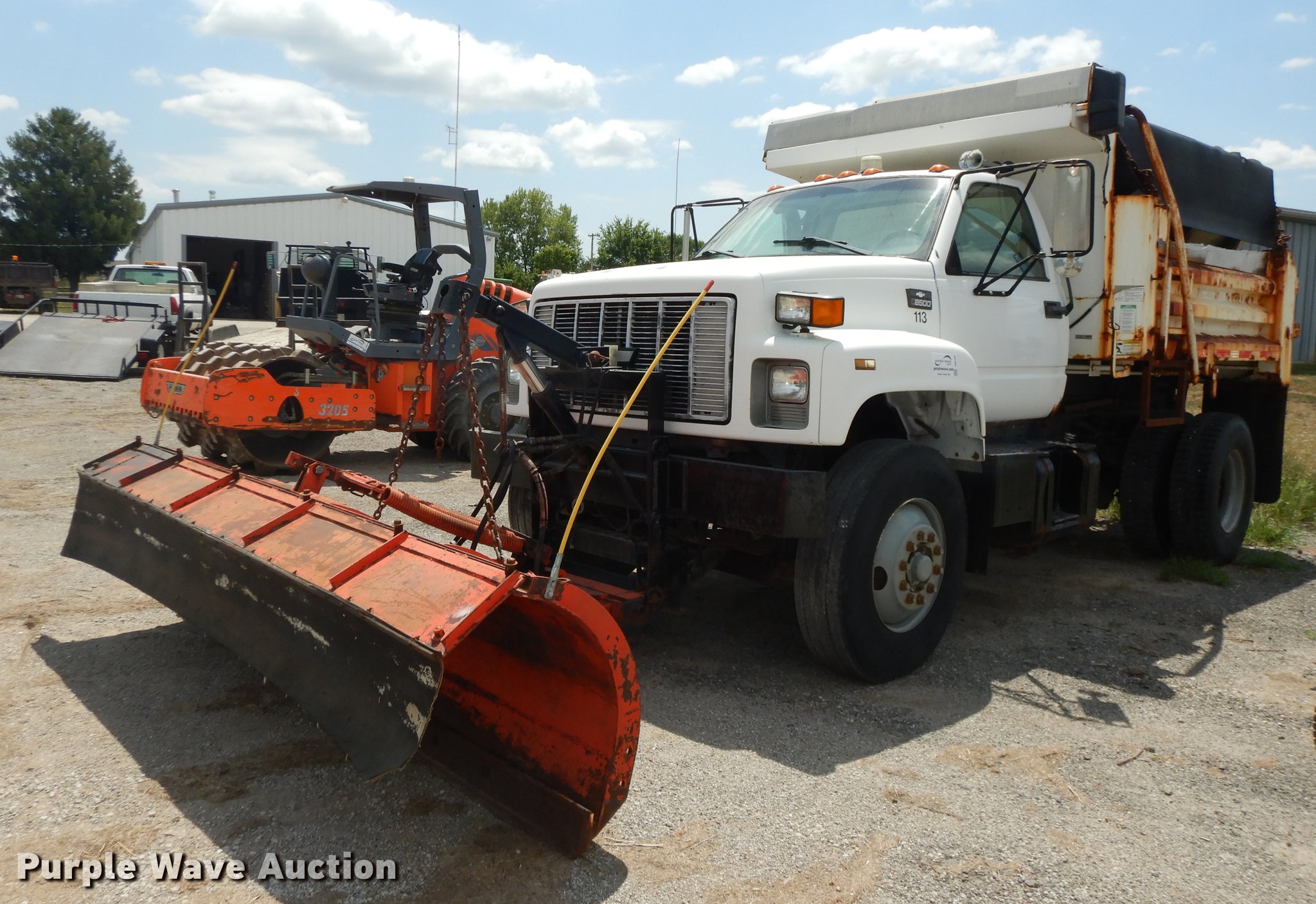 Purple Wave is selling a used Construction Dump Truck in Kansas. This item is a 1998 Chevrolet C8500 dump truck with the following: 62,080 miles on odometer, 6,822 hours on meter, Caterpillar 3116 6.6L six cylinder turbo diesel engine, Allison automatic transmission, Single axle, AC and heat, AM/FM, Air suspension seat, Leather interior, Block heater, Work lights, Chelsea PTO, Henderson 10X24XUBXMK2 steel dump bed, 10'L x 90"W, 24" side height, 8" side board height, Roll tarp, Single ram hoist, Unattached end gate included, Henke 10'W plow, Henderson stainless steel spreader, Dual fuel tanks, Pintle hitch, Trailer wiring, Spring suspension, Air brakes, 157" wheelbase, 12R22.5 tires, GVWR 37,780 lbs, FAWR 14,780 lbs, RAWR 23,000 lbs, Unit# 113