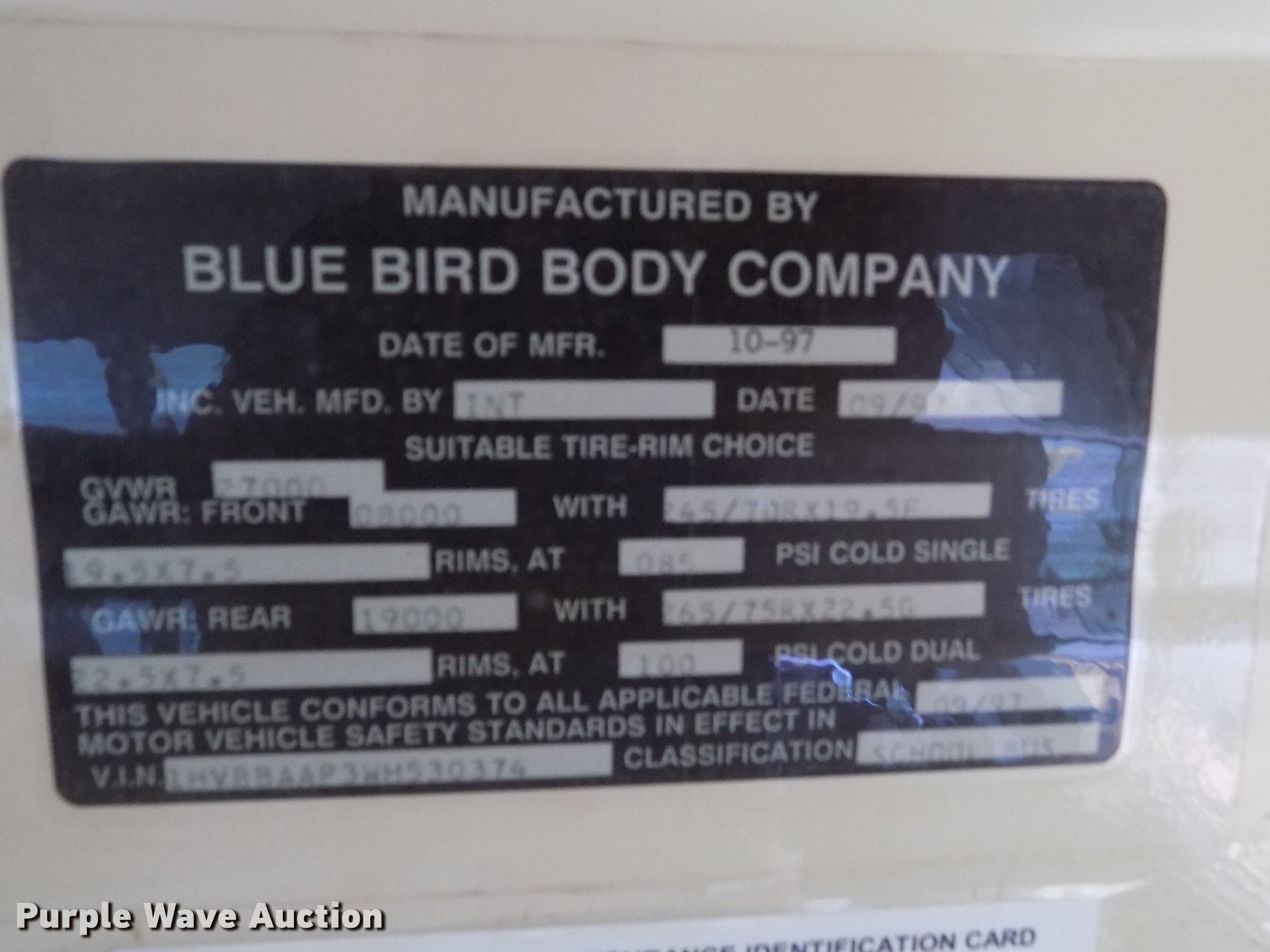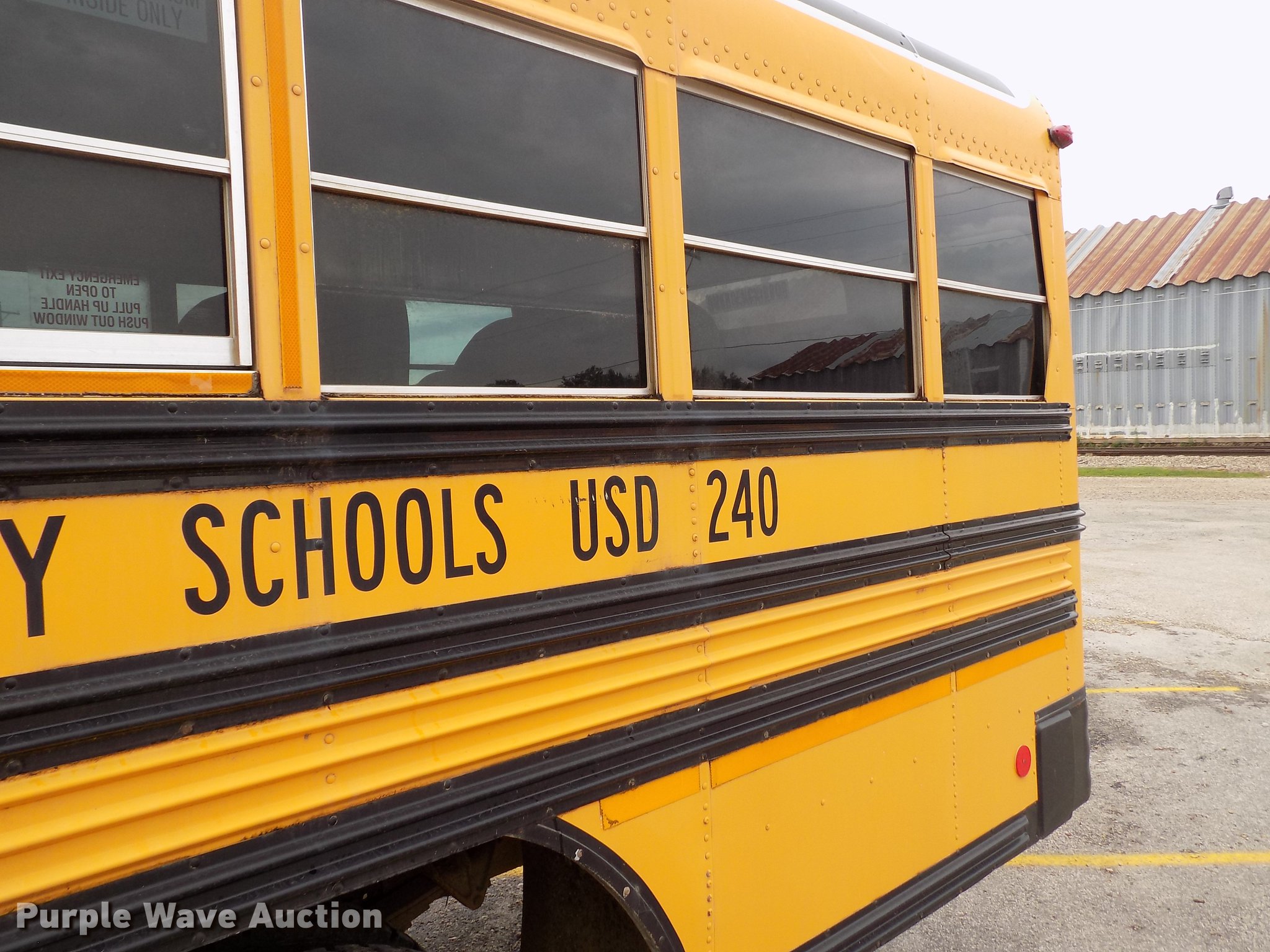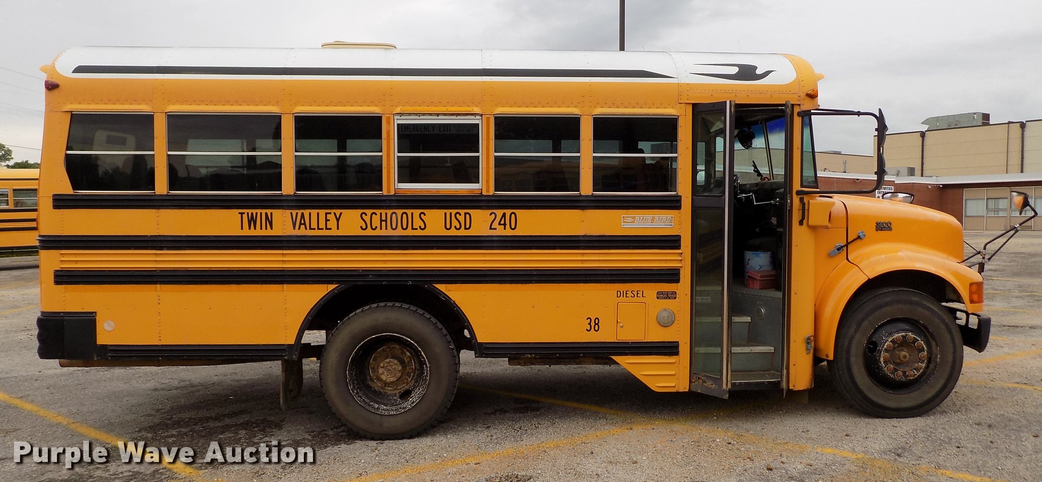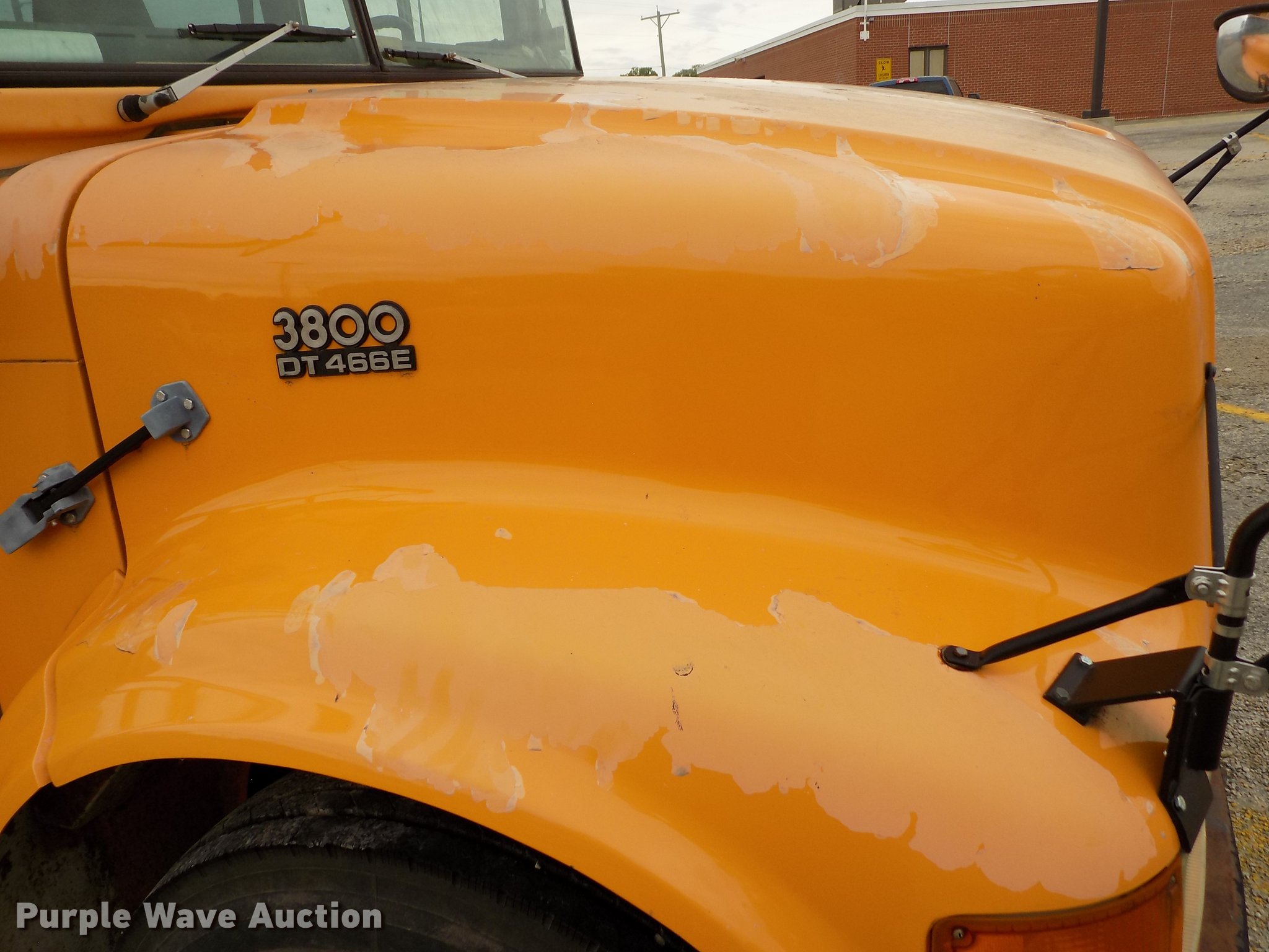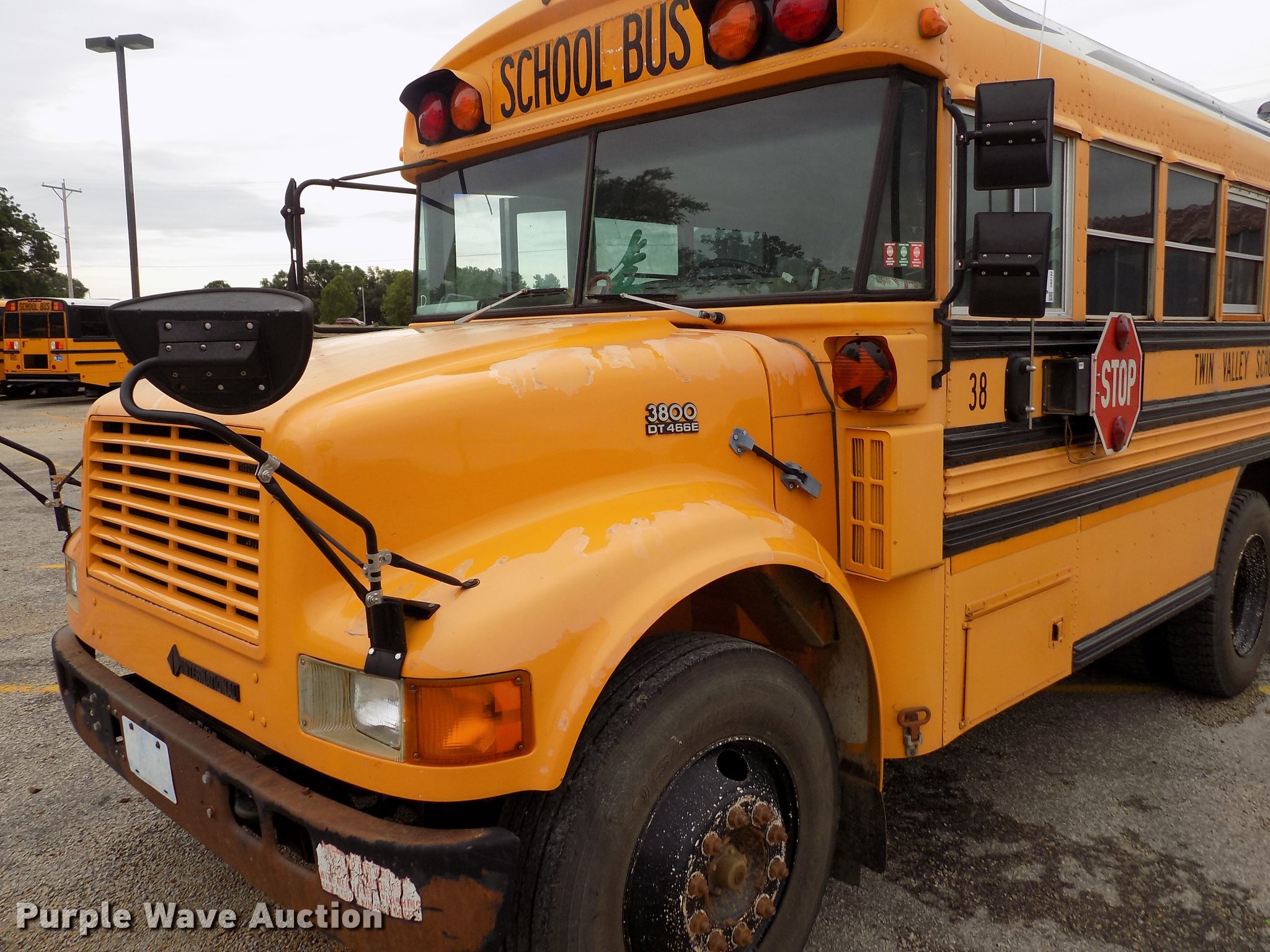 Purple Wave is selling a used Bus in Kansas. This item is a 1998 International 3800 Bluebird school bus with the following: 191,516 miles on odometer, International DT466E 7.6L L6 turbo diesel engine, Automatic transmission, Single axle, Heat, Suspension seat, Block heater, 35 passenger capacity, Ceiling, front, rear, and side emergency exits, Lighted stop sign, Front and rear tow hooks, 152" wheelbase, Hydraulic brakes, 10R22.5 tires, GVWR 27,000 lbs