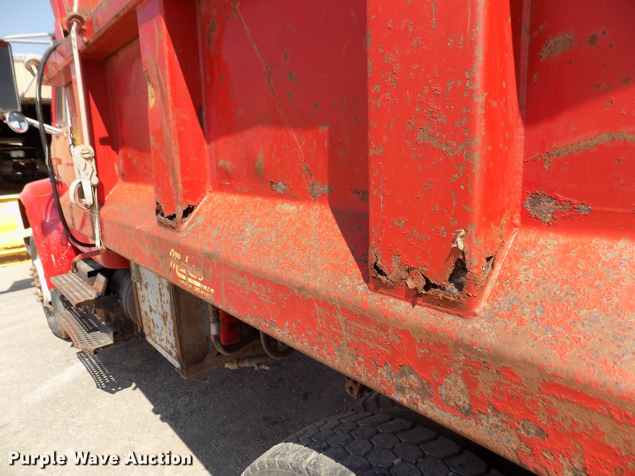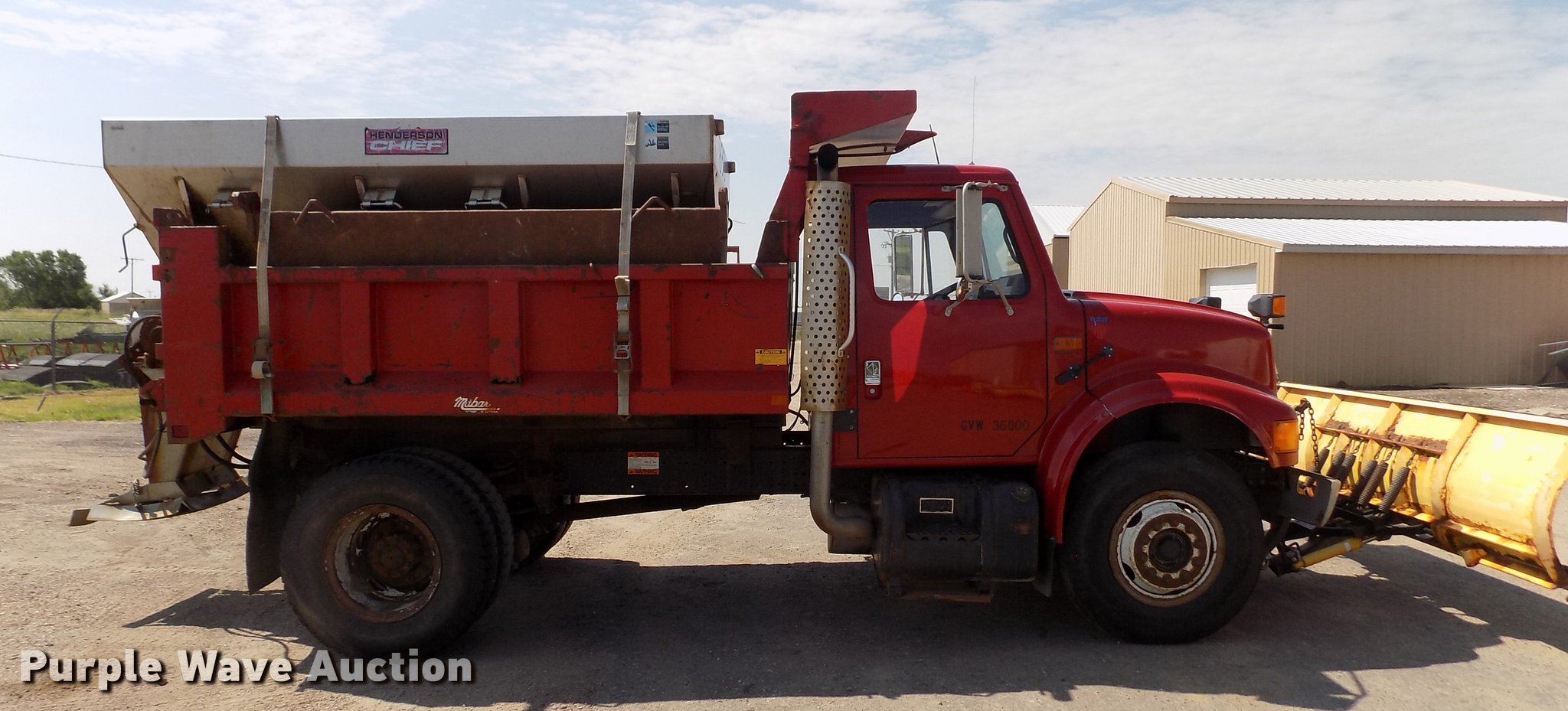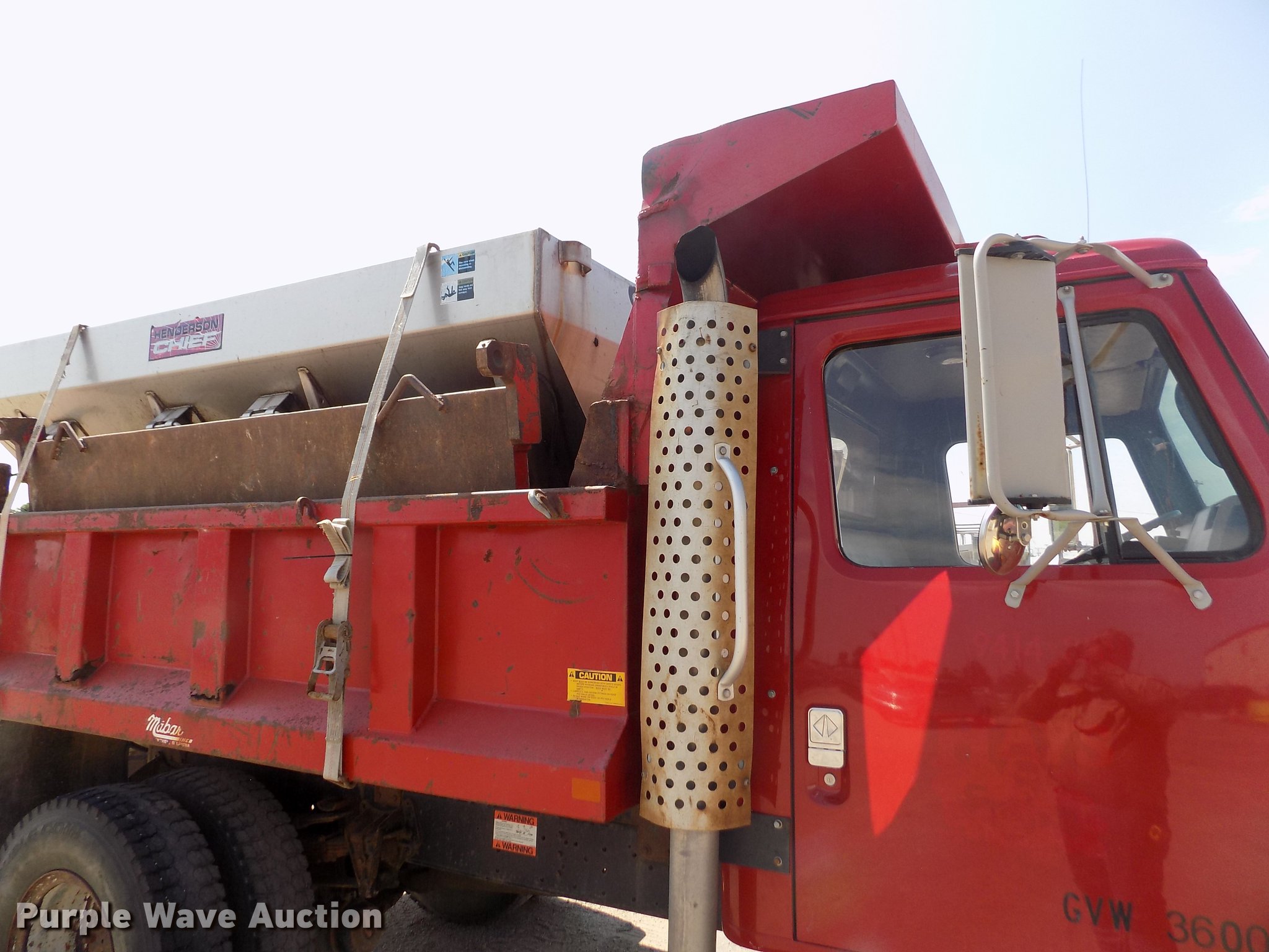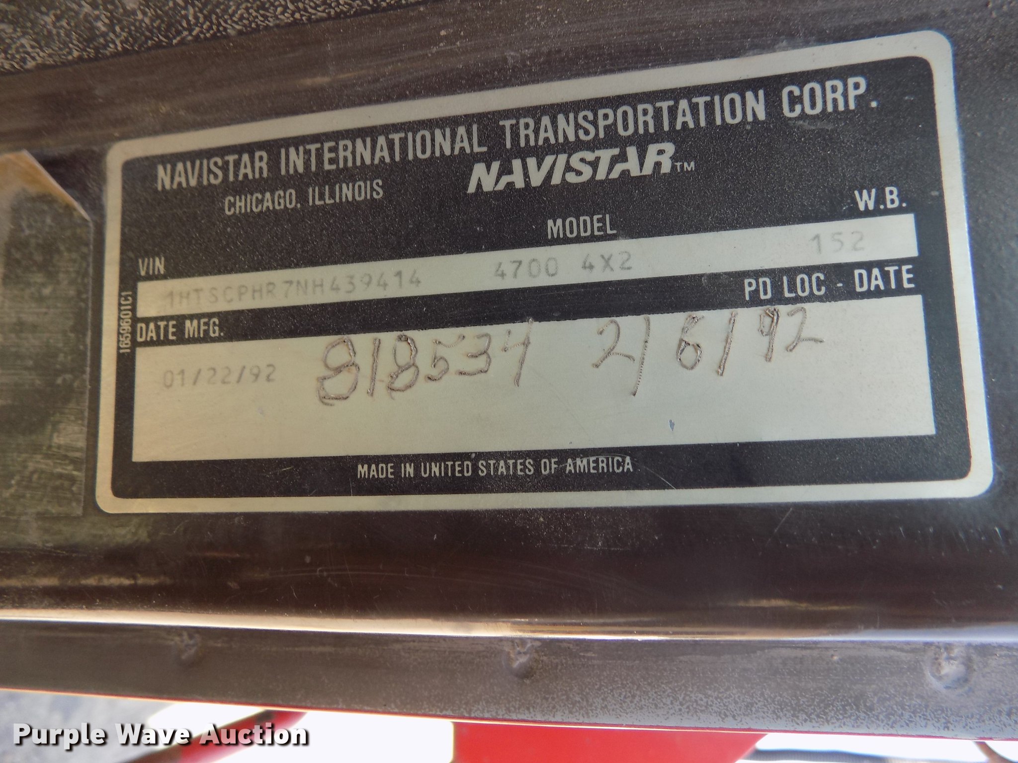 Purple Wave is selling a used Construction Dump Truck in Kansas. This item is a 1992 International 4700 dump truck with the following: 117,101 miles on odometer, International DTA360 5.9L L6 turbo diesel engine, Allison MT650 automatic transmission, Single axle, Heat, AM/FM, Spreader controls, Plow remote control, Chelsea PTO, Mabar steel dump bed, 10'L x 96"W, 34" side height, Manual end gate, Unattached, in bed,, Meyers 10'W plow, Henderson spreader, Five yd. capacity, Single fuel tank, Pintle hitch, Trailer wiring, Spring suspension, Air brakes, 152" wheelbase, 10.00R20 tires, GVWR 36,000 lbs