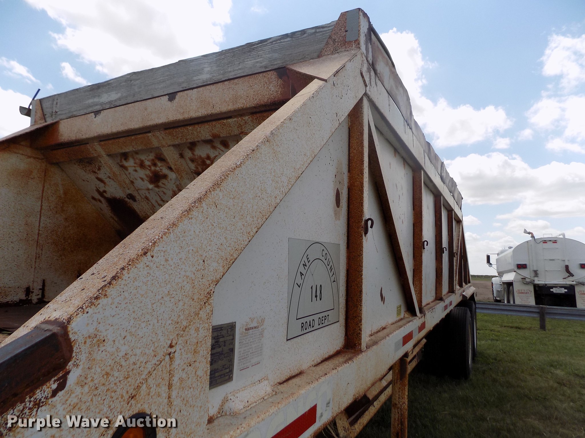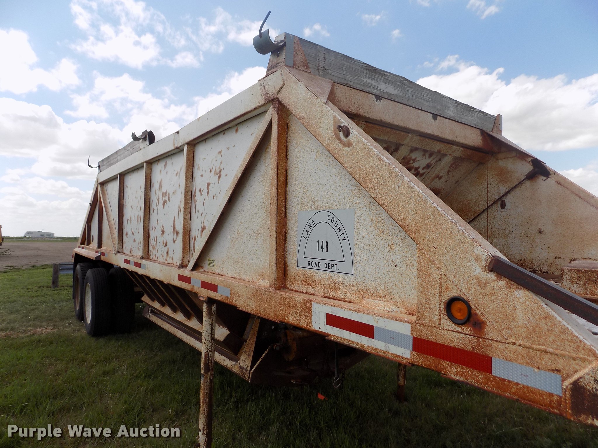 1985 Ranch Manufacturing Co bottom dump trailer. 31.5'L x 94"W , 108" side height, 6" side board height, Steel construction, Air operated clamshell gate, Left side mounted gate controls, Rear push block, Fifth wheel plate, Spring suspension, Air brakes, Steel wheels, 11R24.5 tires, GVWR 80,000 lbs, Portion of side board missing. Kansas title. 1R9BS8509FL008336. Lane County Public Works. Dighton, KS 67839