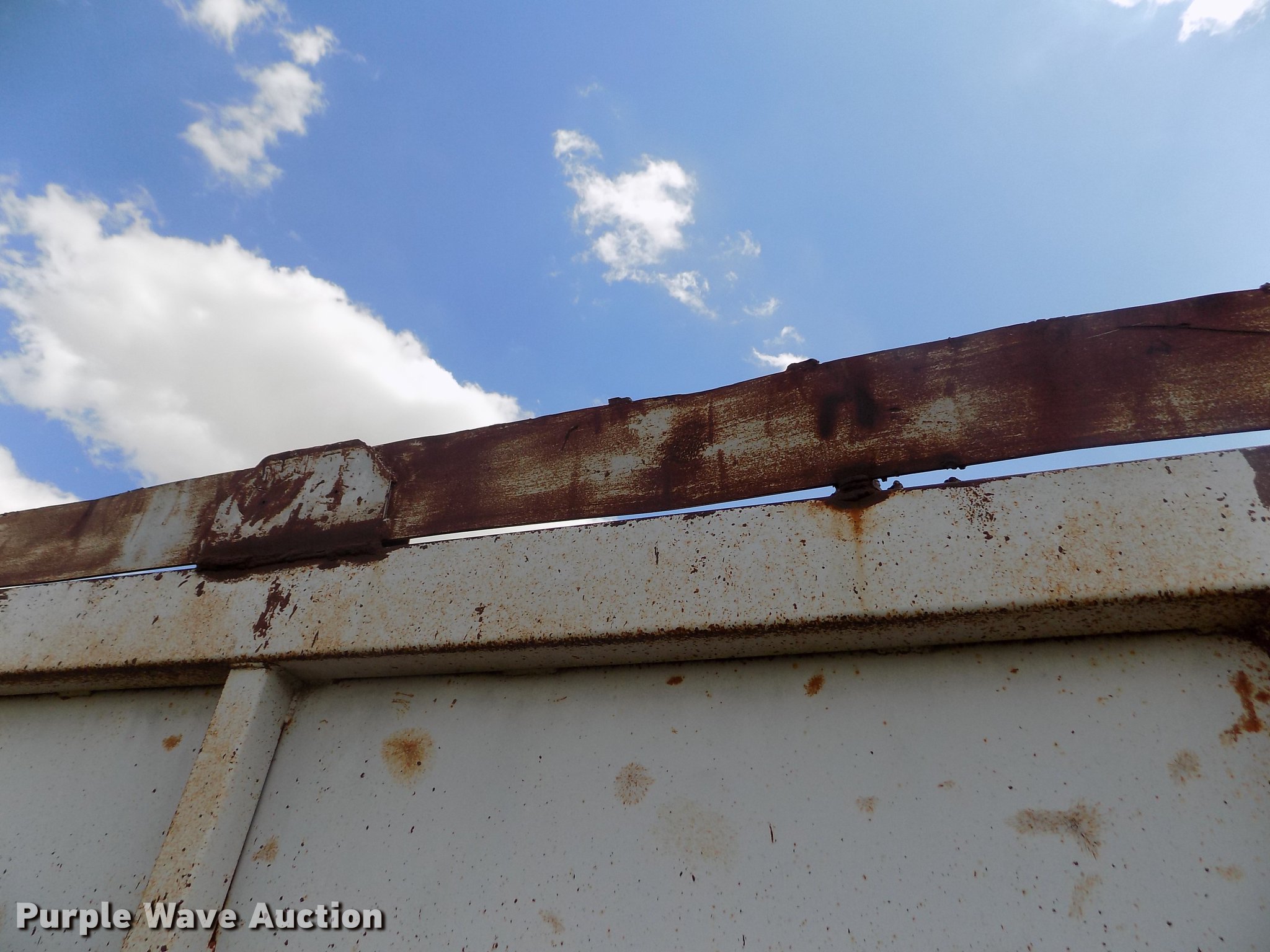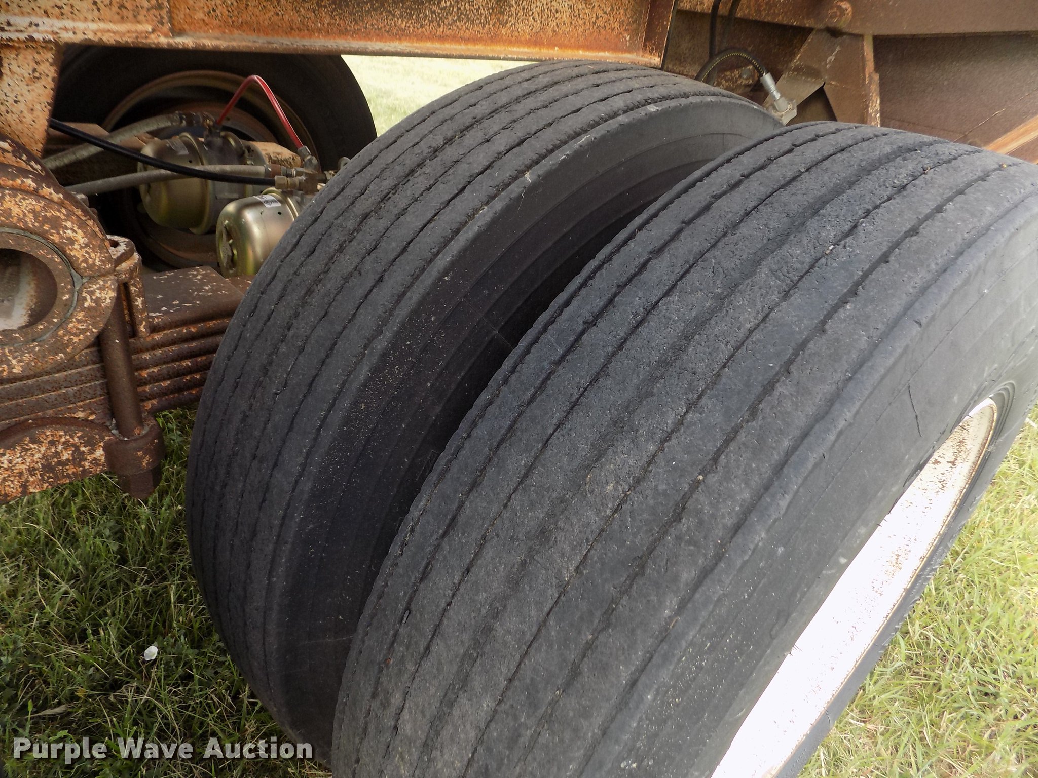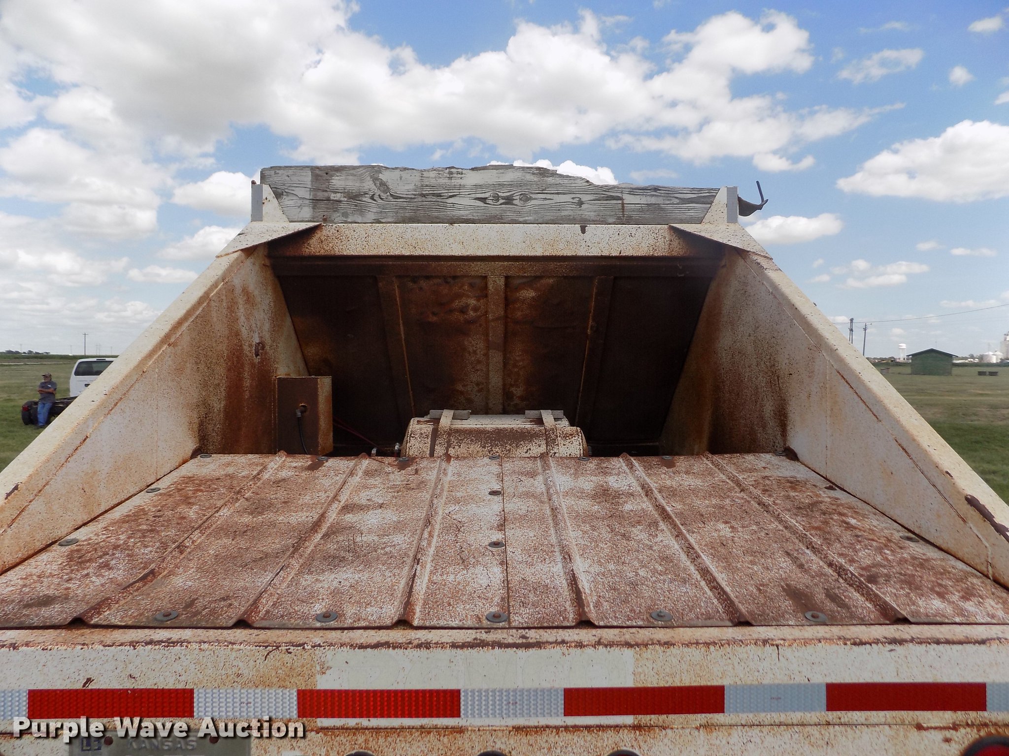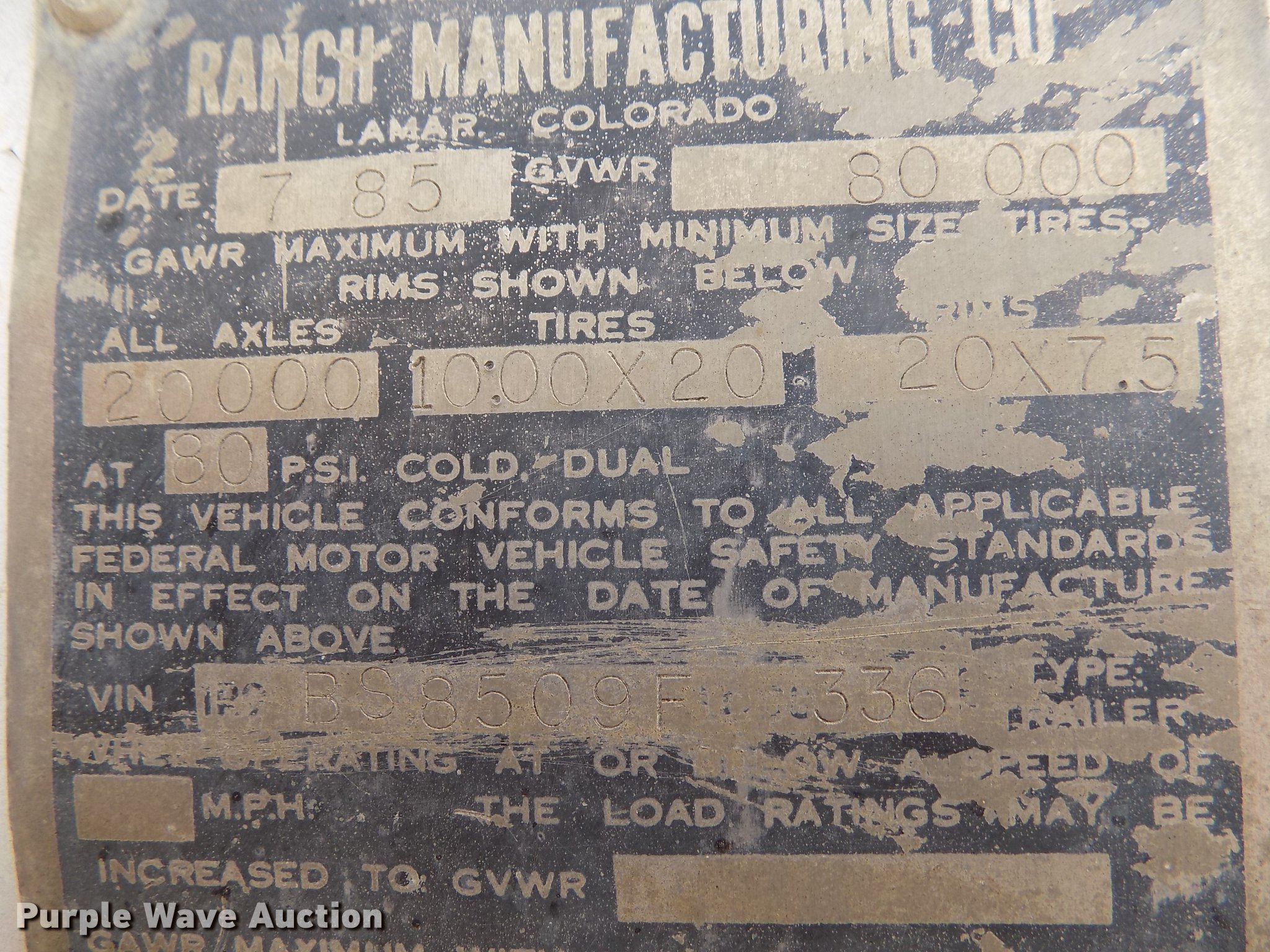 Purple Wave is selling a used Bottom Dump Trailer in Kansas. This item is a 1985 Ranch Manufacturing Co bottom dump trailer with the following: 31.5'L x 94"W, 108" side height, 6" side board height, Steel construction, Air operated clamshell gate, Left side mounted gate controls, Rear push block, Fifth wheel plate, Spring suspension, Air brakes, Steel wheels, 11R24.5 tires, GVWR 80,000 lbs, Portion of side board missing