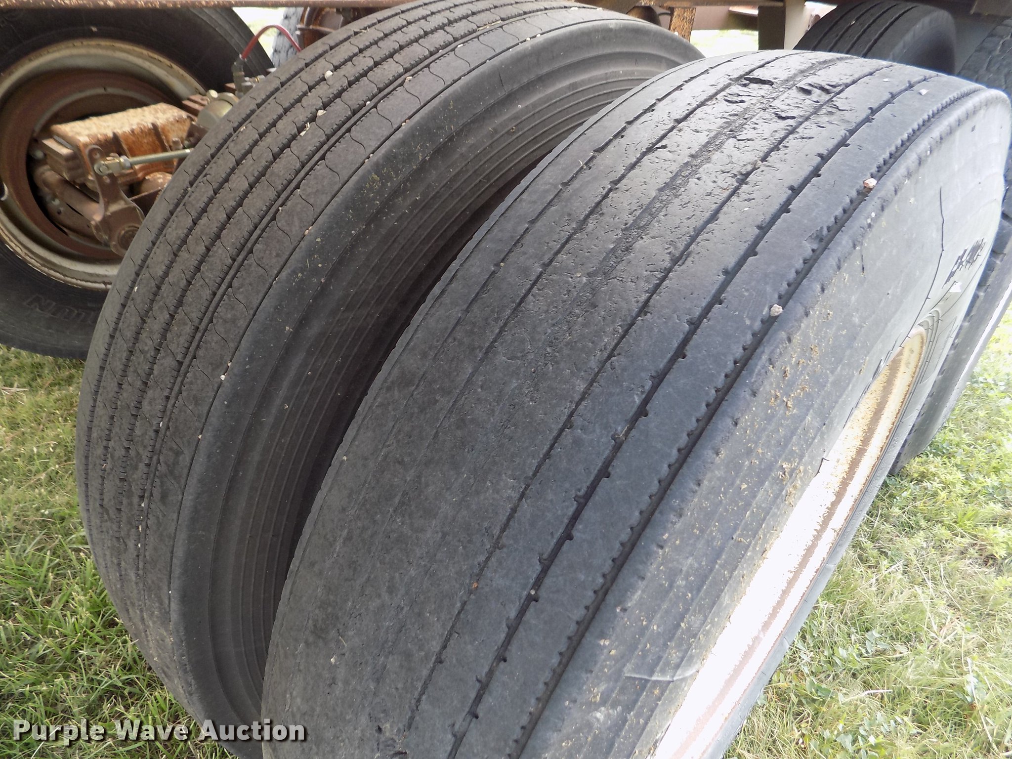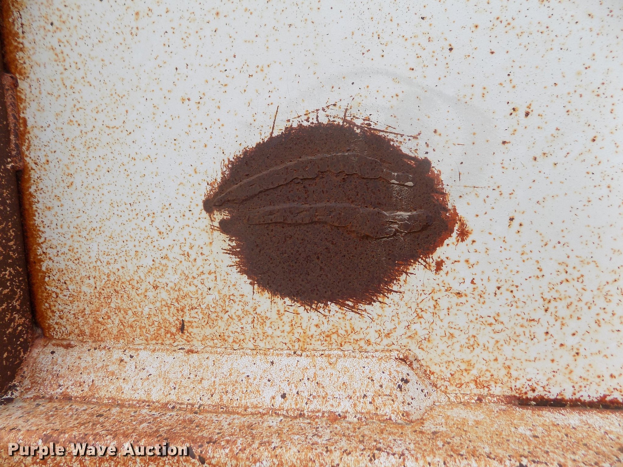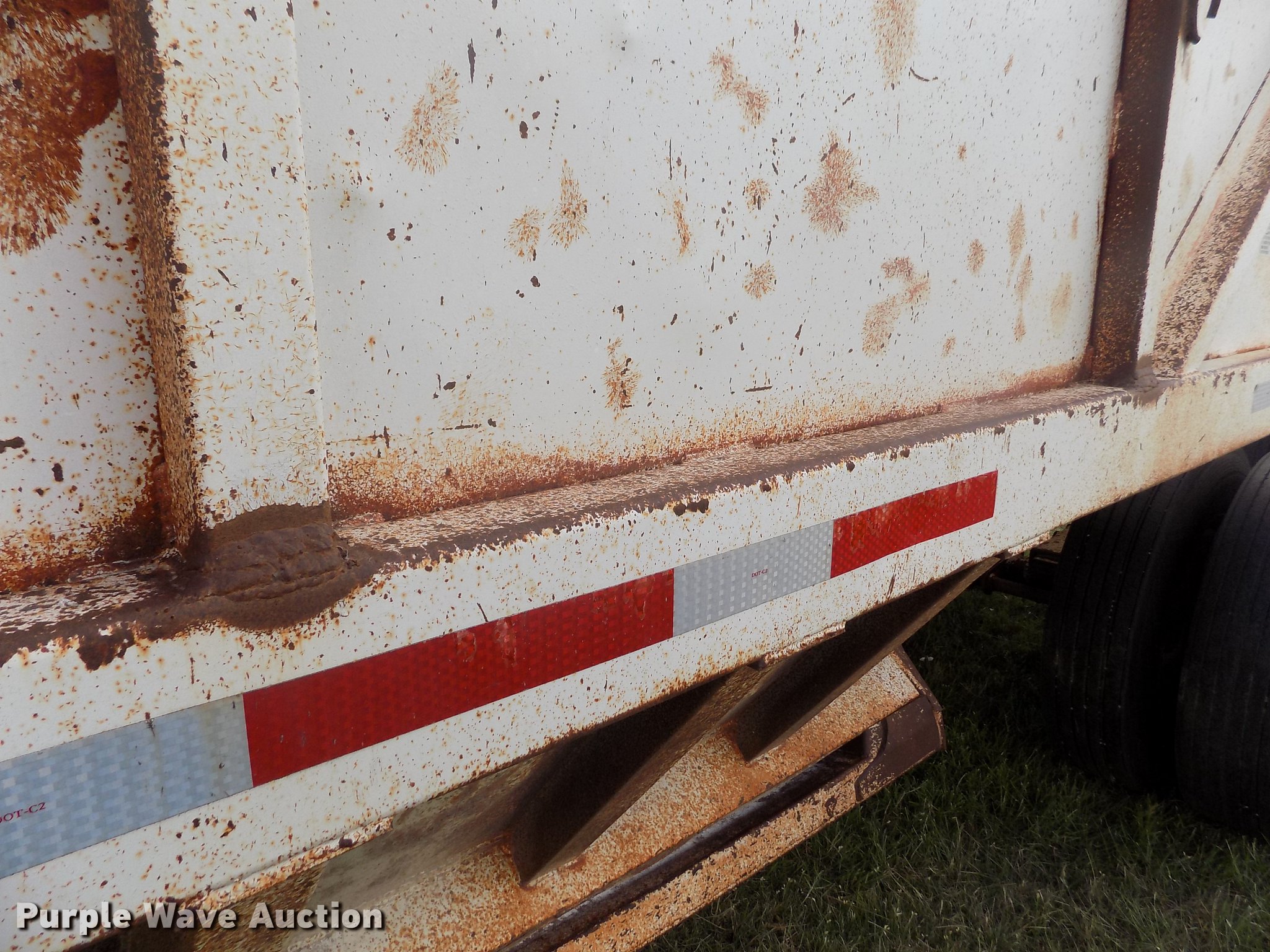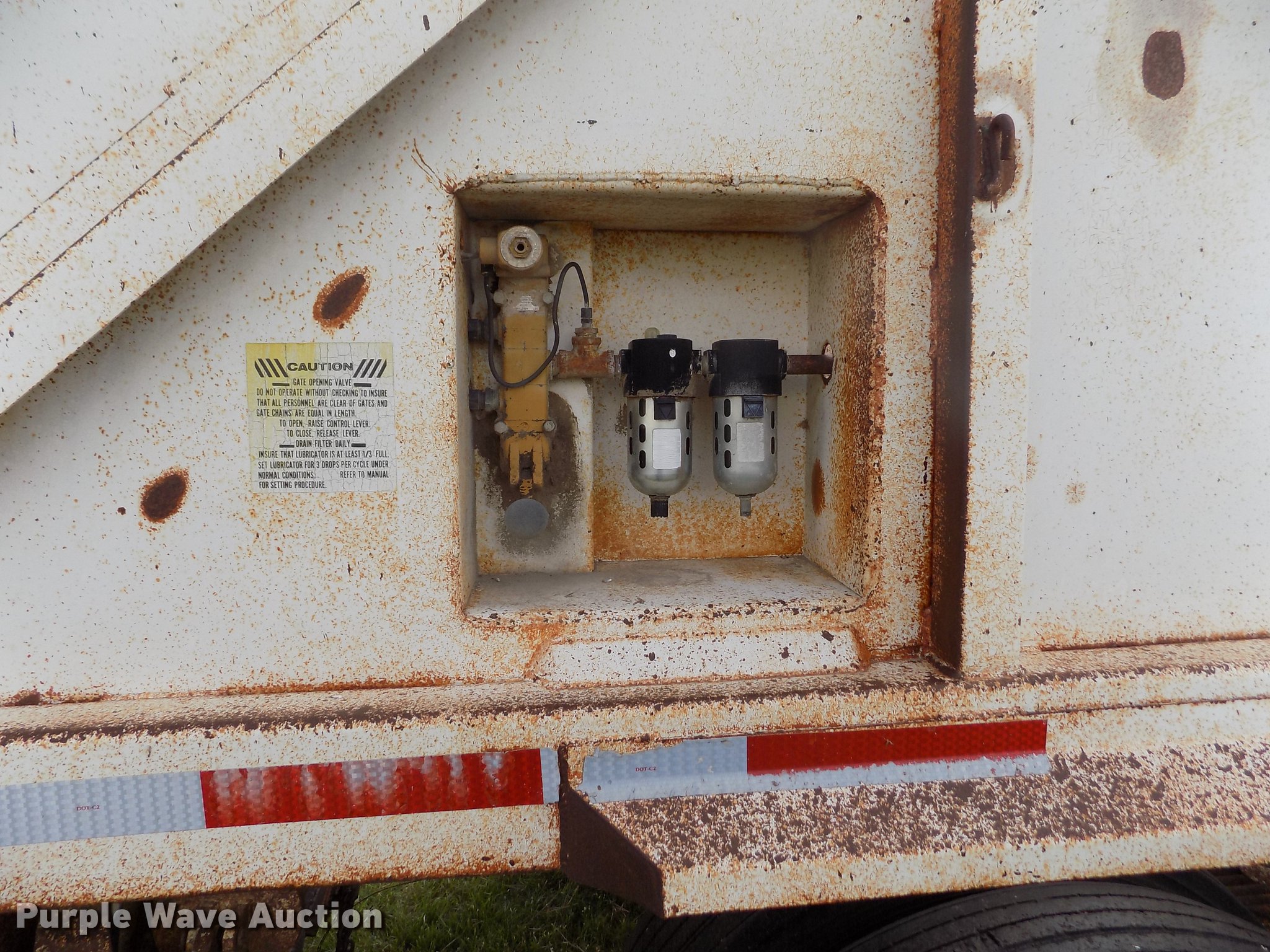 Purple Wave is selling a used Bottom Dump Trailer in Kansas. This item is a 1985 Ranch Manufacturing Co bottom dump trailer with the following: 31.5'L x 94"W, 108" side height, 6" side board height, Steel construction, Air operated clamshell gate, Left side mounted gate controls, Rear push block, Fifth wheel plate, Spring suspension, Air brakes, Steel wheels, 11R24.5 tires, GVWR 80,000 lbs, Portion of side board missing