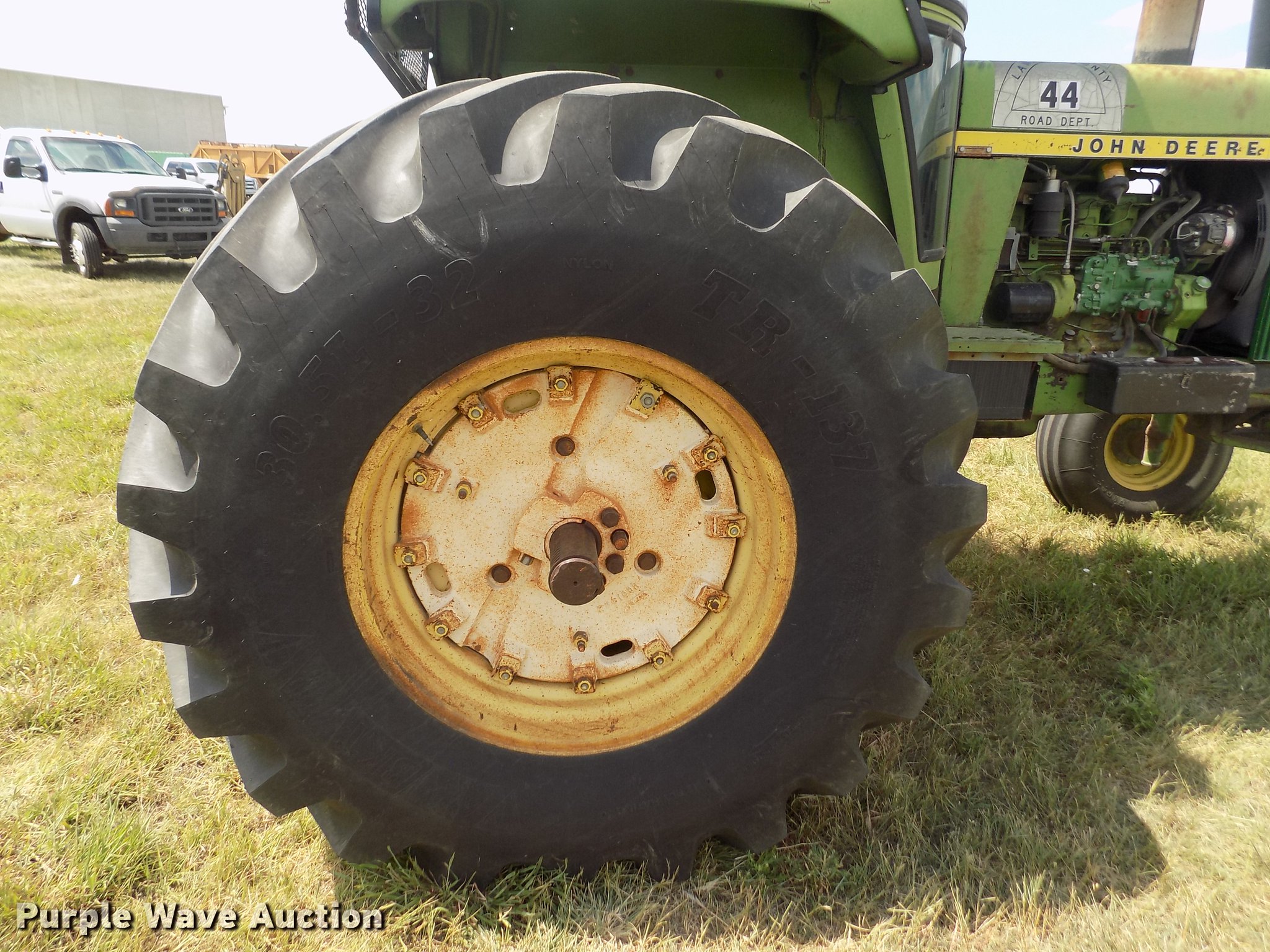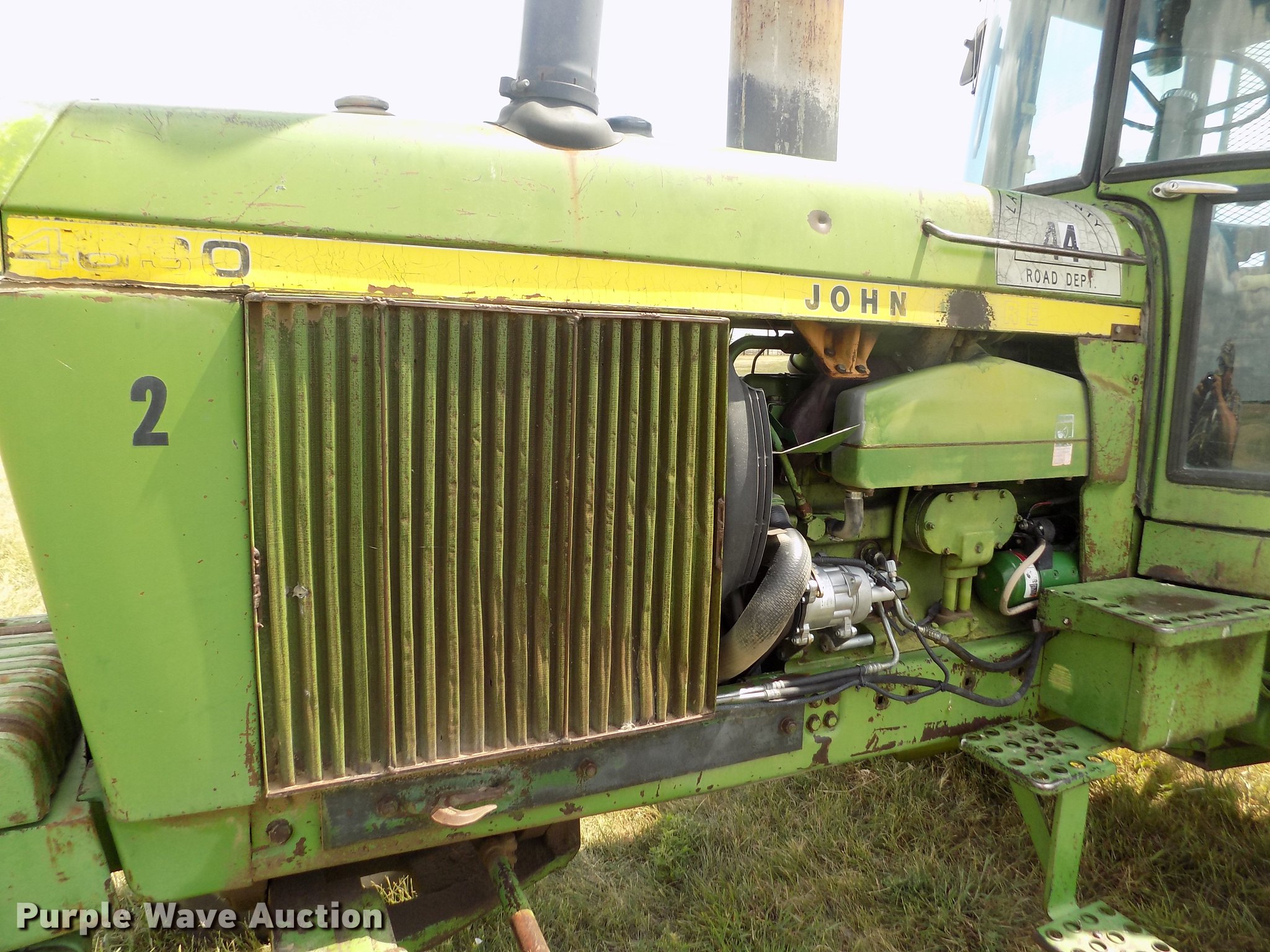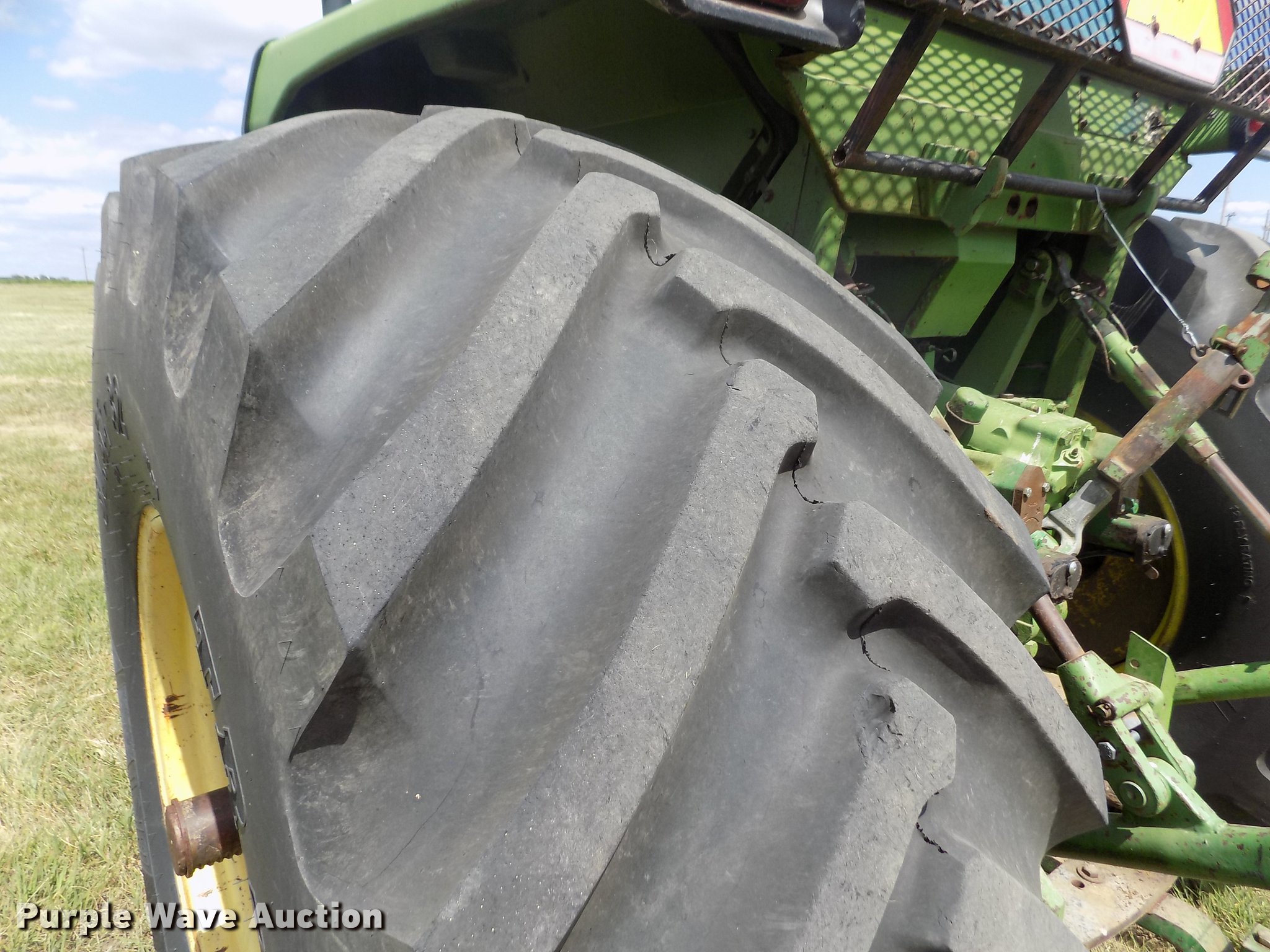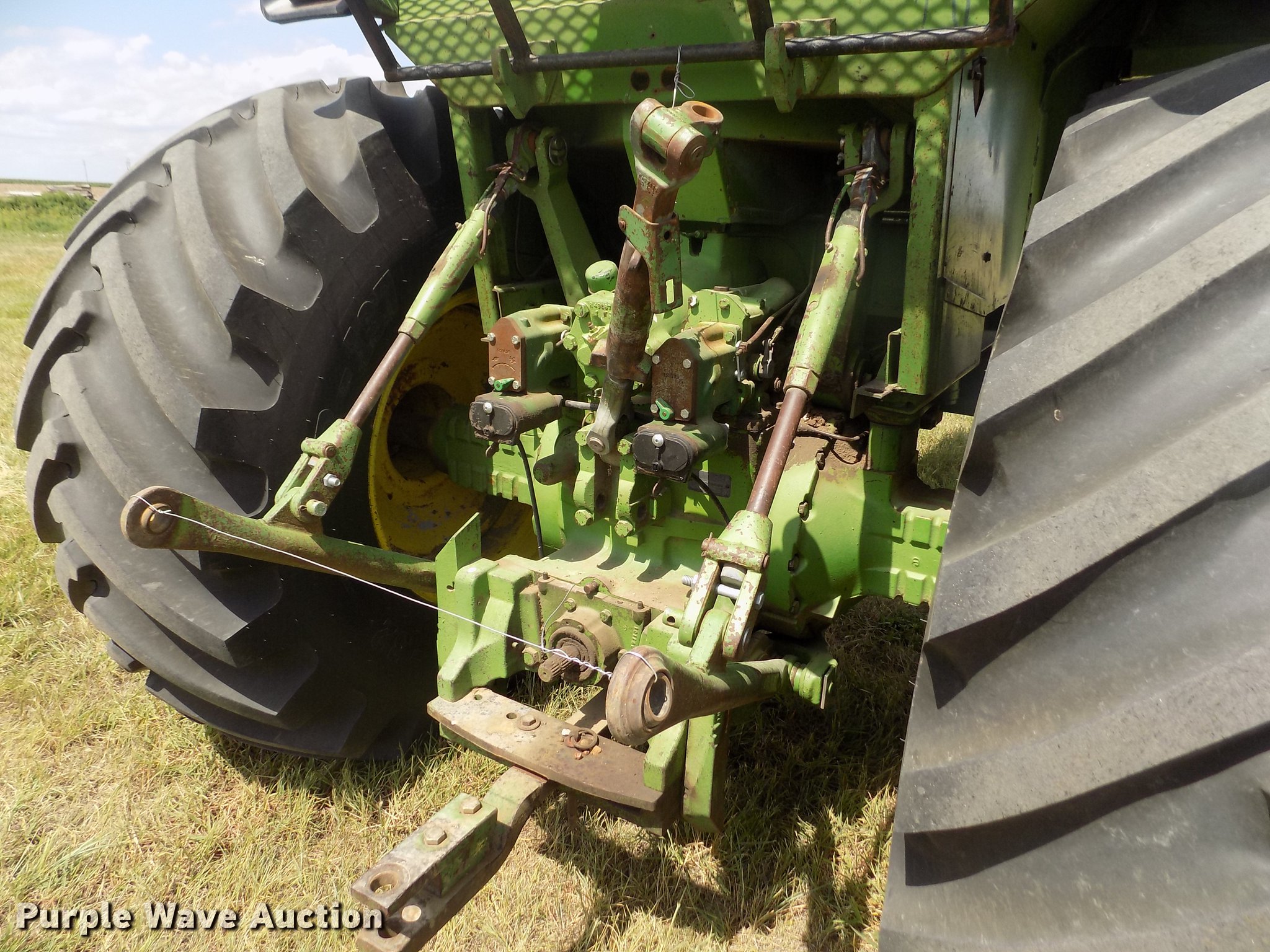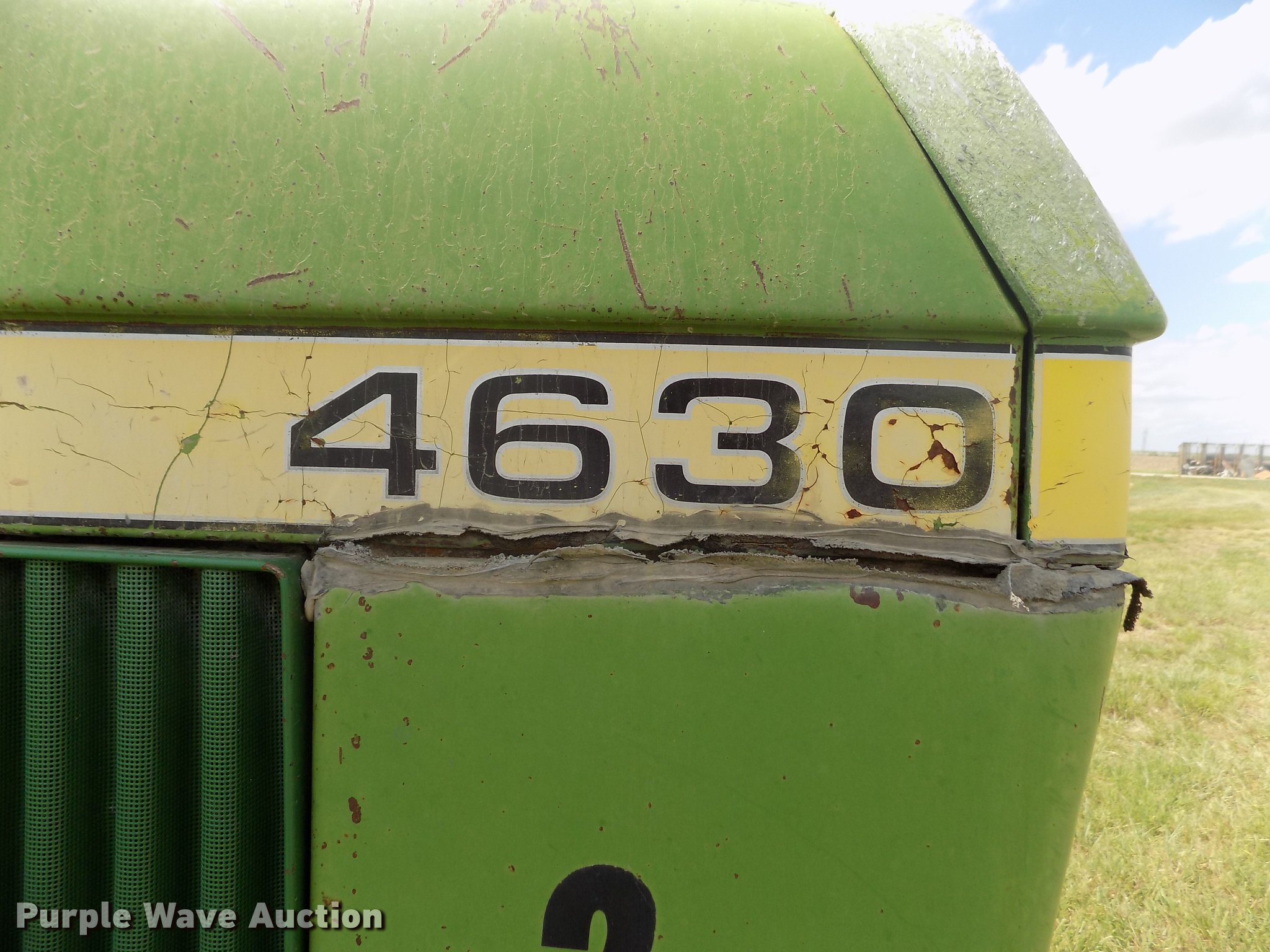 Purple Wave is selling a used Tractor in Kansas. This item is a 1973 John Deere 4630 tractor with the following: 2,906 hours on meter, John Deere 6.6L six cylinder turbo diesel engine, 150 HP, Powershift transmission, 8F-4R gears, Differential lock, AC and heat, AM/FM, Spring suspension seat, Tilt steering wheel, Rear window guard, Three point, 1000 PTO, (2) rear hydraulic remote sets, (10) suitcase weights, 112" wheelbase, 11.00-16 front tires, 30.5L-32 rear tires, Hour meter replaced, Serial 004340R