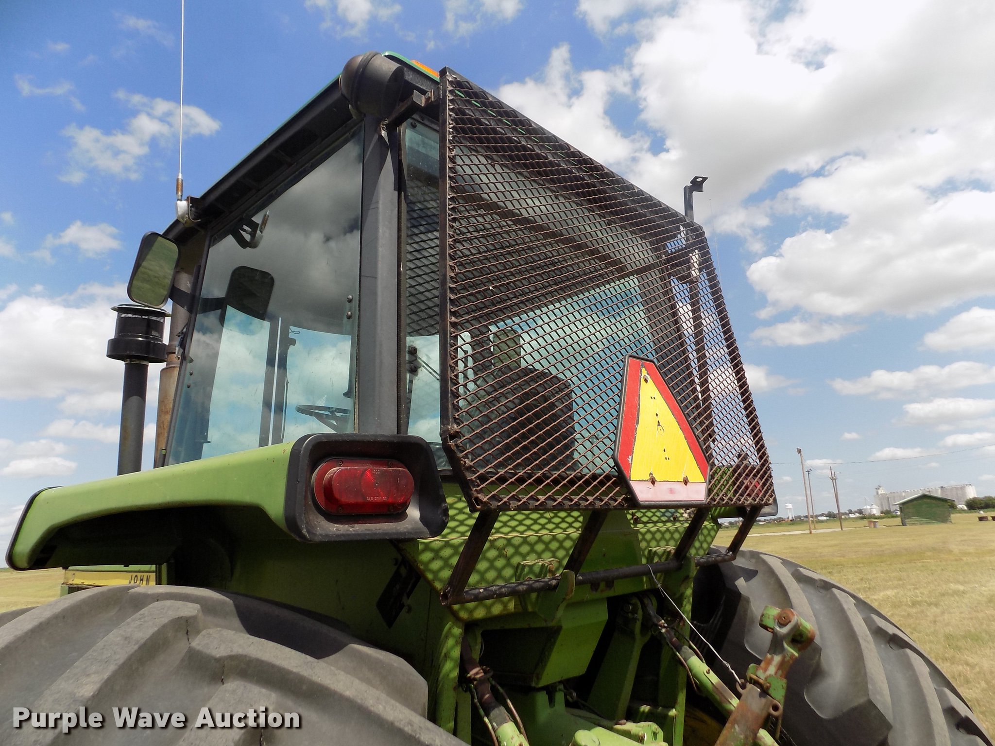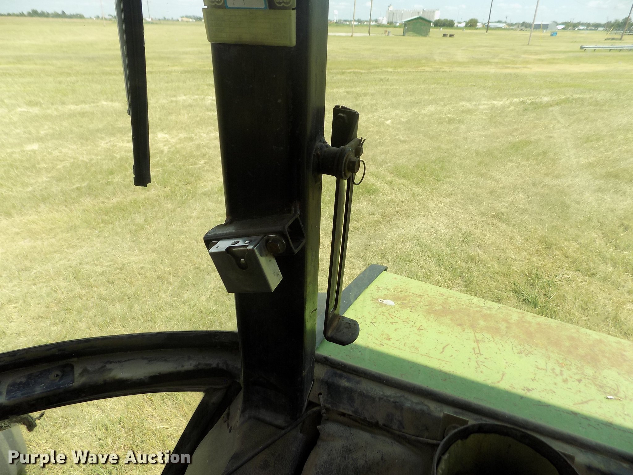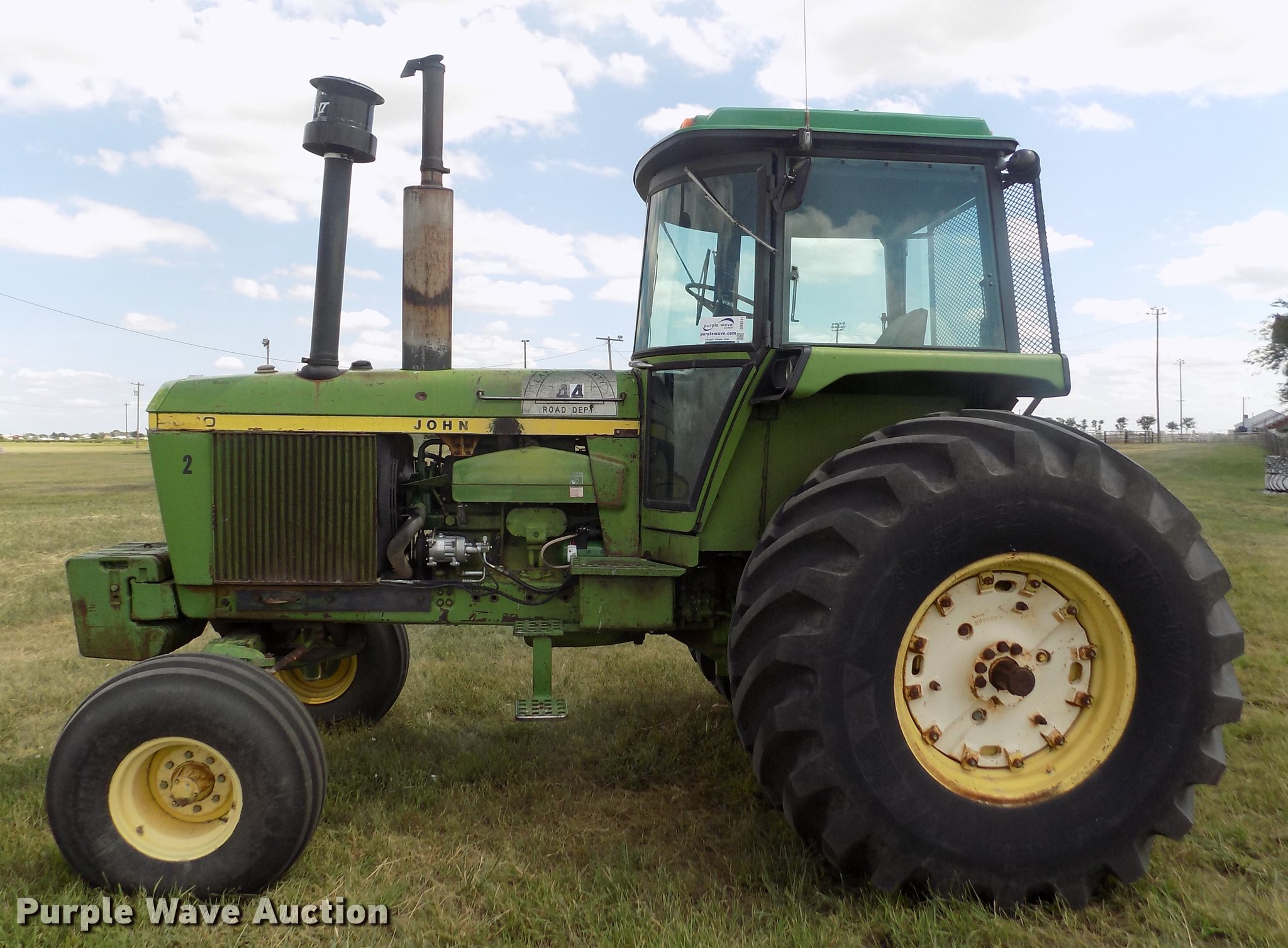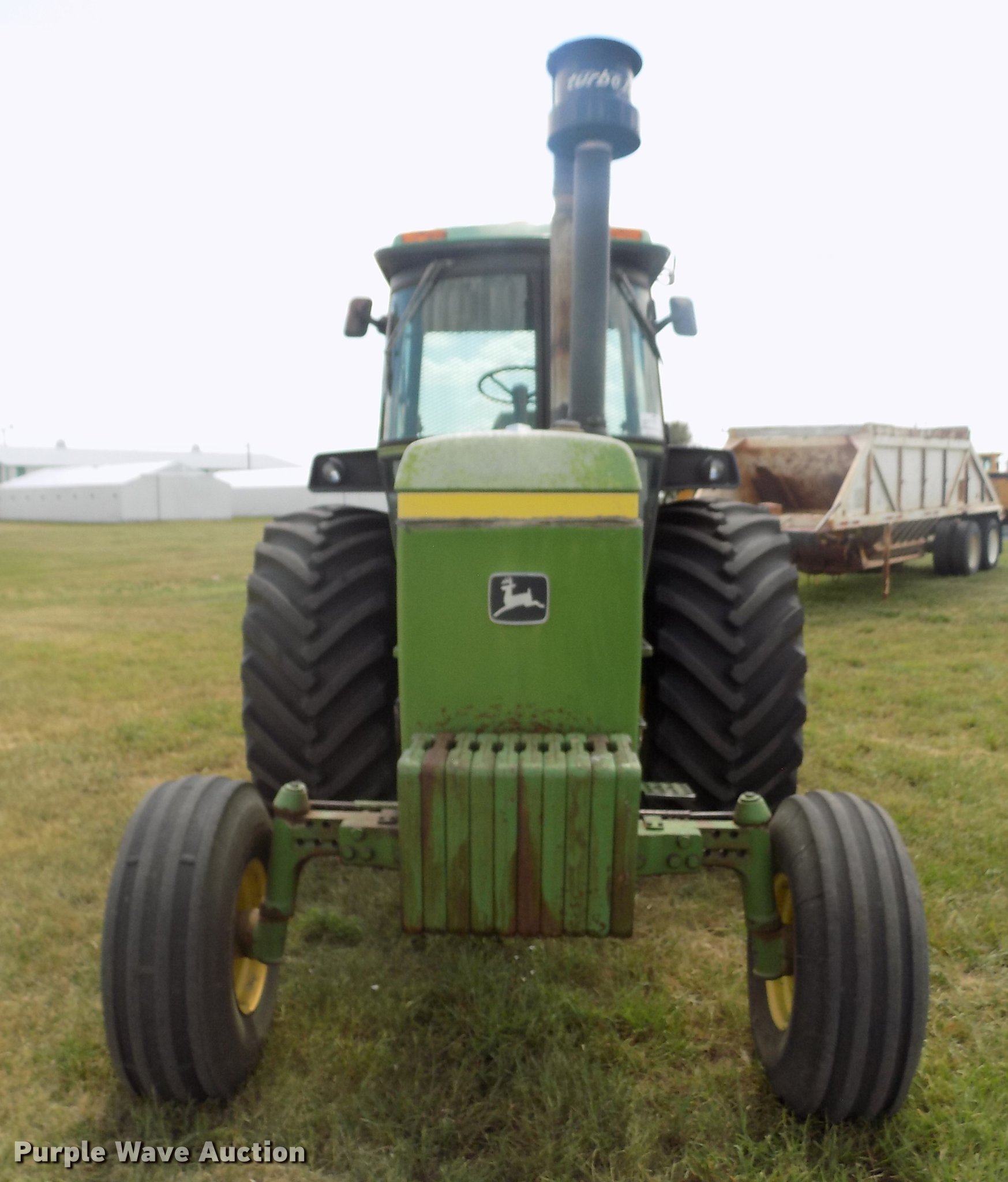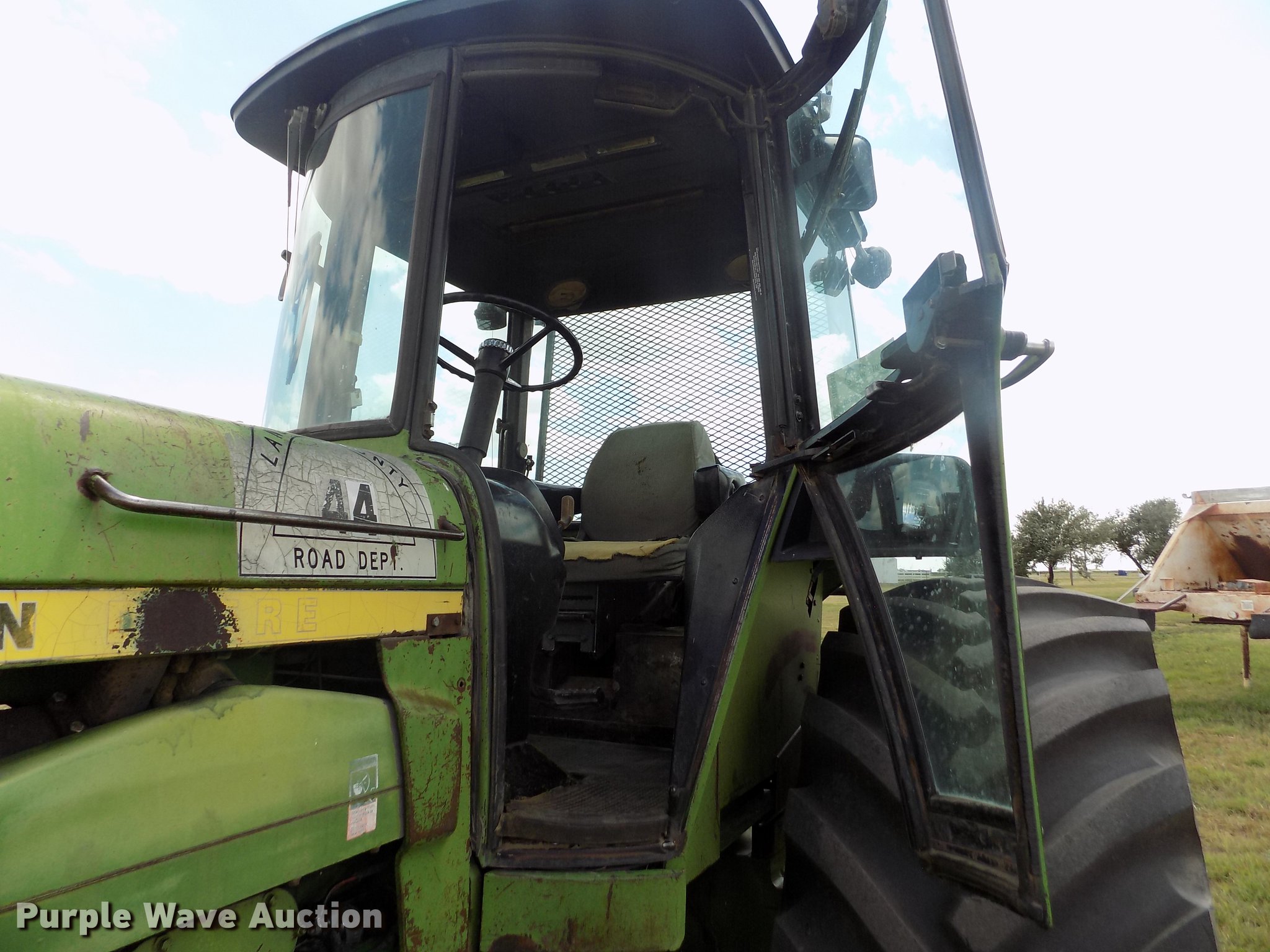 Purple Wave is selling a used Tractor in Kansas. This item is a 1973 John Deere 4630 tractor with the following: 2,906 hours on meter, John Deere 6.6L six cylinder turbo diesel engine, 150 HP, Powershift transmission, 8F-4R gears, Differential lock, AC and heat, AM/FM, Spring suspension seat, Tilt steering wheel, Rear window guard, Three point, 1000 PTO, (2) rear hydraulic remote sets, (10) suitcase weights, 112" wheelbase, 11.00-16 front tires, 30.5L-32 rear tires, Hour meter replaced, Serial 004340R