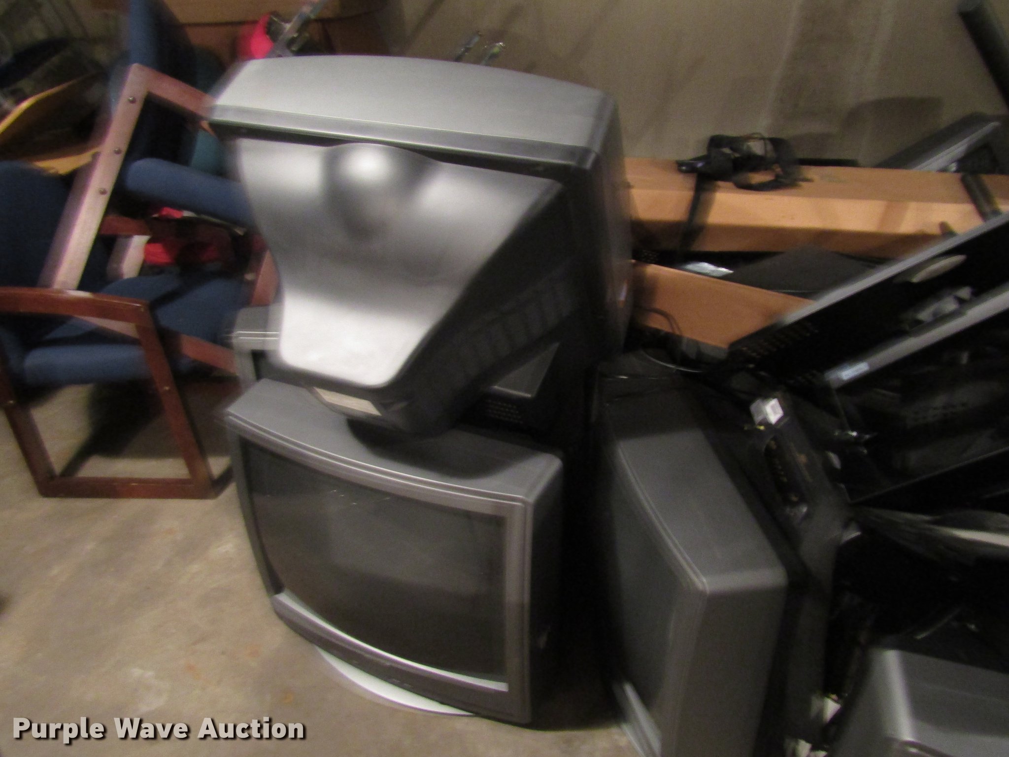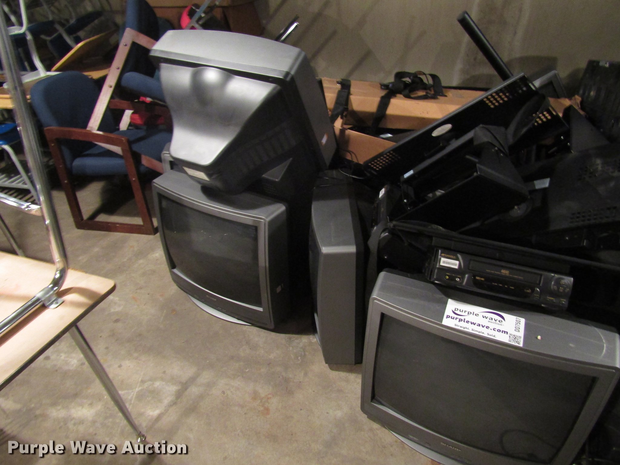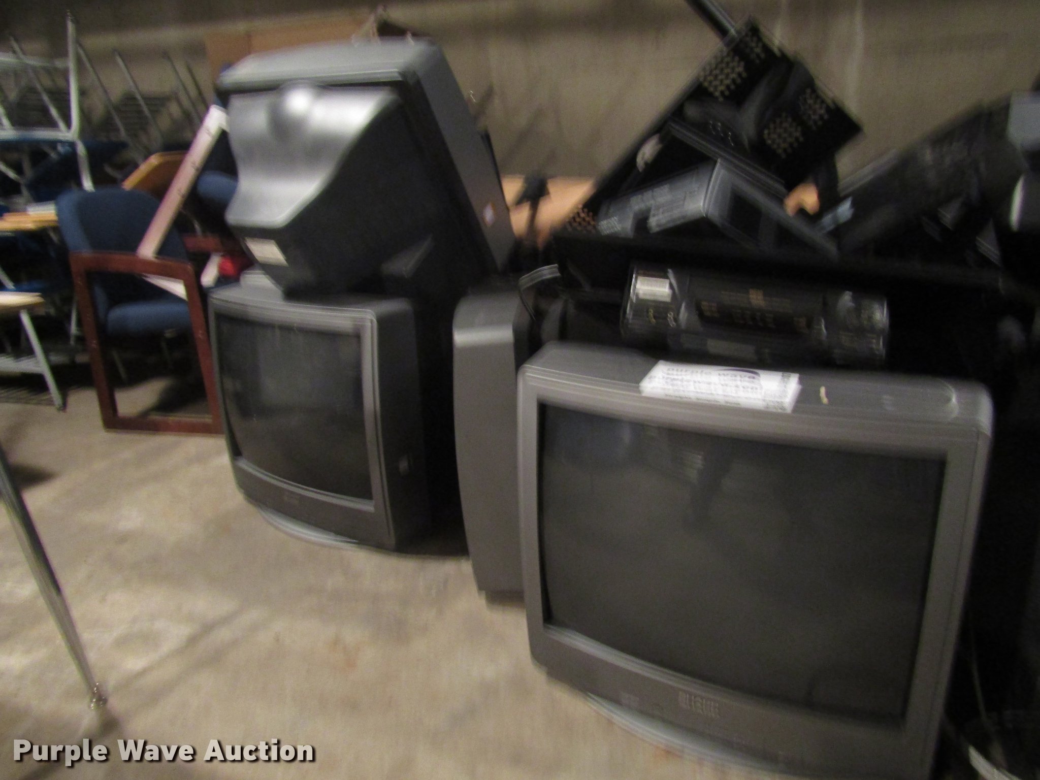 Purple Wave is selling a used Office Supplies and Equip. in Missouri. This item is a Office supplies and equipment with the following: Approx. 15 Sharp television, Approx. 15 Sharp VCRs, Wall mounts, Schools desks, Wood tops, Metal legs, Plastic chairs, Room divider, Approx. 90'L