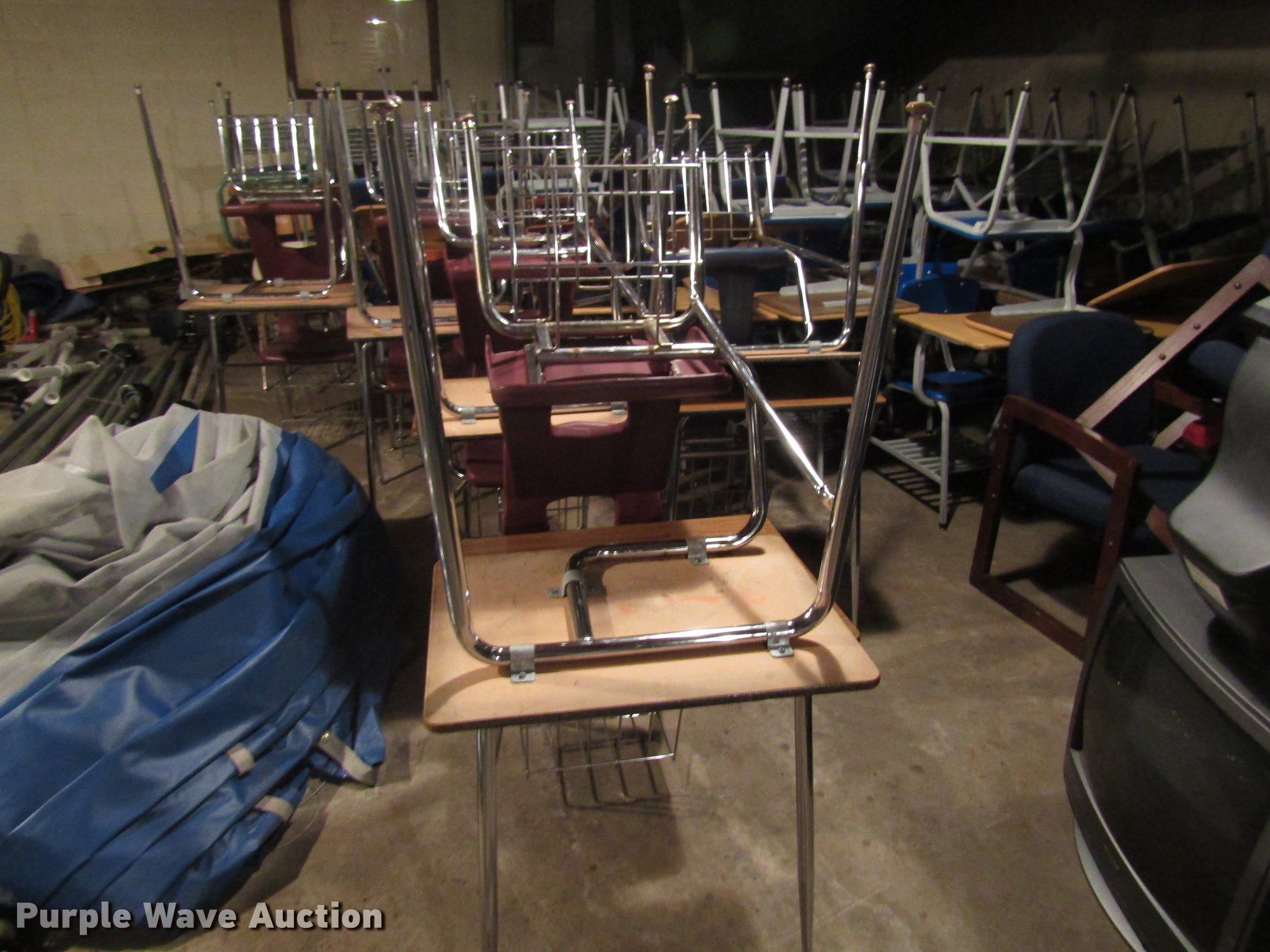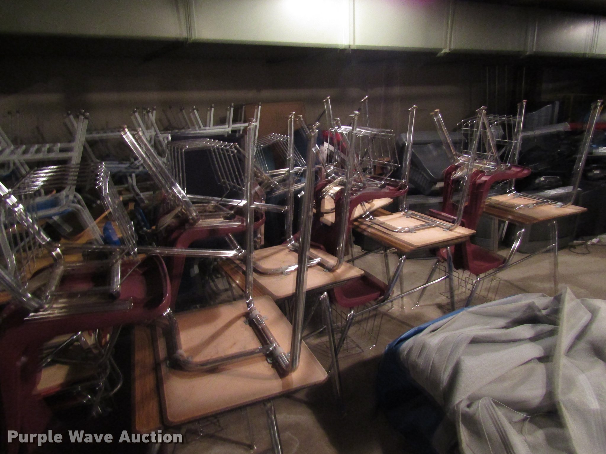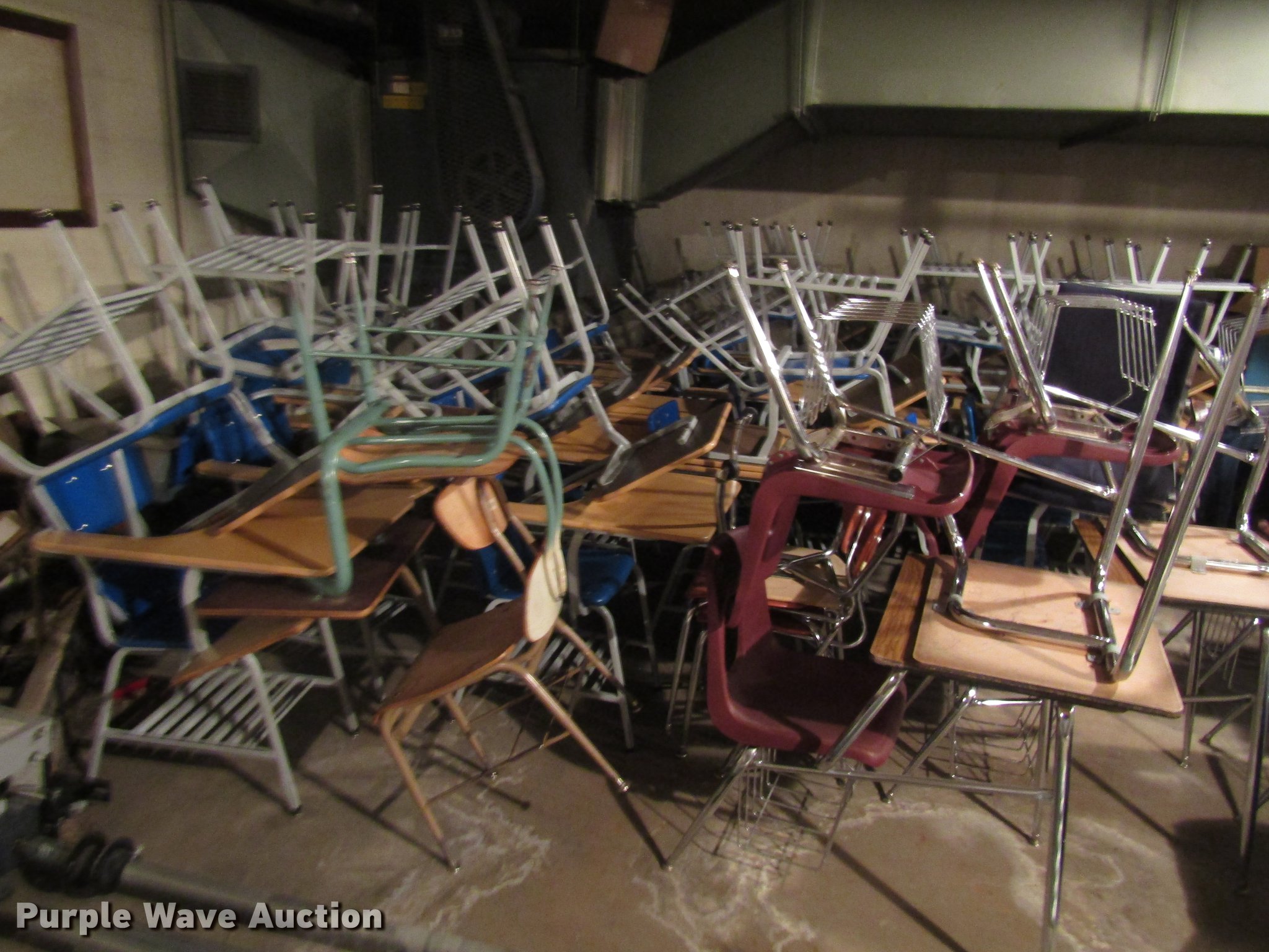 Purple Wave is selling a used Office Supplies and Equip. in Missouri. This item is a Office supplies and equipment with the following: Approx. 15 Sharp television, Approx. 15 Sharp VCRs, Wall mounts, Schools desks, Wood tops, Metal legs, Plastic chairs, Room divider, Approx. 90'L