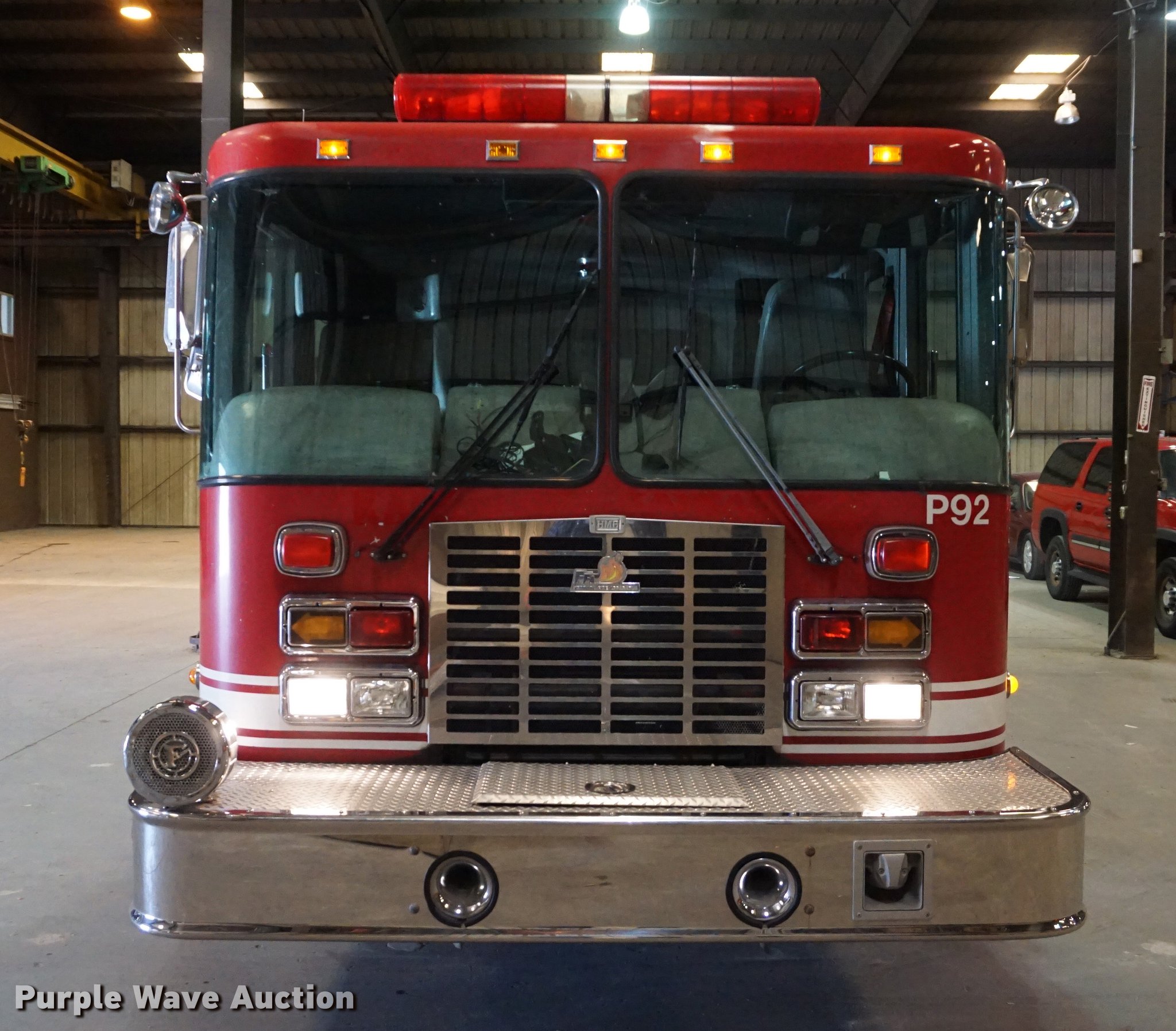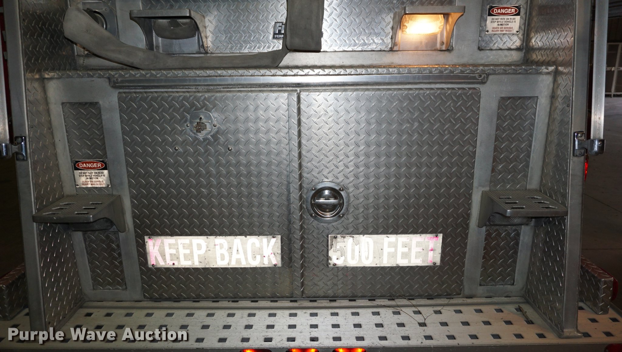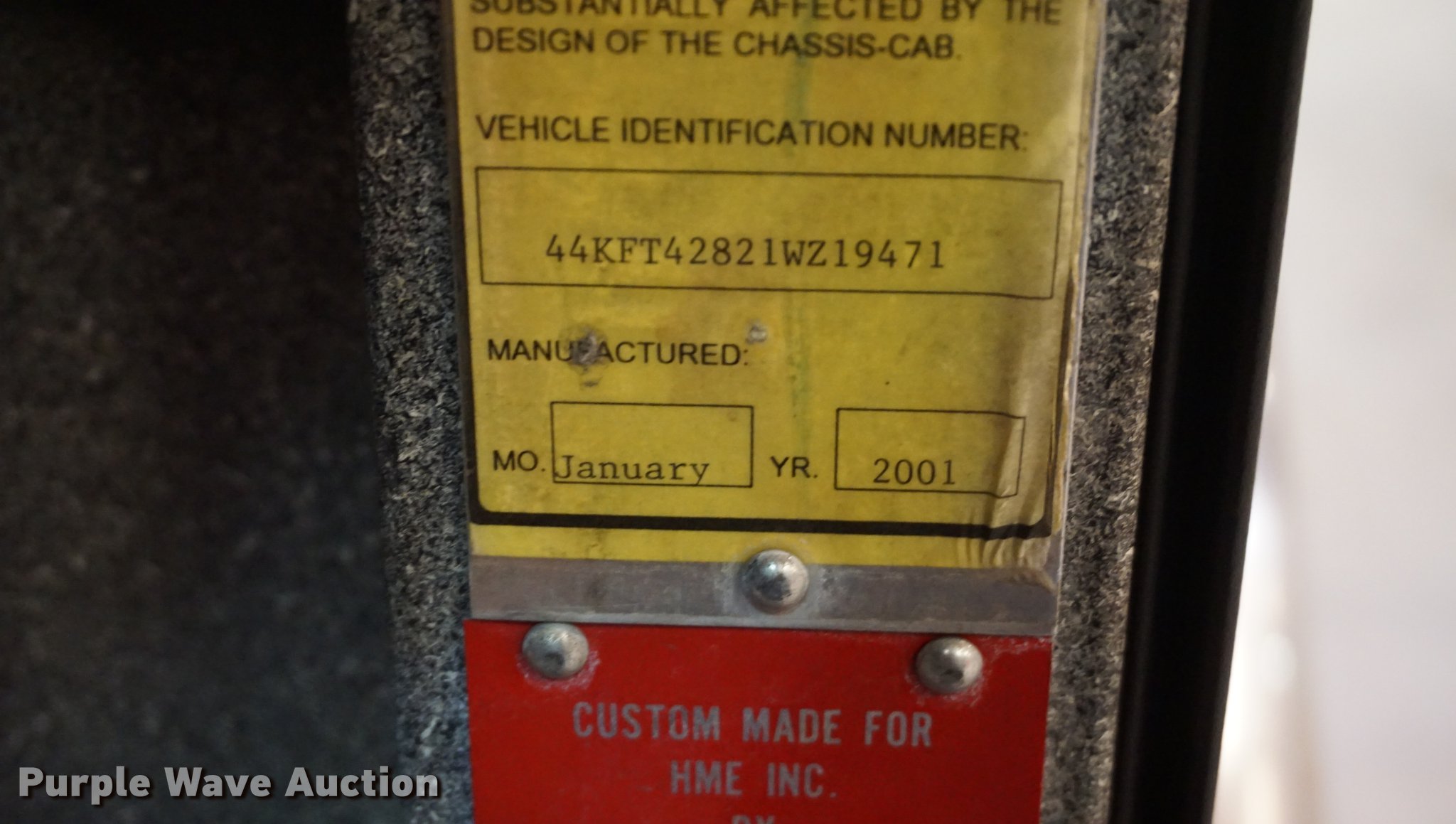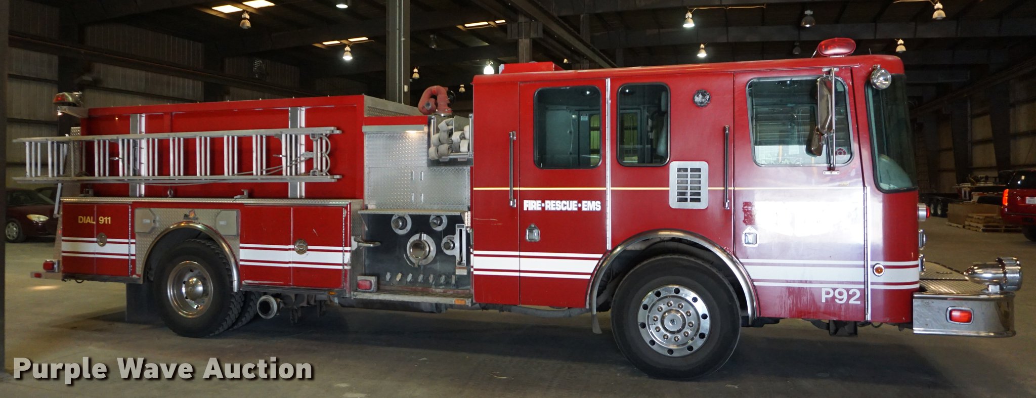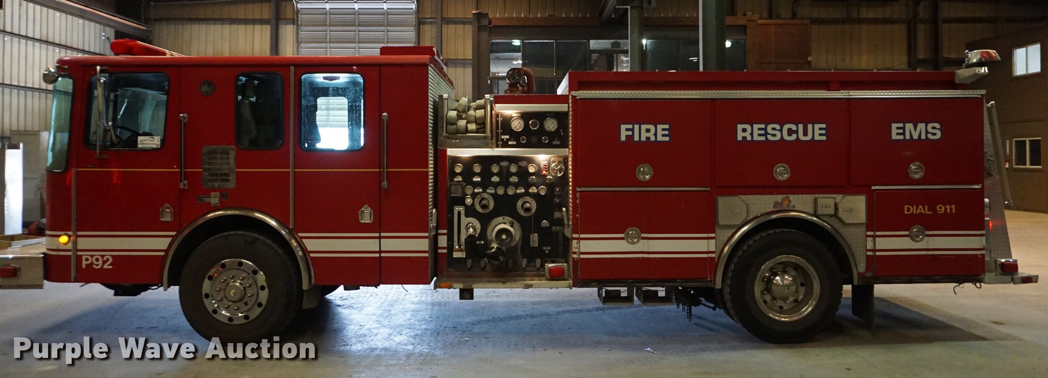 Purple Wave is selling a used Fire Truck or Emergency Vehicle in Kansas. This item is a 2001 HME pumper fire truck with the following: 85 hours on meter, Odometer display inoperable, Detroit Diesel Series 60 12.7L six cylinder turbo diesel engine, 400 HP, Allison automatic transmission, Single axle, AC and heat, Air suspension seat, PTO, 500 gallon tank, Hale OSC pump, 1,250 gpm, Hose, Ladder, Air brakes, 385/65R22.5 front tires, 11R22.5 rear tires, Unit# P92