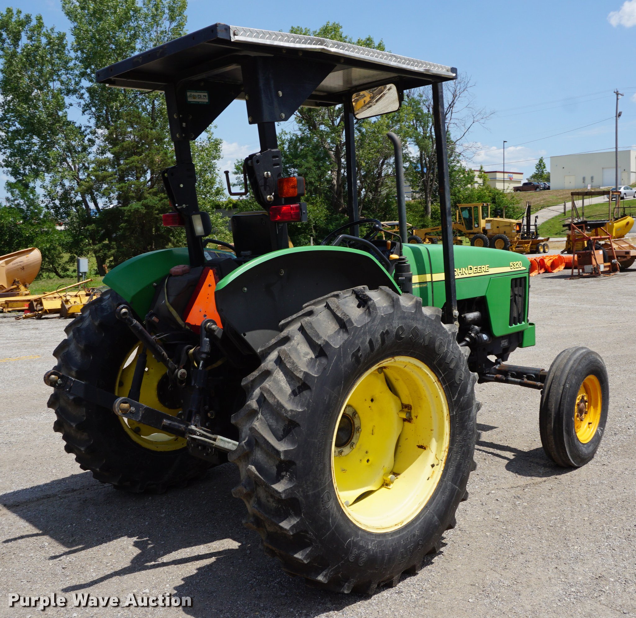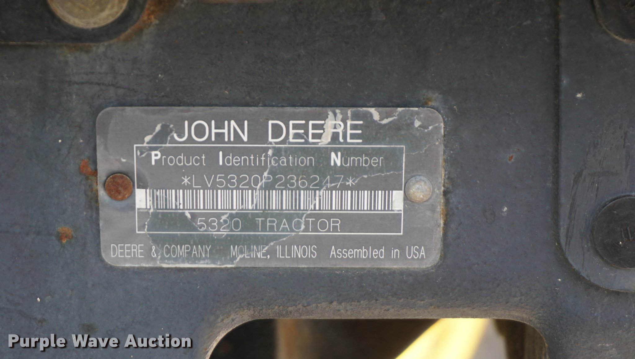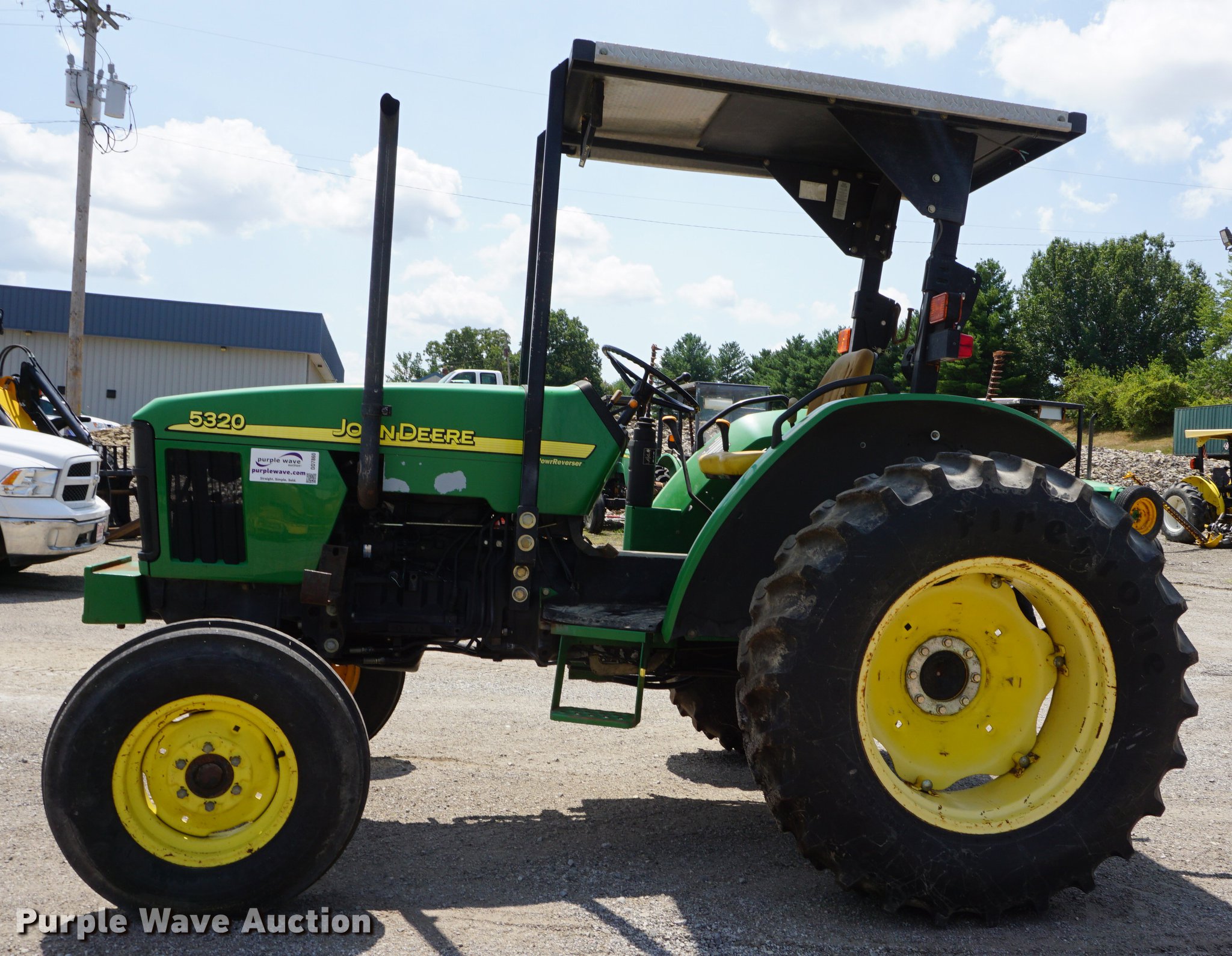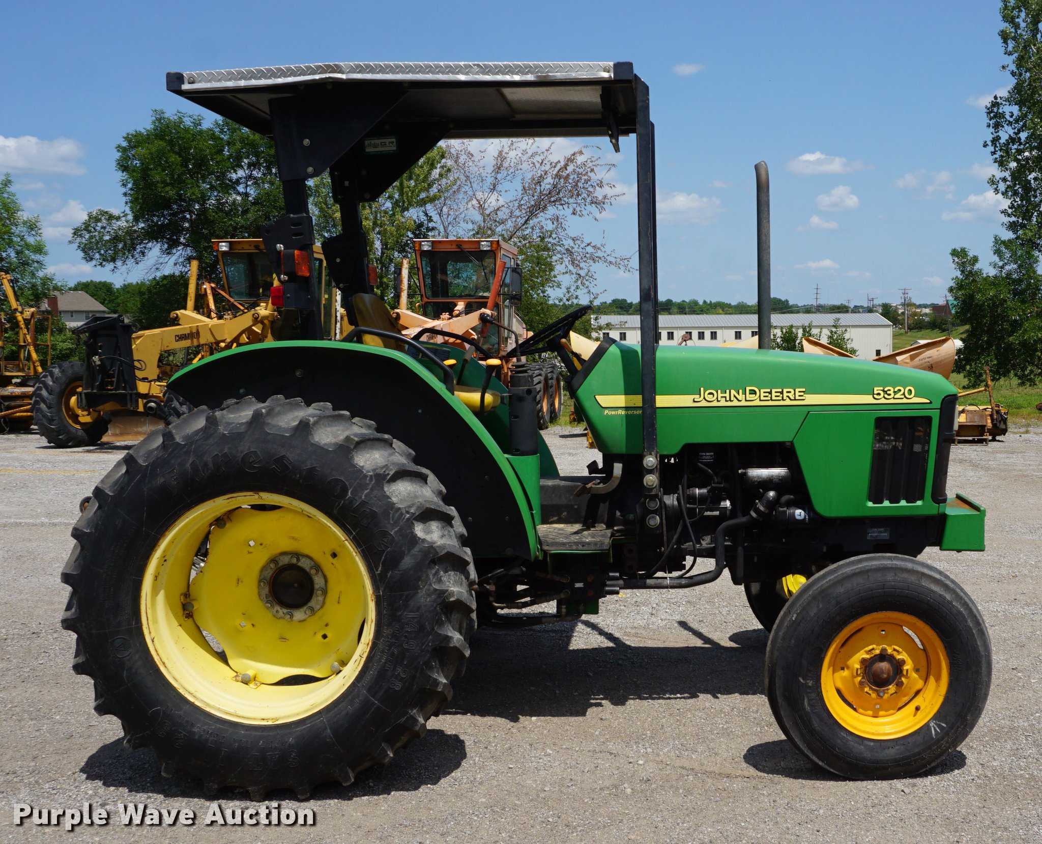 Purple Wave is selling a used Tractor in Missouri. This item is a 2002 John Deere 5320 tractor with the following: 2,233 hours on meter, John Deere 3029T 2.9L three cylinder turbo diesel engine, 64 HP, Power Reverser transmission, 12F-12R gears, Left-hand reverser, Canopy, Suspension seat, Three point, Top link, Seven pin outlet, 540 PTO, 7.50-16 front tires, 14.9-28 rear tires, Engine rear main seal leaks, Serial LV5320P236217