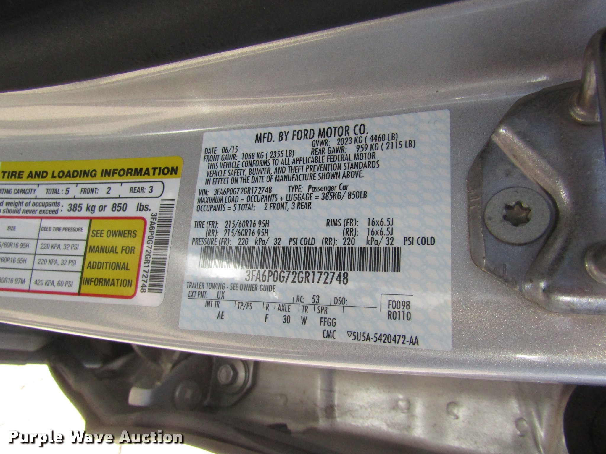 Purple Wave is selling a used Passenger Vehicle in Kansas. This item is a 2016 Ford Fusion with the following: 135,852 miles on odometer, 2.5L L4 DOHC 16V gas engine, Automatic transmission, AC and heat, Tilt, Cruise, AM/FM/CD, Power windows, locks, and mirrors, Cloth interior, P215/60R16 tires