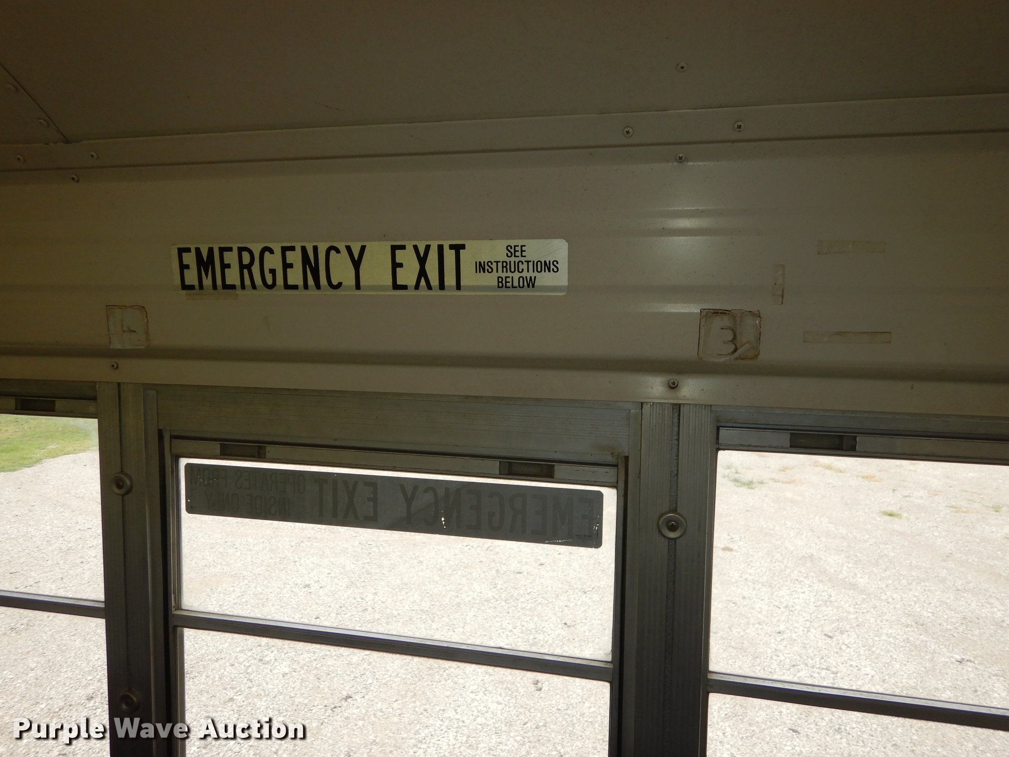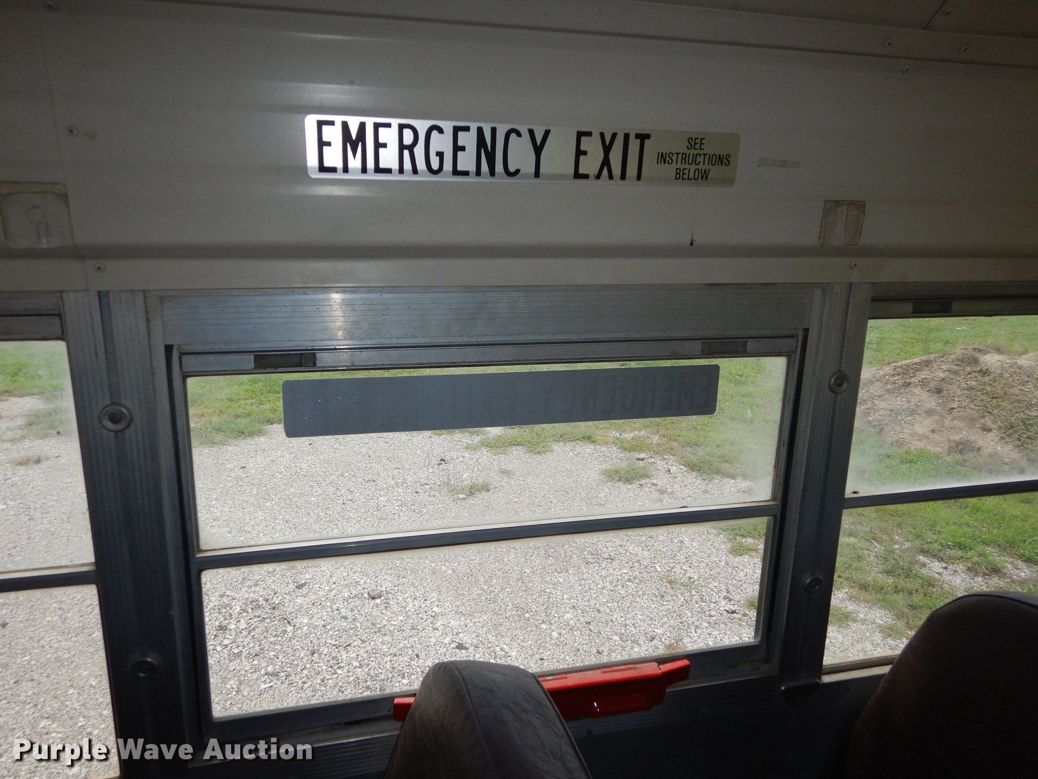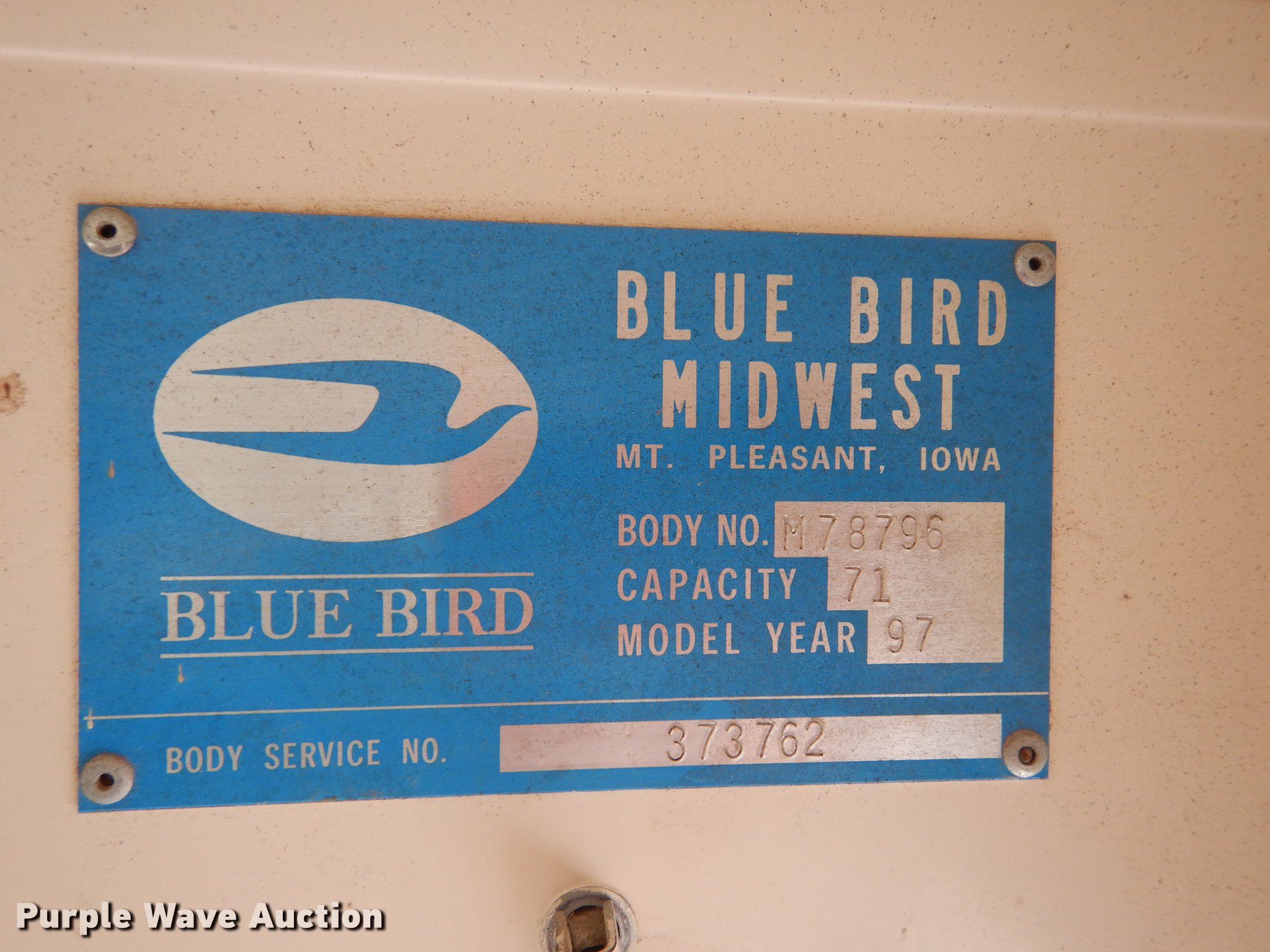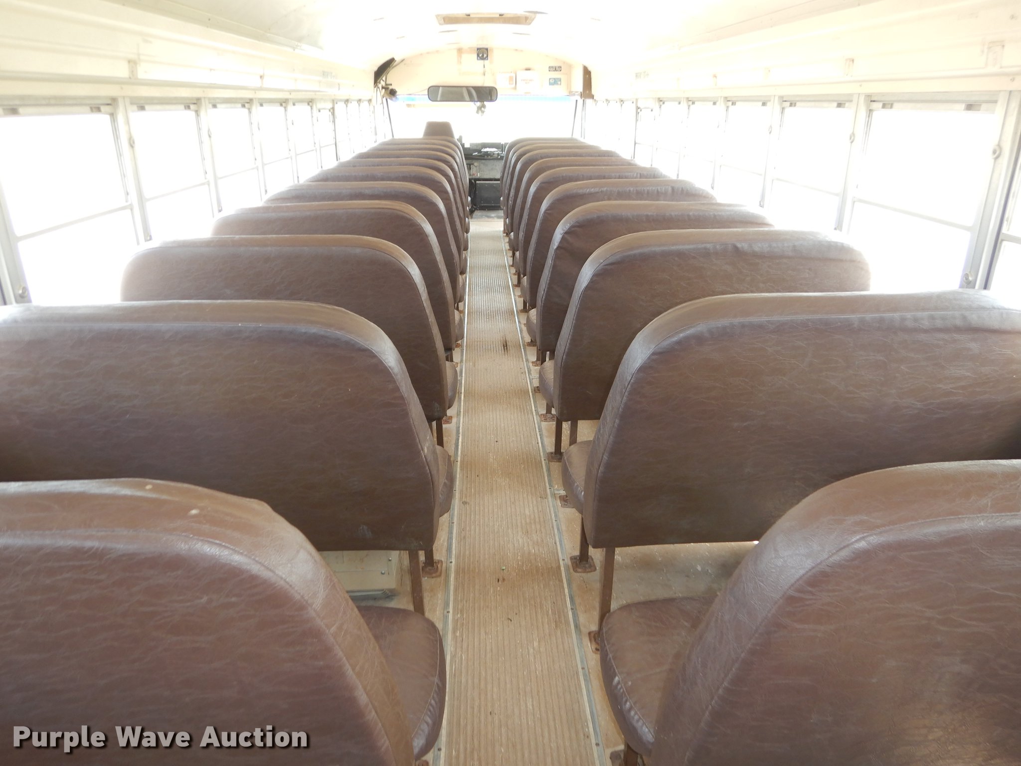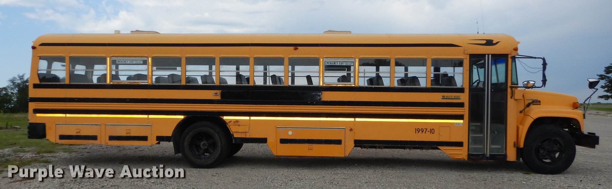 Purple Wave is selling a used Bus in Kansas. This item is a 1997 Chevrolet Blue Bird school bus with the following: 184,740 miles on odometer, 6.0L V8 gas engine, Automatic transmission, Single axle, Heat, AM/FM/cassette, Heated mirrors, Vinyl interior, 71 passenger capacity, Ceiling, rear, and side emergency exits, Lighted stop sign, Crossing arm, Hi-idle switch, Backup alarm, Underside luggage storage, Rear tow hooks, Spring suspension, Hydraulic brakes, 275" wheelbase, Goodyear 10R22.5 tires, GVWR 27,960 lbs, Engine issues, Idles hot, Cam bearing needs to be replaced, Does not maintain oil pressure when hot, Unit# 1997-10