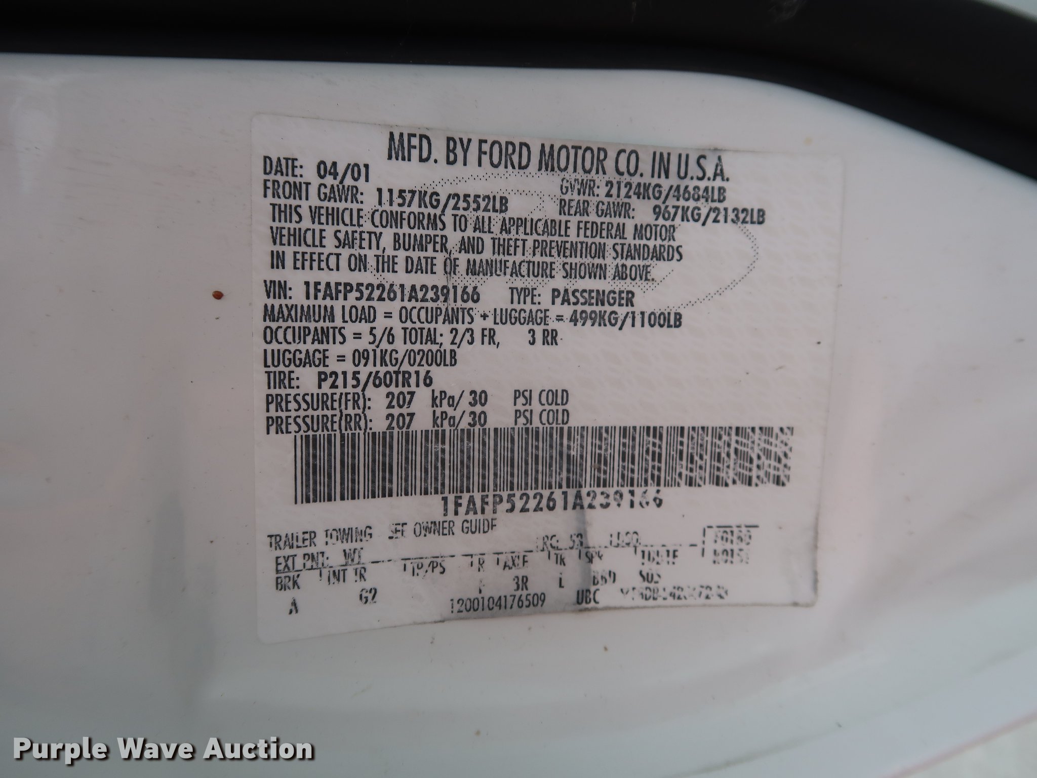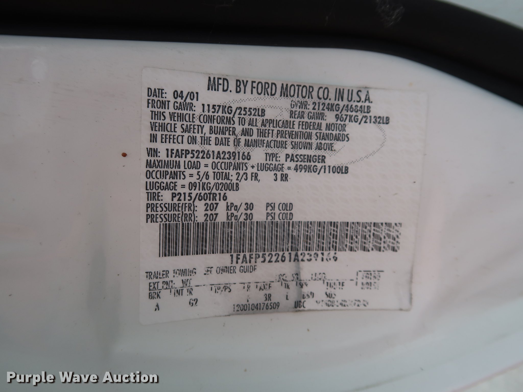 Purple Wave is selling a used Passenger Vehicle in Kansas. This item is a 2001 Ford Taurus with the following: 102,291 miles on odometer, 3.0L V6 OHV 12V FFV gas engine, Automatic transmission, AC and heat, Tilt, Cruise, AM/FM, Power windows, locks, and mirrors, Cloth interior, 215/60R16 tires, Unit# 199