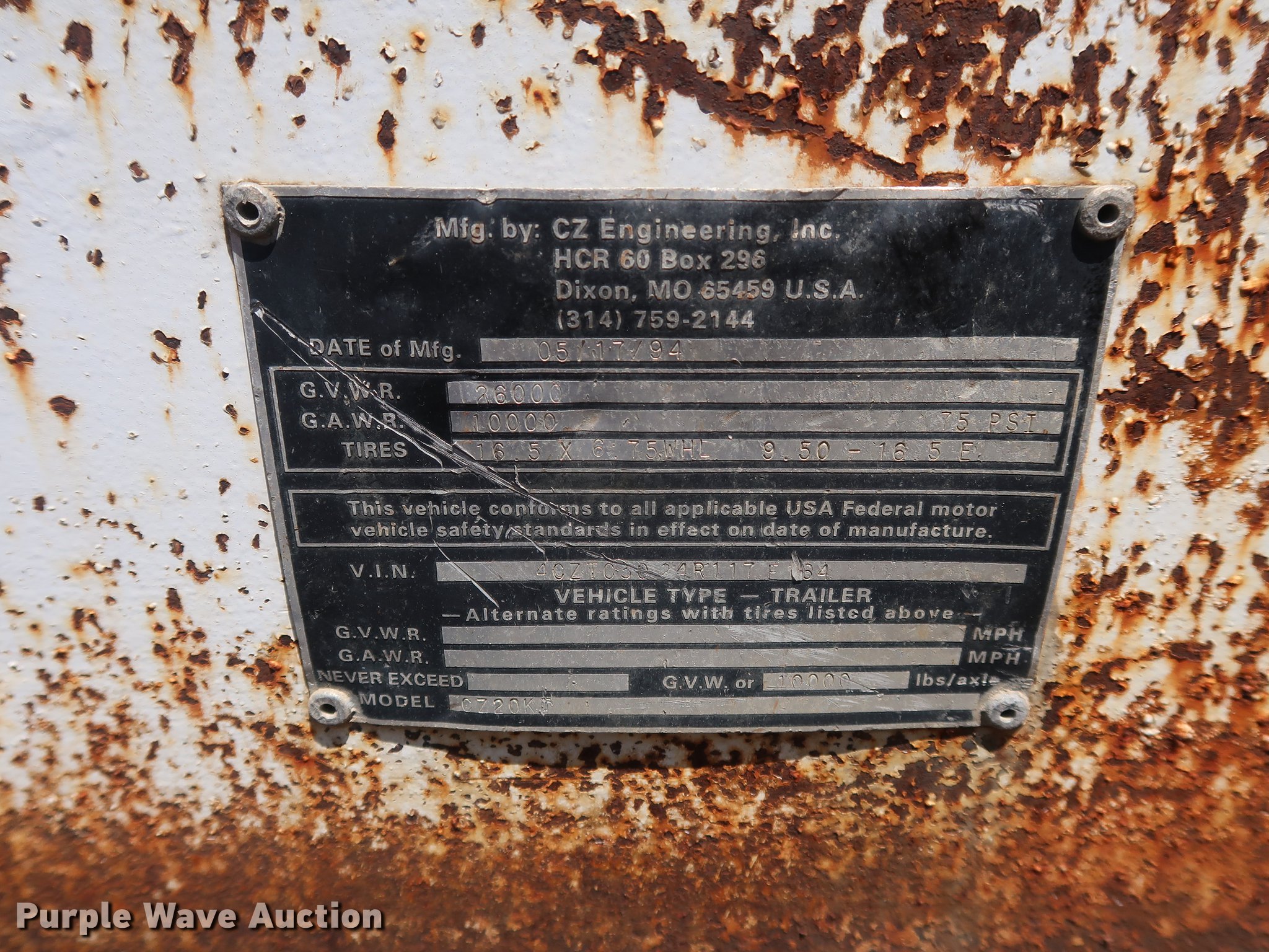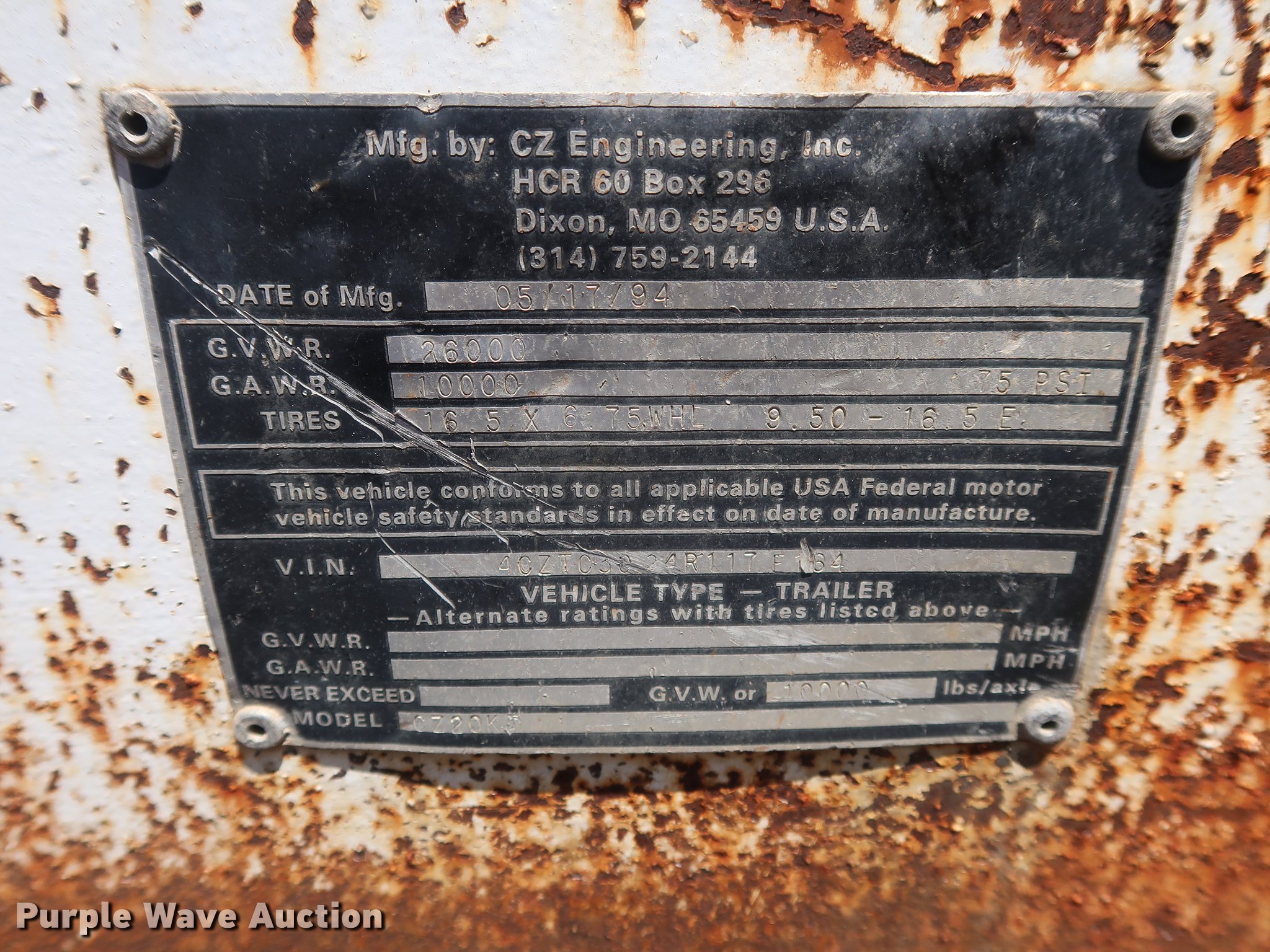 Purple Wave is selling a used Equip. Trailer in Kansas. This item is a 1994 CZ Engineering CZ20KT equipment trailer with the following: 20'L x 8'W deck, 5'L dovetail, 5'L x 20"W ramps, Pintle hitch, Jack stand, Spring suspension, Air brakes, Tandem axle, 9.50-16.5 tires, GVWR 26,000 lbs, Unit# 920