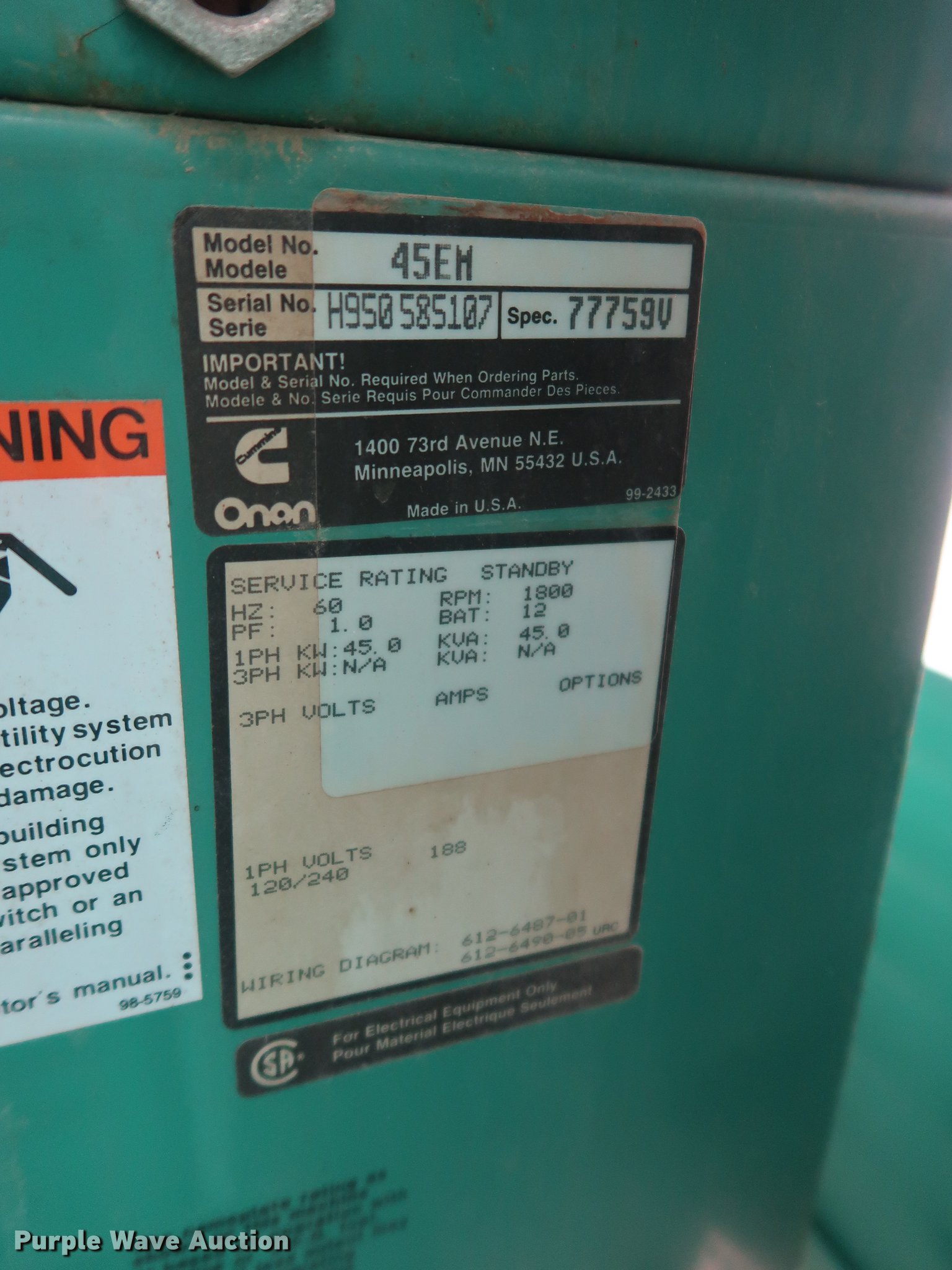 Onan 45EM generator has sold in Kansas City, Kansas for $3190. Item DF2285 sold on August 21st, 2018.