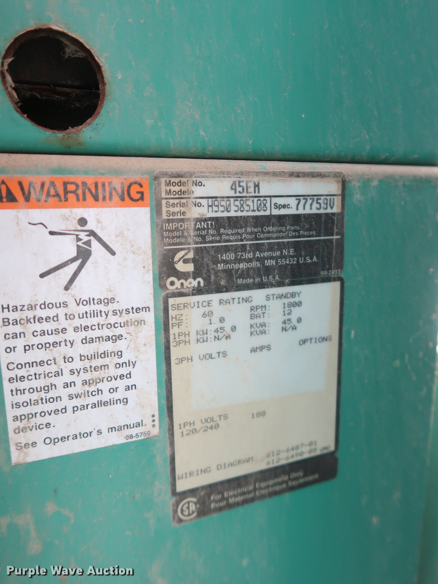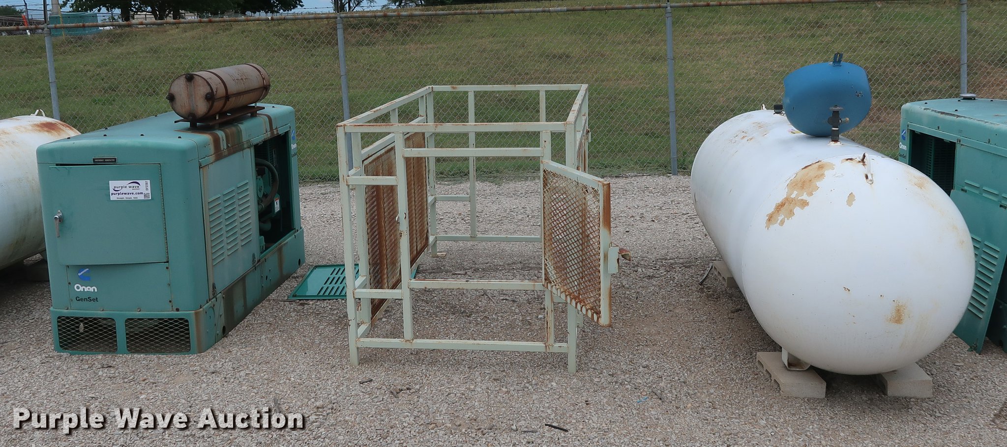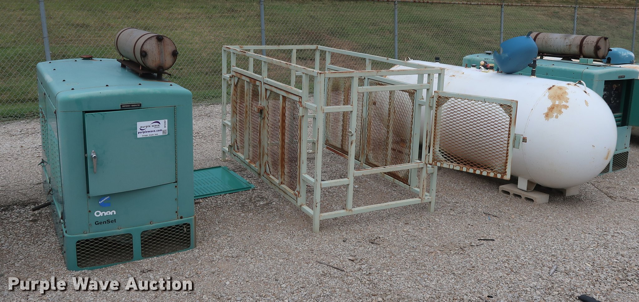 Purple Wave is selling a used Generator Set in Kansas. This item is a Onan 45EM generator with the following: 889 hours on meter, Six cylinder propane engine, Propane tank, Steel enclosure, Unknown operating condition, Serial H950585108
