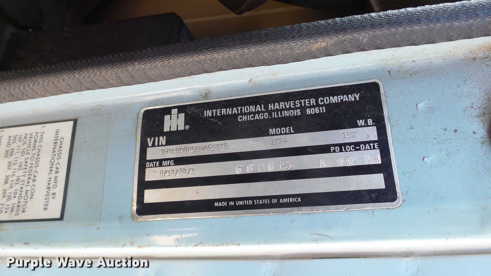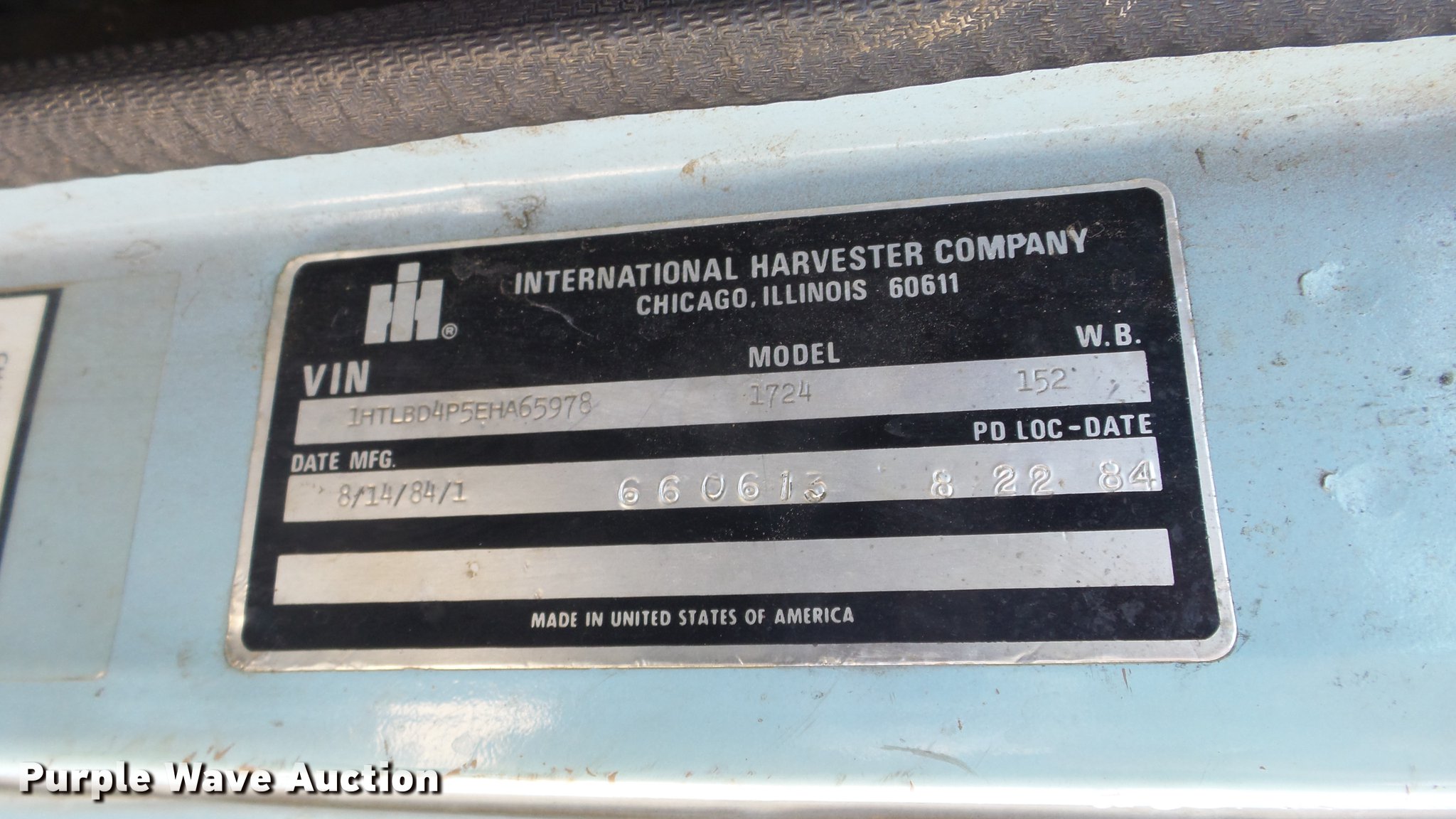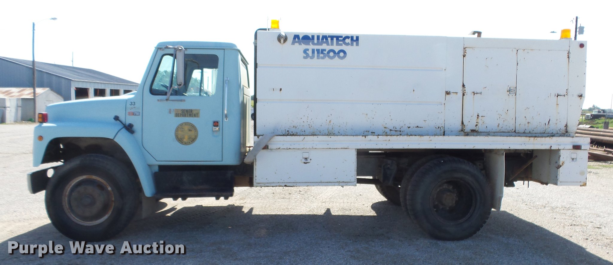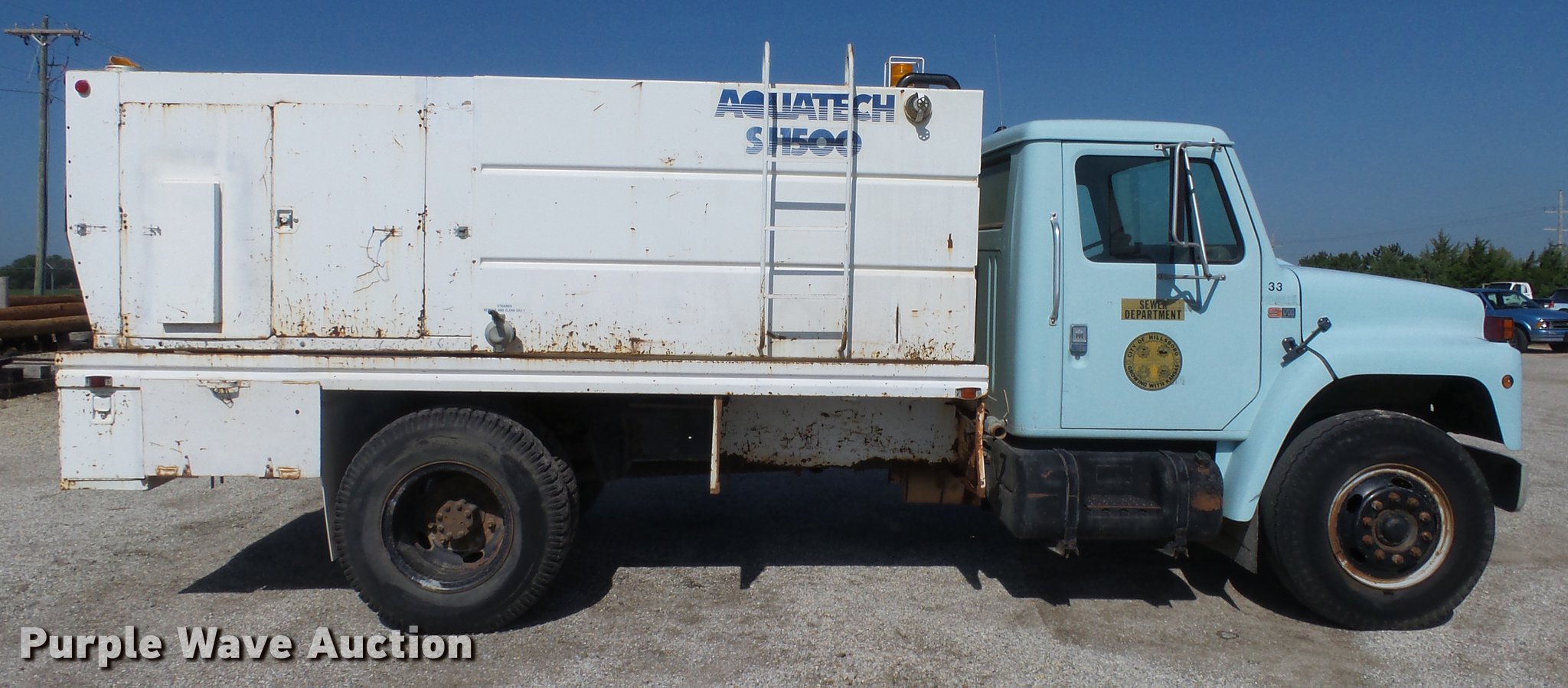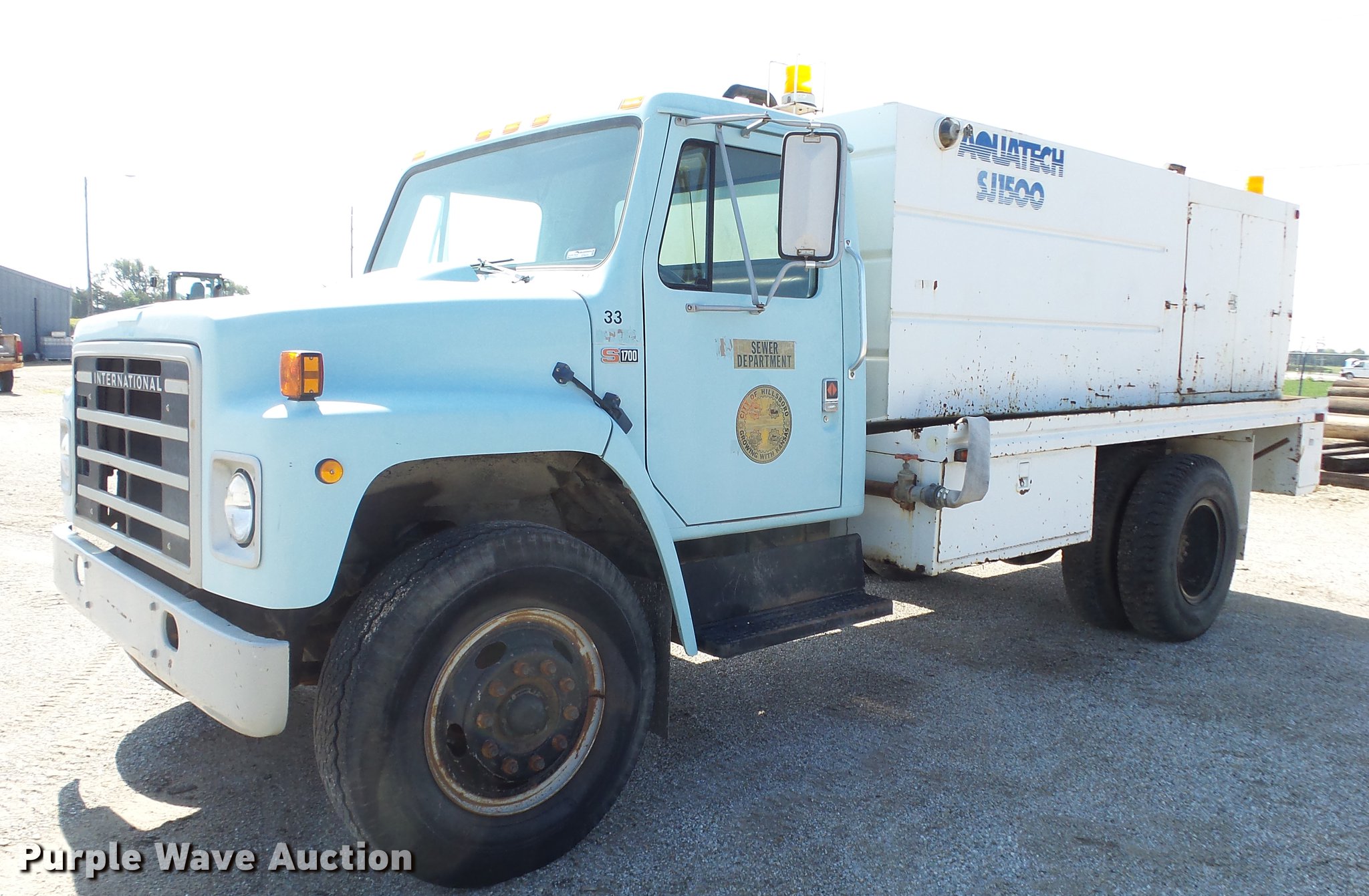 Purple Wave is selling a used Vacuum Truck in Kansas. This item is a 1984 International 1724 sewer jetter truck with the following: 28,325 miles on odometer, 4,989 hours on meter, 5.6L V8 gas engine, Manual transmission, Single axle, Heat, Manual windows and locks, Vinyl interior, Aquatech SJ1500MSKD jetter bed, 4,867 hours on meter, Approx. 14'L x 8'W, Ford gas engine, Approx. 600' of 1" hose, Serial 88201147, Spring suspension, Hydraulic brakes, 10.00-20 tires