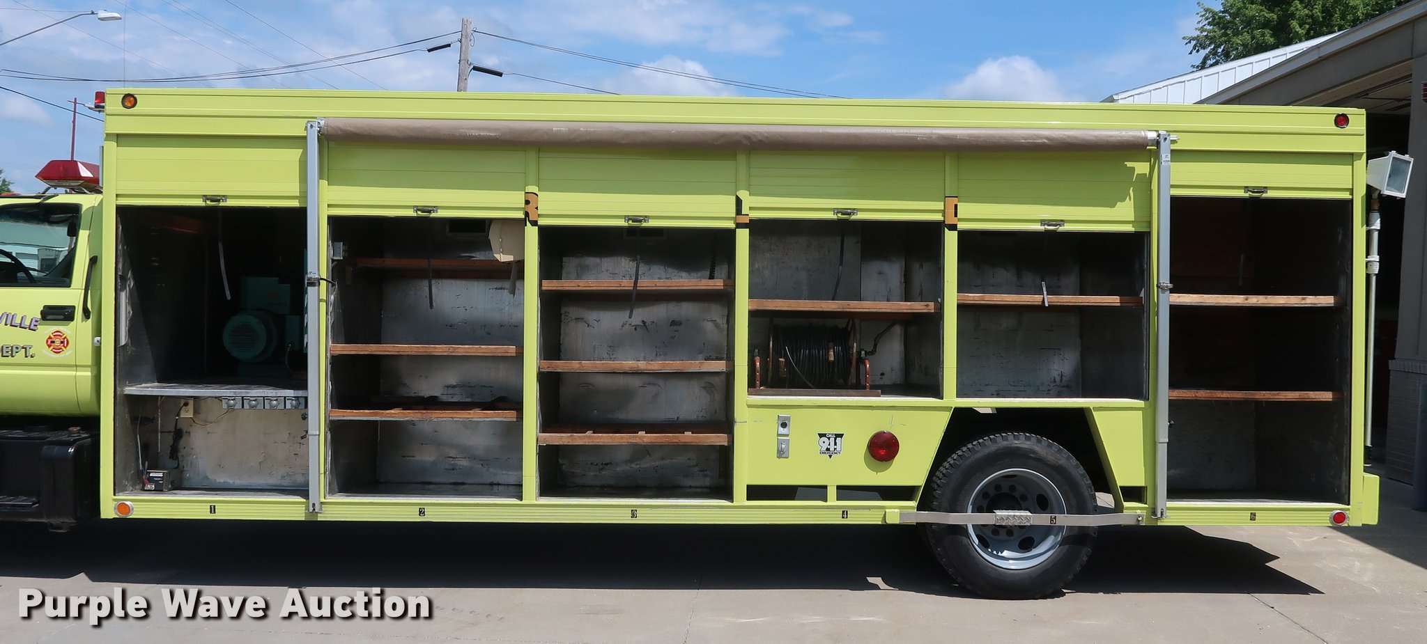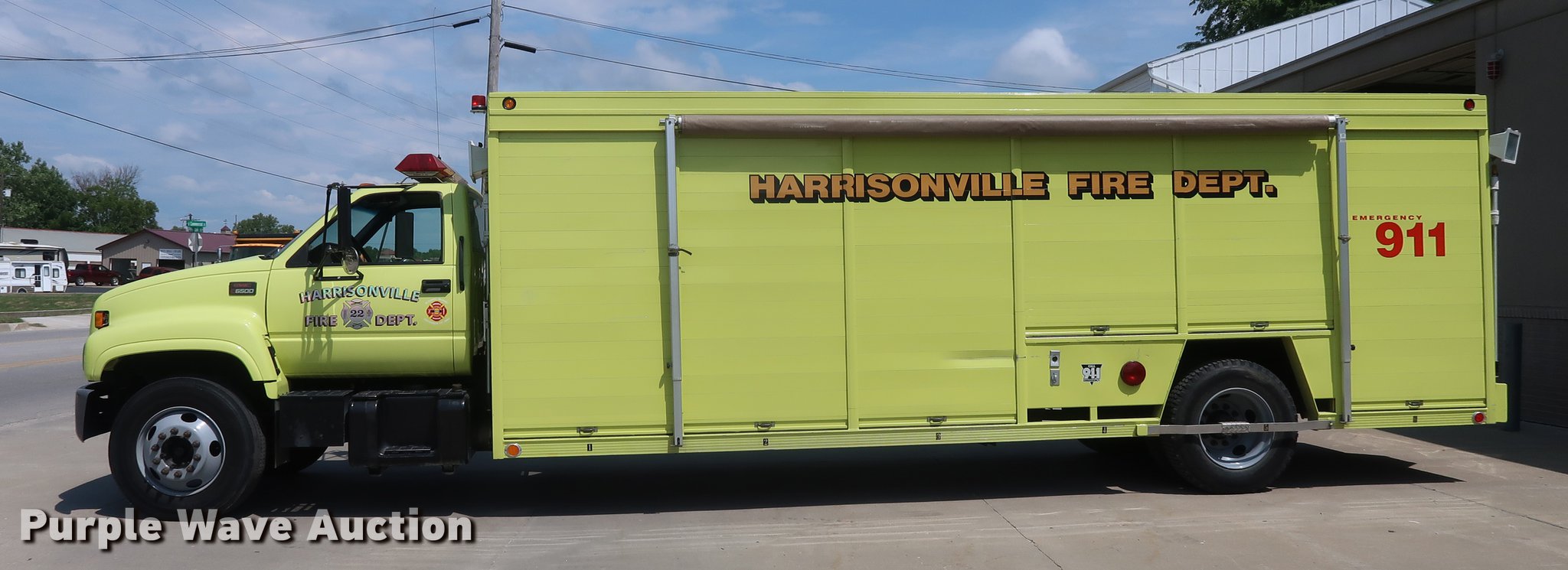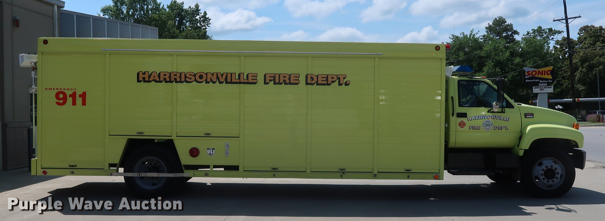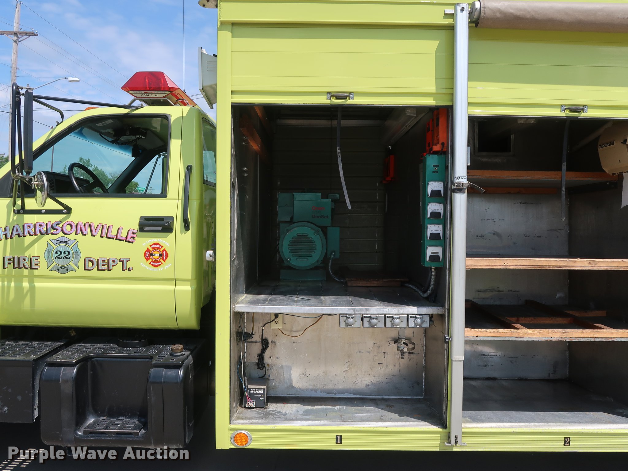 Purple Wave is selling a used Fire Truck or Emergency Vehicle in Missouri. This item is a 2000 GMC C6500 emergency response truck with the following: 7,618 miles on odometer, 1,222 hours on meter, Caterpillar 3126 7.2L L6 diesel engine, Serial 8YL08752, Automatic transmission, AC and heat, Vinyl interior, Side canopy, 24'L x 8'W service bed, Cadet Guard bottle filling station, Leaks, Onan 15.0 generator, Model 15JCL306342, 503 hours on meter, Four cylinder gas engine, 15 kW, 120/240V outputs, Serial F890248498,, Hydraulic brakes, Spring suspension, 10R22.5 tires