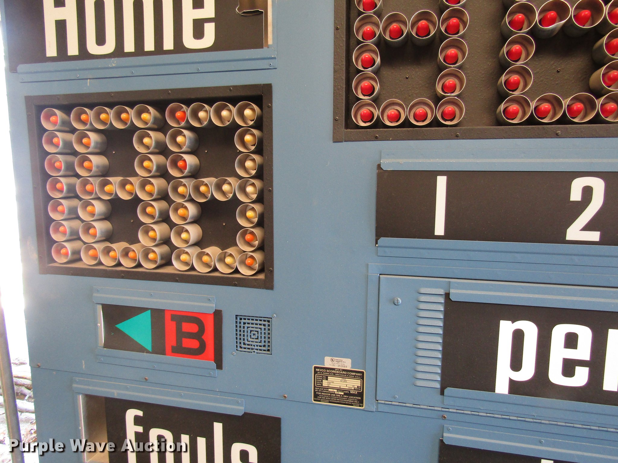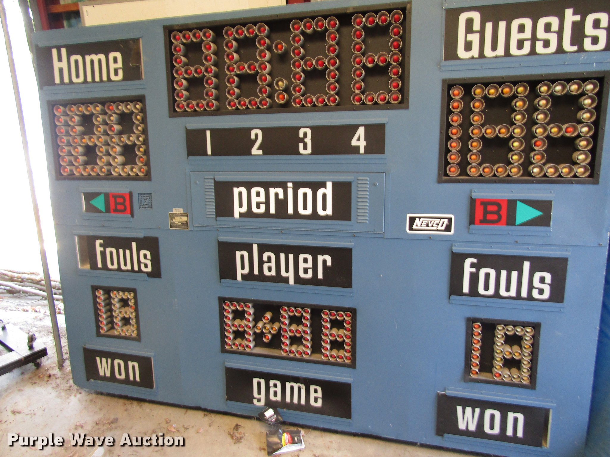 Purple Wave is selling a used Sporting Goods in Missouri. This item is a (2) Nevco 2450 scoreboards with the following: 2,400 watts, Controls, Serial 62, 605