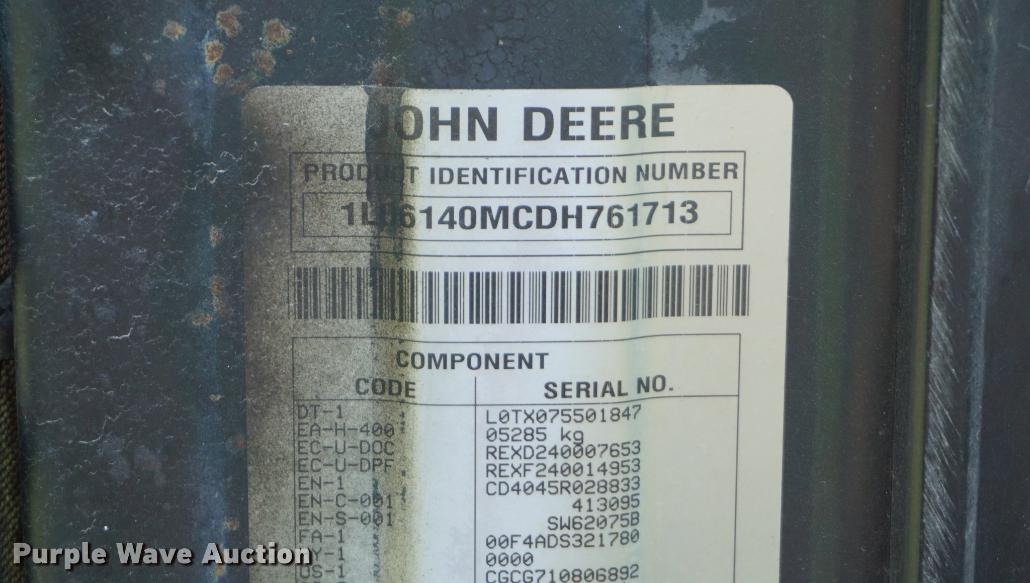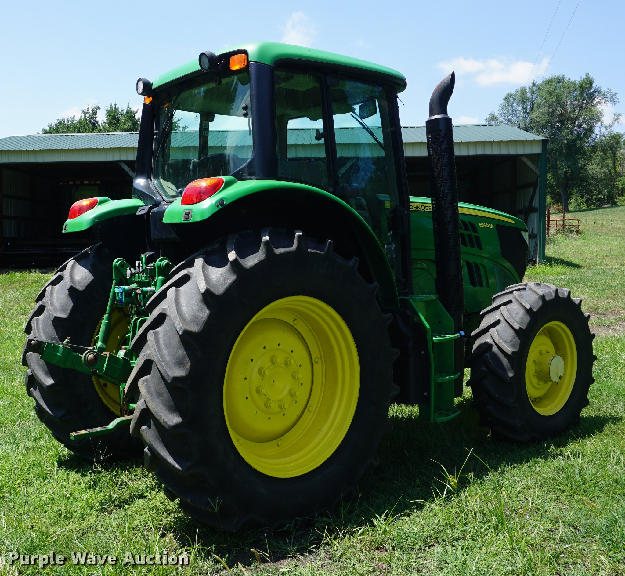 Purple Wave is selling a used Tractor in Kansas. This item is a 2013 John Deere 6140M MFWD tractor with the following: 4,258 hours on meter, John Deere 4.5L four cylinder turbo diesel engine, 140 HP, Power Quad transmission, 16F-16R gears, AC and heat, Tilt steering wheel, AM/FM, Suspension seat, Three point, Seven pin outlet, 540/1000 PTO, (3) rear hydraulic remote sets, 380/85R28 front tires, 460/85R38 rear tires, Extended power train warranty until 5,000 hours or 01 Oct 2018, Serial 1LB6140MCDH761713