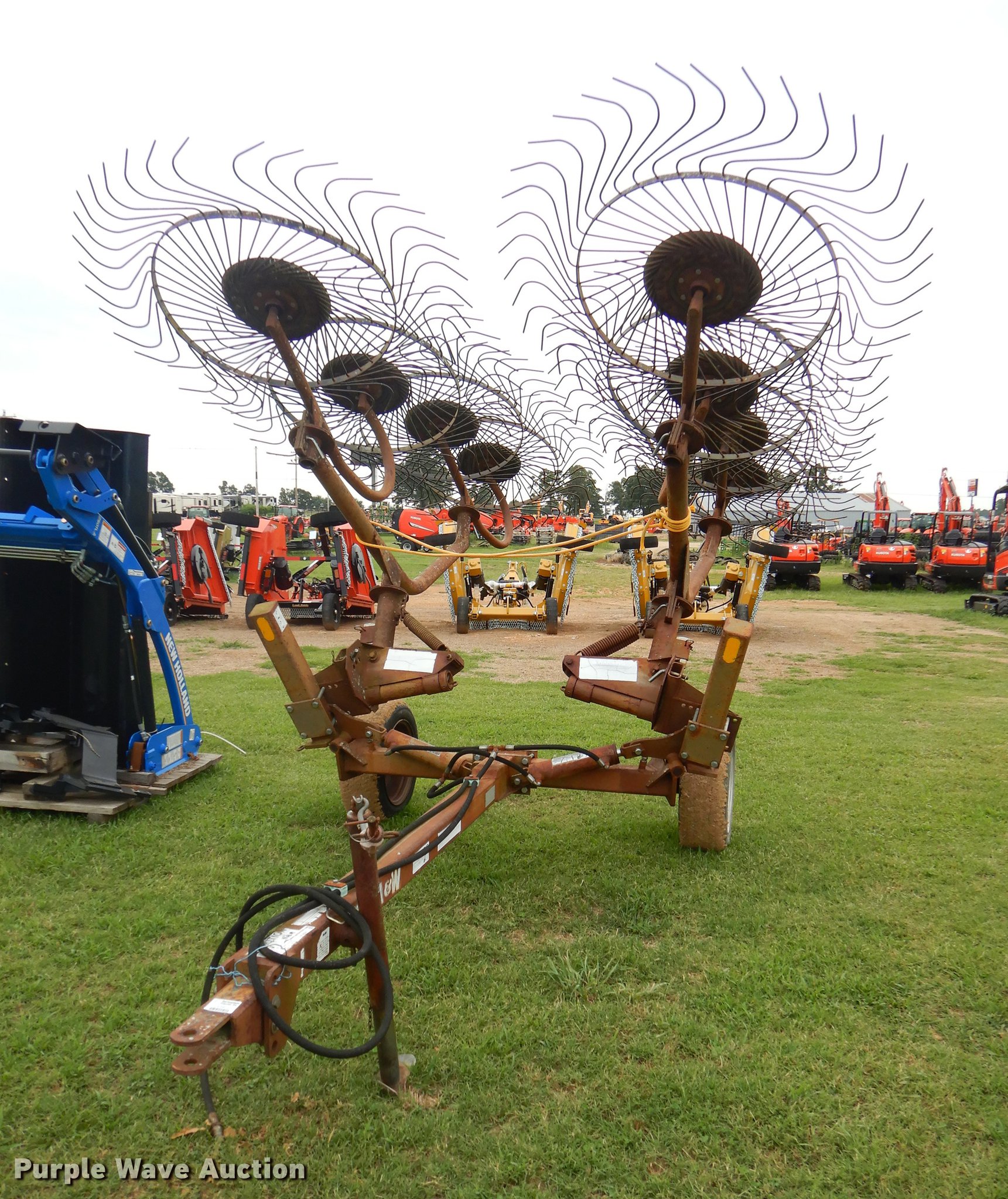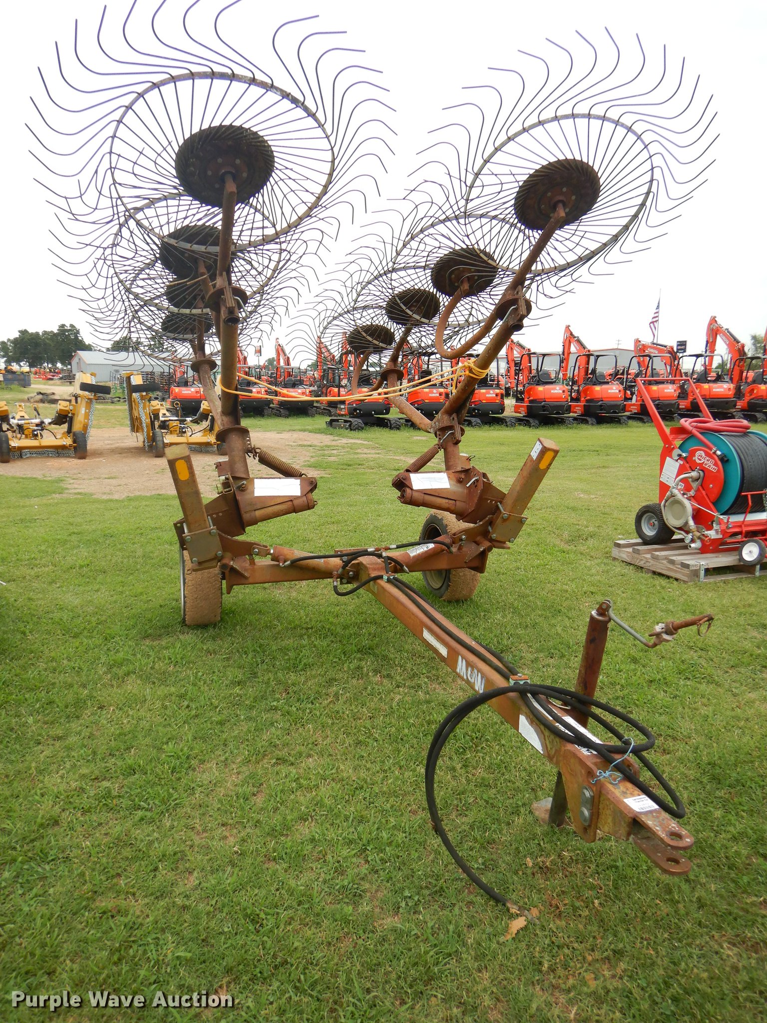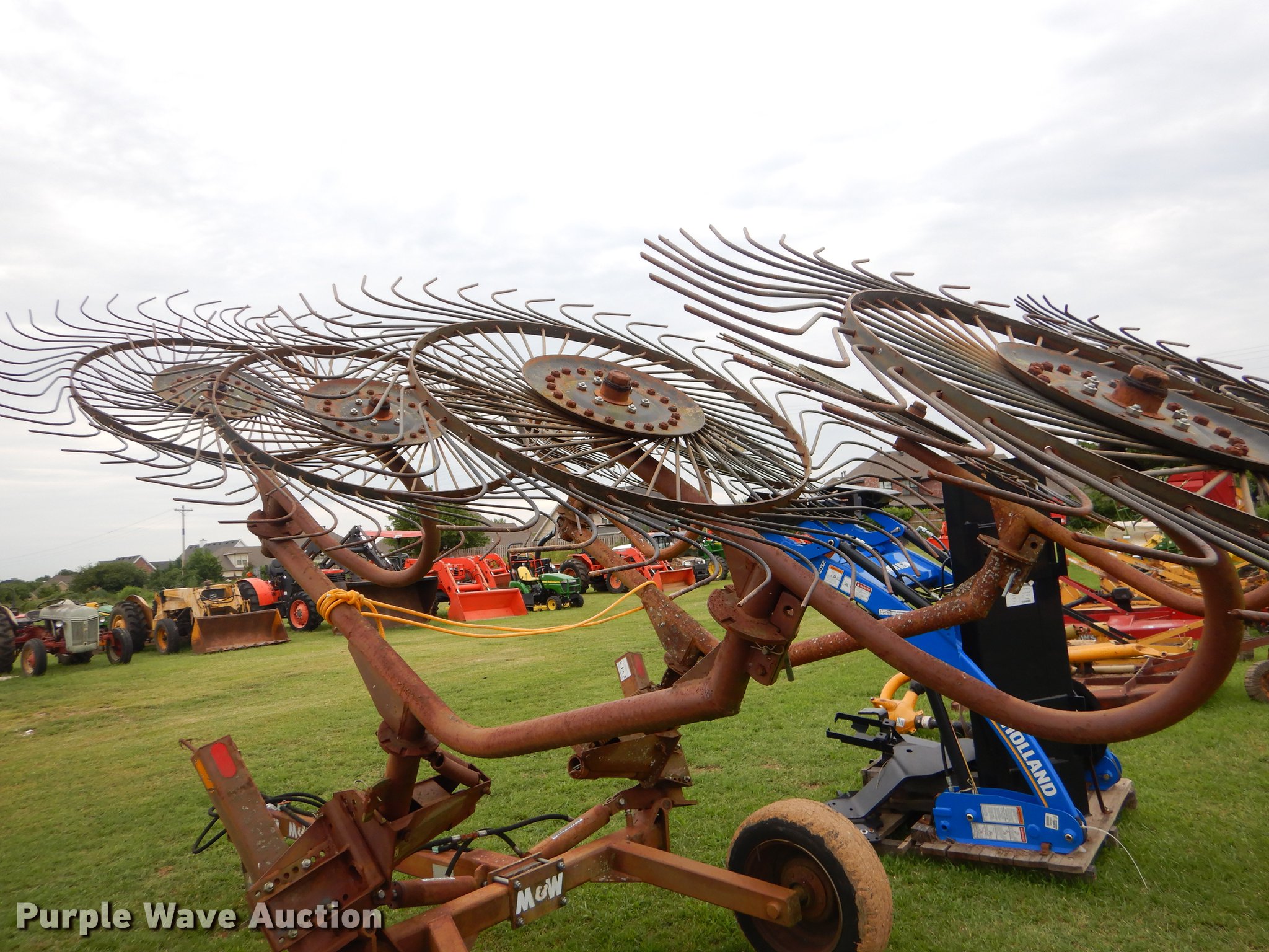 Purple Wave is selling a used Hay Rake in Arkansas. This item is a M&W hay rake with the following: Approx. 20'W, Hydraulic lift, Pin hitch, Jack stand, 185/65R15 tires, Unit# 033872