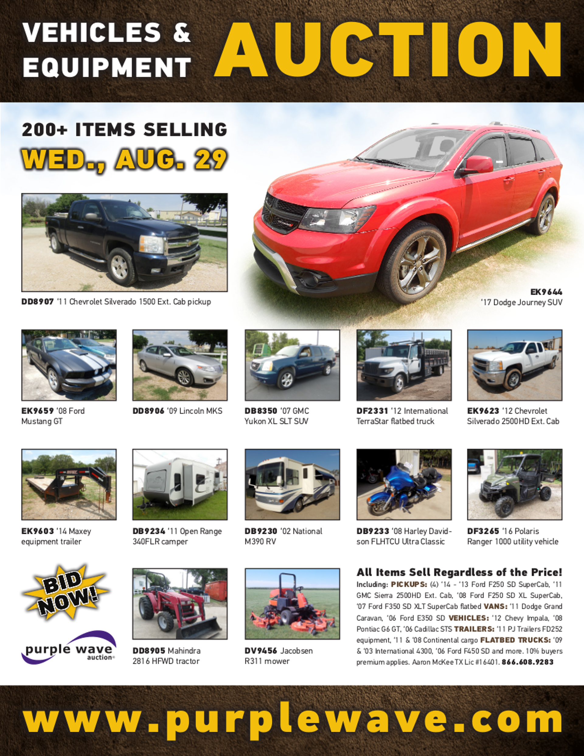 This auction is conducted by Purple Wave, Inc., whose home office is 825 Levee Drive, Manhattan, Kansas. Aaron McKee, Texas auctioneer license # 16401, operates Purple Wave, Inc. Complaints against us may be directed to the Texas Department of Licensing and Regulation, P.O. Box 12157, Austin, Texas 78711, (512) 463-6599. For additional required information, see the attached document.