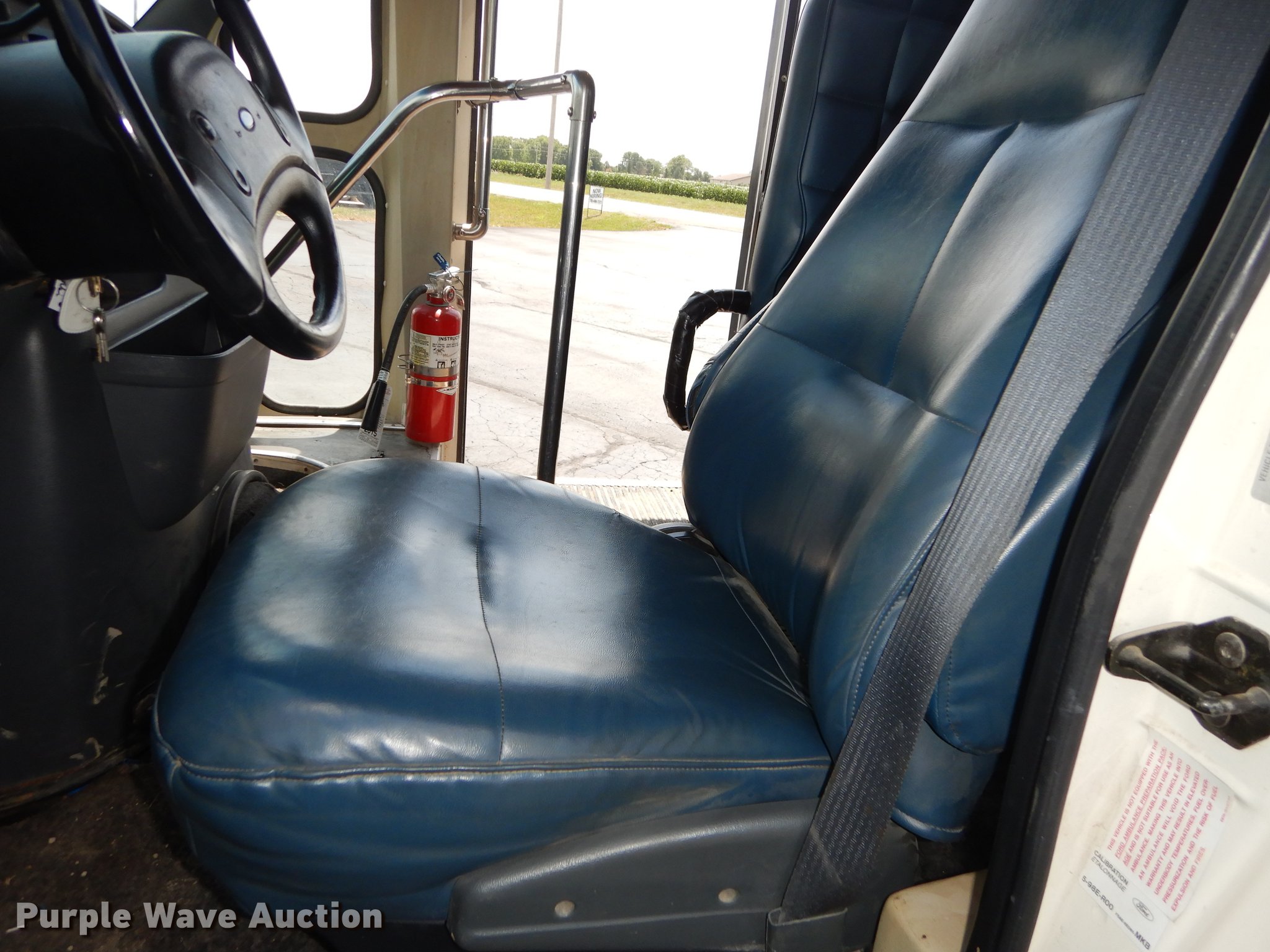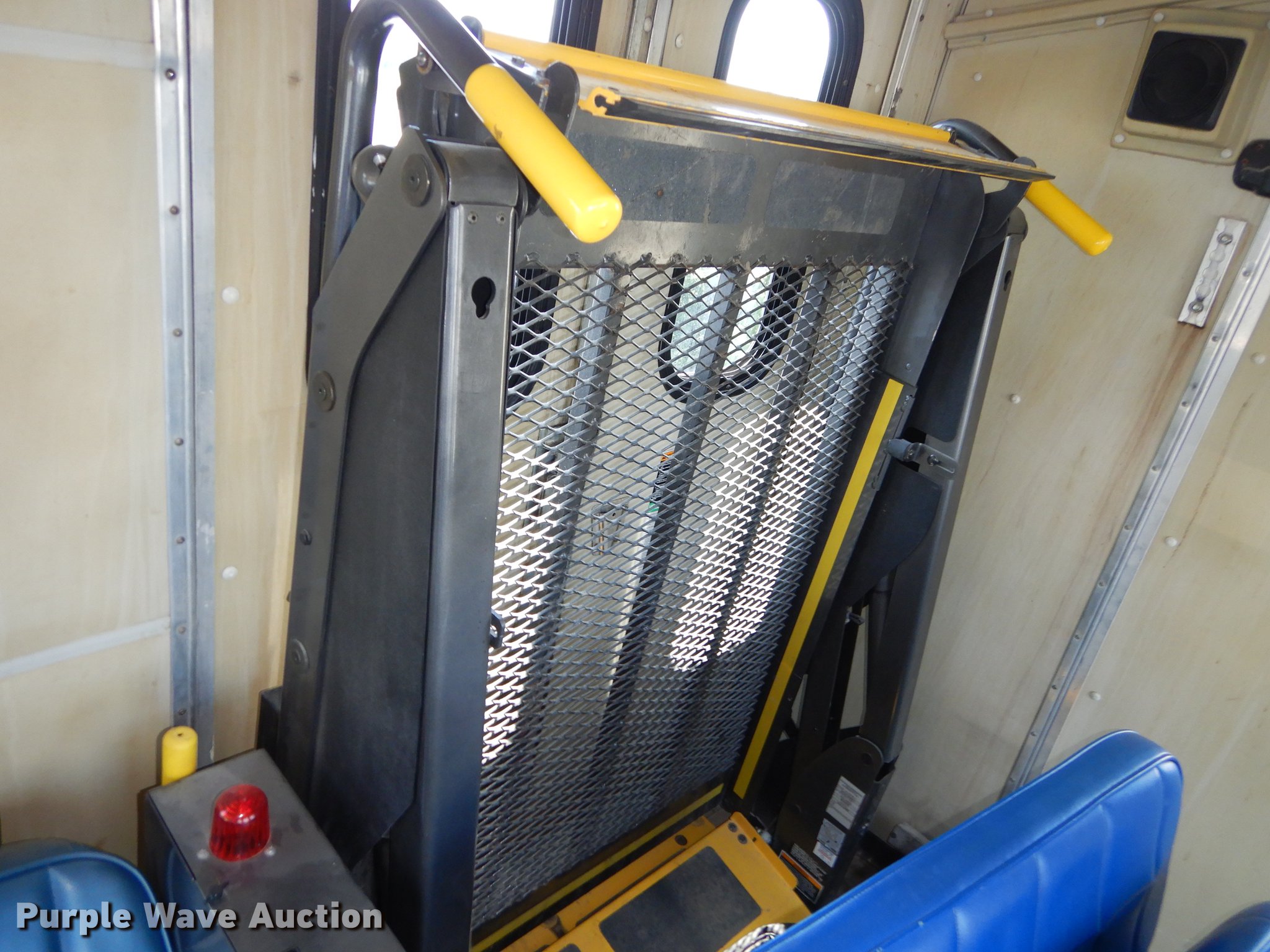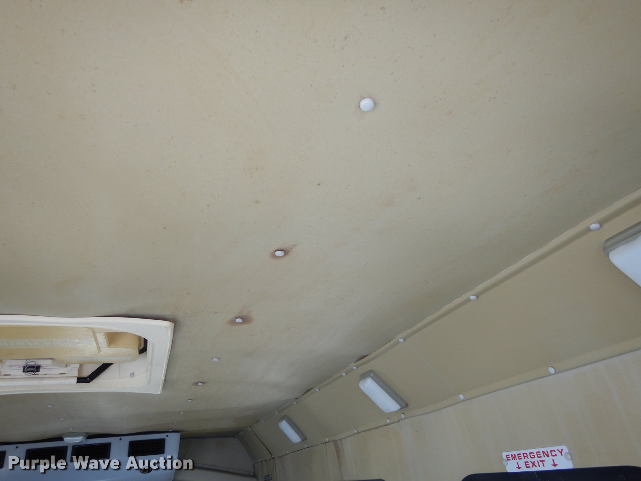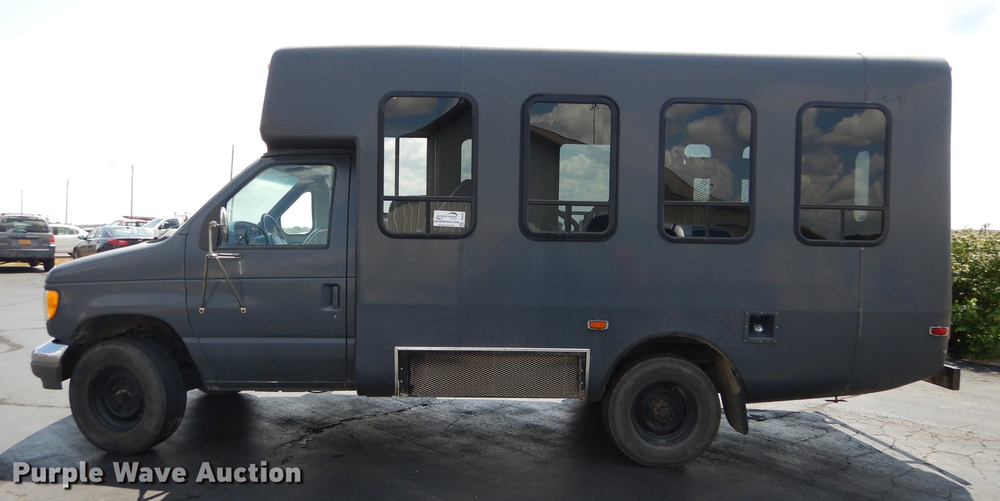 Purple Wave is selling a used Bus in Kansas. This item is a 1995 Ford Econoline E350 shuttle bus with the following: 114,825 miles on odometer, 7.5L V8 OHV 16V gas engine, Automatic transmission, Single axle, AC and heat, Non-operational AC, Tilt, Cruise, Vinyl interior, 10 passenger capacity, Seat belts, 2009 Braun NCL917FFBRP-2 wheelchair lift, 800 lbs capacity, Serial BB-00609, Ceiling, rear, and side emergency exits, Roof AC unit, Backup alarm, Spring suspension, Hydraulic brakes, 136" wheelbase, Goodyear 245/75R16 tires, GVWR 10,500 lbs, Weak battery, Transmission slow to engage, Stereo missing, Ceiling leaks, Seats unattached, but included, Some damaged, Steering and brake work needed, Tires worn