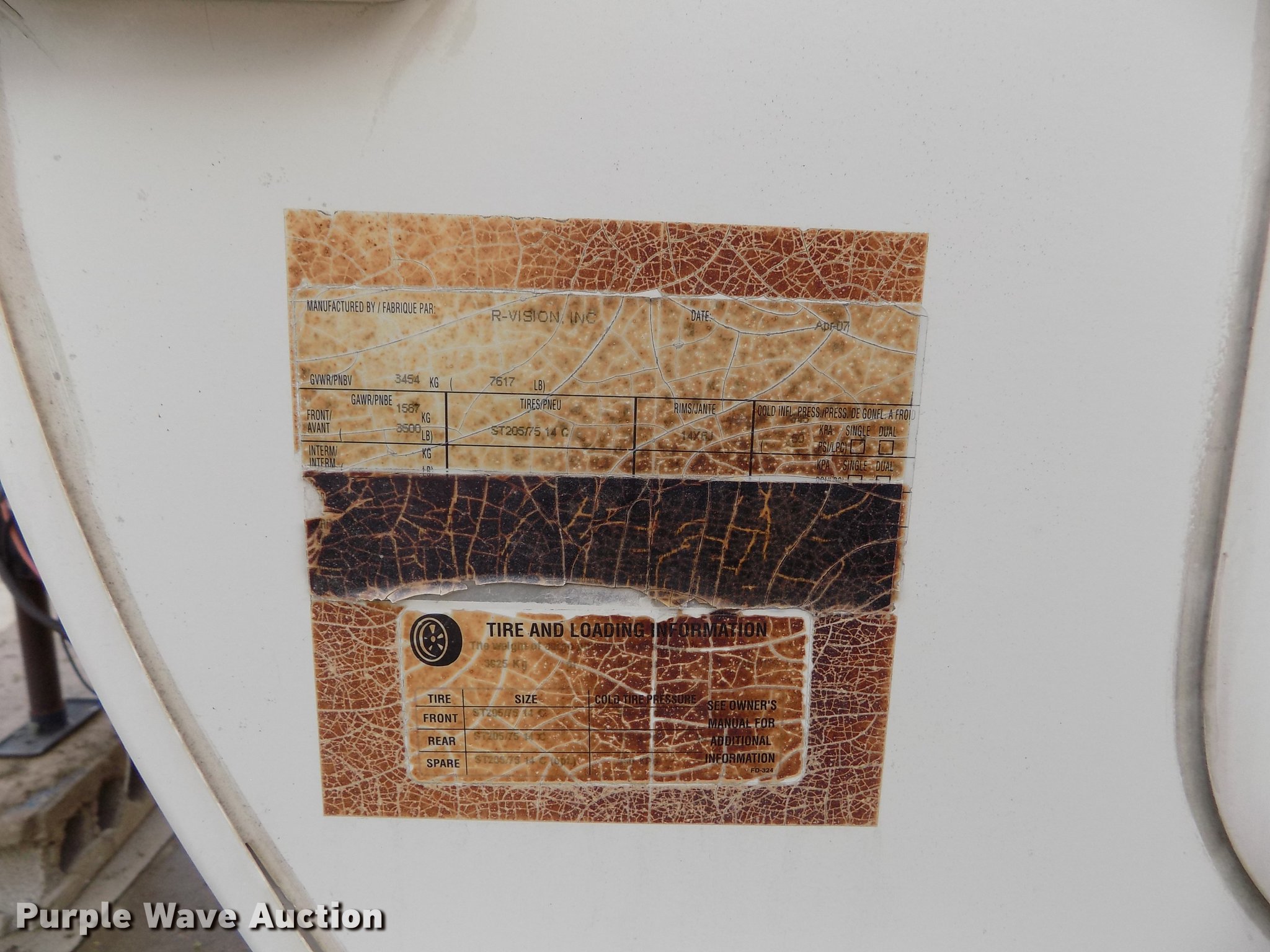 Purple Wave is selling a used RV in Kansas. This item is a 2008 R-Vision Trail Cruiser 30BHDS camper with the following: 30'L, Kitchen, Singk, Refrigerator/freezer, Microwave, Propane oven, Table, Bathroom, Queen bedroom, Rear bunk beds, Television, Sound system, (2) AC units, Central AC and heat, Single entry door, (2) electric slide-outs, Awning, Storage compartments, Ladder, (4) stabilizer jacks, 2 5/16" ball hitch, Jackstand, Spring suspension, Electric brakes, ST205/75R14 tires, GVWR 7,617 lbs, Cable issue on slide out, Awning ripped, Fender skirting broken