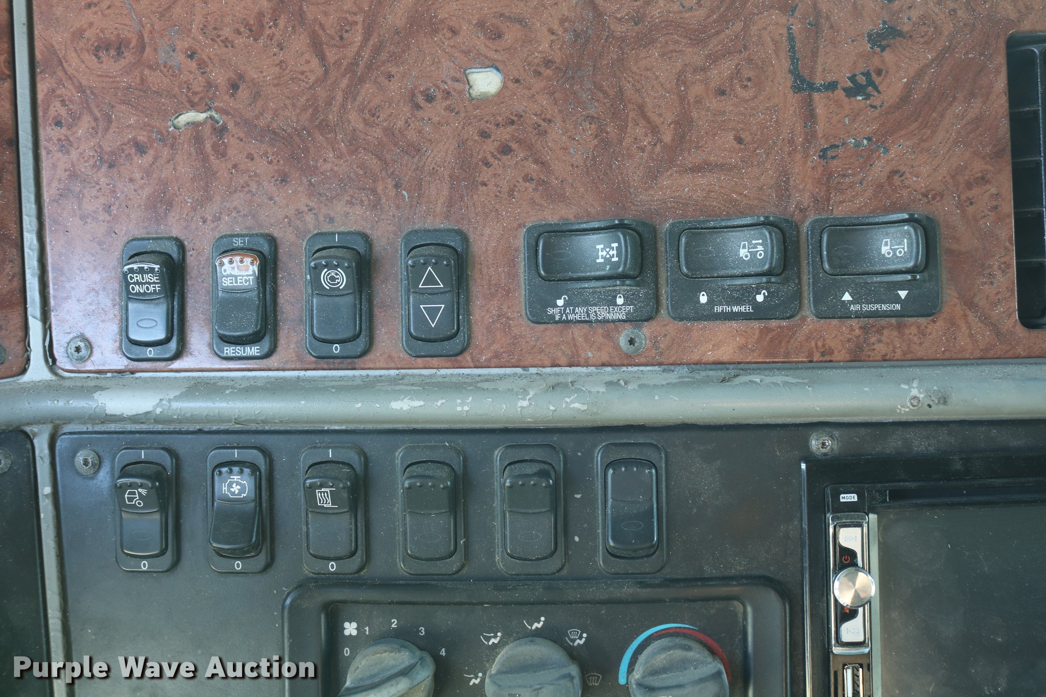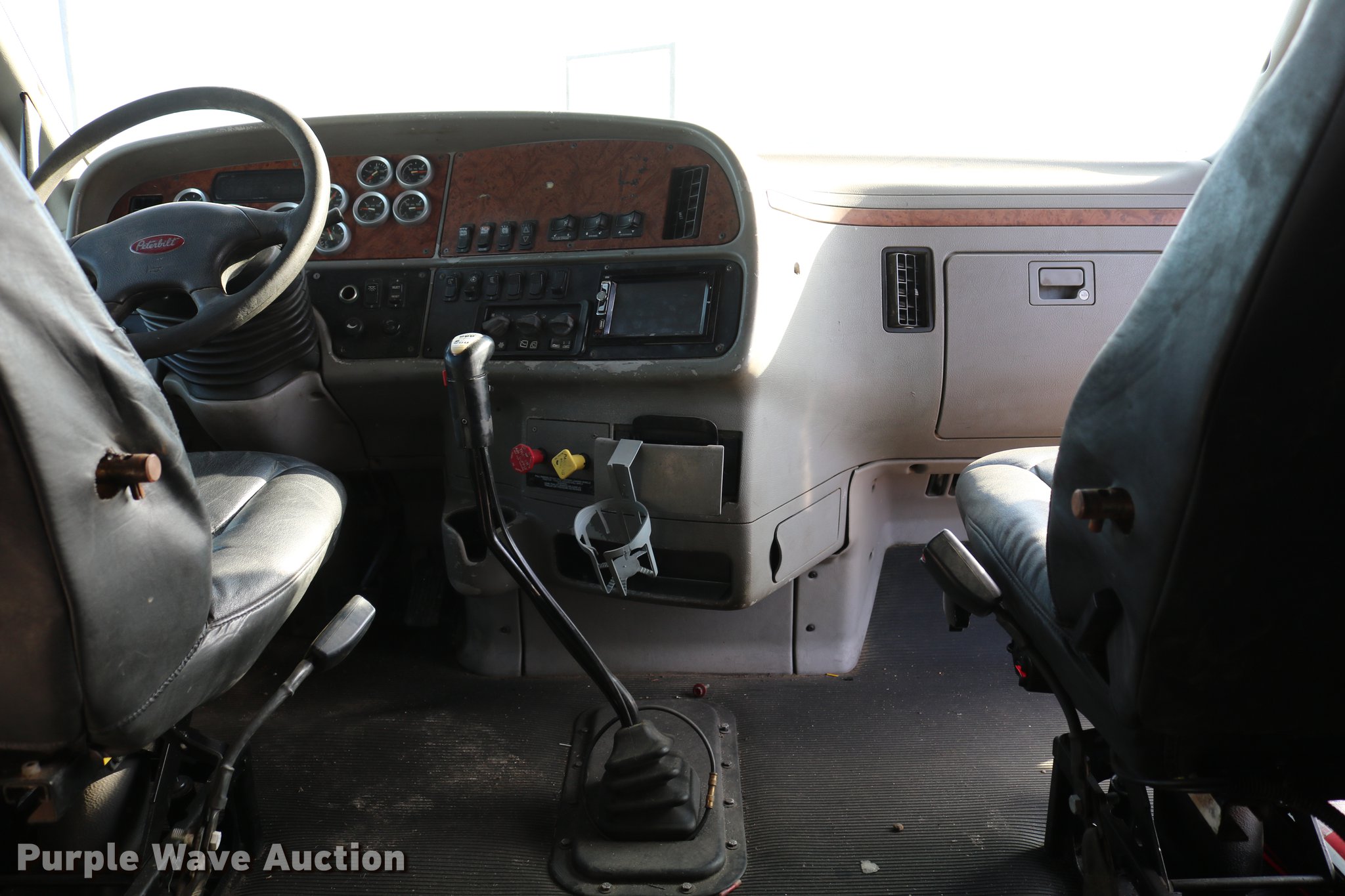Purple Wave is selling a used Truck Tractor in Kansas. This item is a 2006 Peterbilt 387 semi truck with the following: 1,176,972 miles on odometer, Caterpillar C15 14.6L L6 turbo diesel engine, 475 HP, Serial MSX60024, Eaton Fuller 13 speed manual transmission, Tandem axle, Inter-axle differential lock, AC and heat, Tilt, Cruise, AM/FM/CD, Power windows, Power and heated mirrors, Air suspension seat, Leather seat, Air ride cab, 26" sleeper, Double bunk beds, Storage cabinets, Refrigerator, Rear climate control, Thermo King 1RIPAC auxiliary power unit, Block heater, Dump valves, Exterior visor, Front tow hooks, Aluminum deck plate, Air operated sliding fifth wheel plate, Aluminum headache rack, Chain hanger, Dual fuel tanks, Quarter fenders, Air suspension, Air brakes, 233" wheelbase, 295/75R22.5 tires, GVWR 52,000 lbs, FAWR 12,000 lbs, IAWR 20,000 lbs, RAWR 20,000 lbs, ABS light on