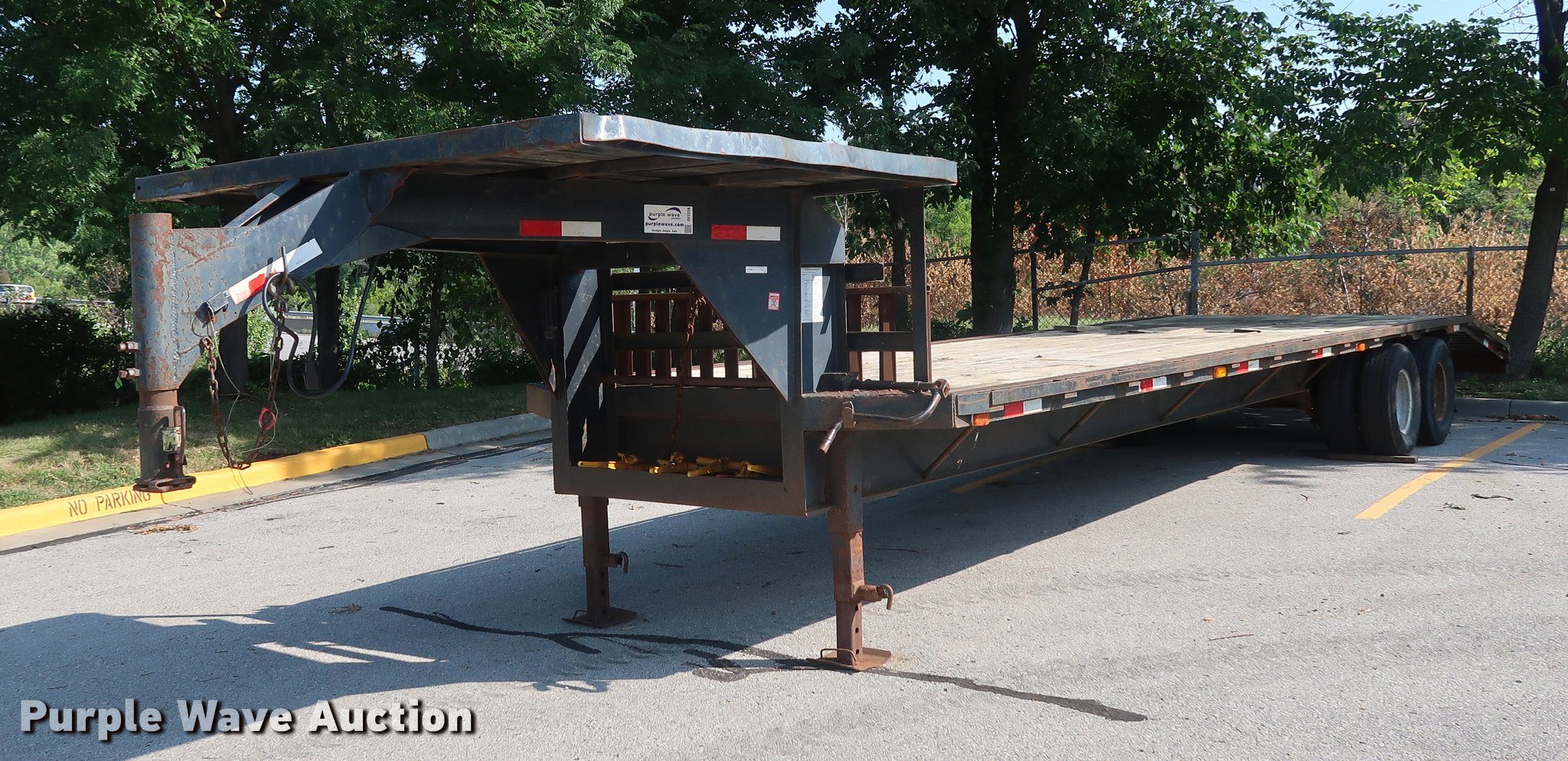 2005 equipment trailer. 25'L x 98"W deck, 77"L x 98"W upper deck, 5'L dovetail, 6'L x 16"W ramps, Gooseneck hitch, Jack stand, Spring suspension, Electric brakes, Tandem axle, 235/85R16 tires, Chains and boomers included, Right front inside tire issue, bubble on sidewall. Missouri title. DRMVB0000162484MO. 1308C NW Vivion Rd. Kansas City, MO 64118