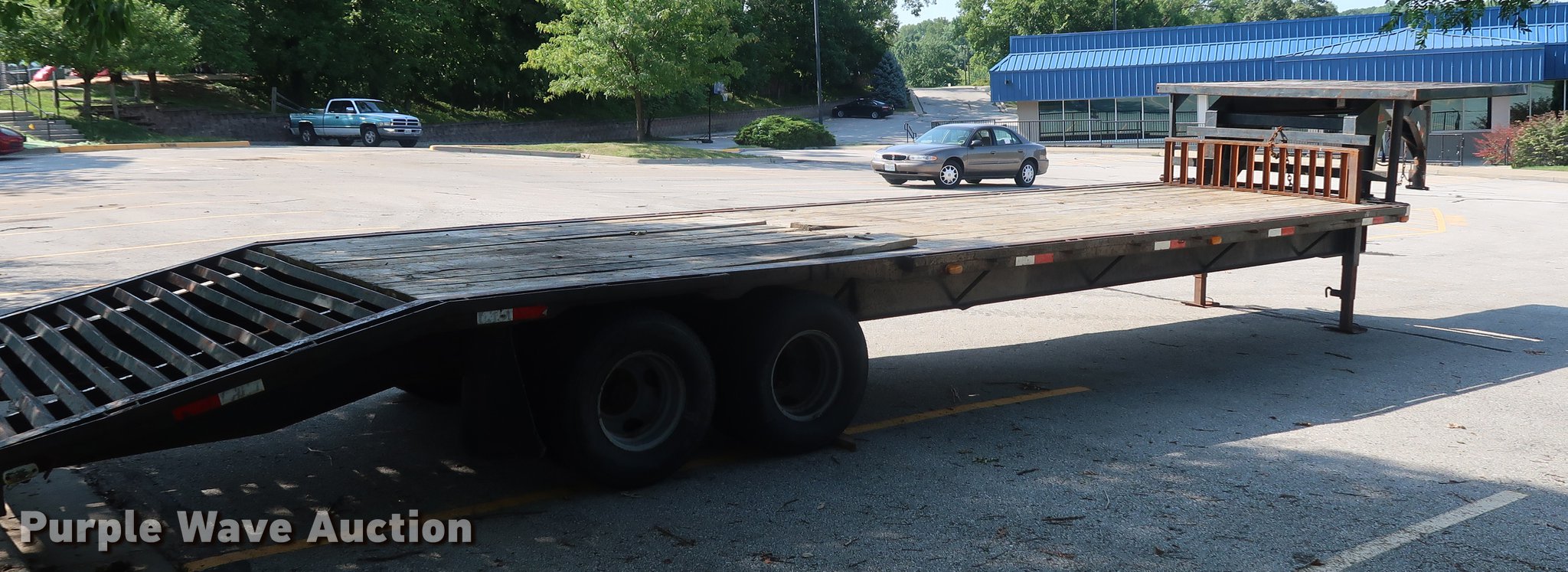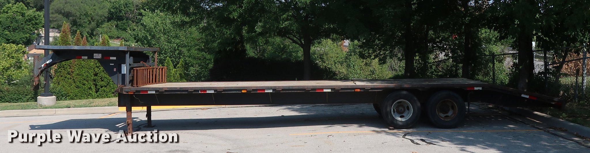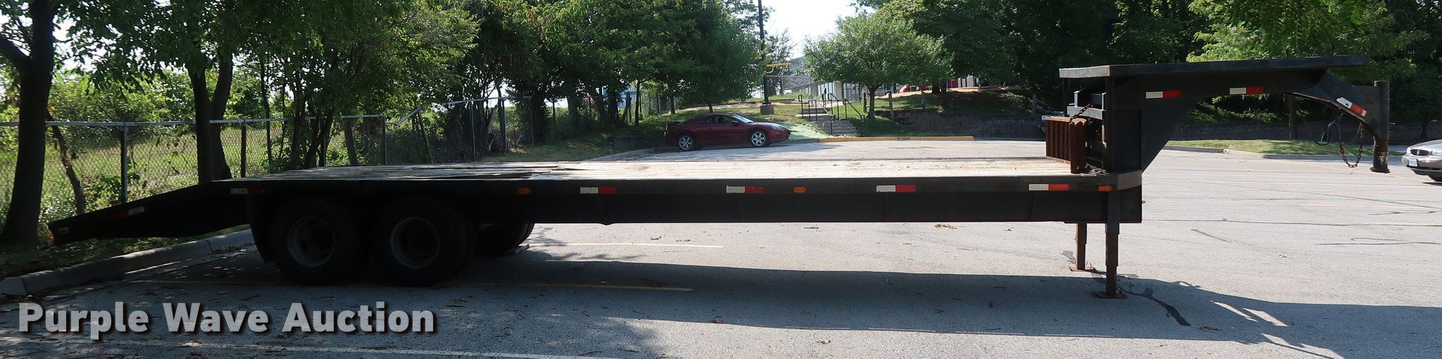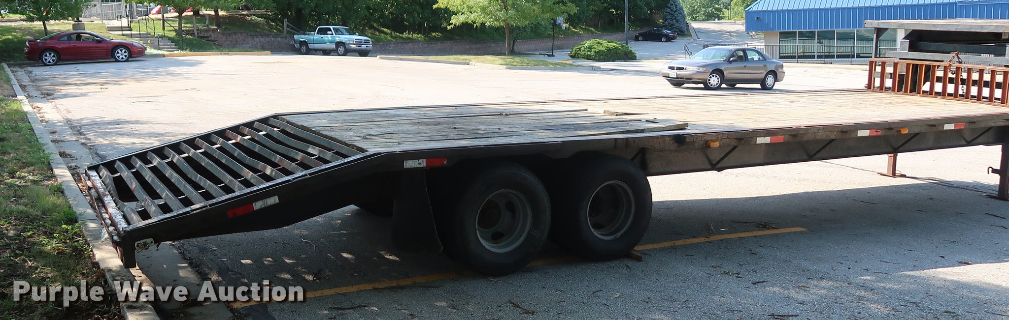Purple Wave is selling a used Equip. Trailer in Missouri. This item is a 2005 equipment trailer with the following: 25'L x 98"W deck, 77"L x 98"W upper deck, 5'L dovetail, 6'L x 16"W ramps, Gooseneck hitch, Jack stand, Spring suspension, Electric brakes, Tandem axle, 235/85R16 tires, Chains and boomers included, Right front inside tire issue, bubble on sidewall
