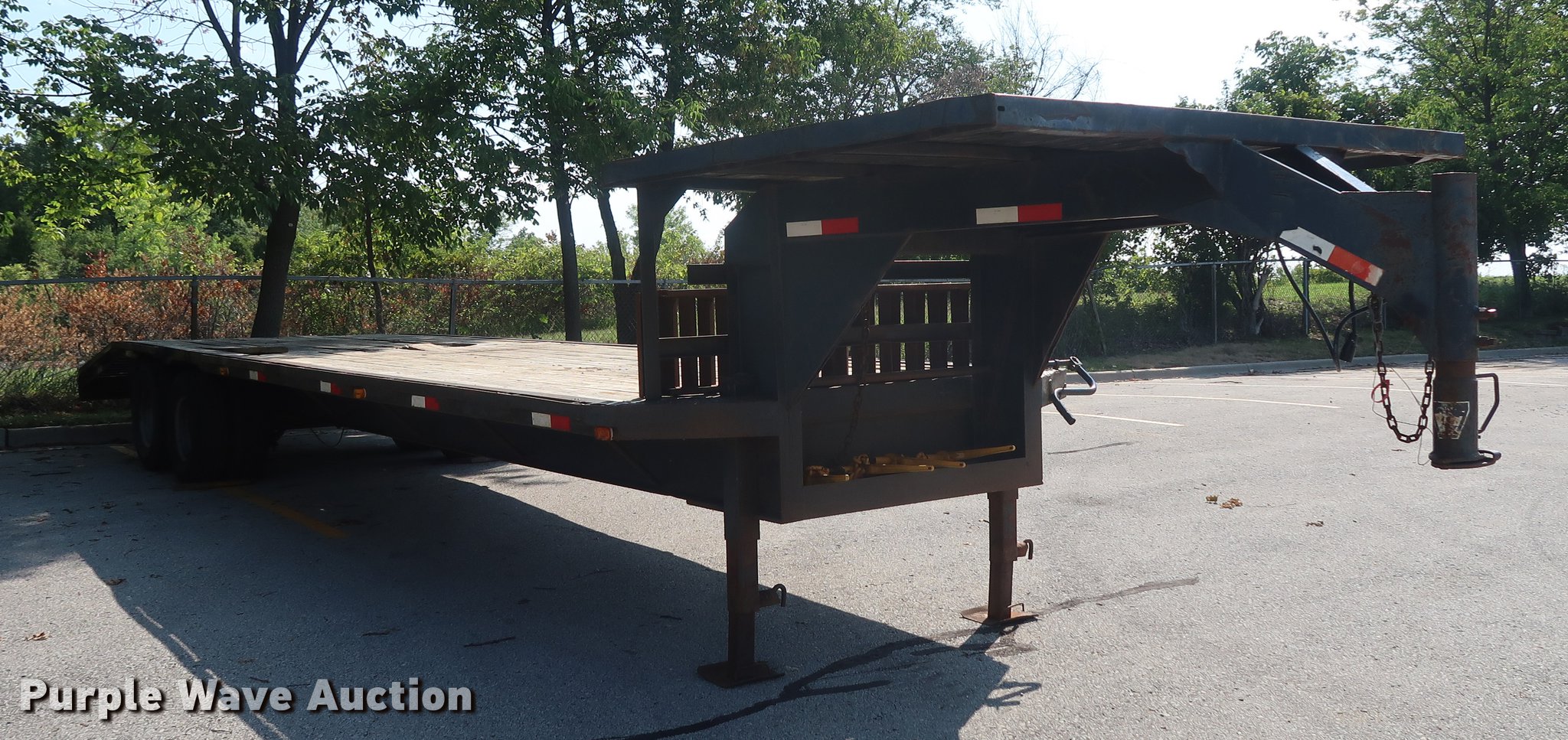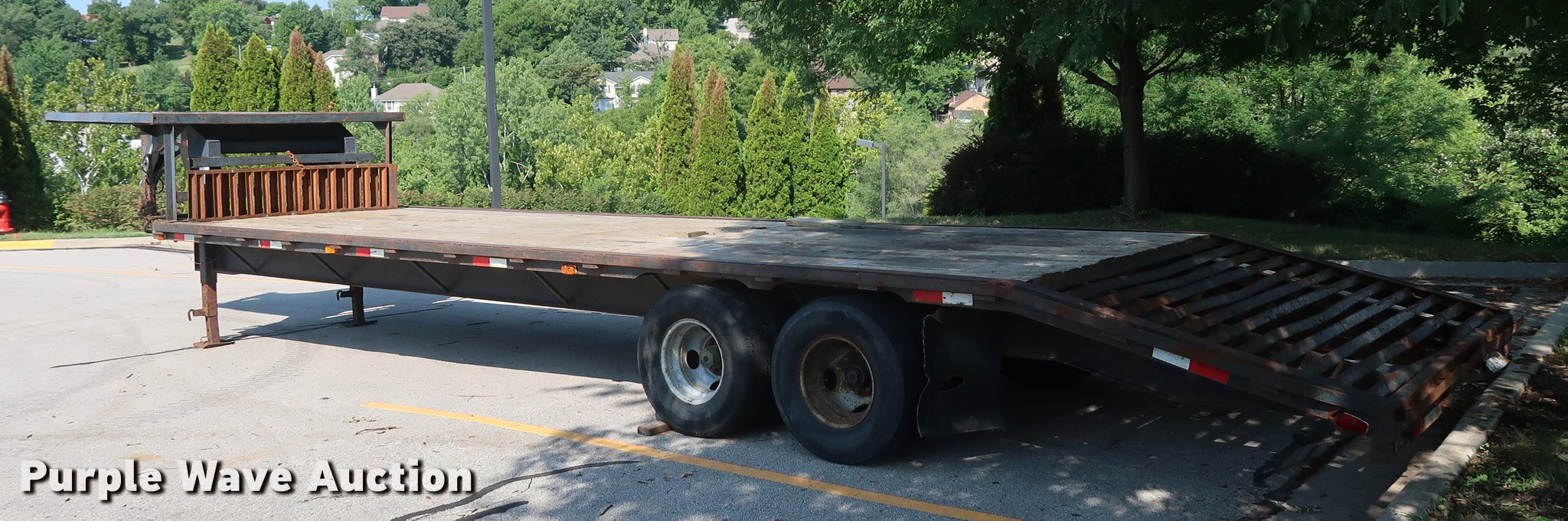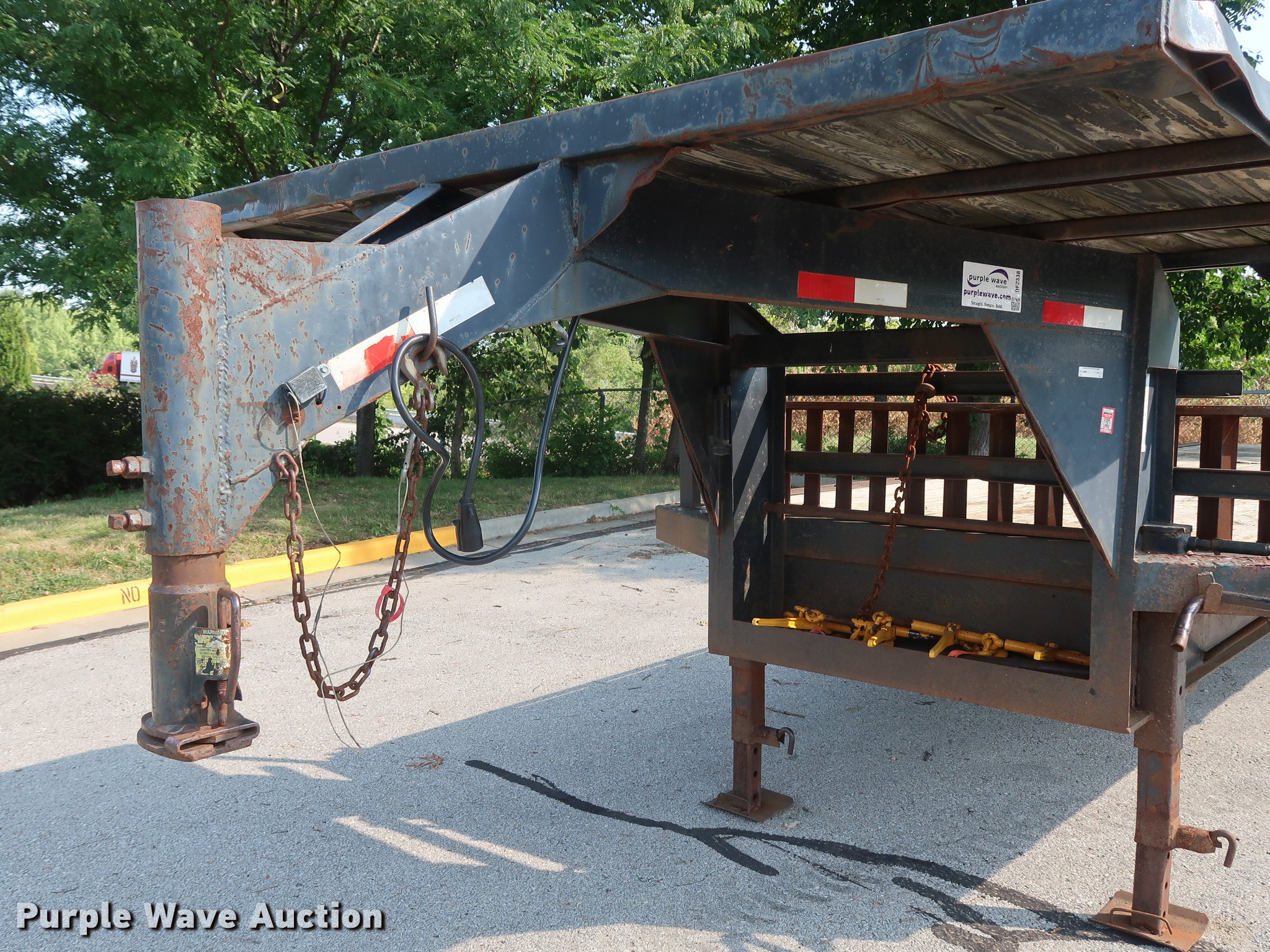 Purple Wave is selling a used Equip. Trailer in Missouri. This item is a 2005 equipment trailer with the following: 25'L x 98"W deck, 77"L x 98"W upper deck, 5'L dovetail, 6'L x 16"W ramps, Gooseneck hitch, Jack stand, Spring suspension, Electric brakes, Tandem axle, 235/85R16 tires, Chains and boomers included, Right front inside tire issue, bubble on sidewall