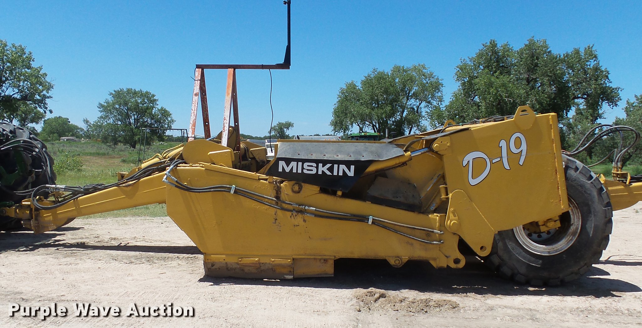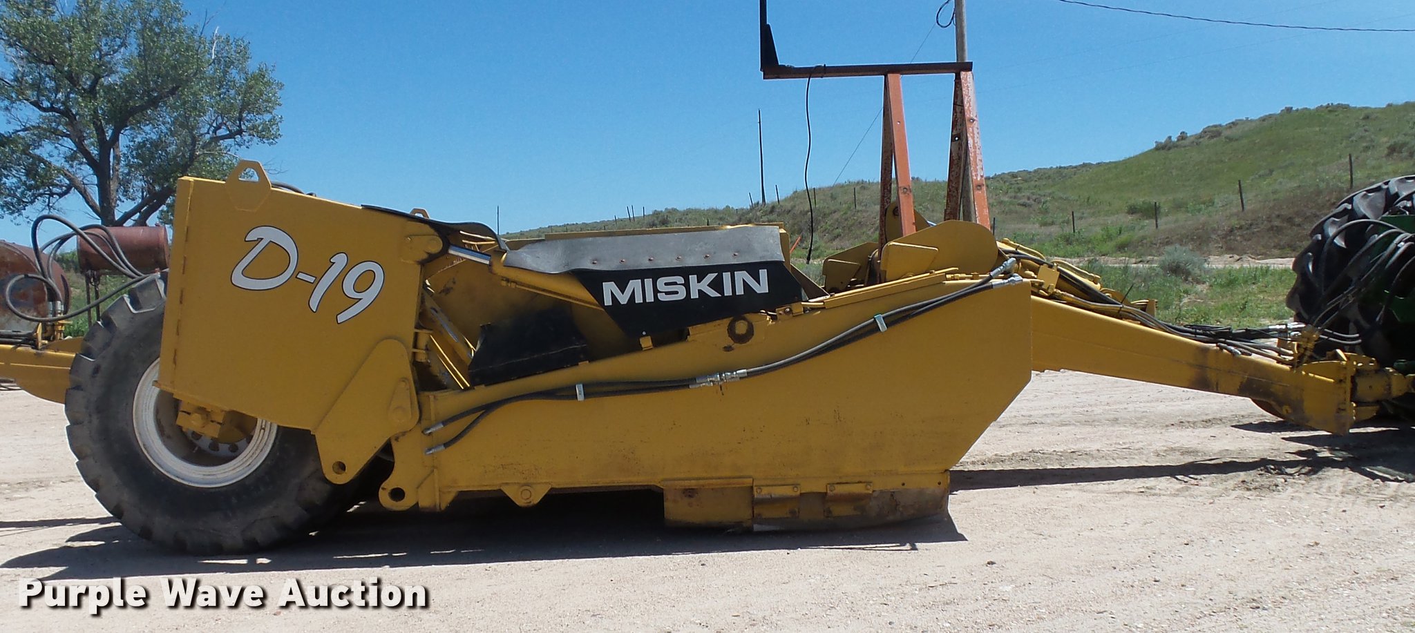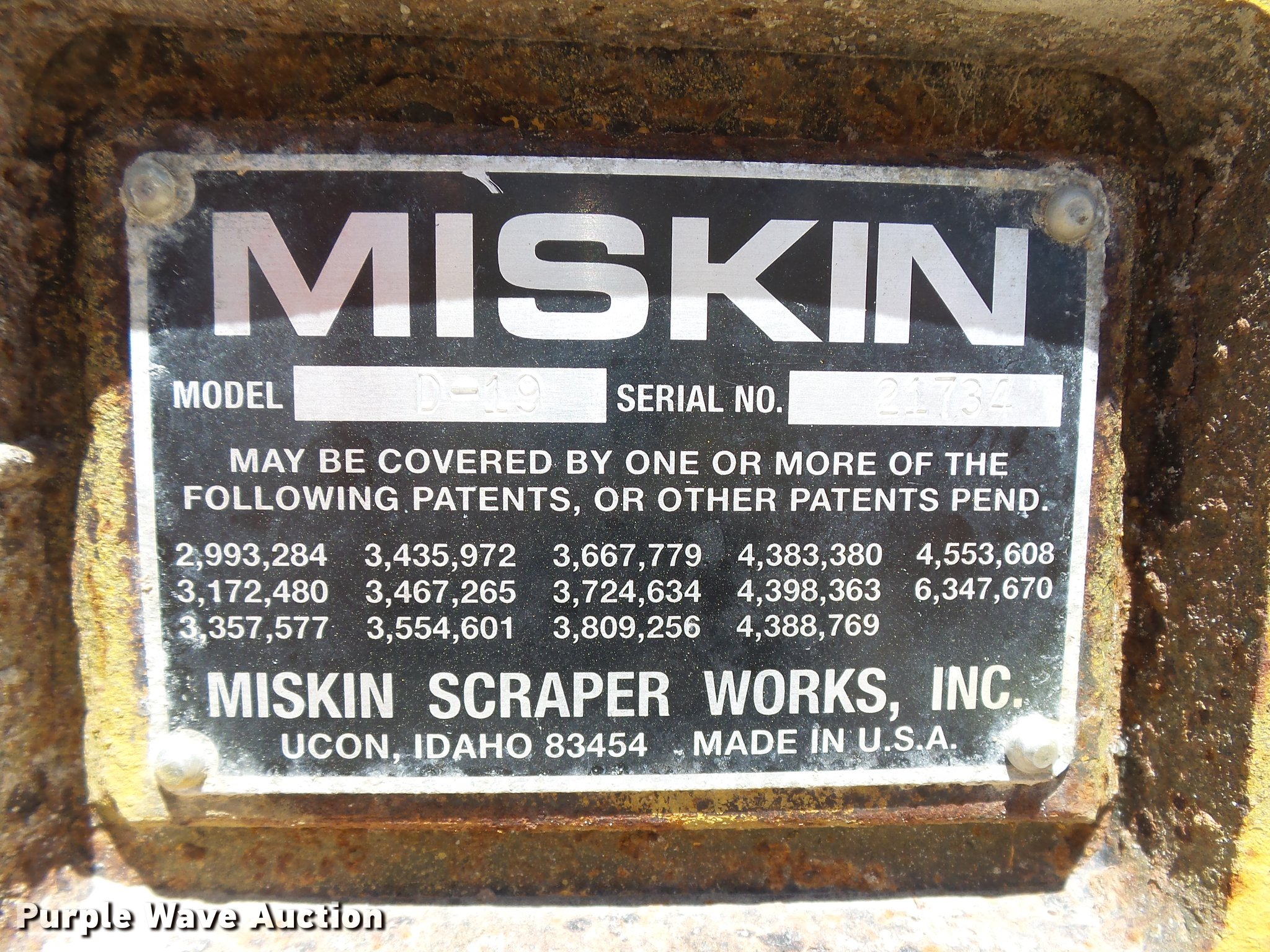 Purple Wave is selling a used Pull Type Scraper in Nebraska. This item is a 2005 Miskin D19 scraper with the following: 19 cu. yd. capacity, Reversible cutting edge, Push/pull ball and hook, Rear push block, Hydraulic lift, Four-way hydraulics, Pin hitch, 23.5-25 tires, Serial 21735