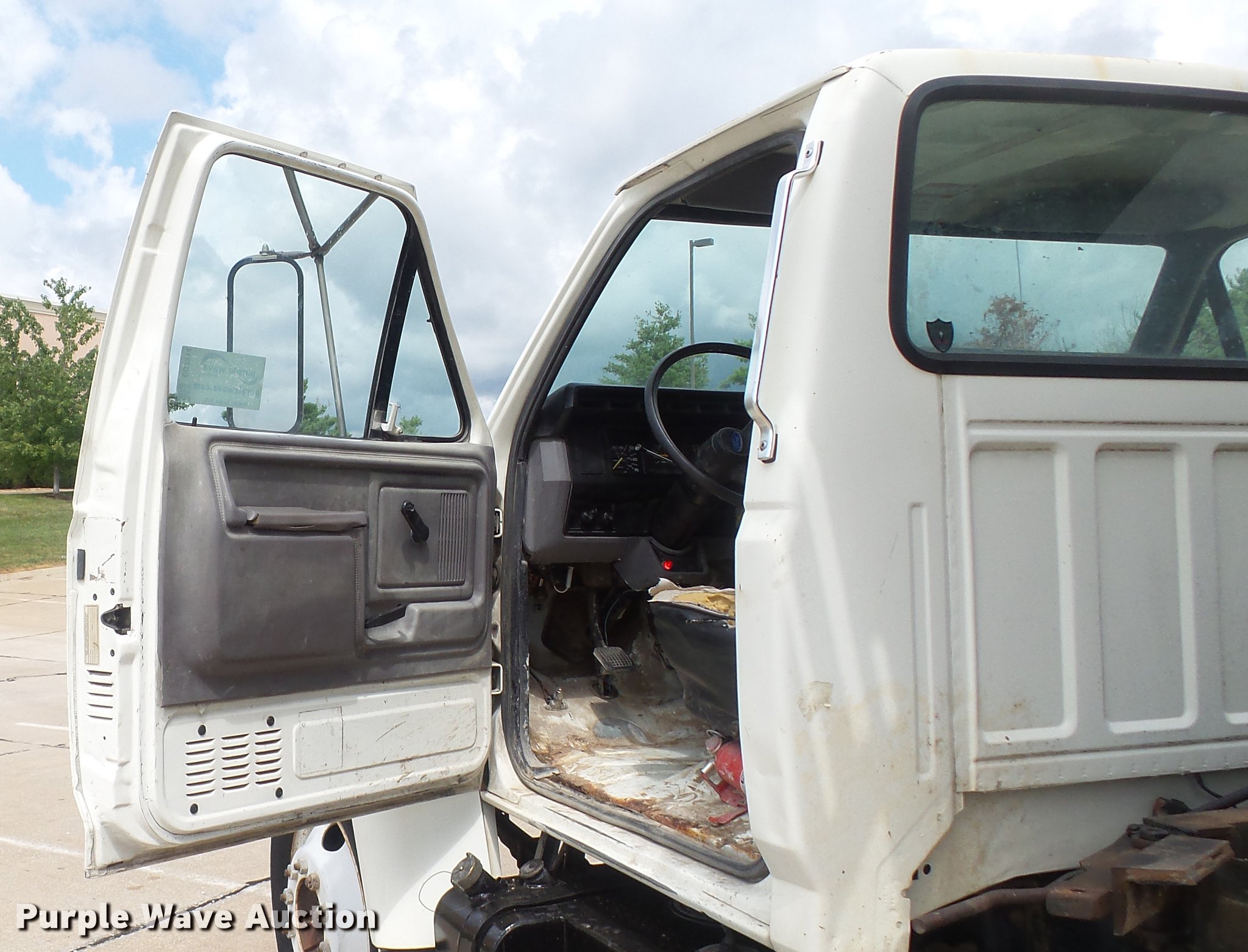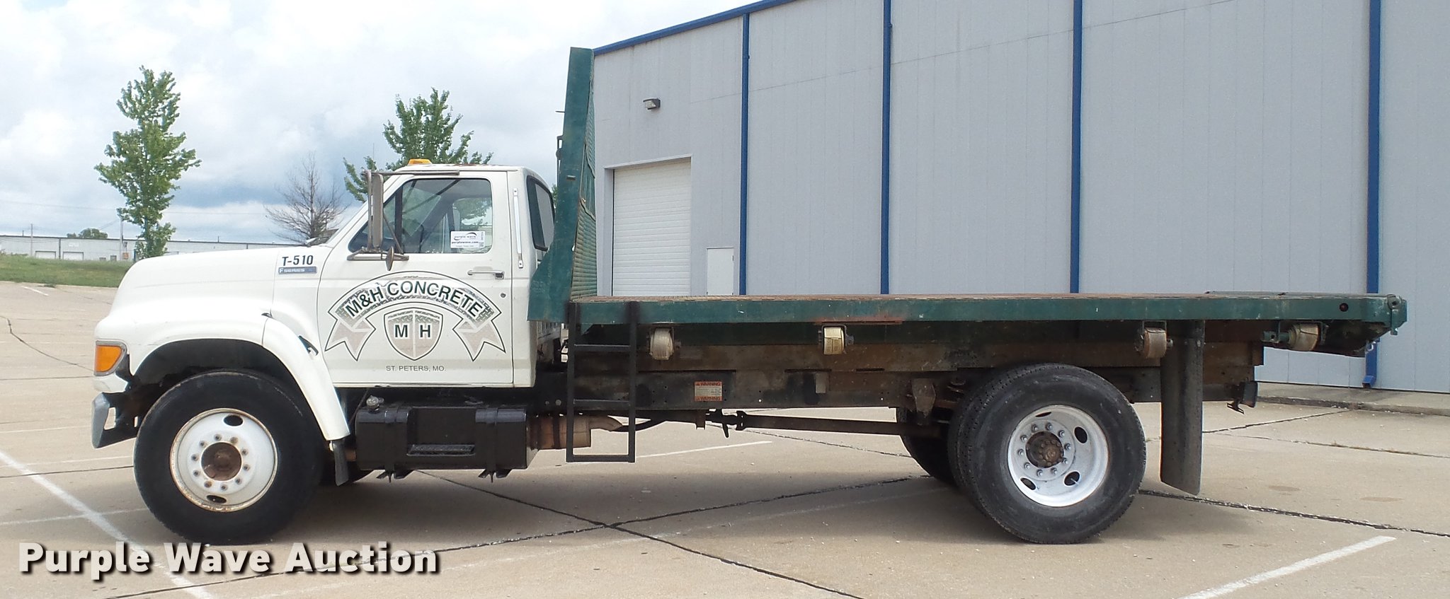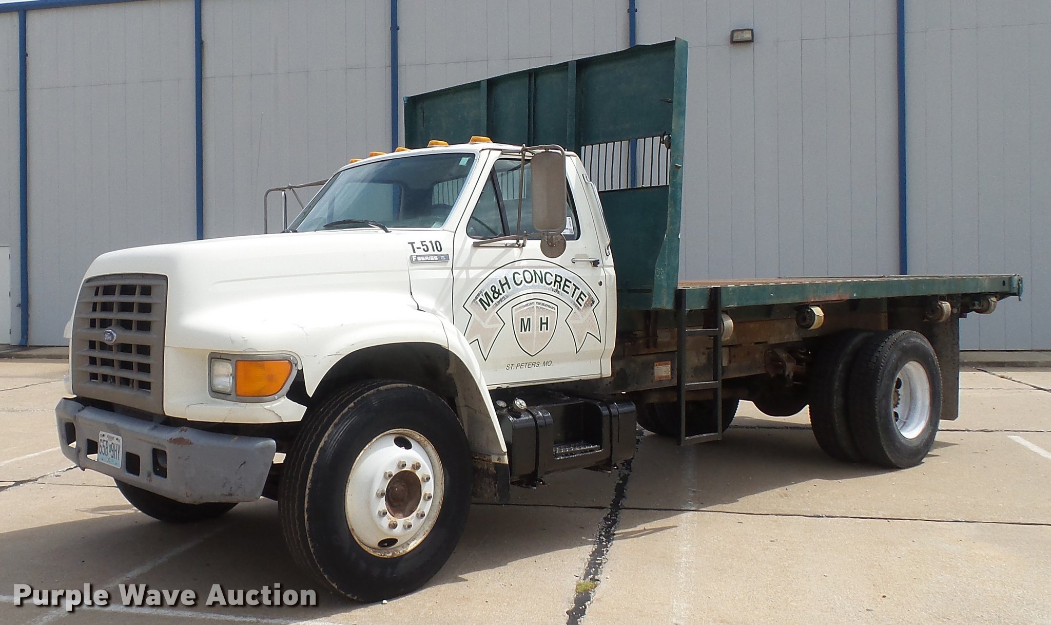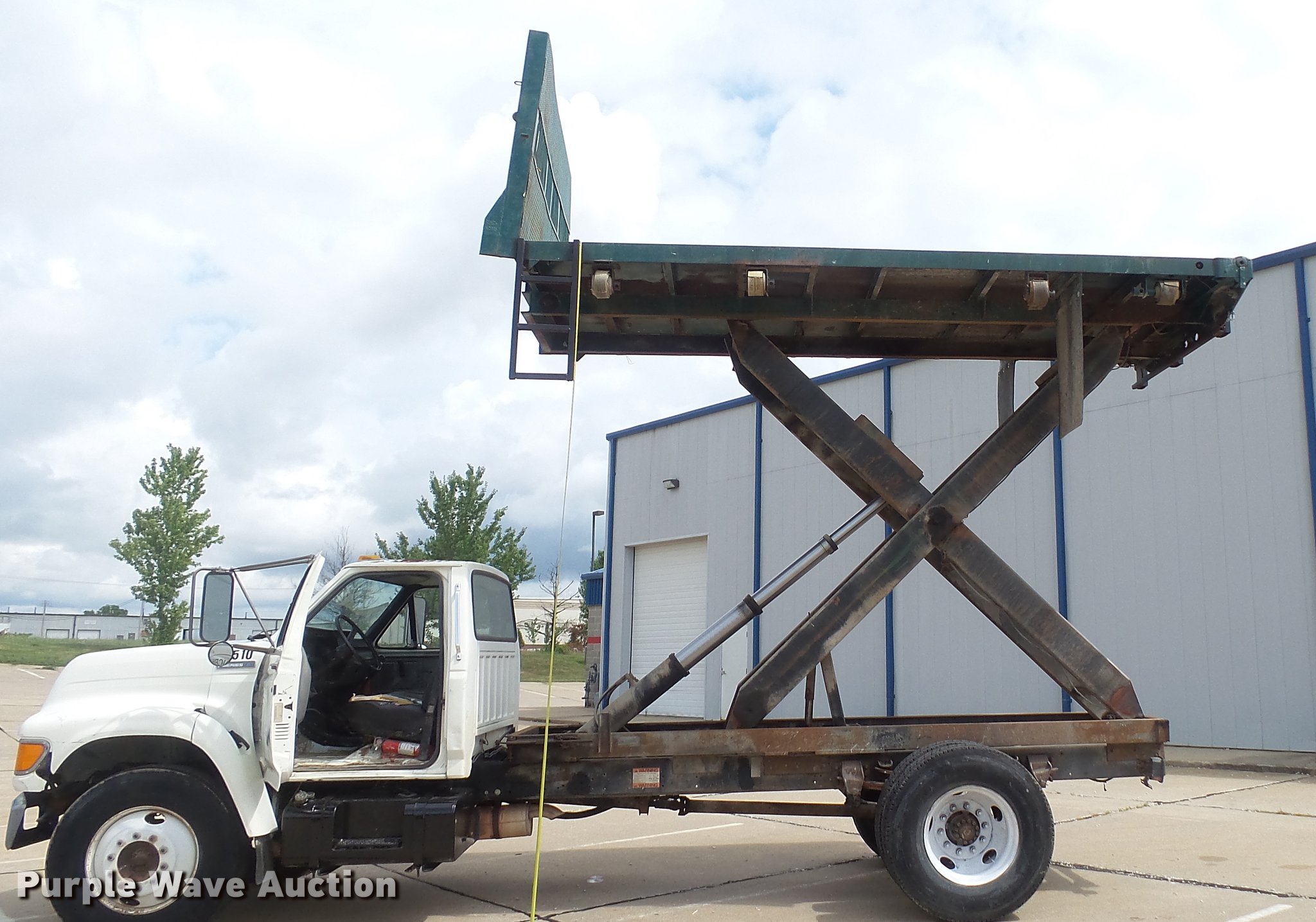 Purple Wave is selling a used Construction Dump Truck in Missouri. This item is a 1995 Ford F700 flat dump bed truck with the following: 67,379 miles on odometer, 7.0L V8 gas engine, Five speed manual transmission, Model FS4205BX, Two speed rear end, Single axle, Heat, AM/FM, PTO, Front tow hooks, 192"L x 95"W steel flatbed, 57" floor height, Dual ram scissor hoist, 13'10" lift height, (4) ratchet tie-downs, Stake side pockets, Rolling tailboard, Single fuel tank, 189" wheelbase, Spring suspension, Hydraulic brakes, 11R22.5 tires, GVWR 24,500 lbs, FAWR 7,000 lbs, RAWR 17,500 lbs, Hydraulic tank leaks, Non-operational radio, Unit# T-510