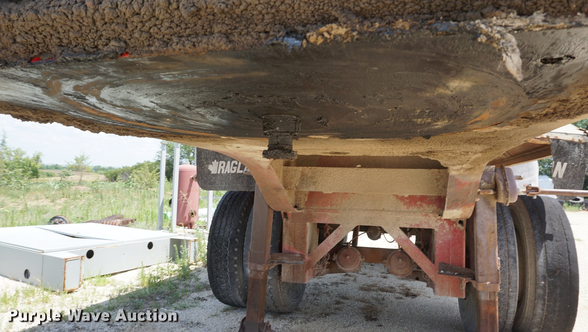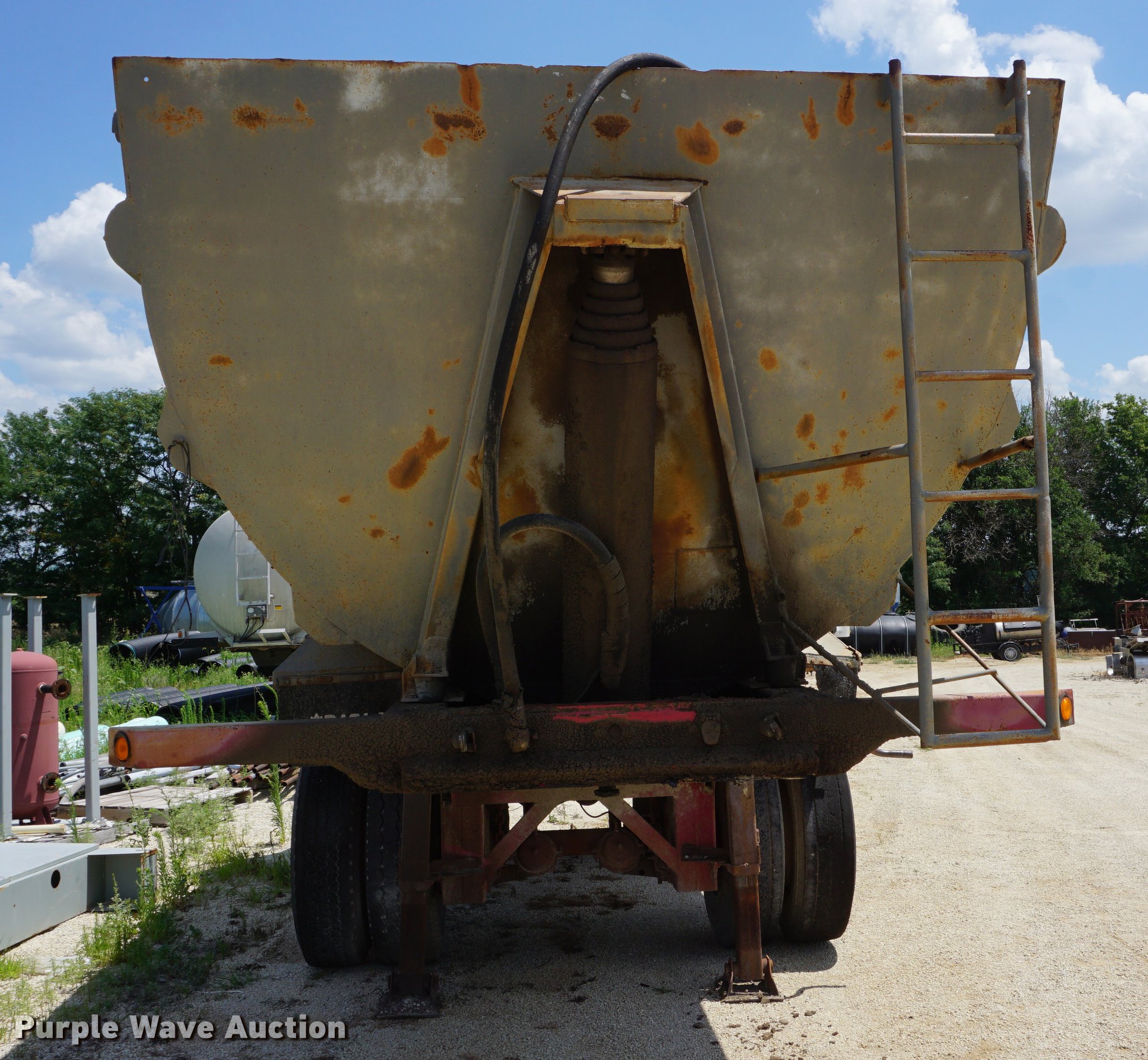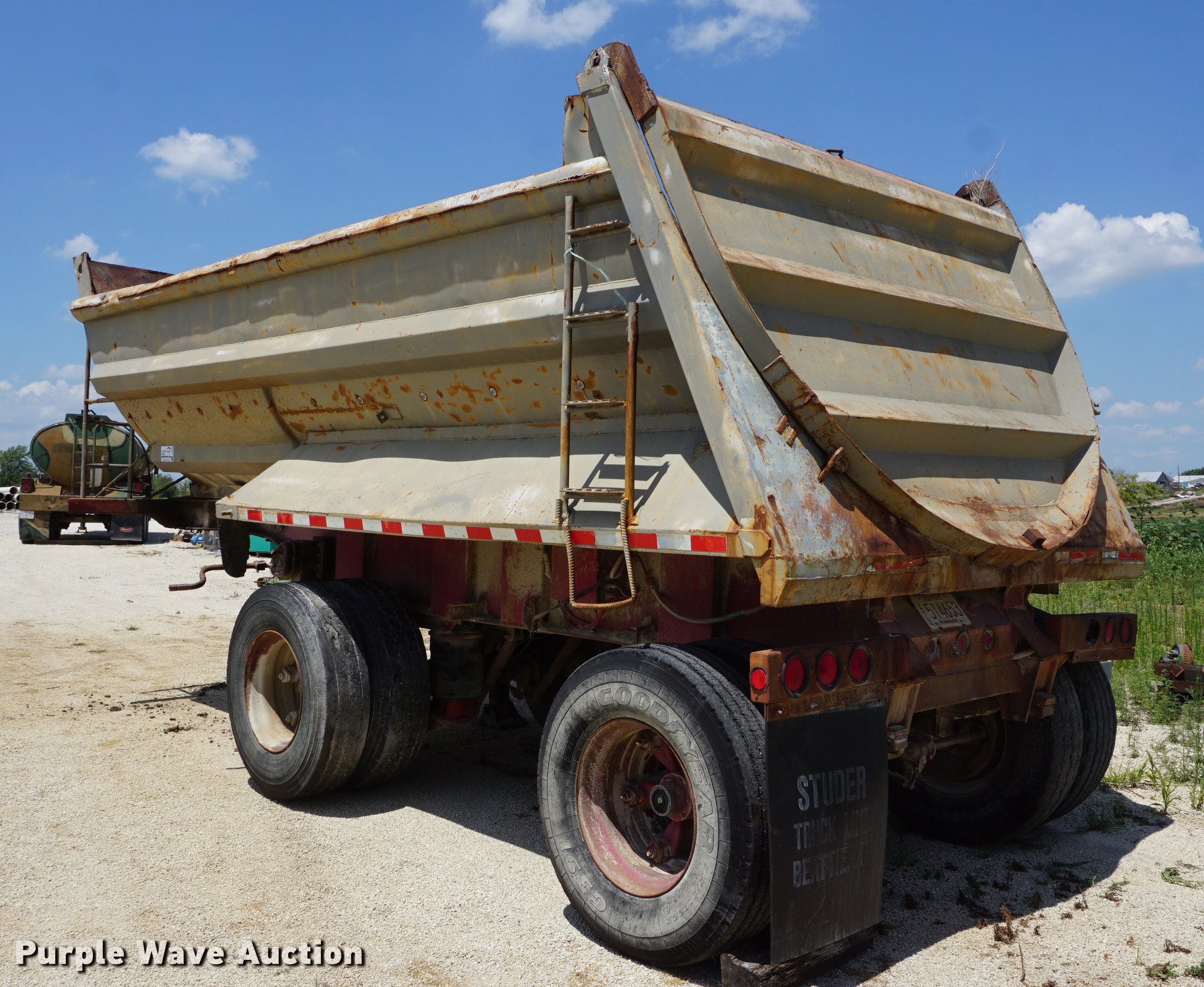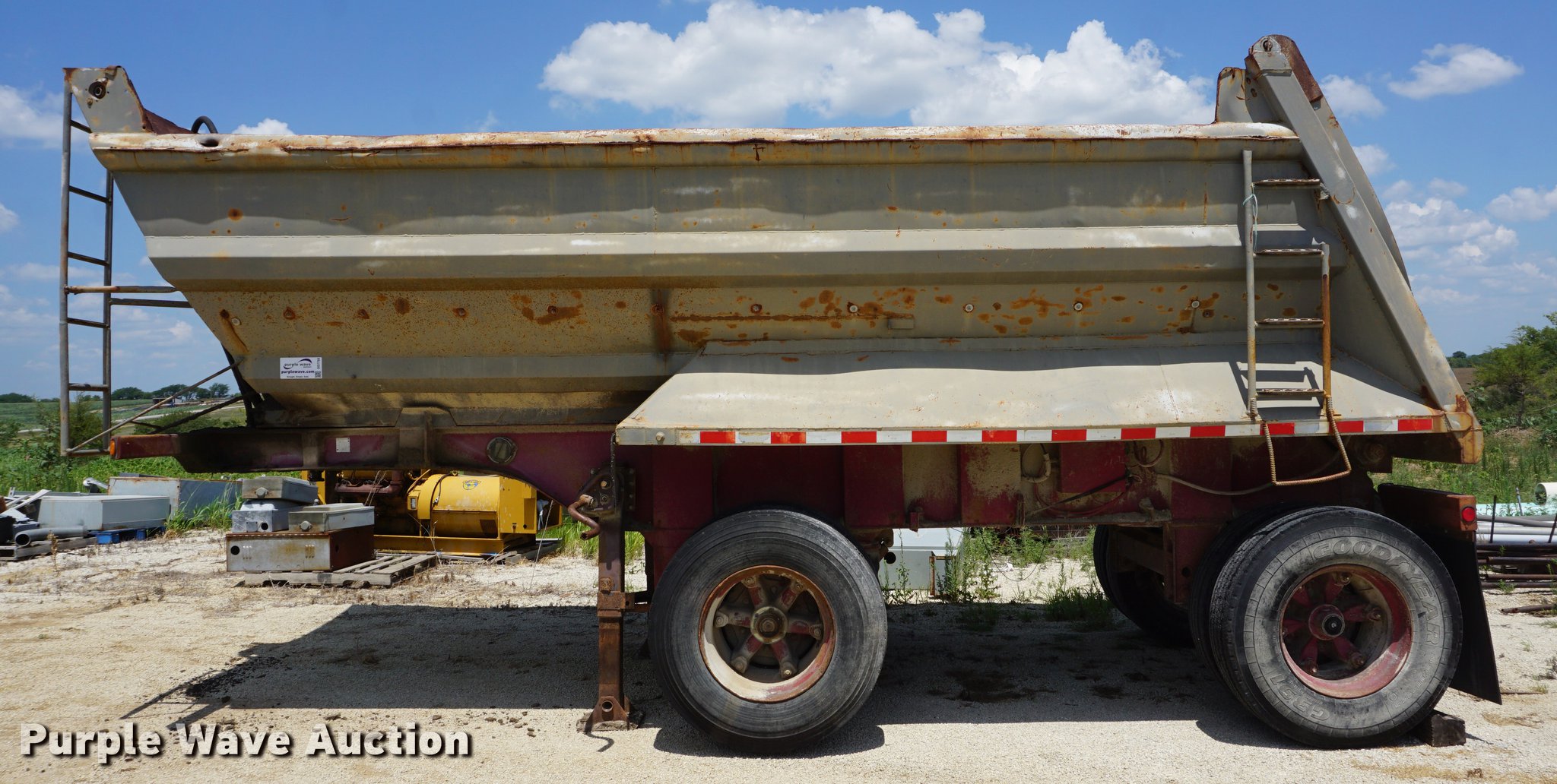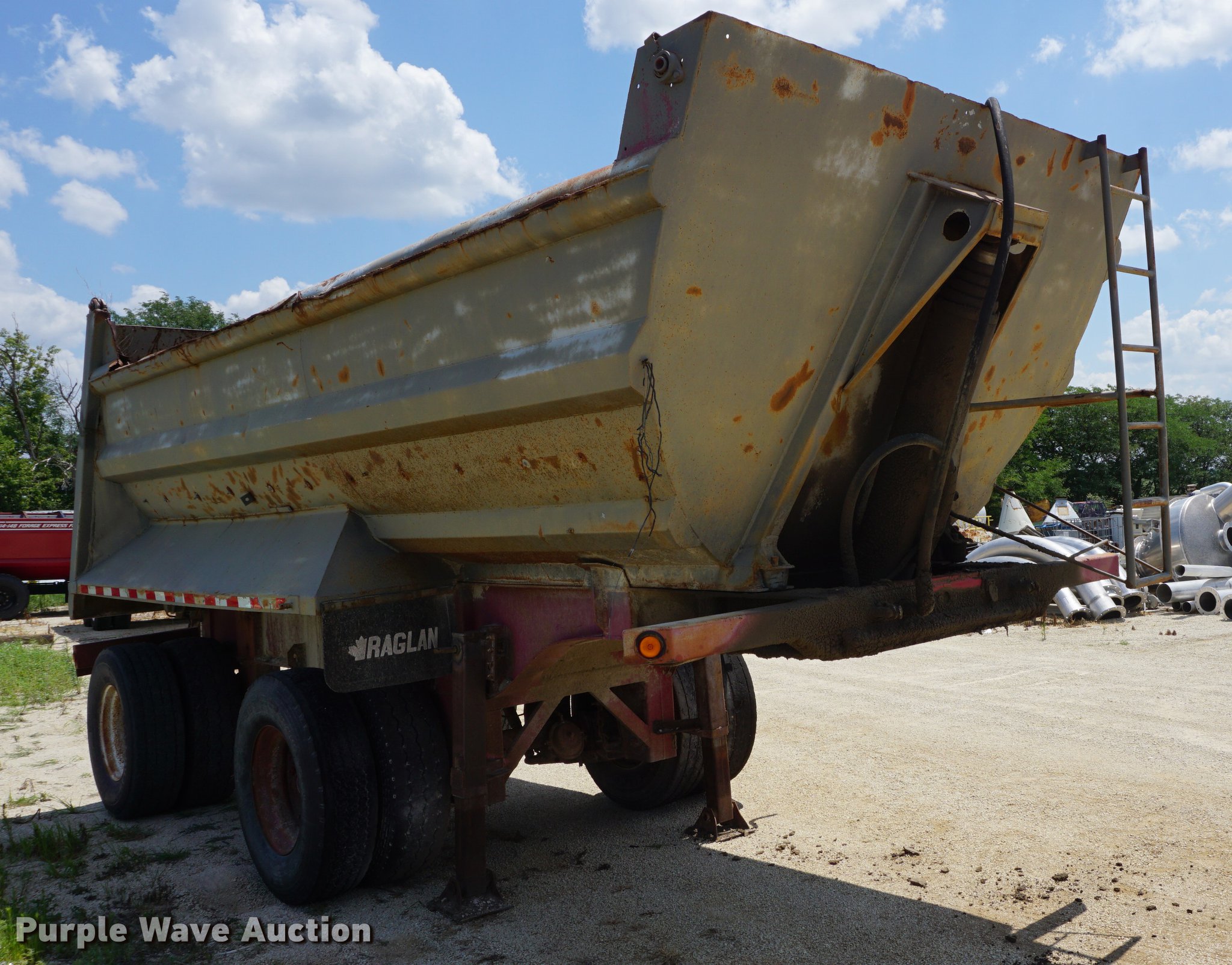 Purple Wave is selling a used End Dump Rock Trailer in Kansas. This item is a 1985 Raylan end dump trailer with the following: 20'L x 102"W, Steel barrel bed, Single cylinder hoist, Air operated end gate, Poly liner, Fifth wheel plate, Dual leg landing gear, Air suspension, Air brakes, Spread axle, 315/80R22.5 tires
