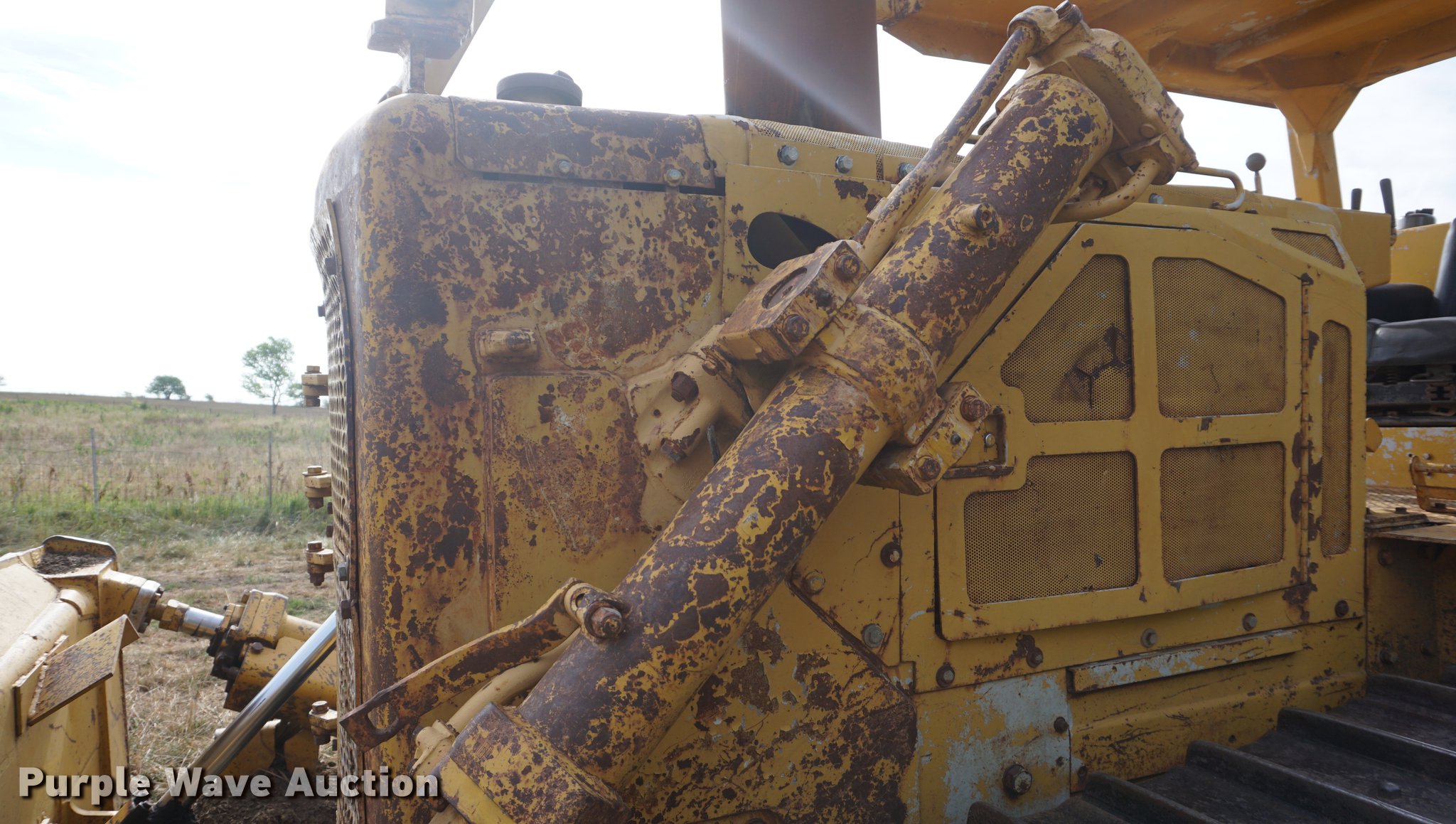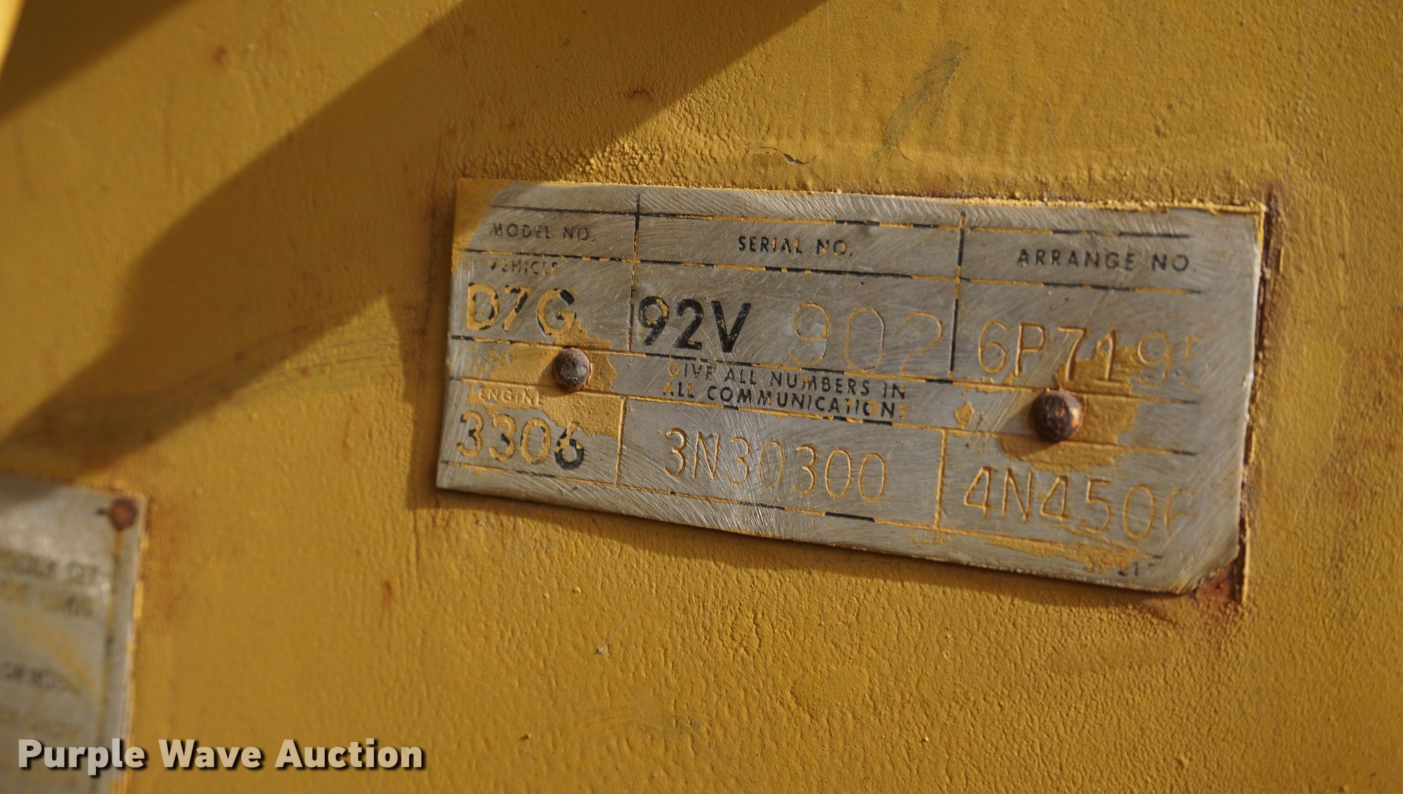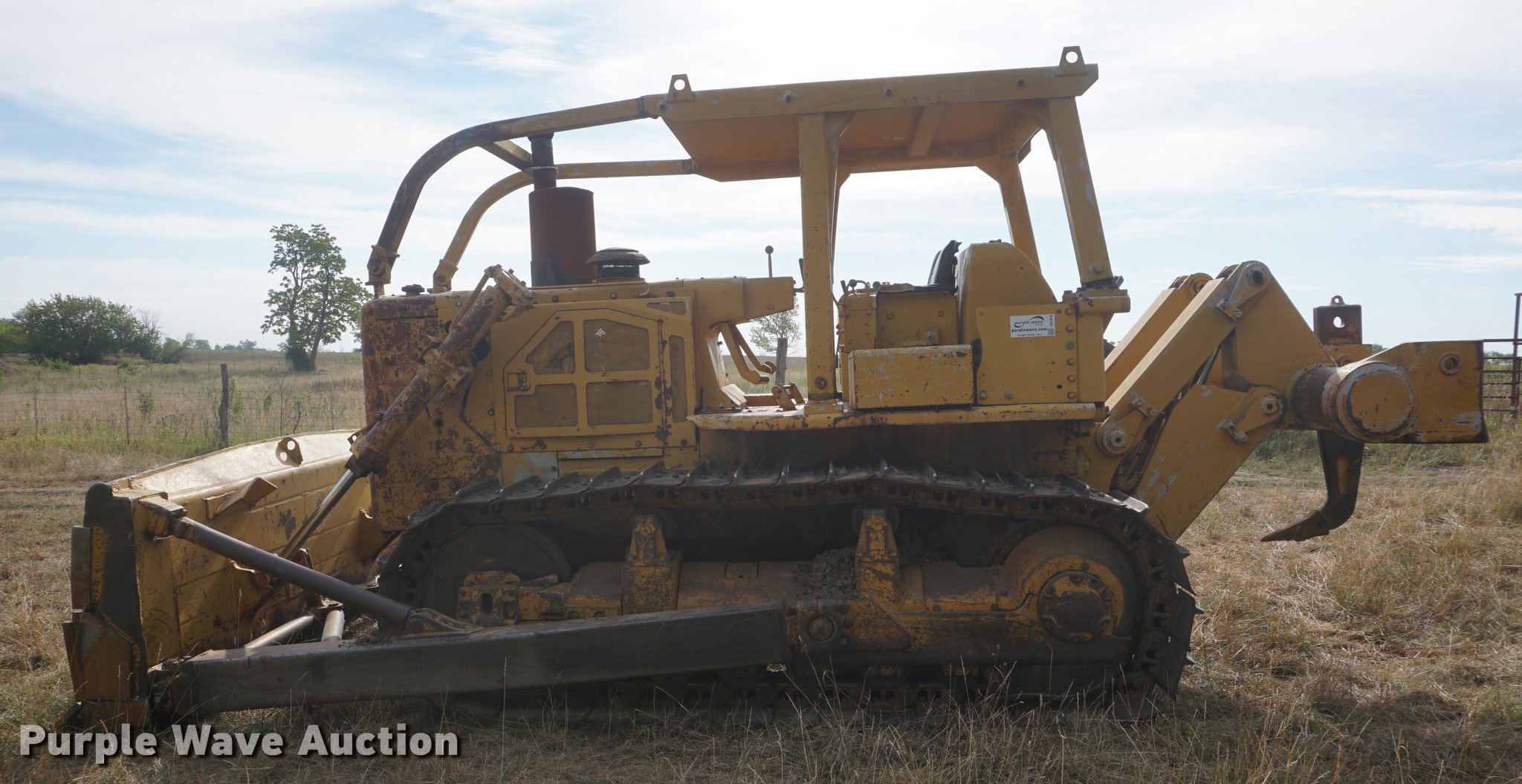 Purple Wave is selling a used Crawler Dozer in Kansas. This item is a 1975 Caterpillar D7G dozer with the following: 421 hours on meter, Caterpillar 3306 10.5L six cylinder turbo diesel engine, 200 HP, Powershift transmission, 3F-3R gears, Canopy, Clutch brake steering, Sweeps, 11.5'W straight dozer blade, Ripper, (1) shanks, Six bottom rollers, 24"W single grouser track pads, Non-operational left side track tightener, Transmission rebuilt 421 hours ago in 06/2012, Serial 92V902