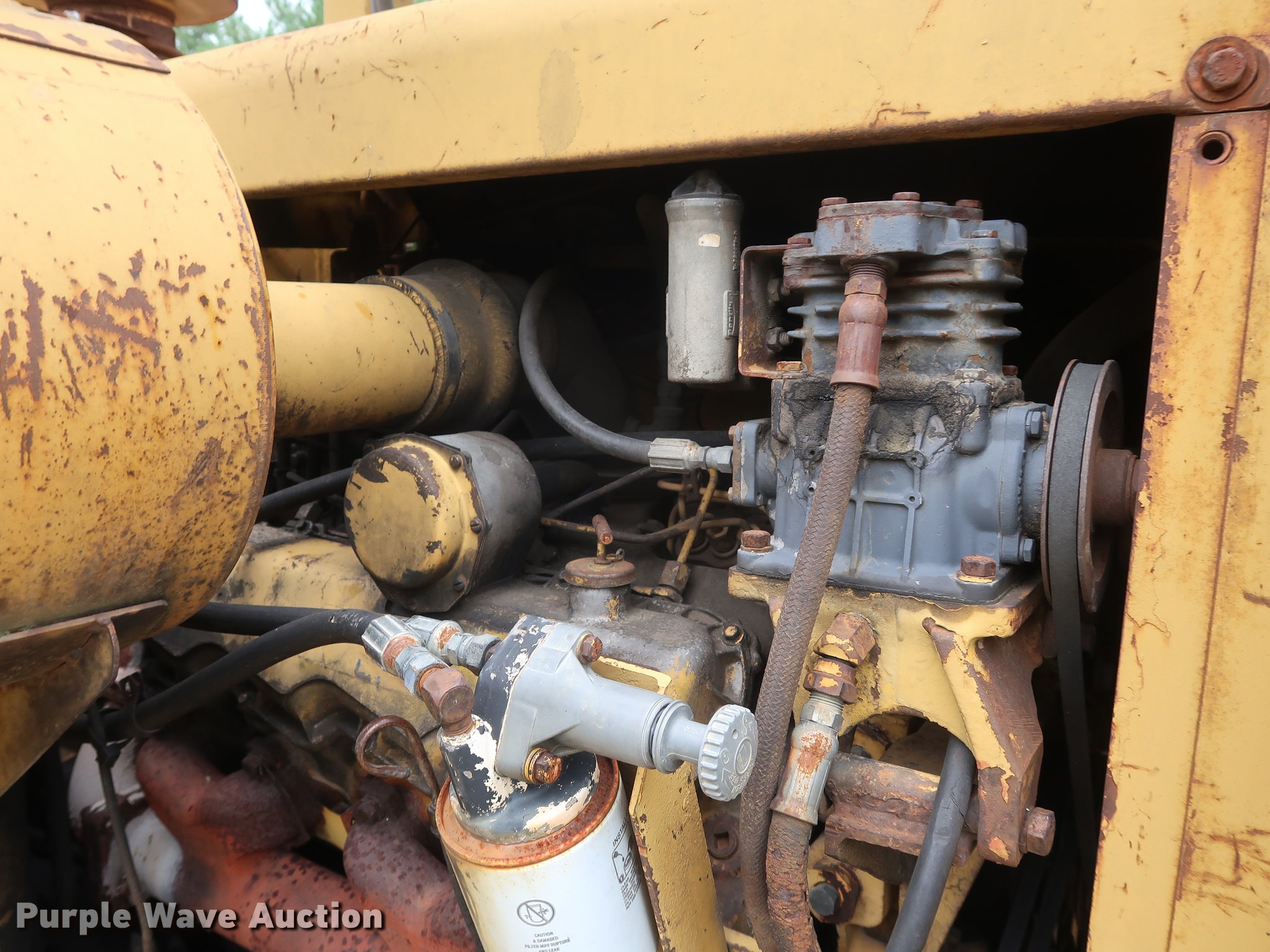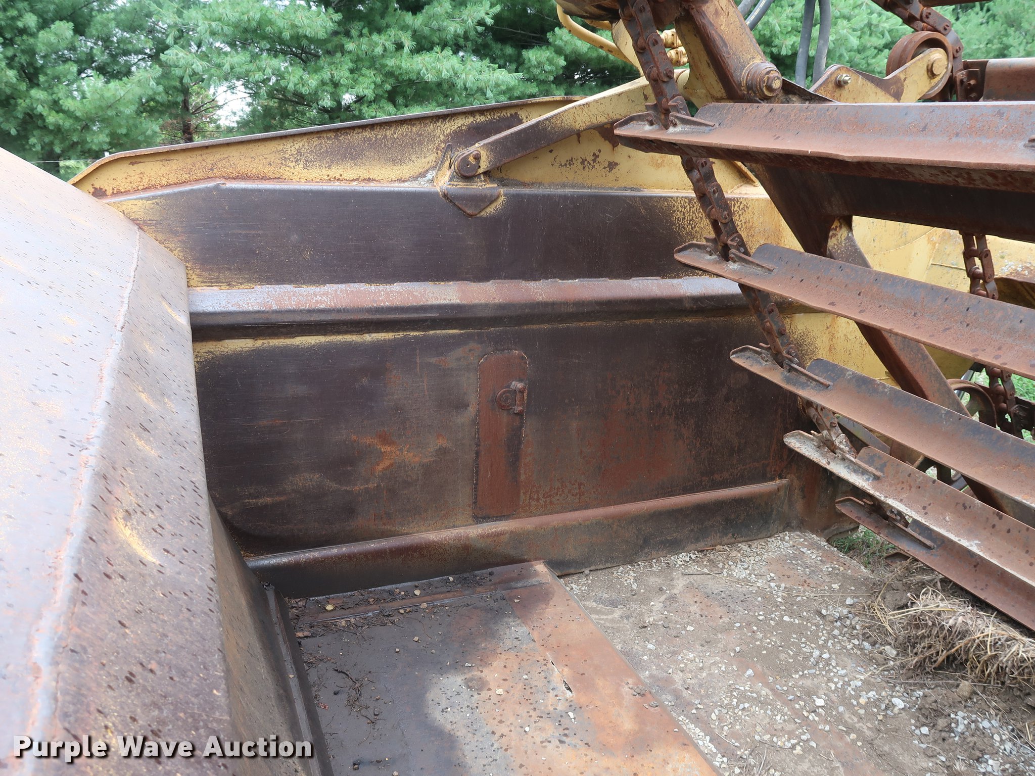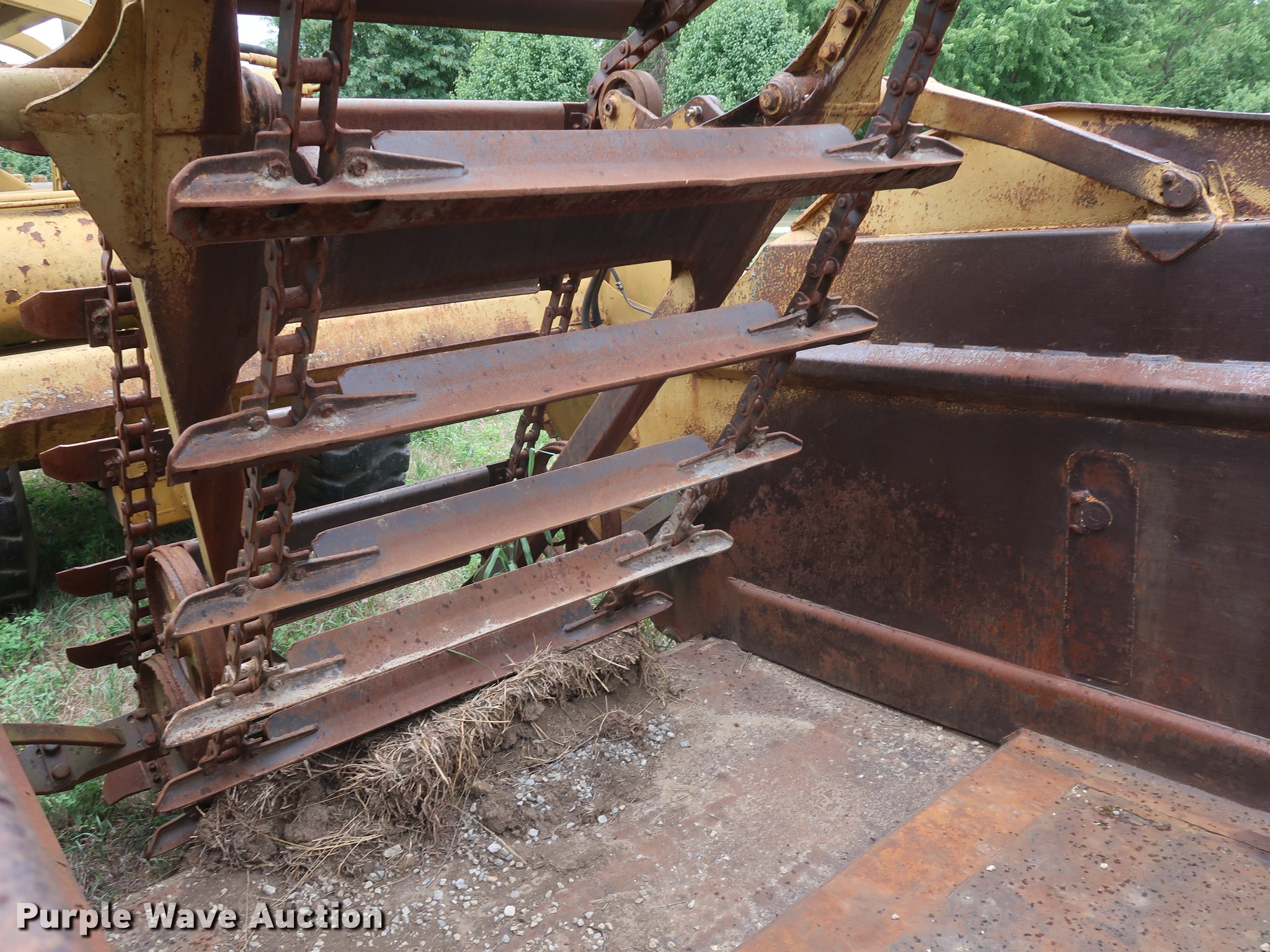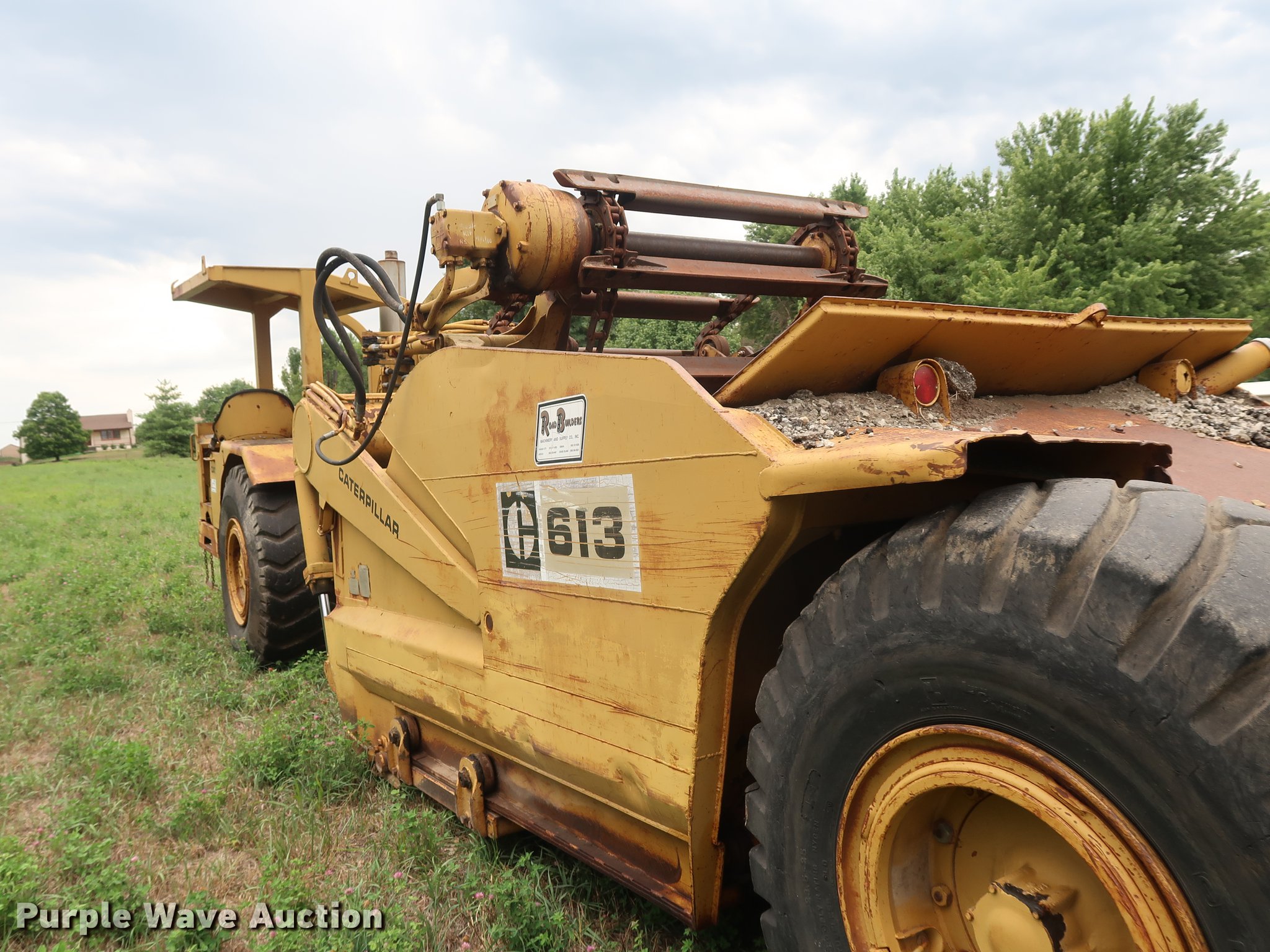 Purple Wave is selling a used Elevating Scraper in Missouri. This item is a 1972 Caterpillar 613 elevating scraper with the following: 4,465 hours on meter, Caterpillar eight cylinder diesel engine, Powershift transmission, 9'W bowl width, Three lever controls, 23.5-25 tires, Serial 72M1574