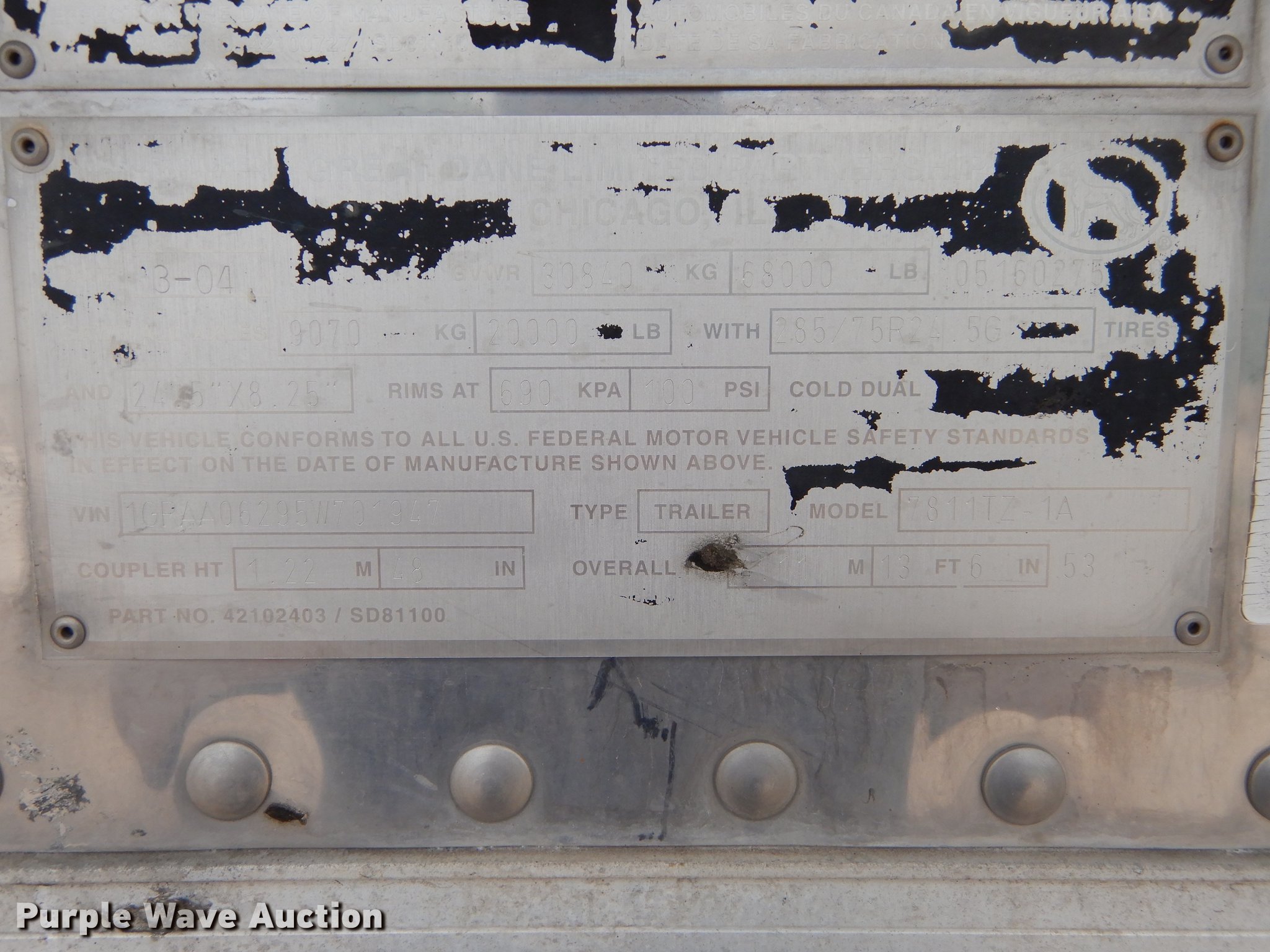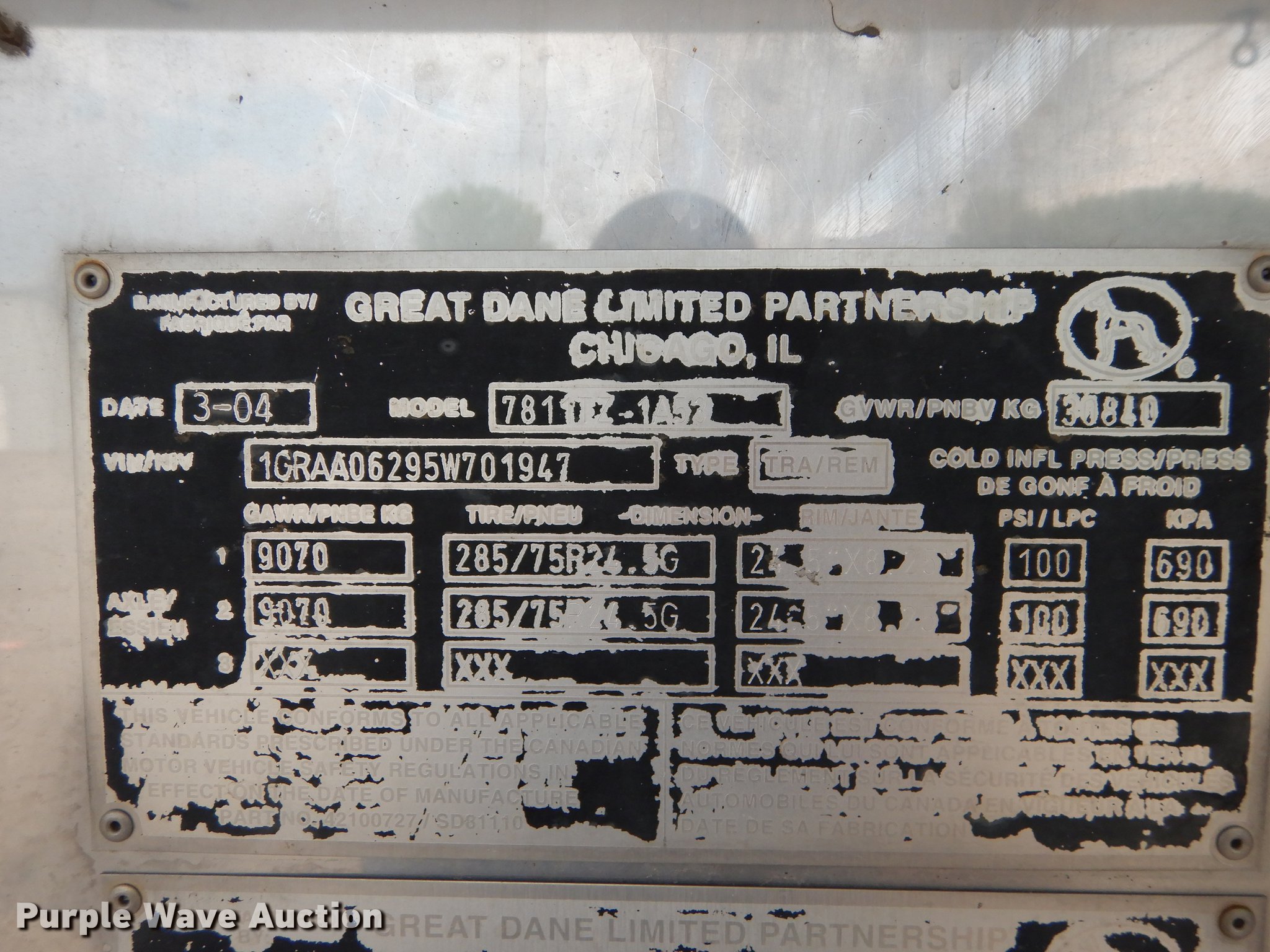 Purple Wave is selling a used Refrigerated Van Trailer in Kansas. This item is a 2005 Great Dane 7811TZ-1A53 refrigerated van trailer with the following: 53'L x 101"W, 13.5'H, Aluminum floor, Swinging rear doors, Thermo King/Ingersoll Rand Smart Reefer 2 reefer unit, Power supply, Dead battery, Unknown operating condition, Spare tire rack with tire, Snow chains, 48" coupler height, Air suspension, Air brakes, Tandem axle, 445/50R22.5 tires, GVWR 68,000 lbs