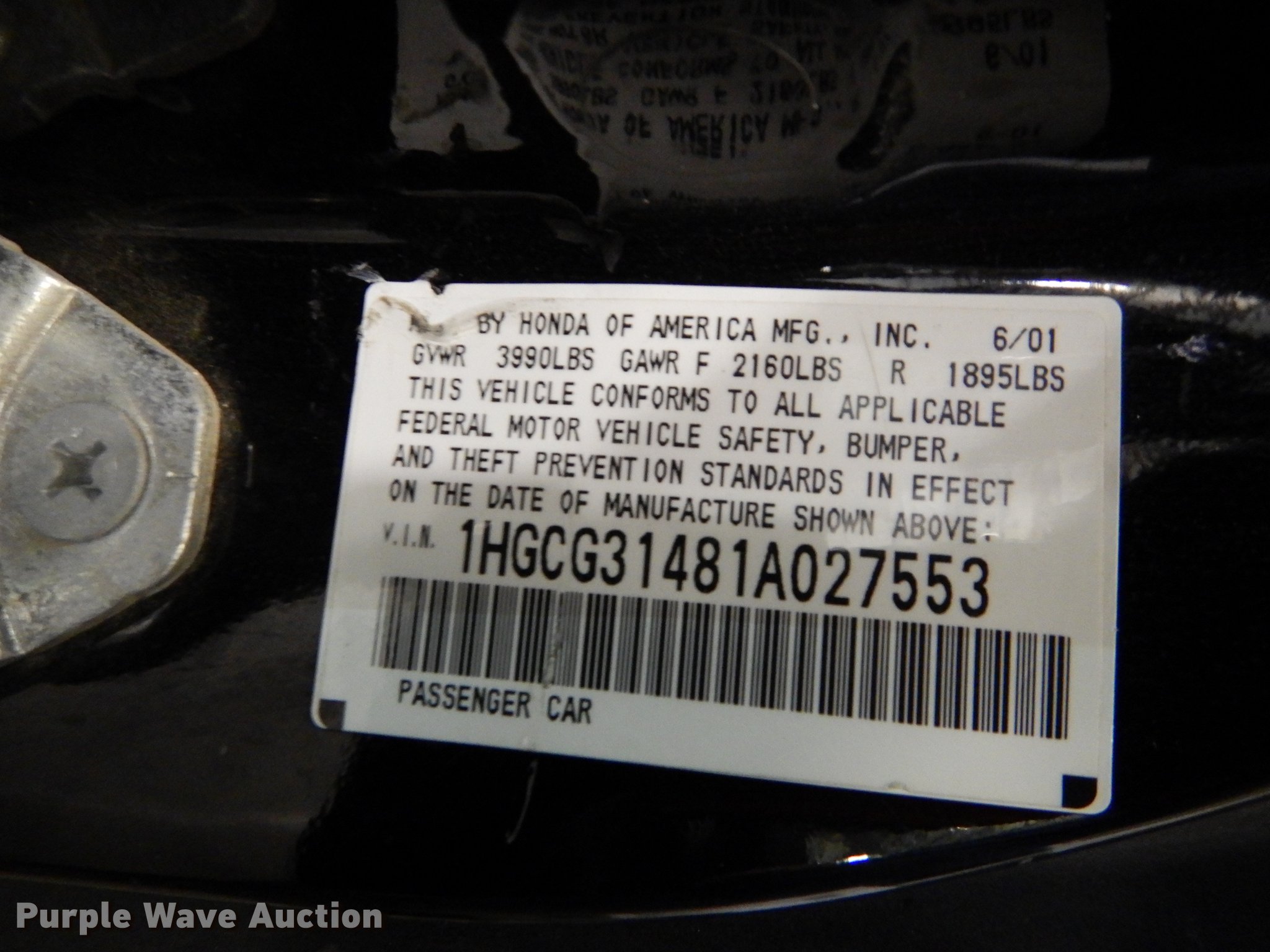 Purple Wave is selling a used Passenger Vehicle in Kansas. This item is a 2001 Honda Accord with the following: Non-repairable certificate, parts only, 230,564 miles on odometer, 2.3L L4 SOHC 16V gas engine, Five speed manual transmission, AC and heat, Tilt, Cruise, Power windows, locks, and mirrors, Cloth interior, Mayrun 225/40ZR18 tires, No stereo, Dead battery