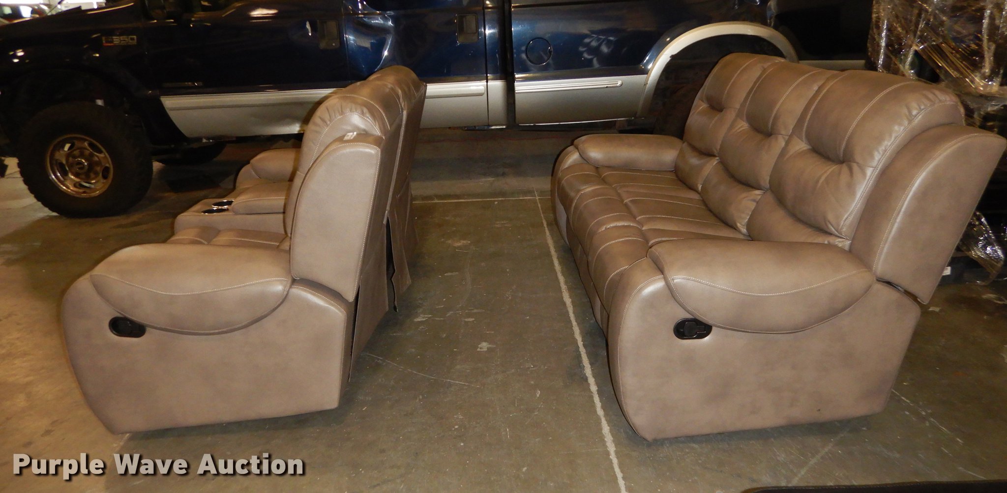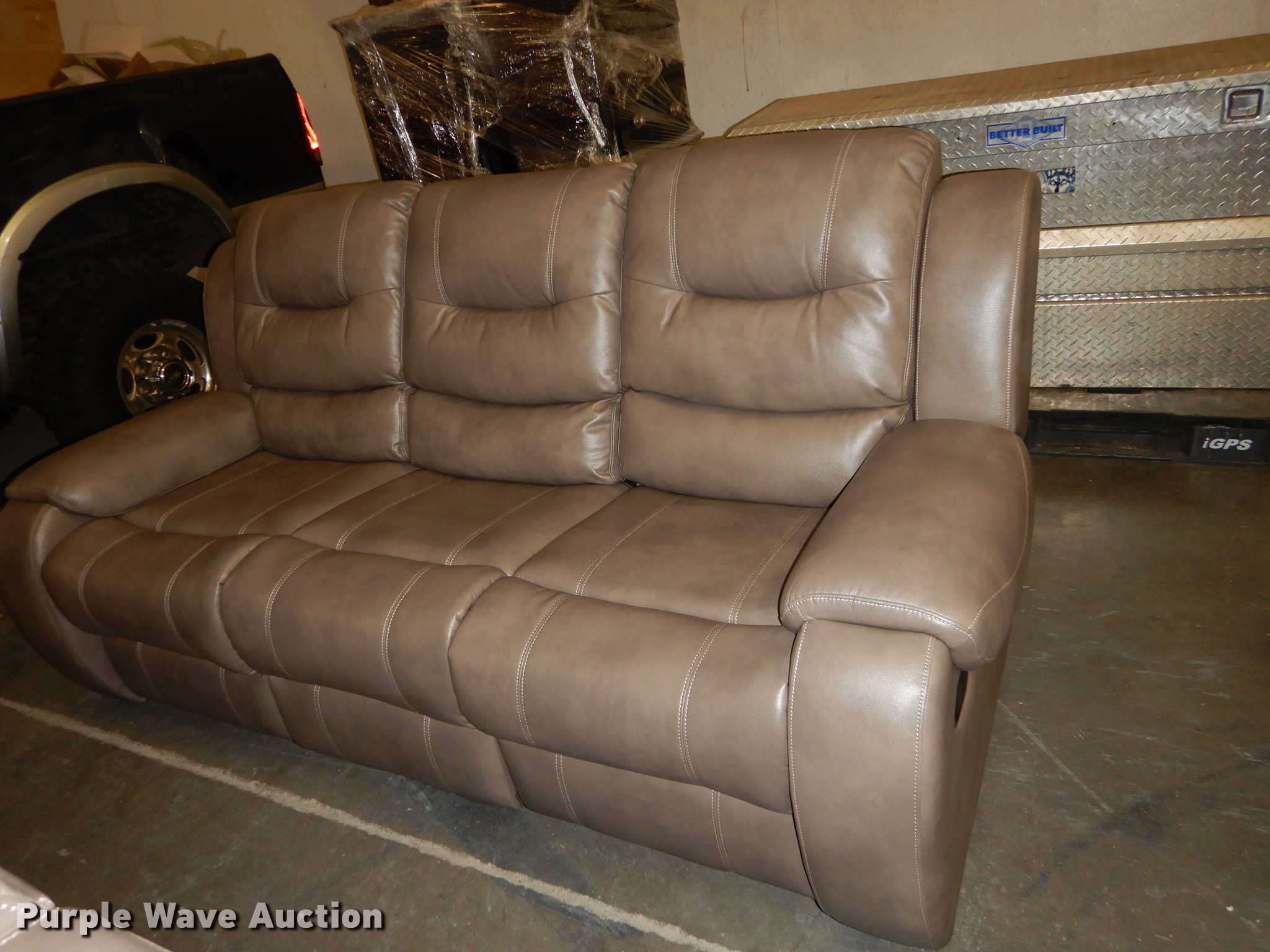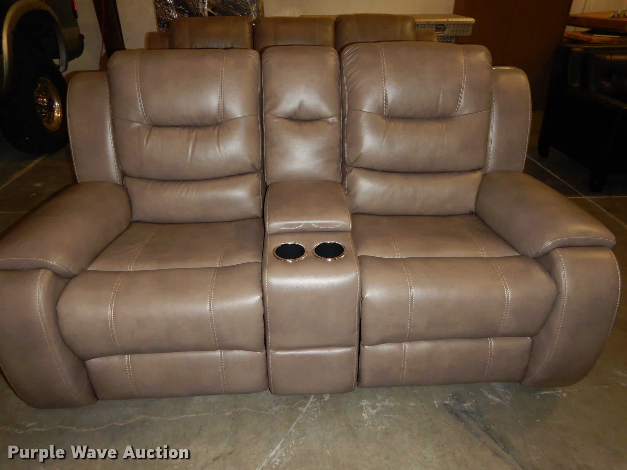 Purple Wave is selling a used Furniture in Kansas. This item is a Conn's leather furniture with the following: Titan Steel, Recliner love seat with cup holders, 75" x 36" x 42", Recliner sofa, 86" x 36" x 42", Unused