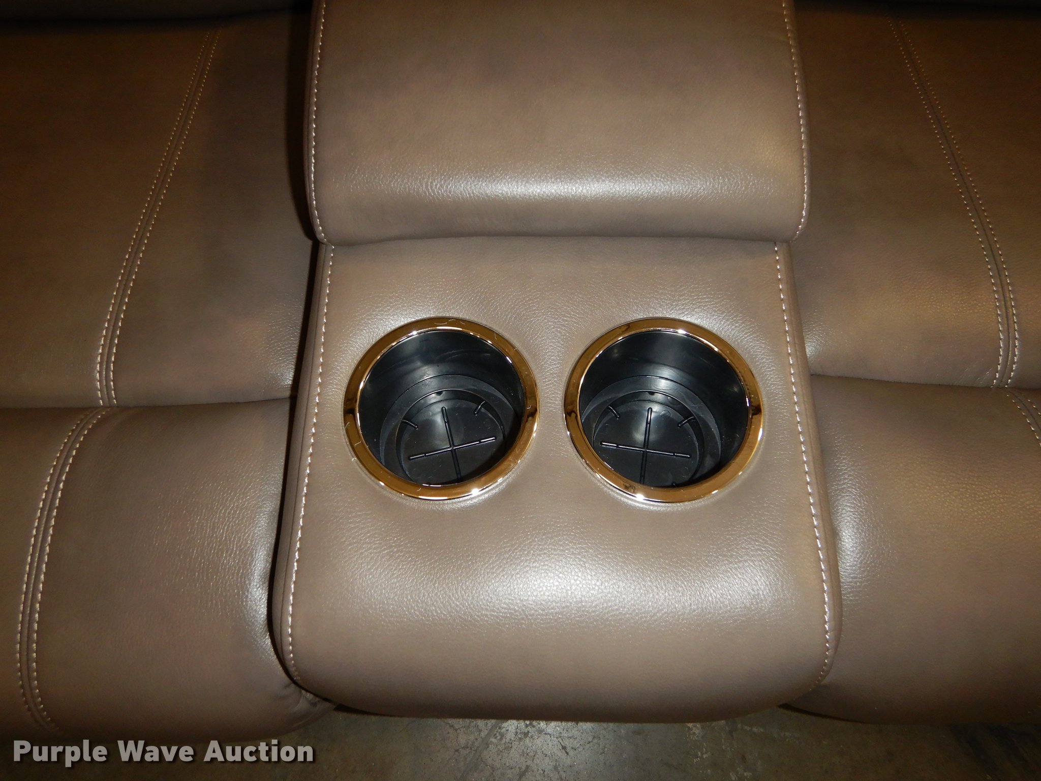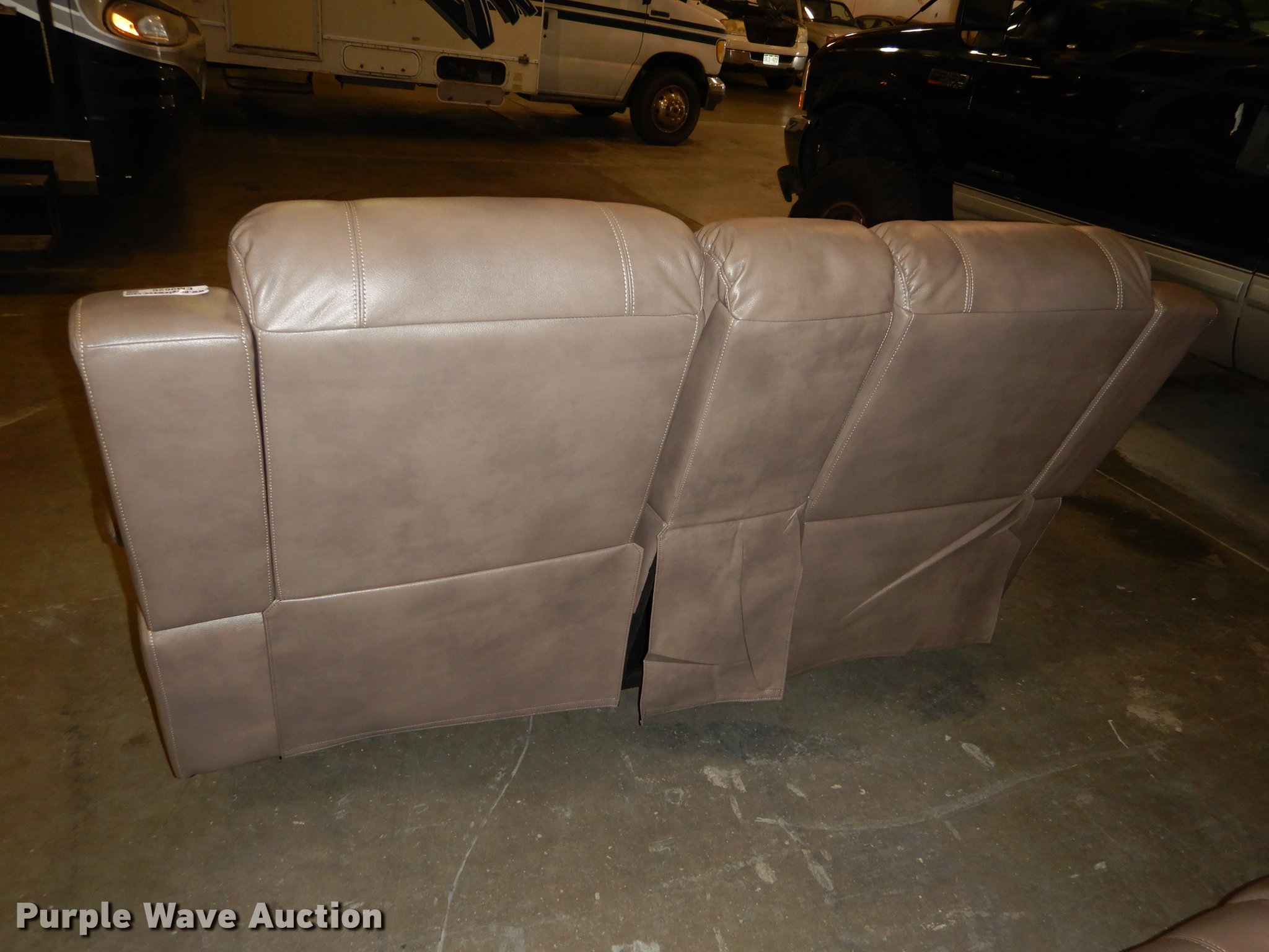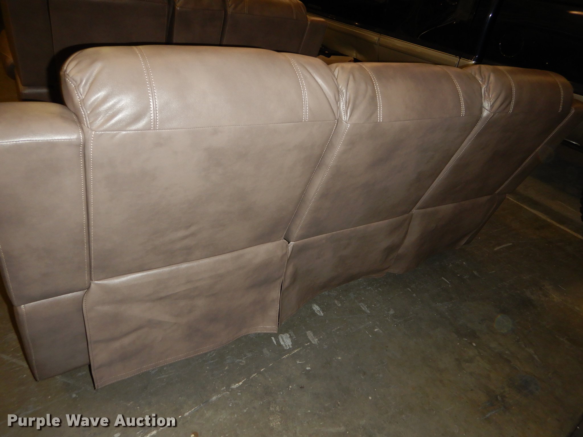 Purple Wave is selling a used Furniture in Kansas. This item is a Conn's leather furniture with the following: Titan Steel, Recliner love seat with cup holders, 75" x 36" x 42", Recliner sofa, 86" x 36" x 42", Unused