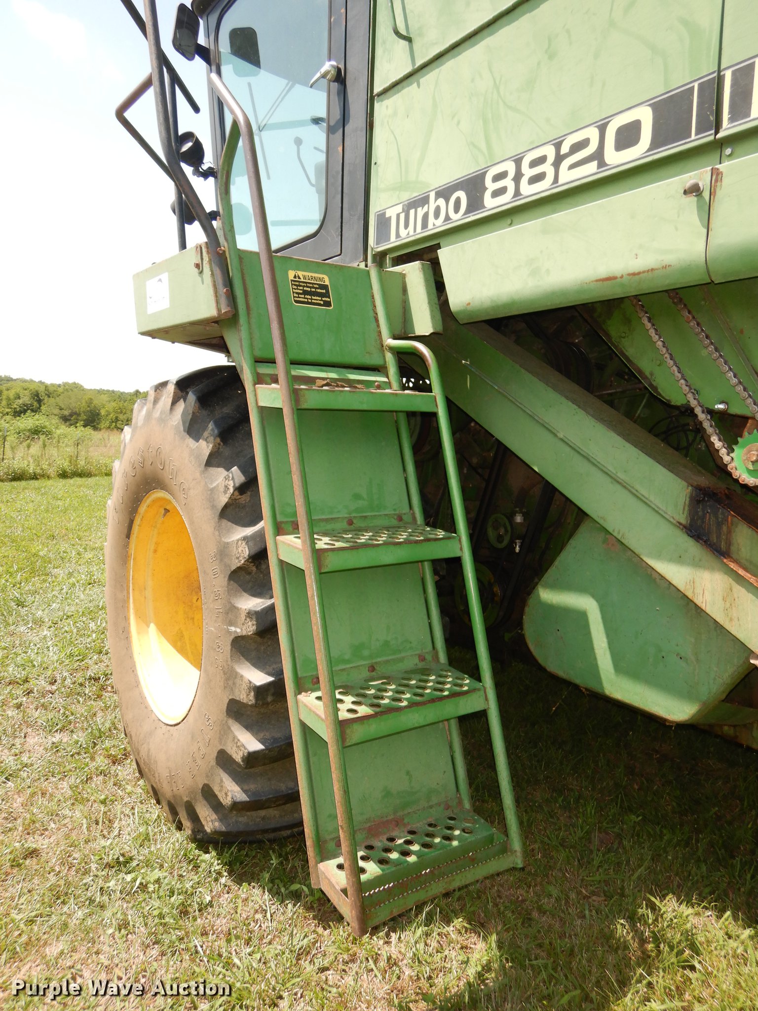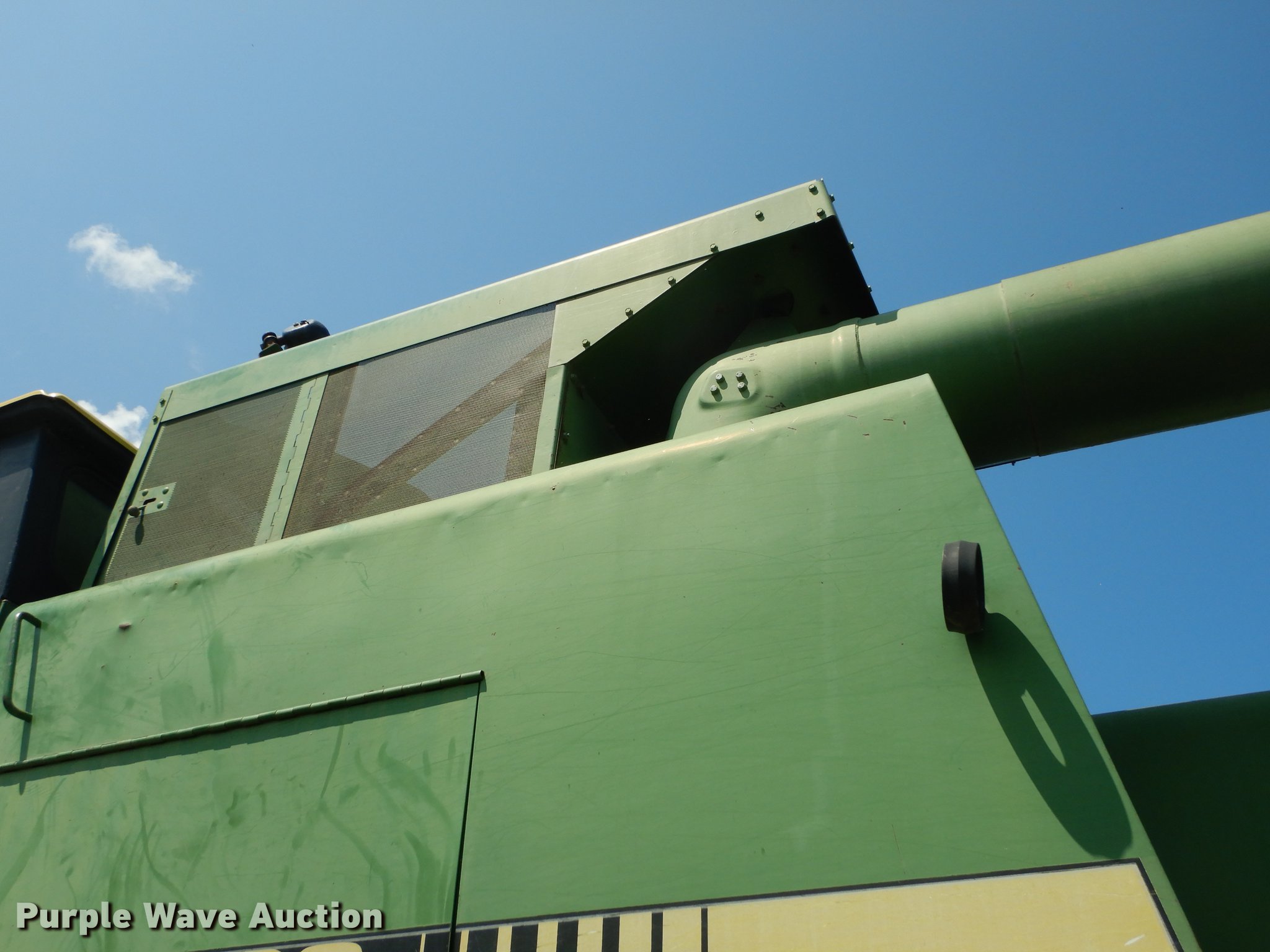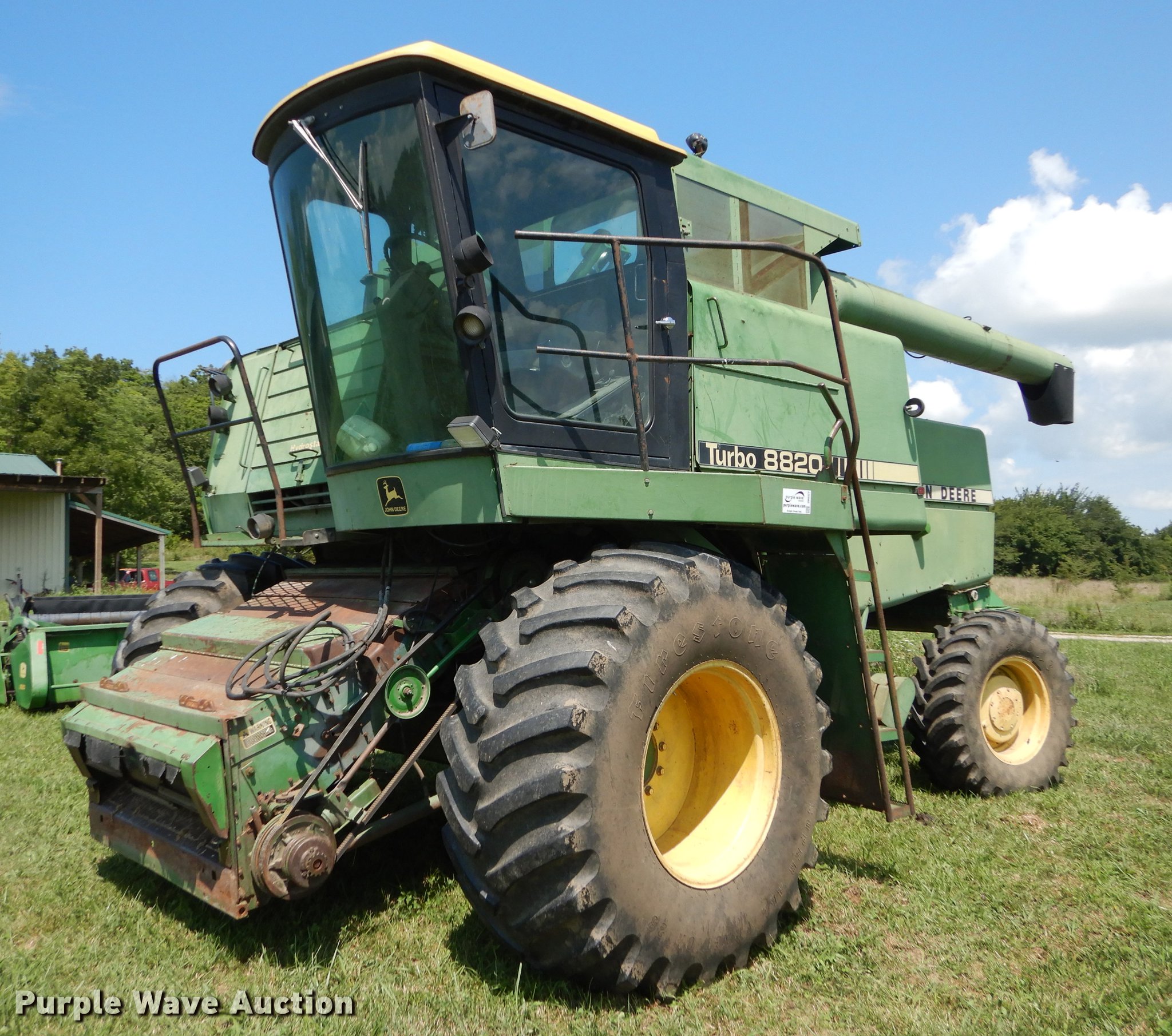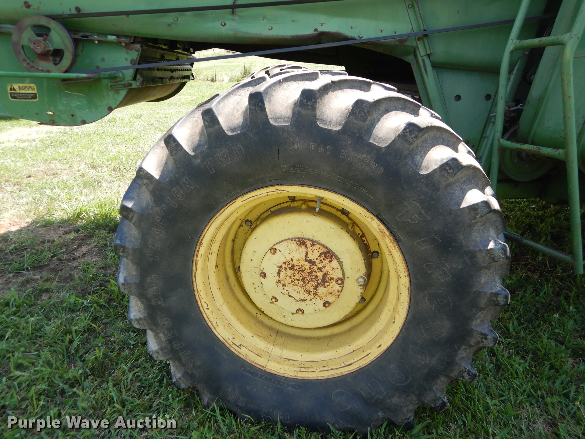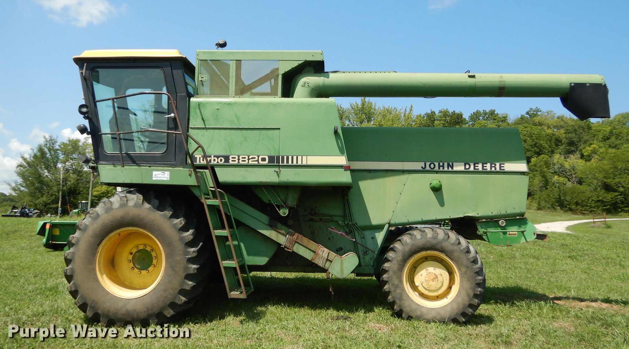 Purple Wave is selling a used Combine in Kansas. This item is a 1980 John Deere 8820 combine with the following: 2,257 engine hours on meter, John Deere six cylinder turbo diesel engine, Hydrostatic transmission, AC and heat, AM/FM, Tilt steering wheel, Wipers, Work lights, Straw chopper, 200 bu. grain bin, 12'L unloading auger, Firestone 30.5-32 front tires, Firestone 16.9-26 rear tires, Non-operational AC, One conveyor auger missing, Battery dead, Serial 416172