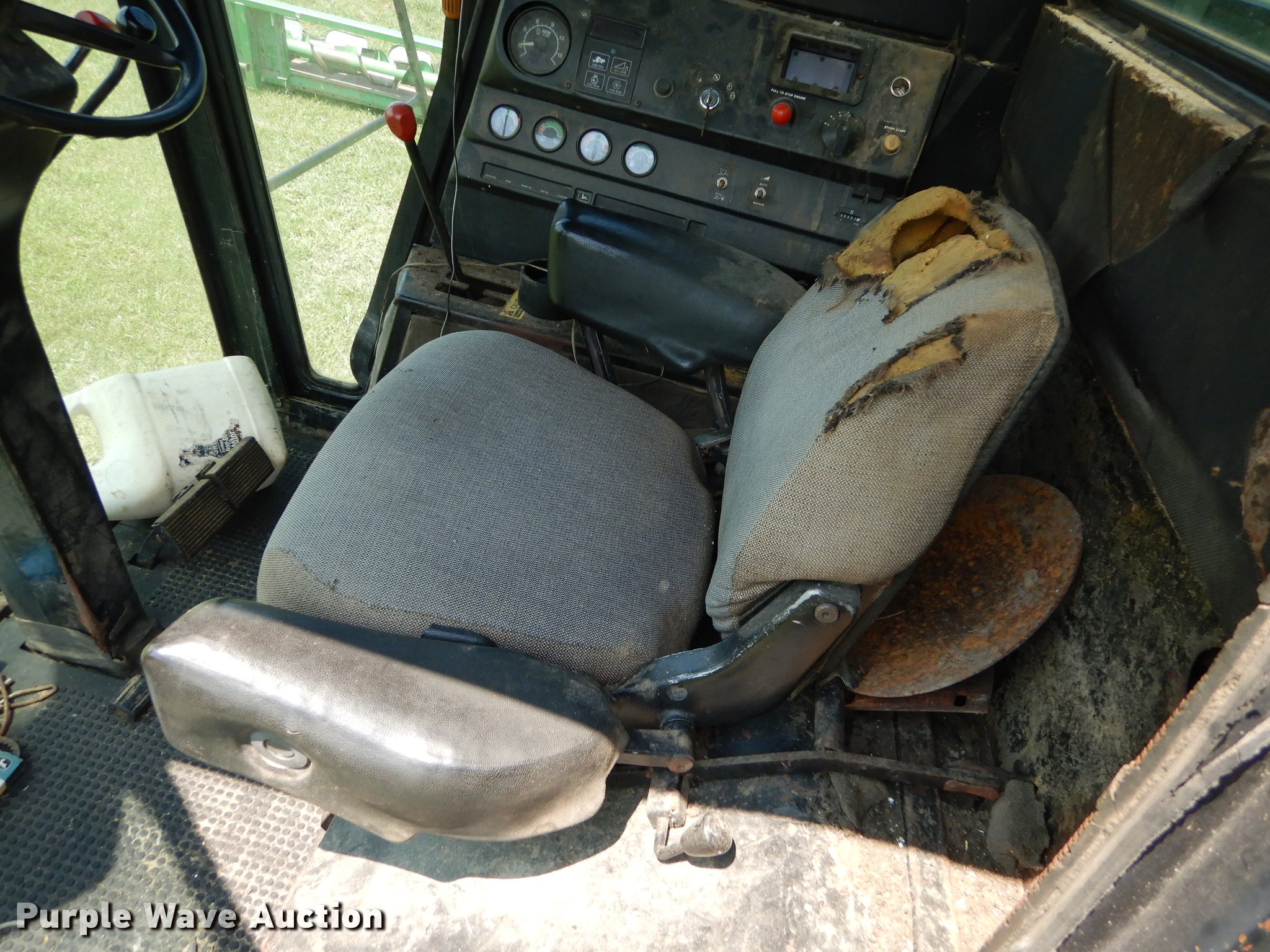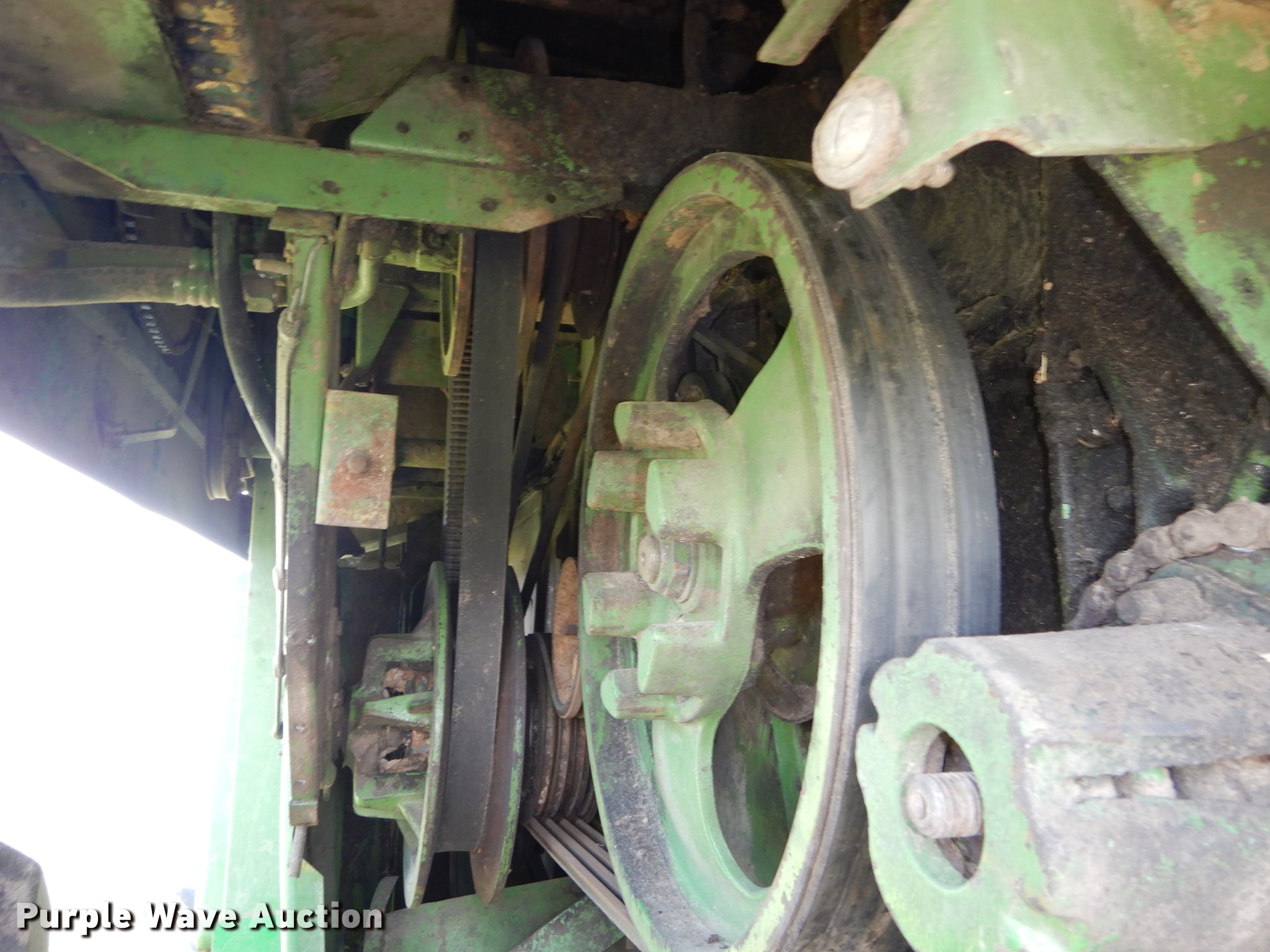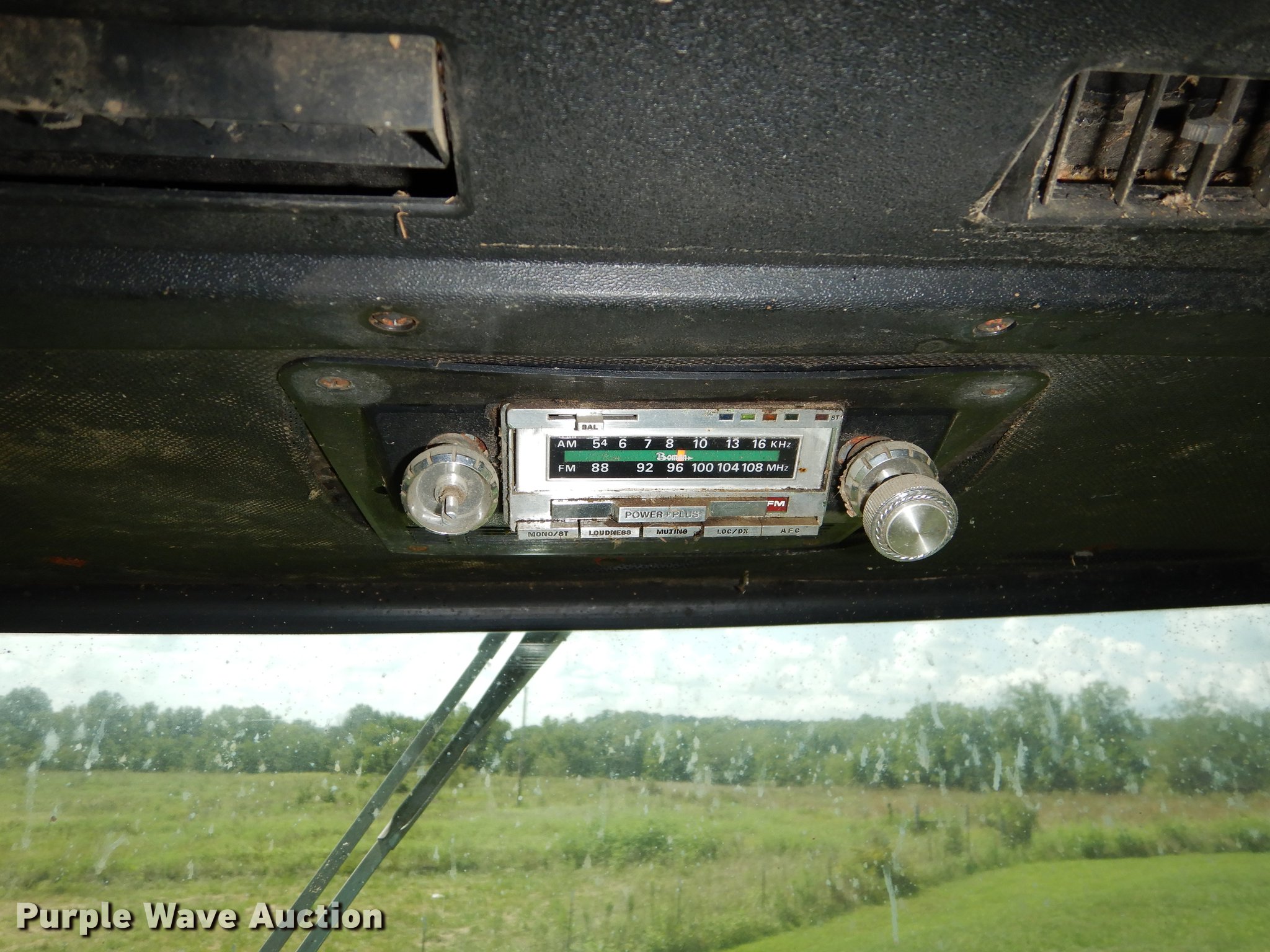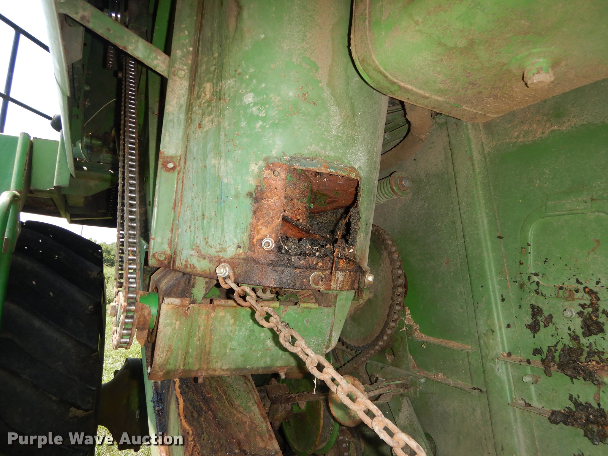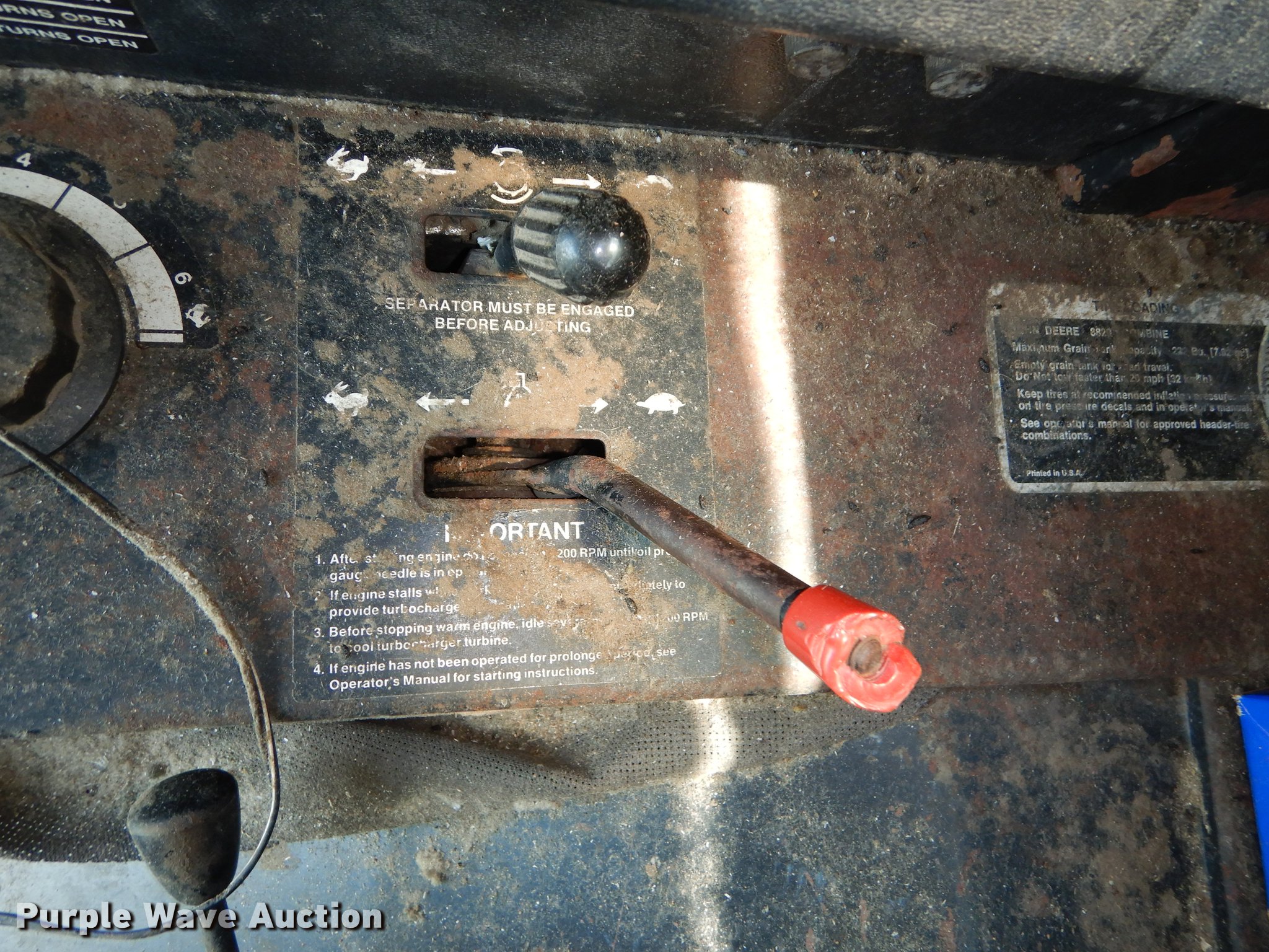 Purple Wave is selling a used Combine in Kansas. This item is a 1980 John Deere 8820 combine with the following: 2,257 engine hours on meter, John Deere six cylinder turbo diesel engine, Hydrostatic transmission, AC and heat, AM/FM, Tilt steering wheel, Wipers, Work lights, Straw chopper, 200 bu. grain bin, 12'L unloading auger, Firestone 30.5-32 front tires, Firestone 16.9-26 rear tires, Non-operational AC, One conveyor auger missing, Battery dead, Serial 416172