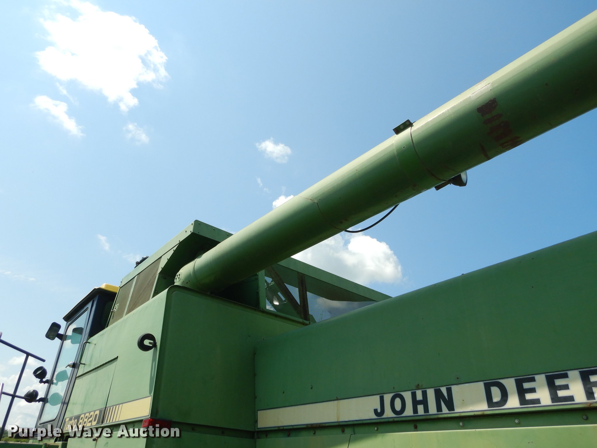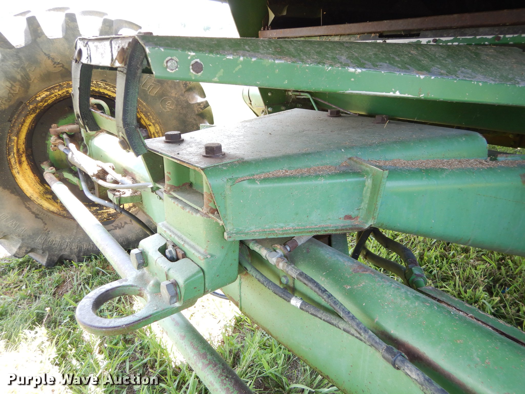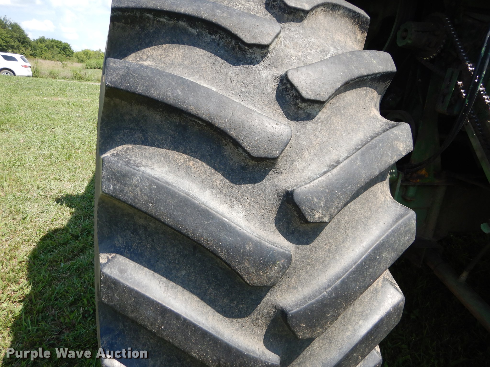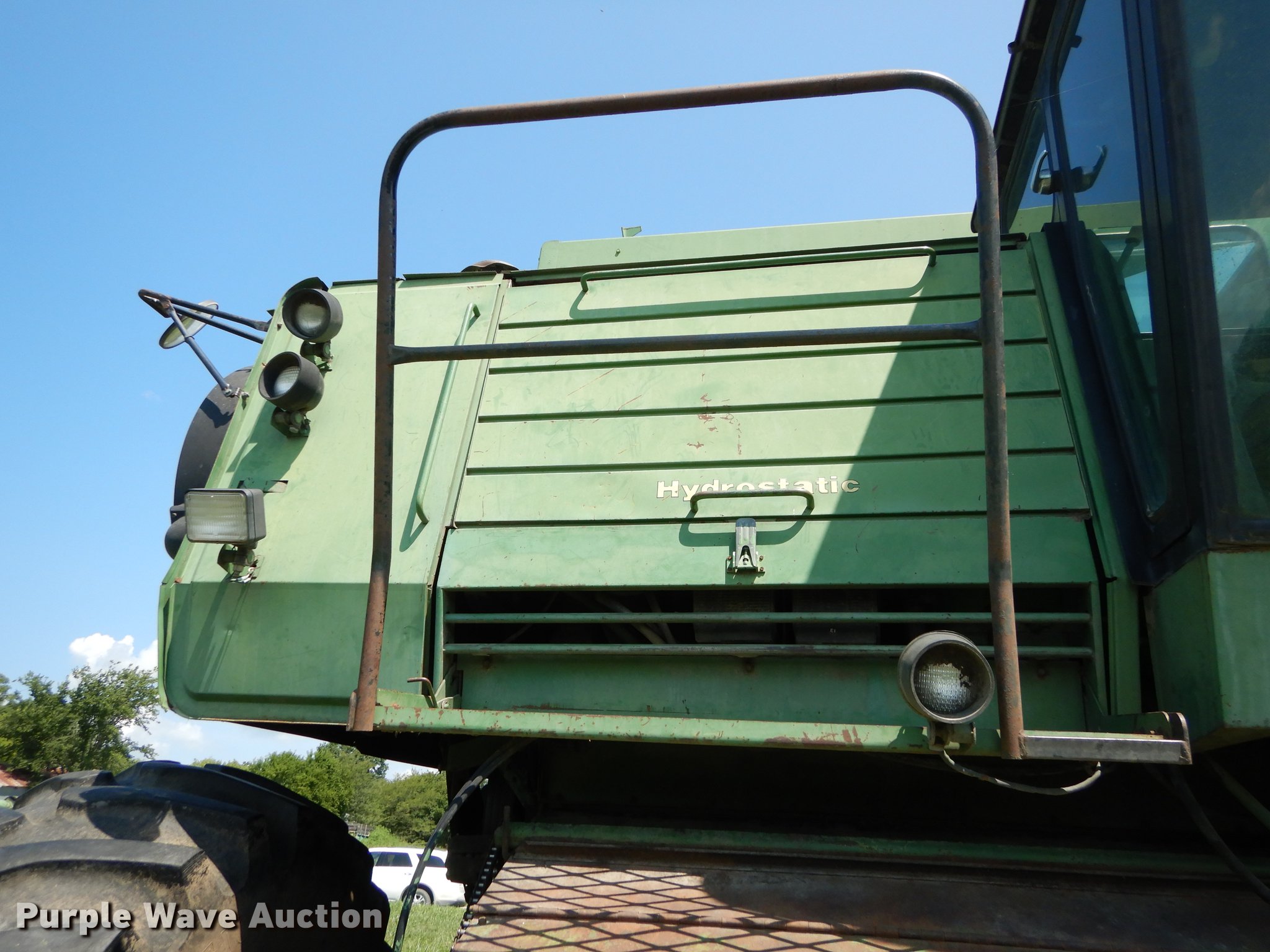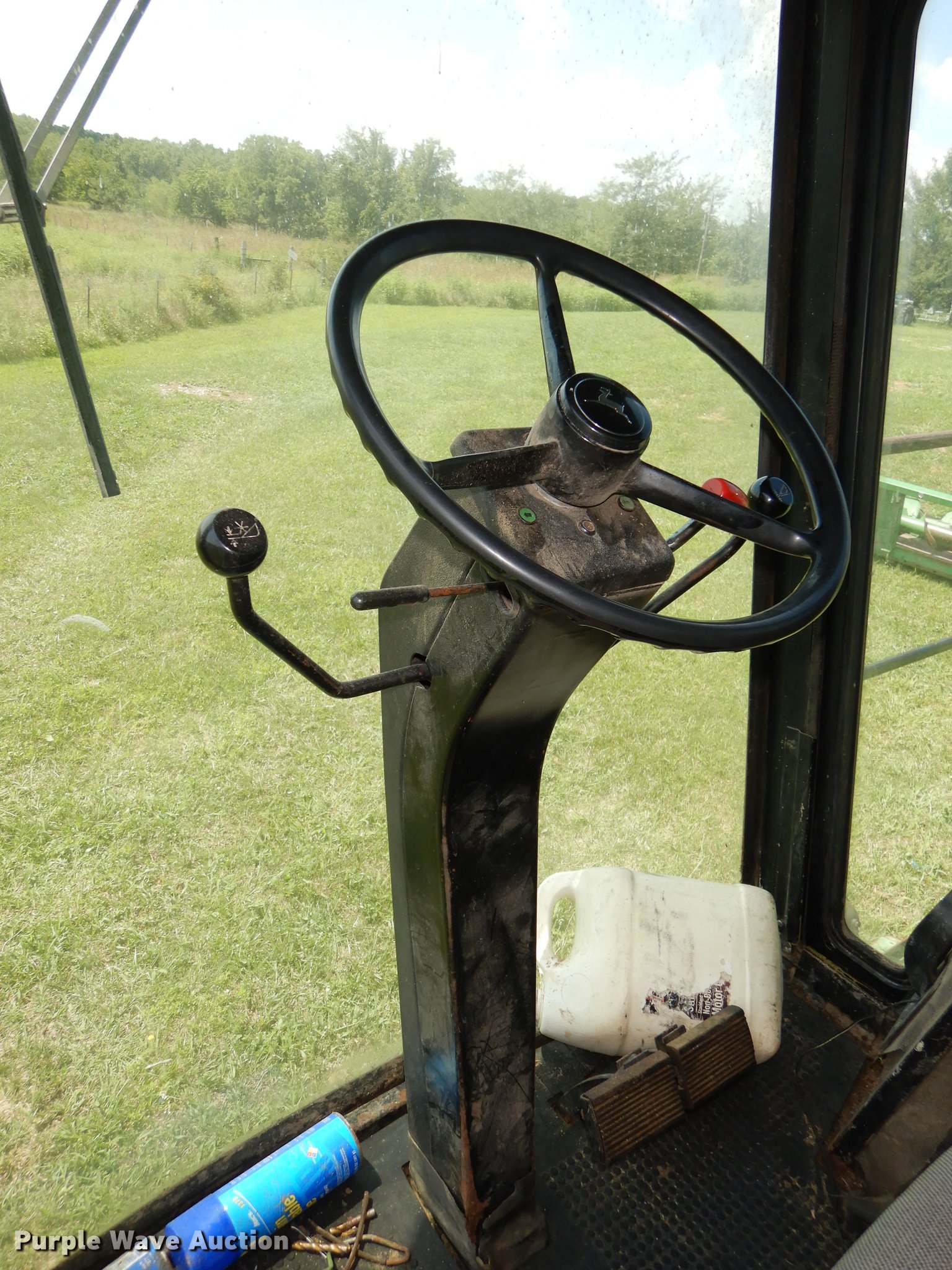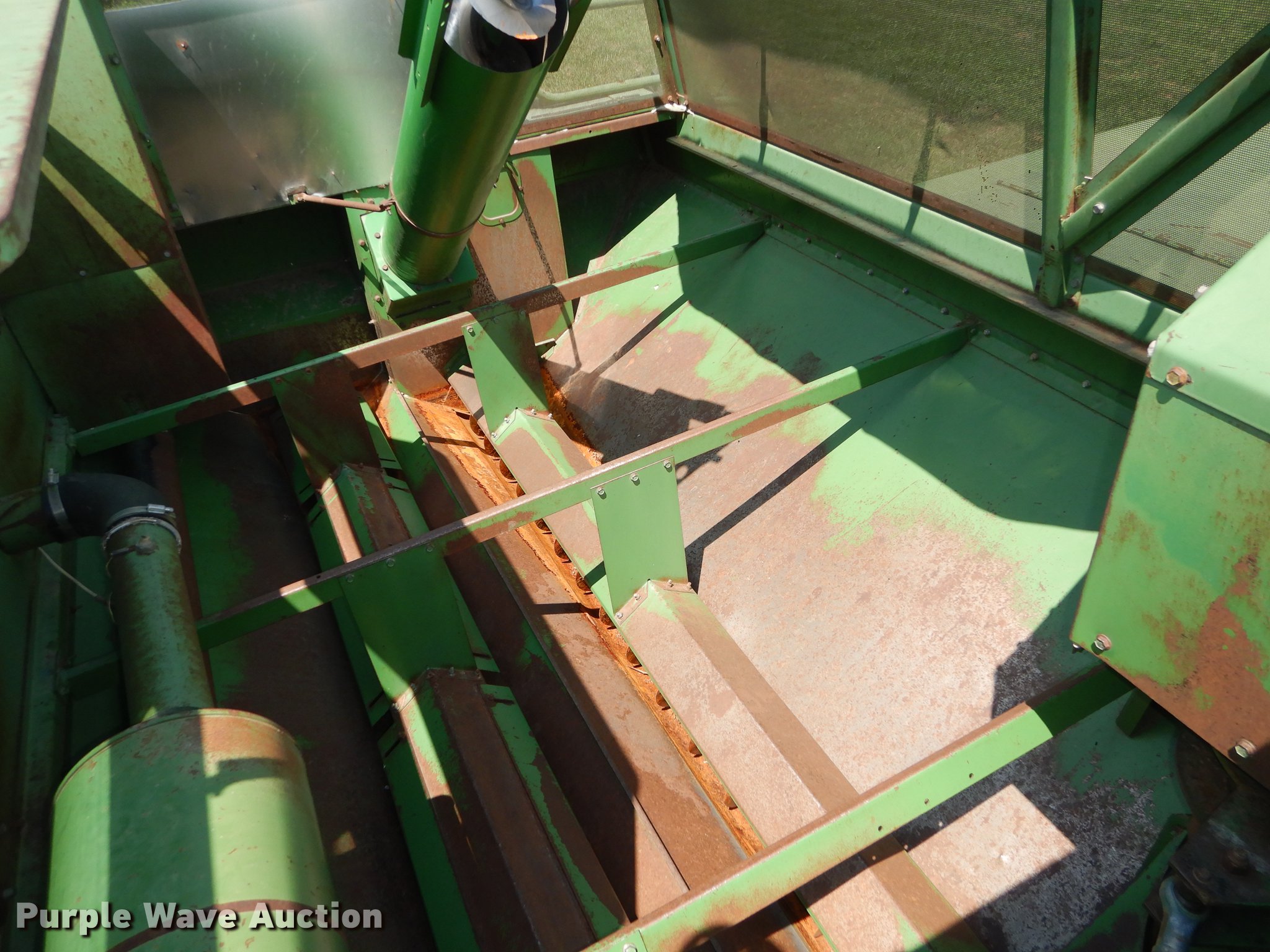 Purple Wave is selling a used Combine in Kansas. This item is a 1980 John Deere 8820 combine with the following: 2,257 engine hours on meter, John Deere six cylinder turbo diesel engine, Hydrostatic transmission, AC and heat, AM/FM, Tilt steering wheel, Wipers, Work lights, Straw chopper, 200 bu. grain bin, 12'L unloading auger, Firestone 30.5-32 front tires, Firestone 16.9-26 rear tires, Non-operational AC, One conveyor auger missing, Battery dead, Serial 416172
