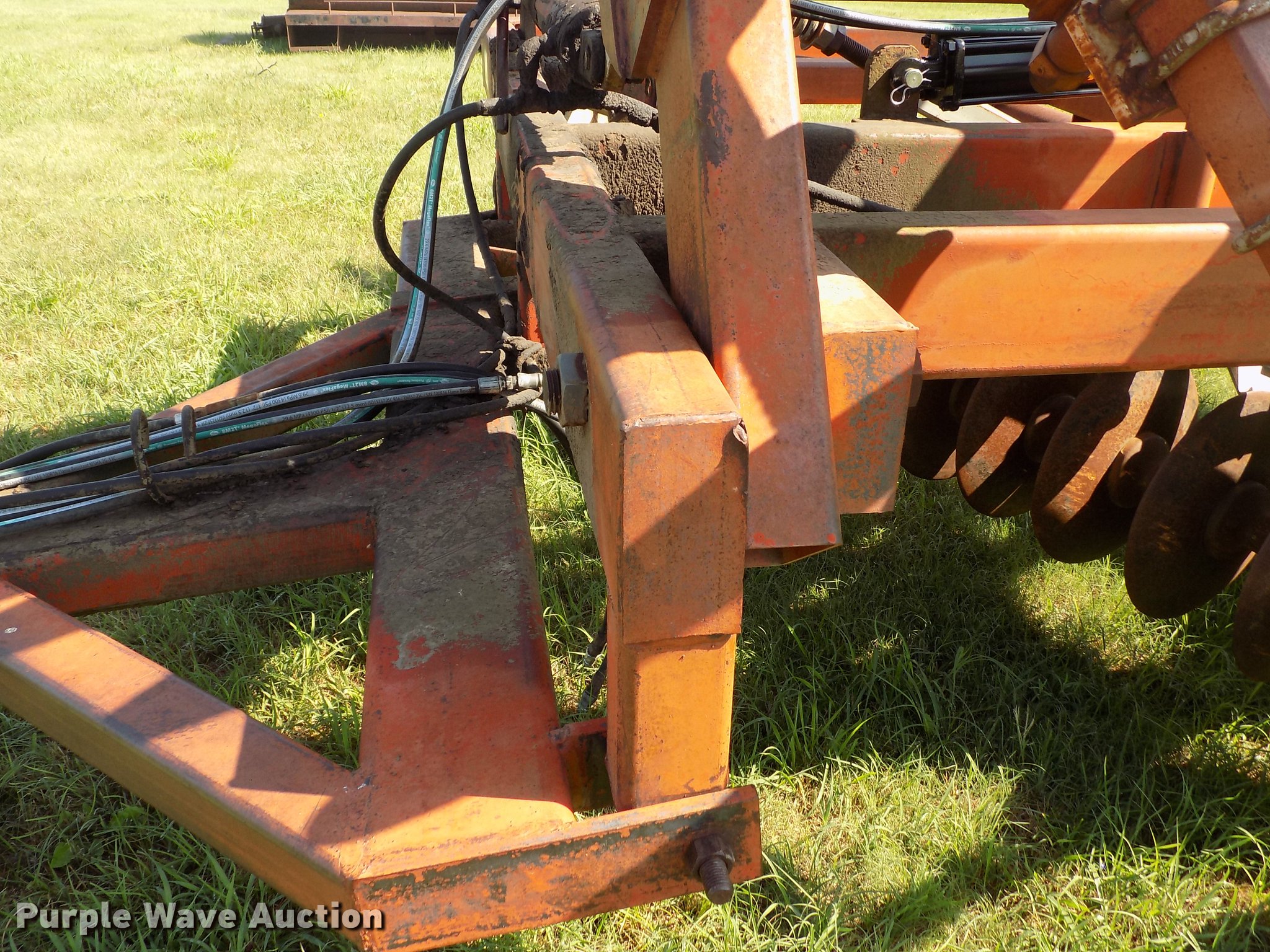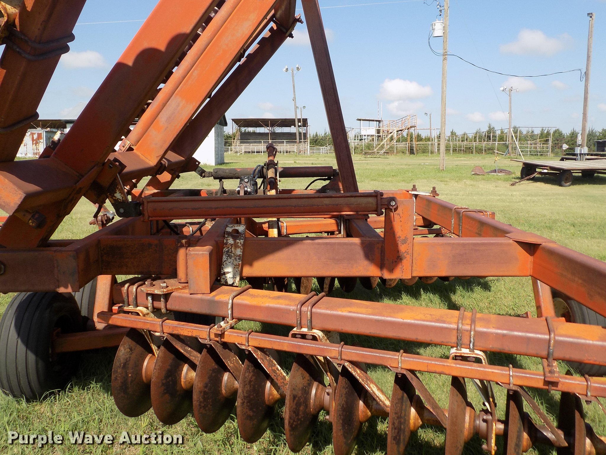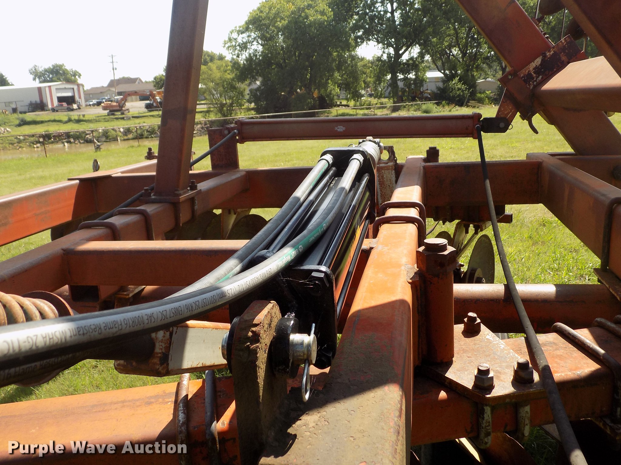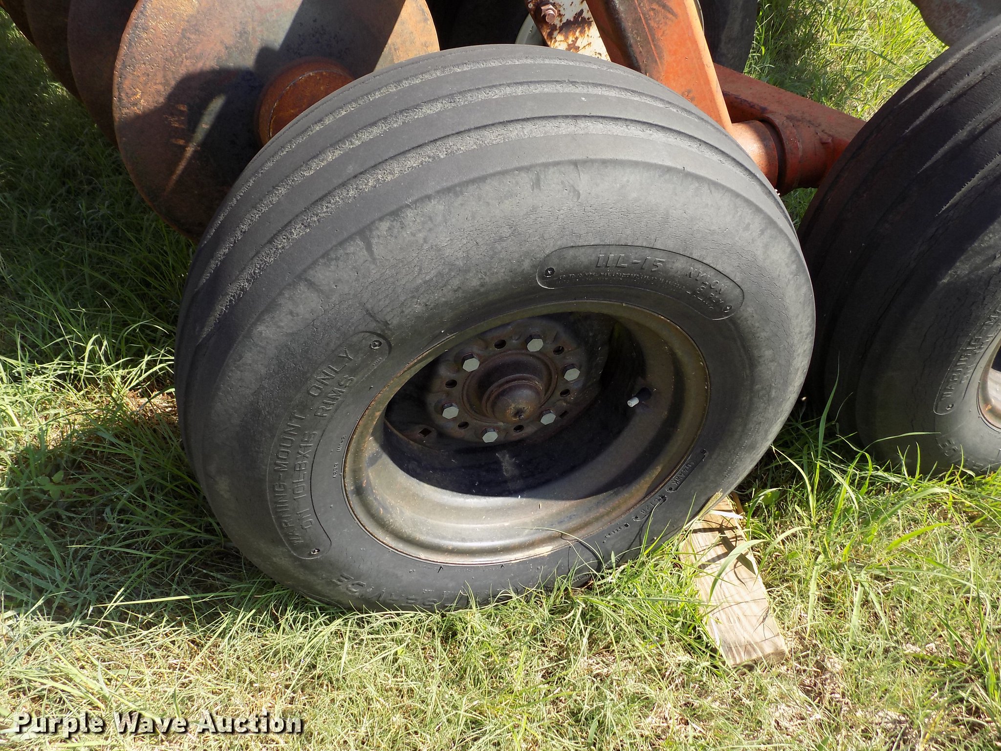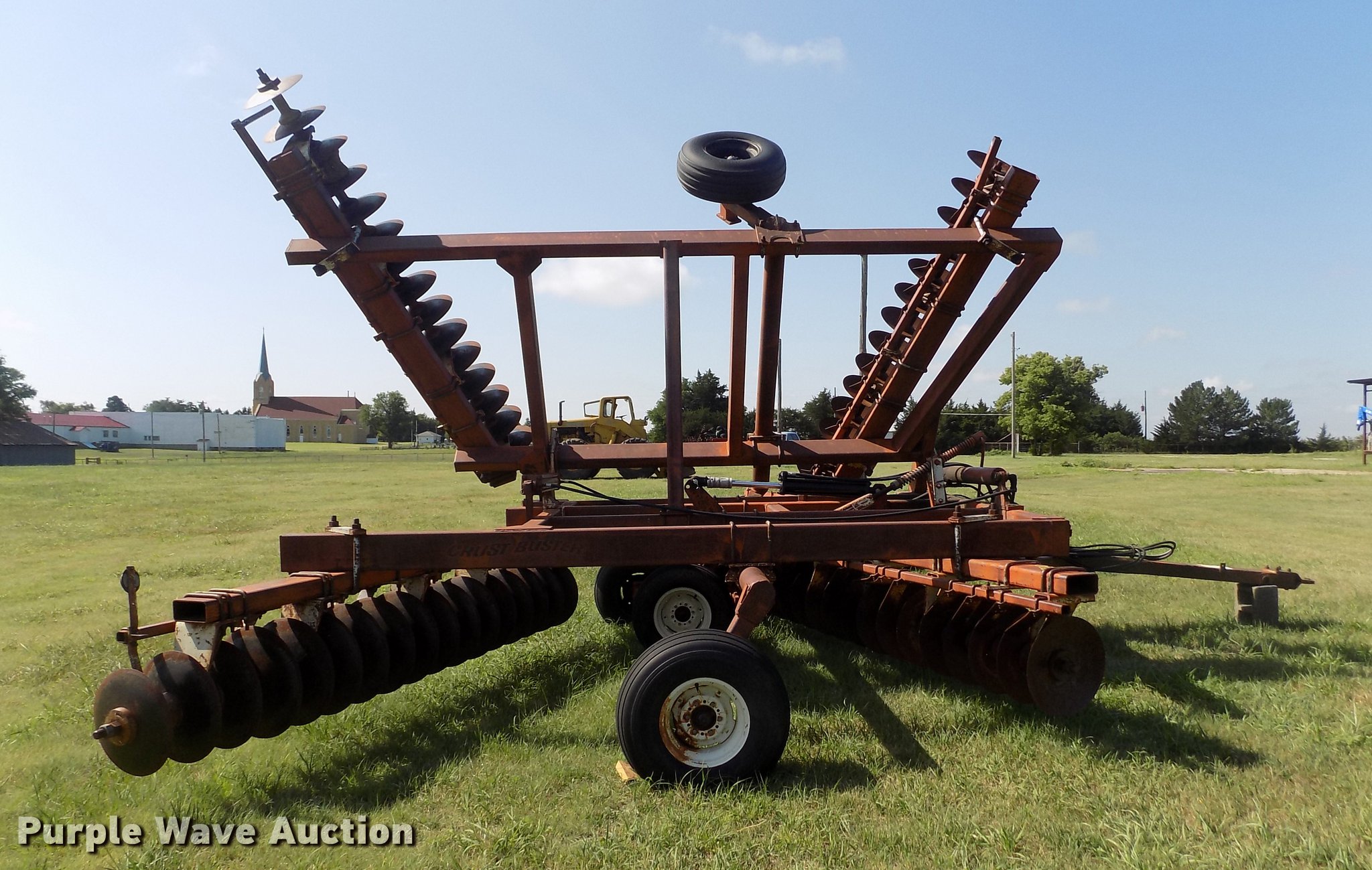 Purple Wave is selling a used Disk in Kansas. This item is a CrustBuster SD-77 double off-set disk with the following: 22'W, 19.5" diameter front blades, 21" diameter rear blades, Disk scrapers, Hydraulic lift and fold, Manual leveler, Walking tandem axle, 11L-15 tires, 12.5L-15 tires