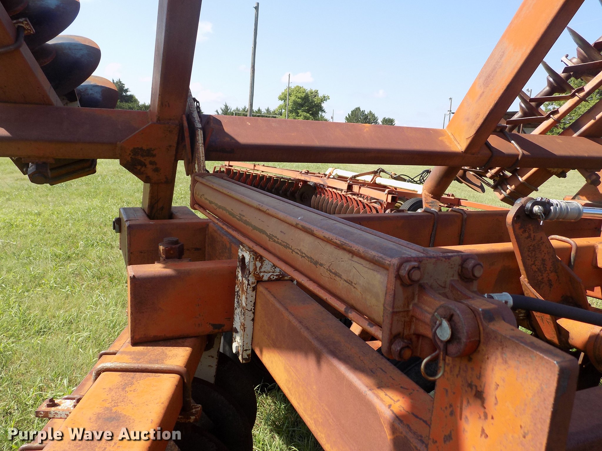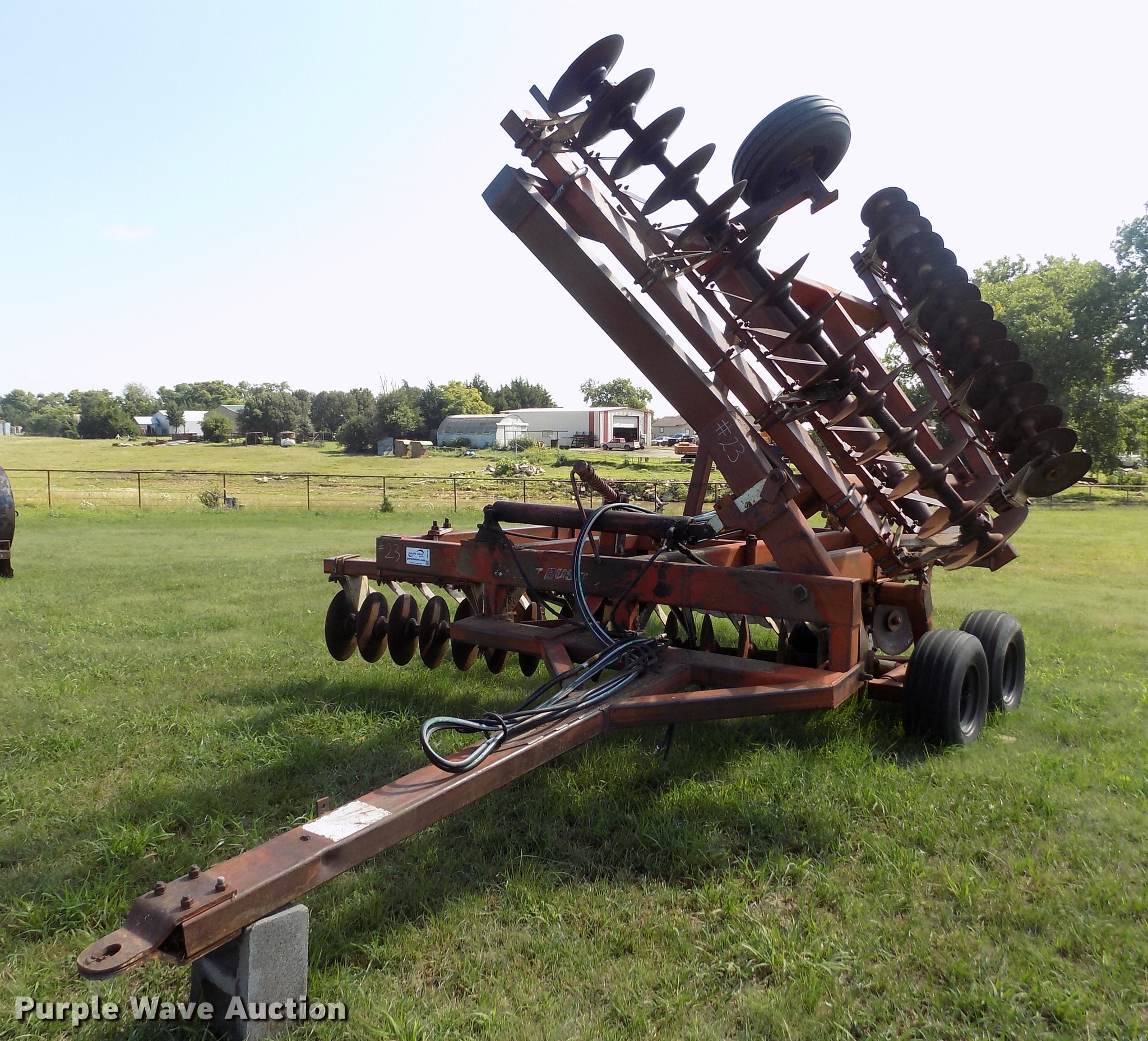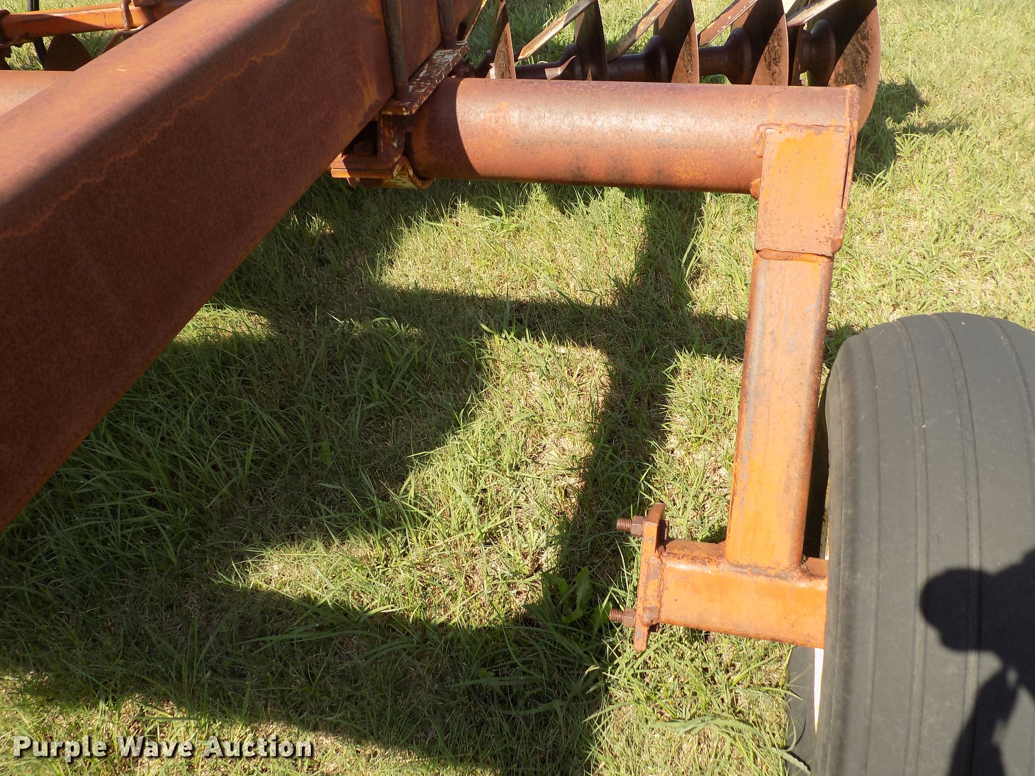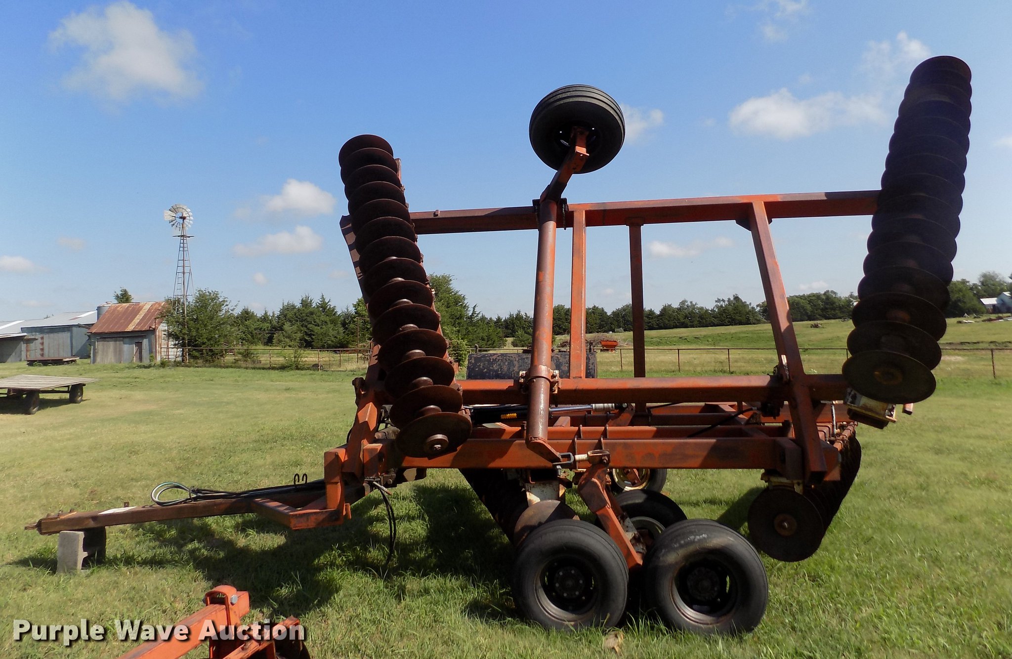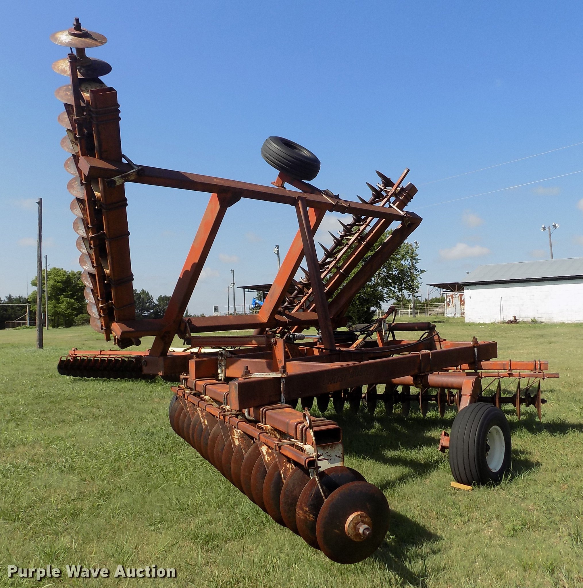 Purple Wave is selling a used Disk in Kansas. This item is a CrustBuster SD-77 double off-set disk with the following: 22'W, 19.5" diameter front blades, 21" diameter rear blades, Disk scrapers, Hydraulic lift and fold, Manual leveler, Walking tandem axle, 11L-15 tires, 12.5L-15 tires