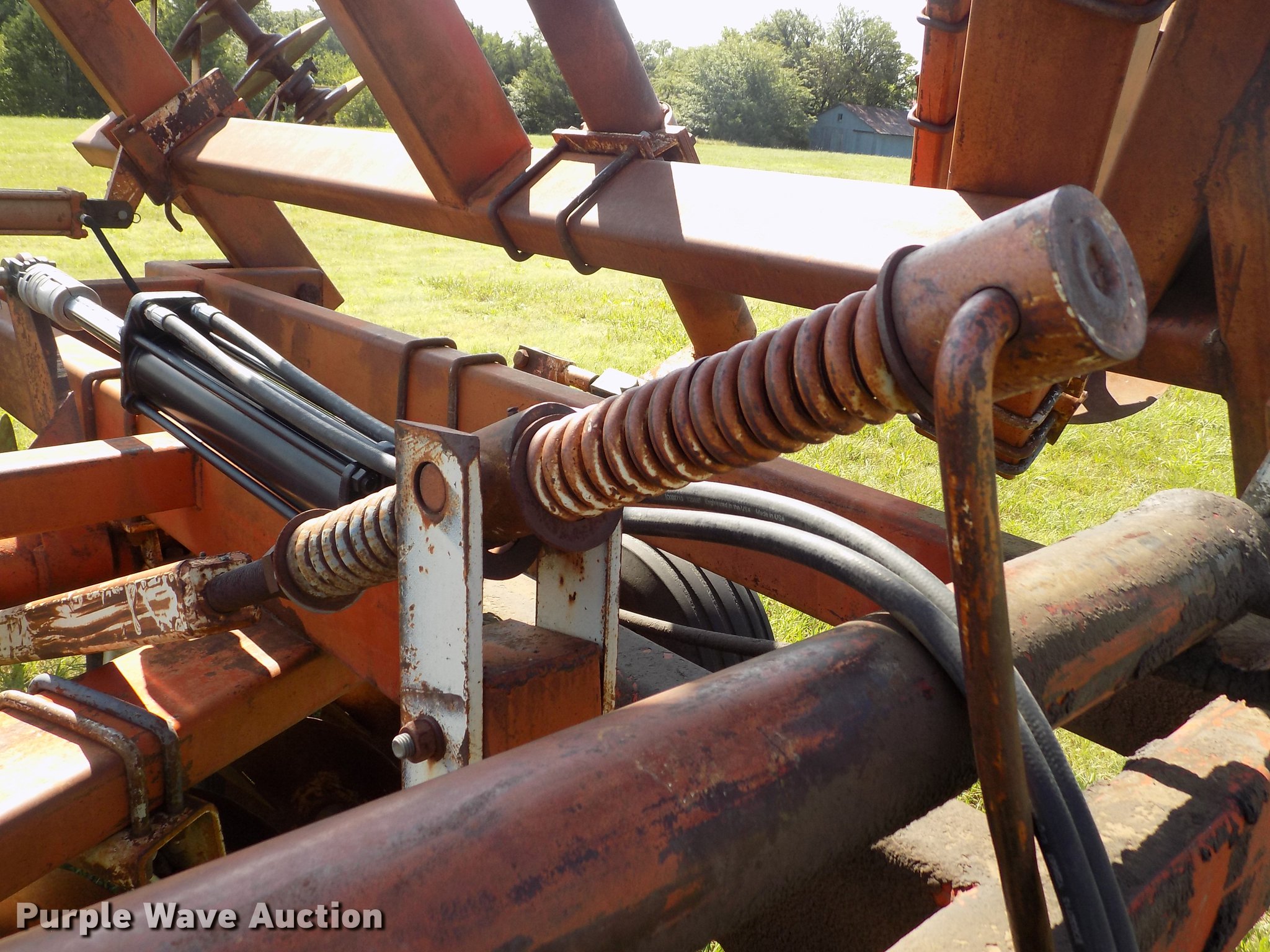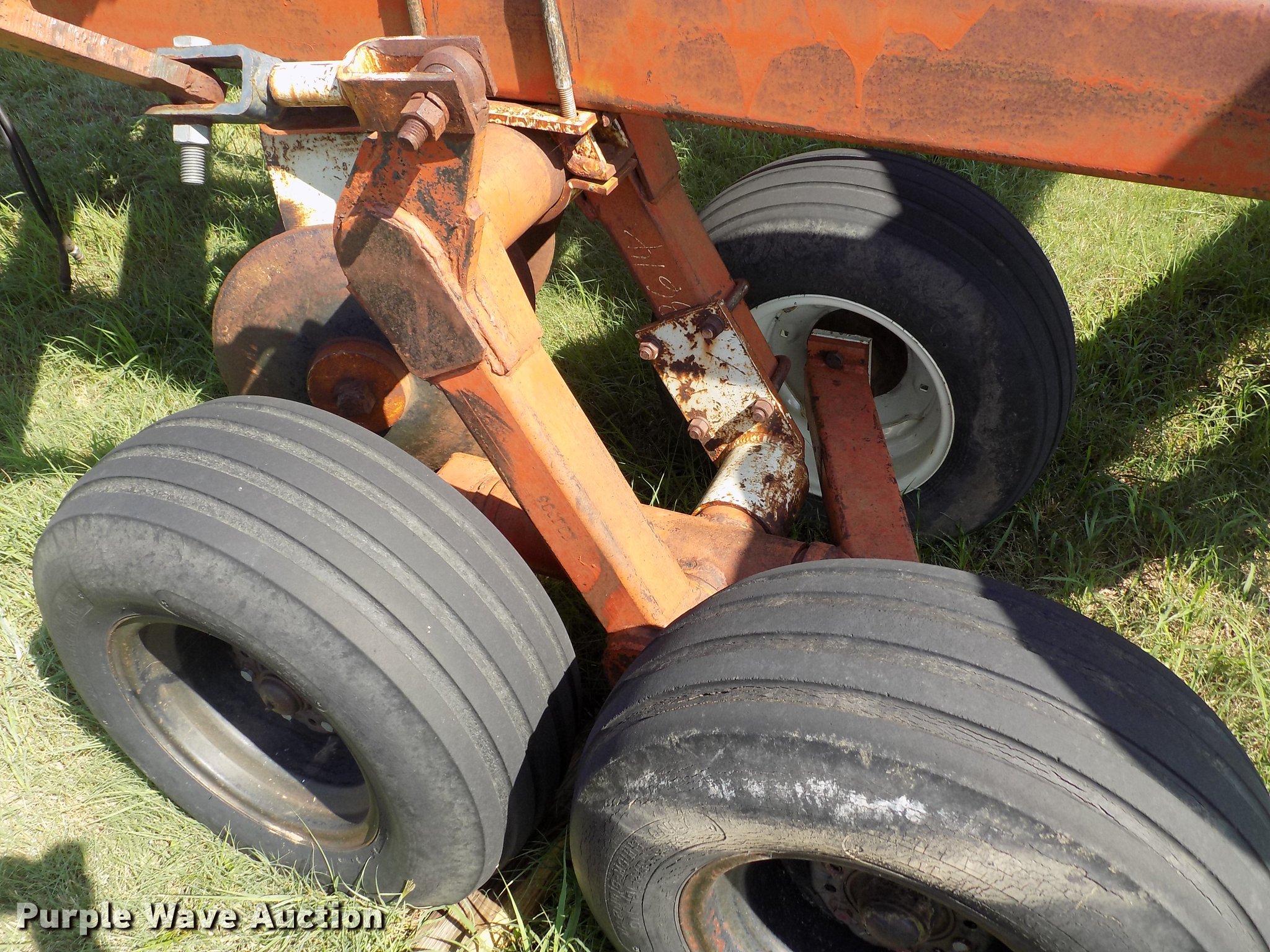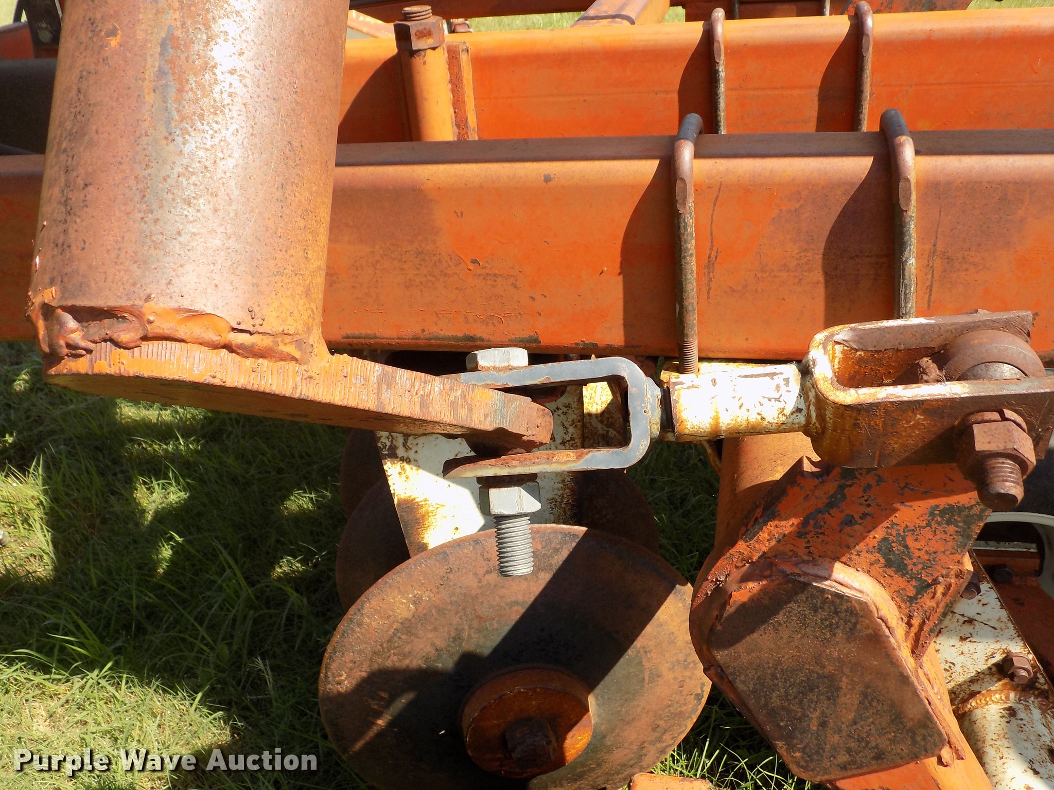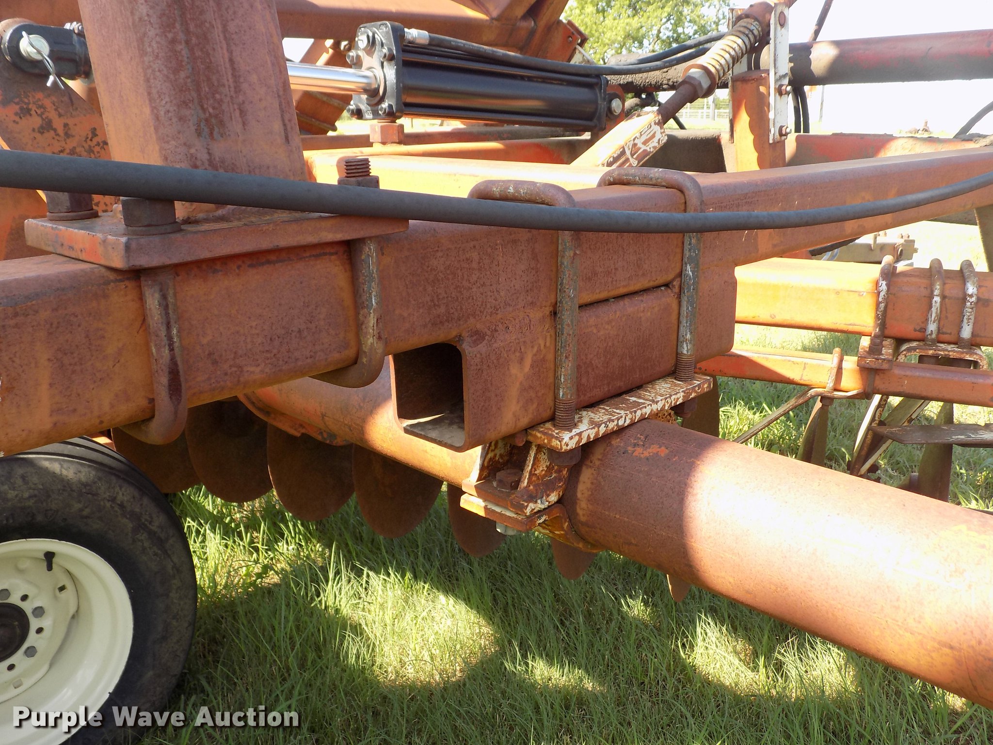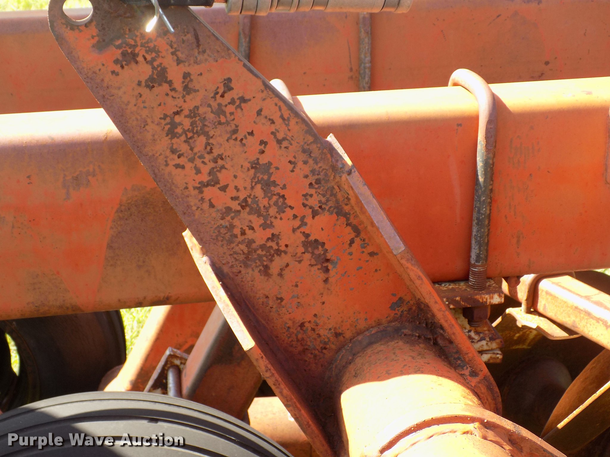 Purple Wave is selling a used Disk in Kansas. This item is a CrustBuster SD-77 double off-set disk with the following: 22'W, 19.5" diameter front blades, 21" diameter rear blades, Disk scrapers, Hydraulic lift and fold, Manual leveler, Walking tandem axle, 11L-15 tires, 12.5L-15 tires