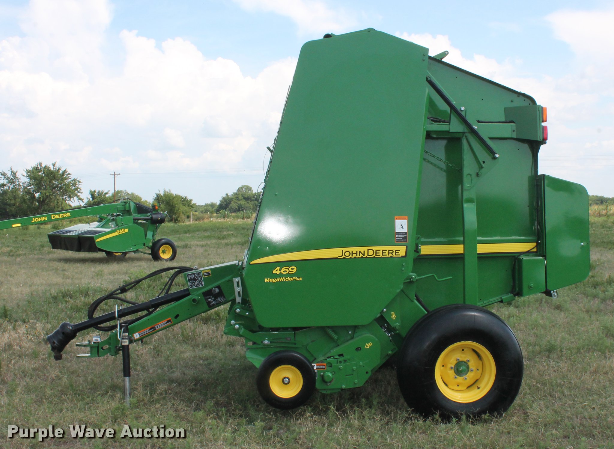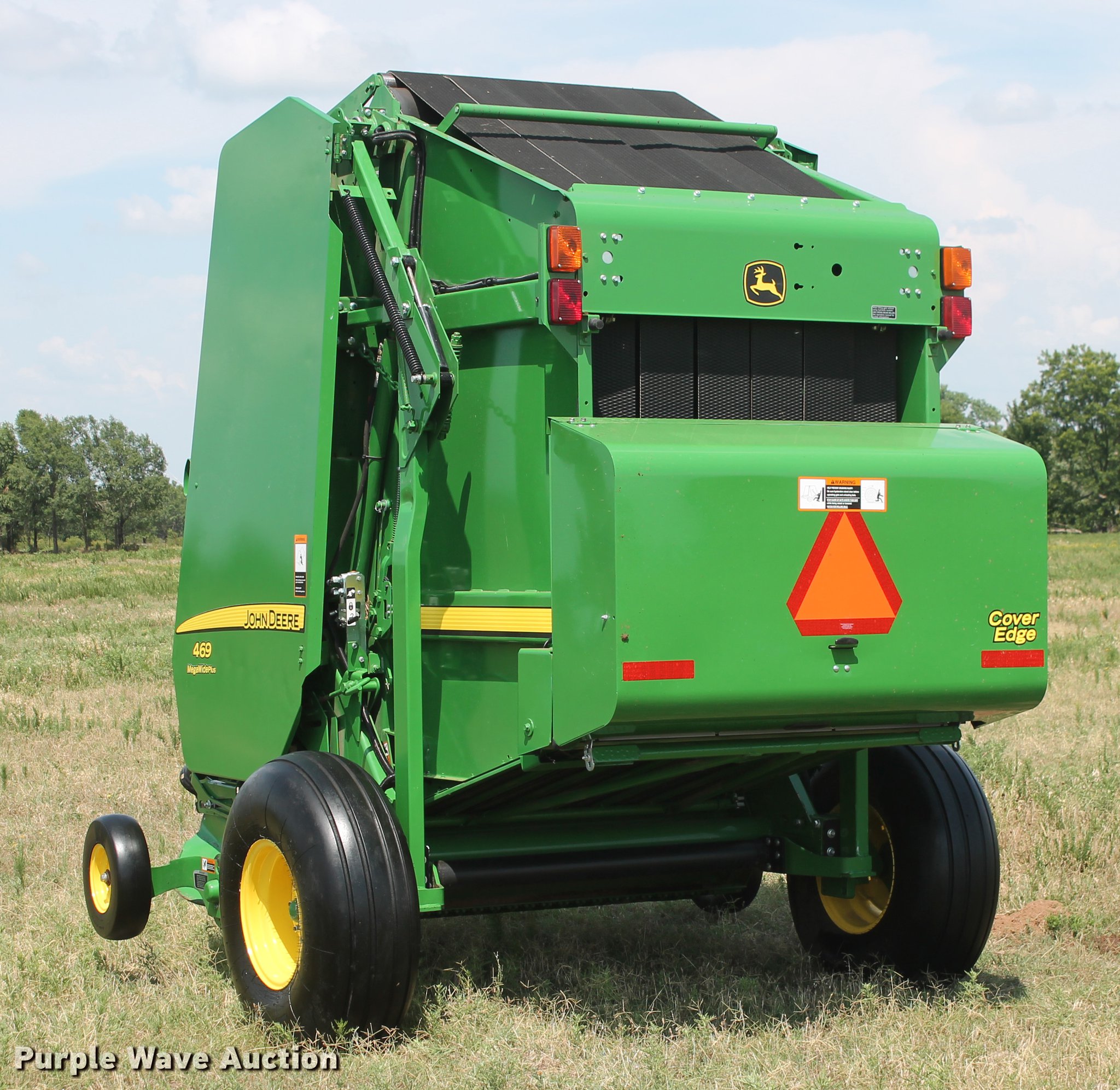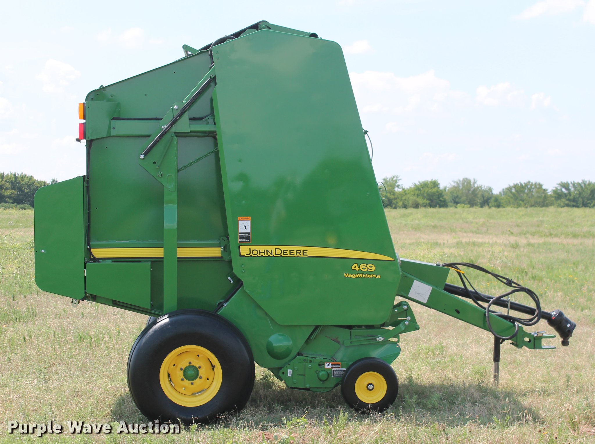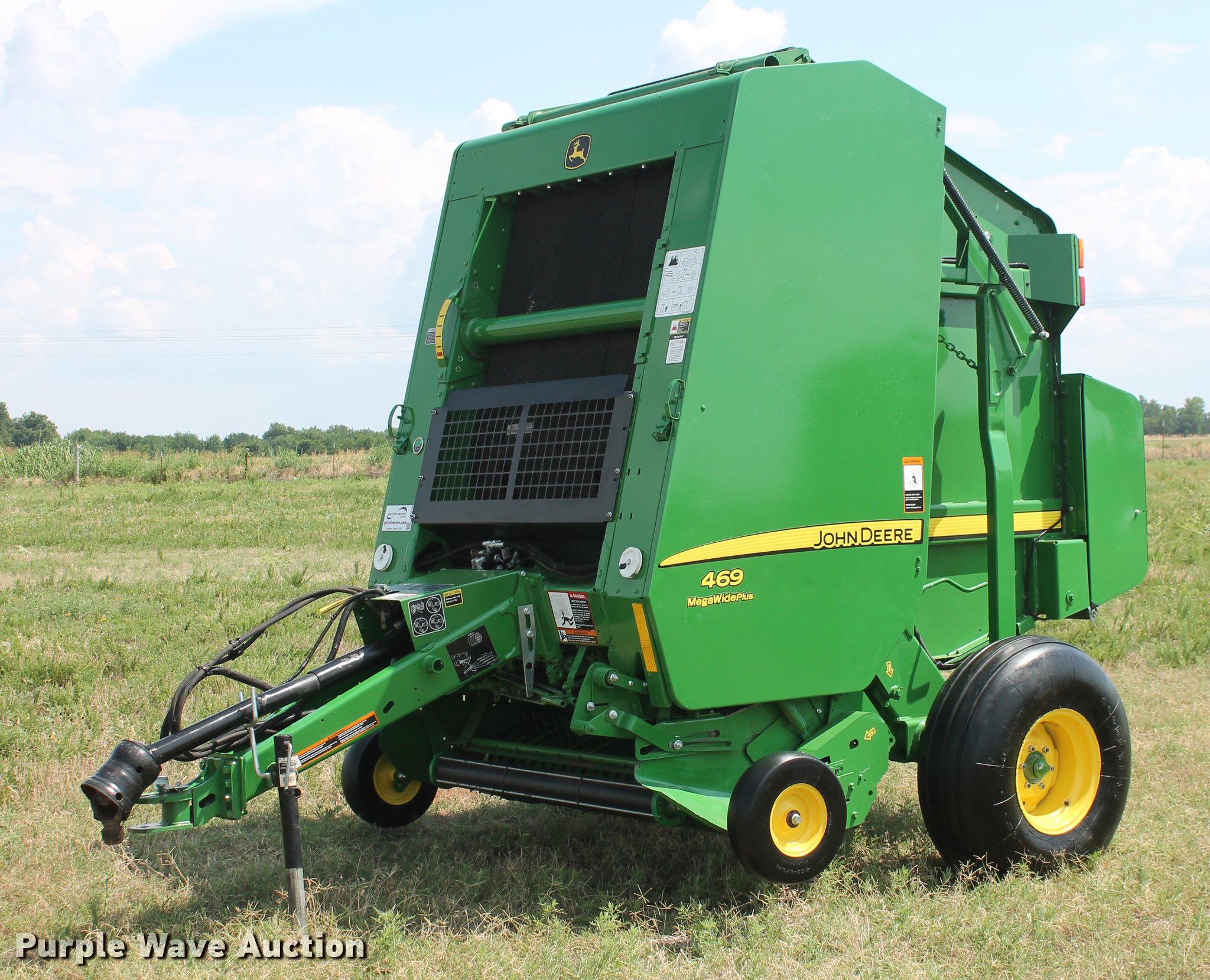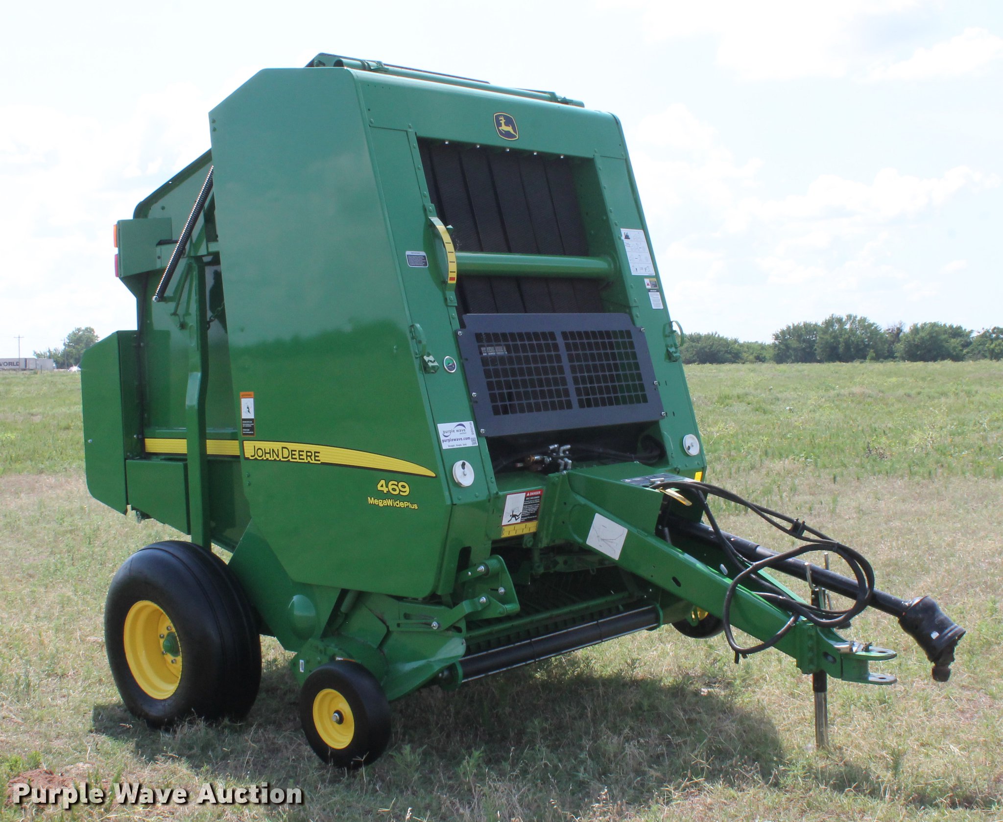 Purple Wave is selling a used Round Baler in Oklahoma. This item is a 2017 John Deere 469 Mega Wide Plus Silage Special round baler with the following: 504 bale count, 4' x 6' bale capacity, 60"W pickup, Hydraulic pickup lift, 4.80-8/3.75 gauge wheels, Rotor cutter, Feed assist roller, John Deere Bale Rak Pro AFH210762 monitor, Auto-tie, Twin twine tie, CoverEdge net-wrap, Bale kicker, Transport lights, Pin hitch, Goodyear 14L-16.1SL tires, Serial 1E00469SLHH432043